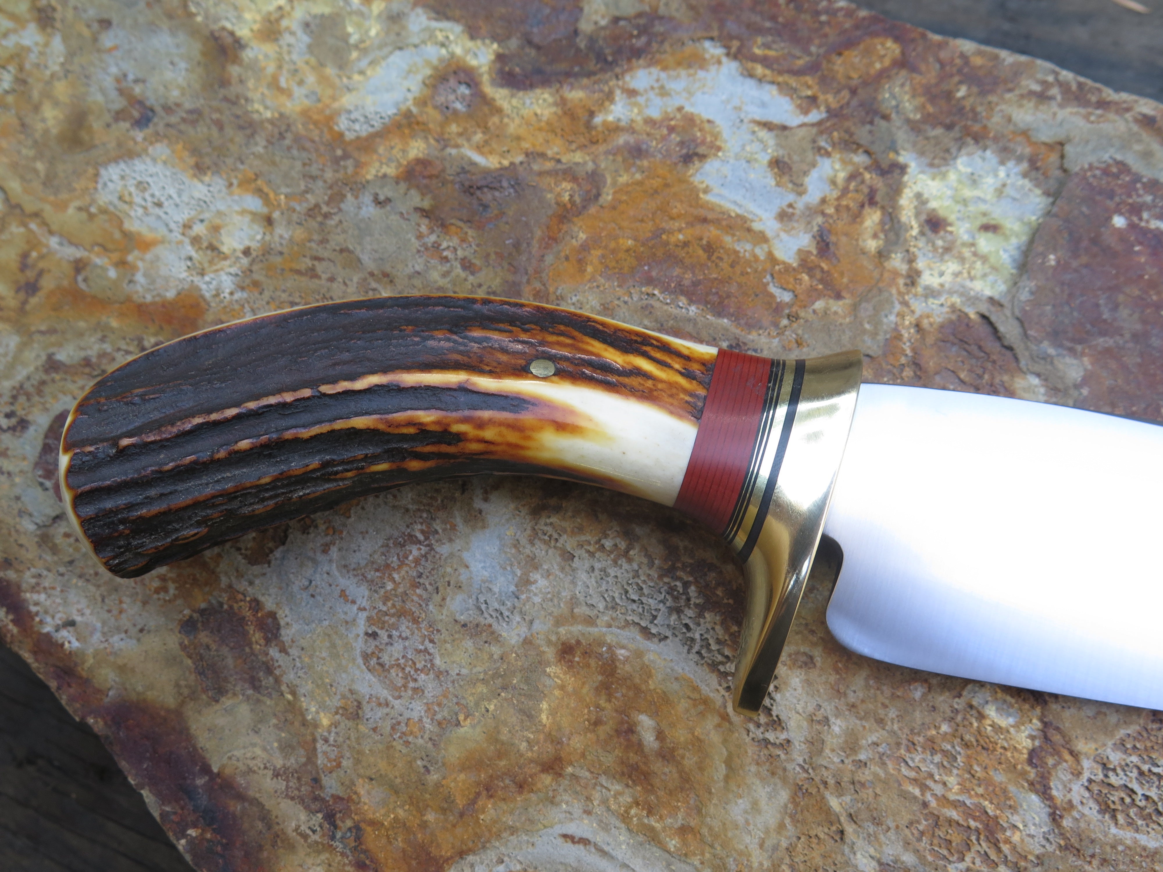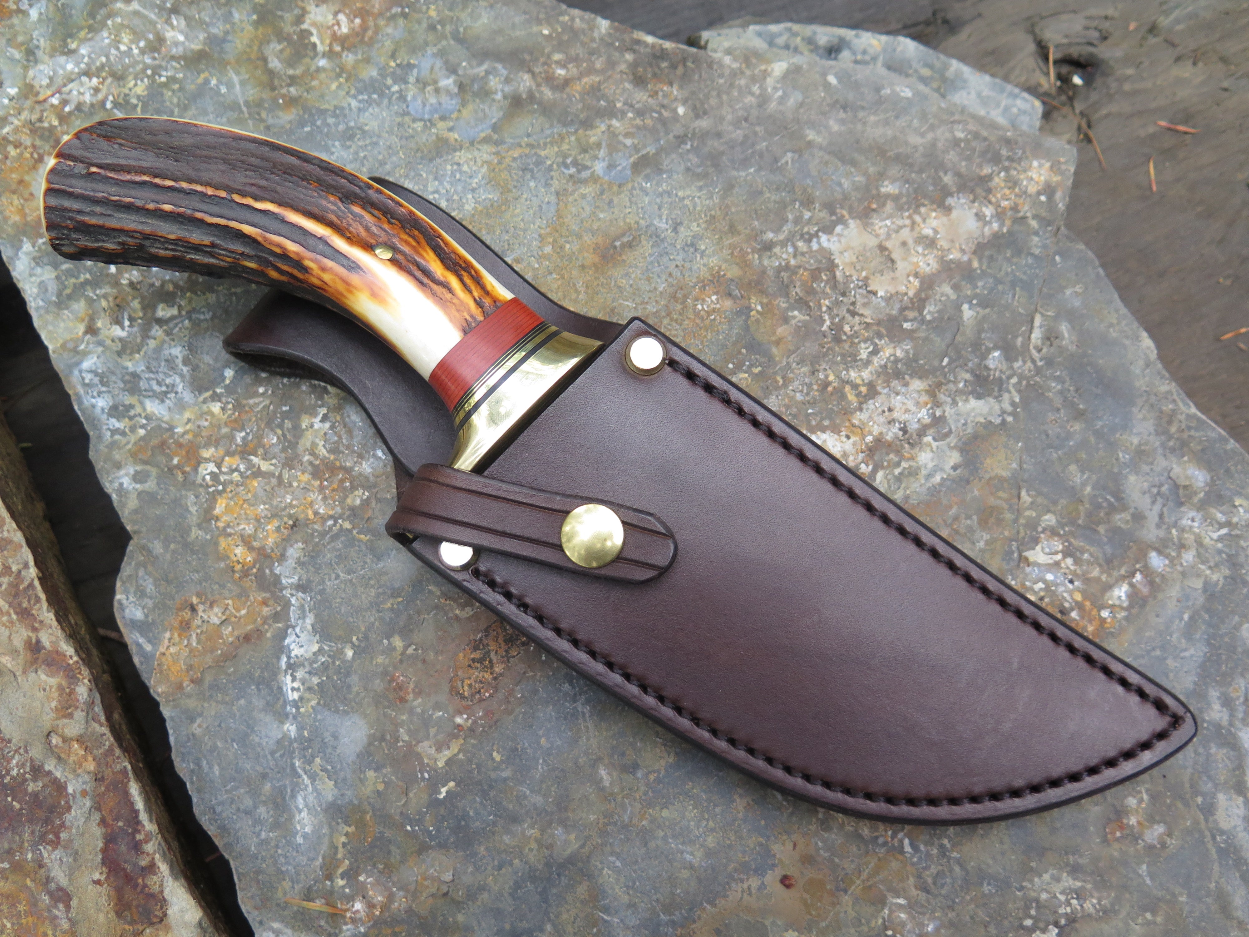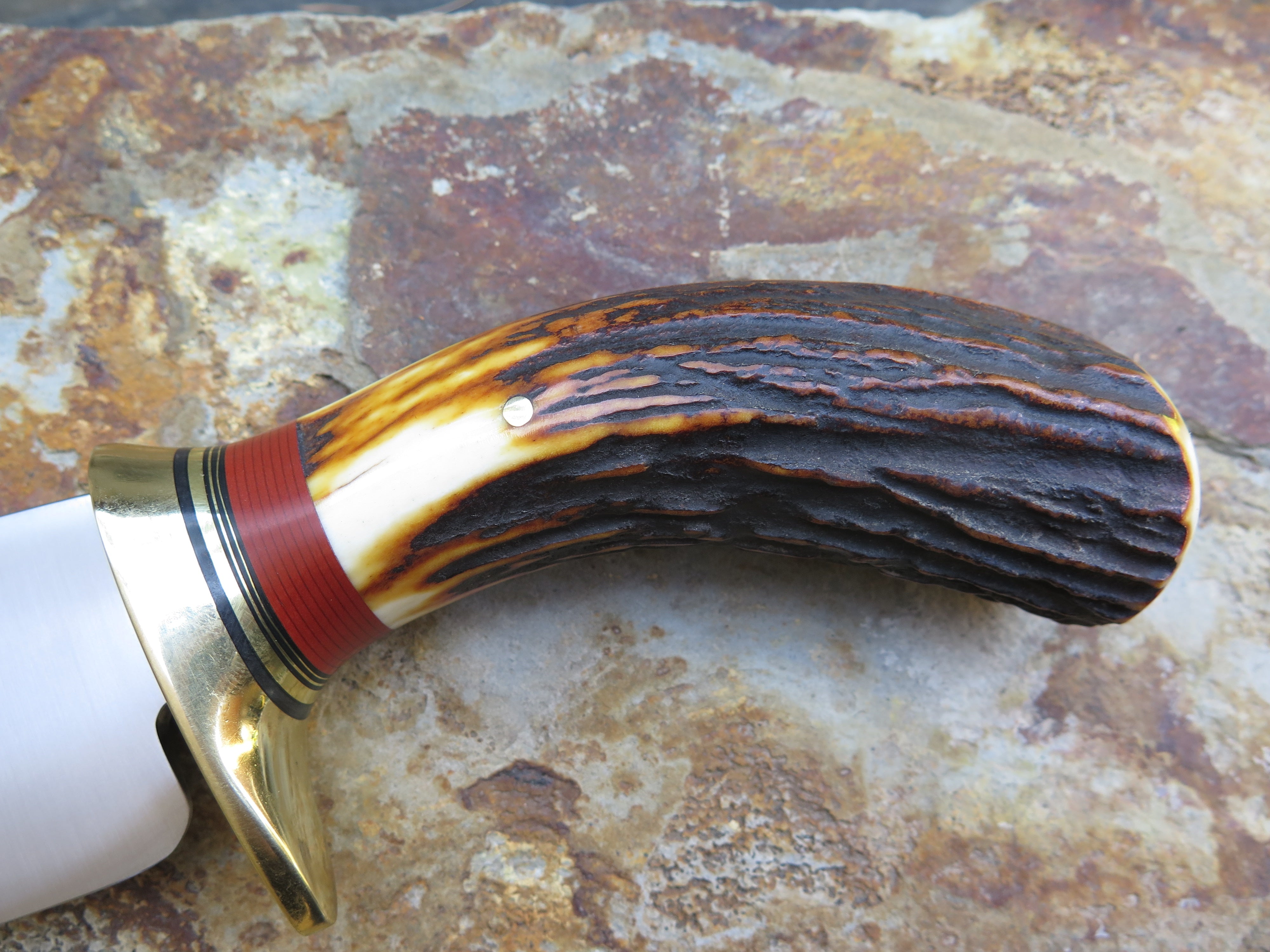 This beautiful new Hunter from Behring Made© is hand forged from 1/4" thick high carbon 01 tool steel and it measures just over 6" from tip to guard with a 2" belly as well as a razor sharp convex grind. The brass guard is soldered in place above black and maroon fiber with brass spacers that top a premium sambar stag handle that's pinned through the tang with brass. The overall length measures 11 3/8" and it comes in a custom sheath from Warlander Leather.