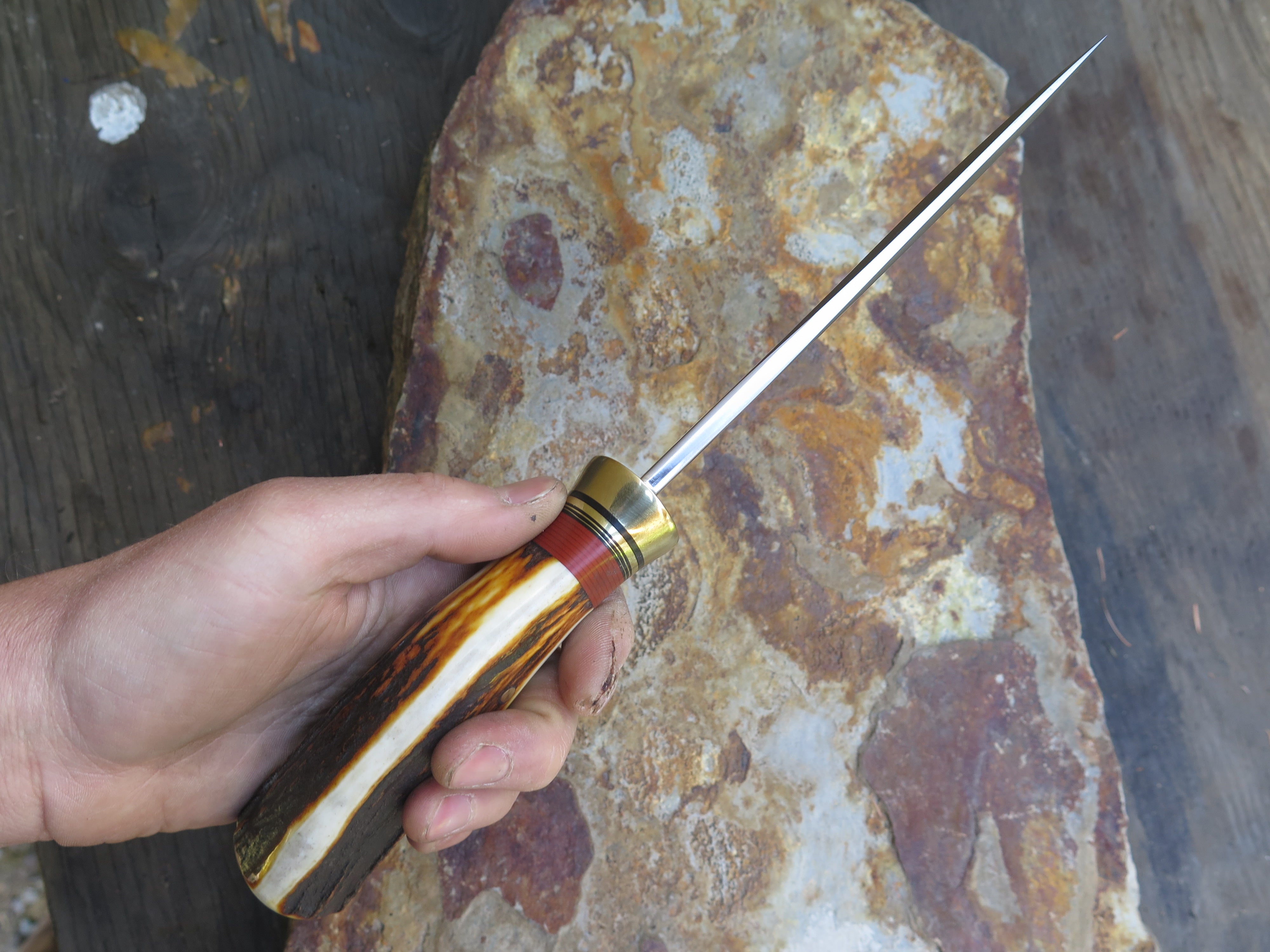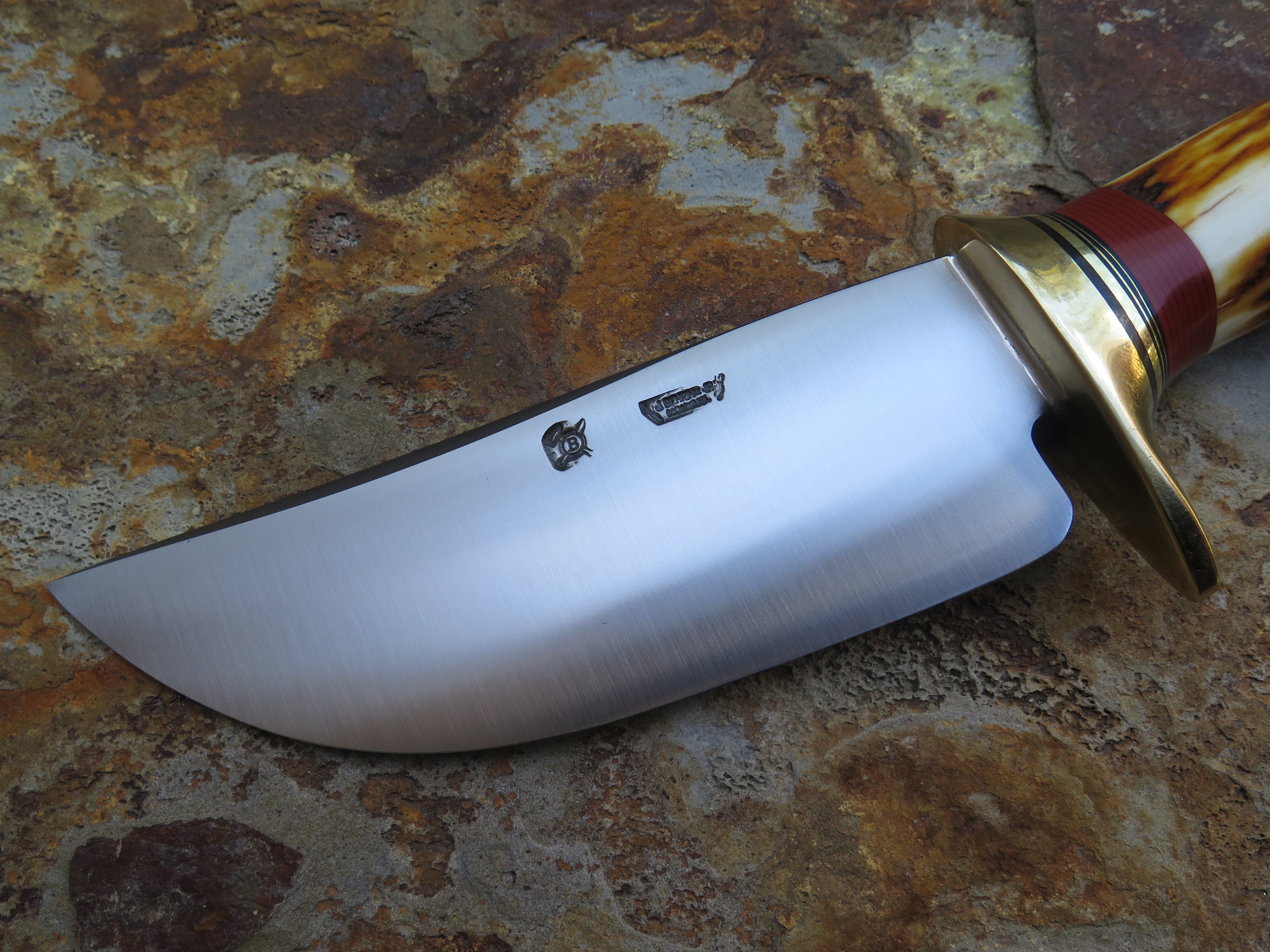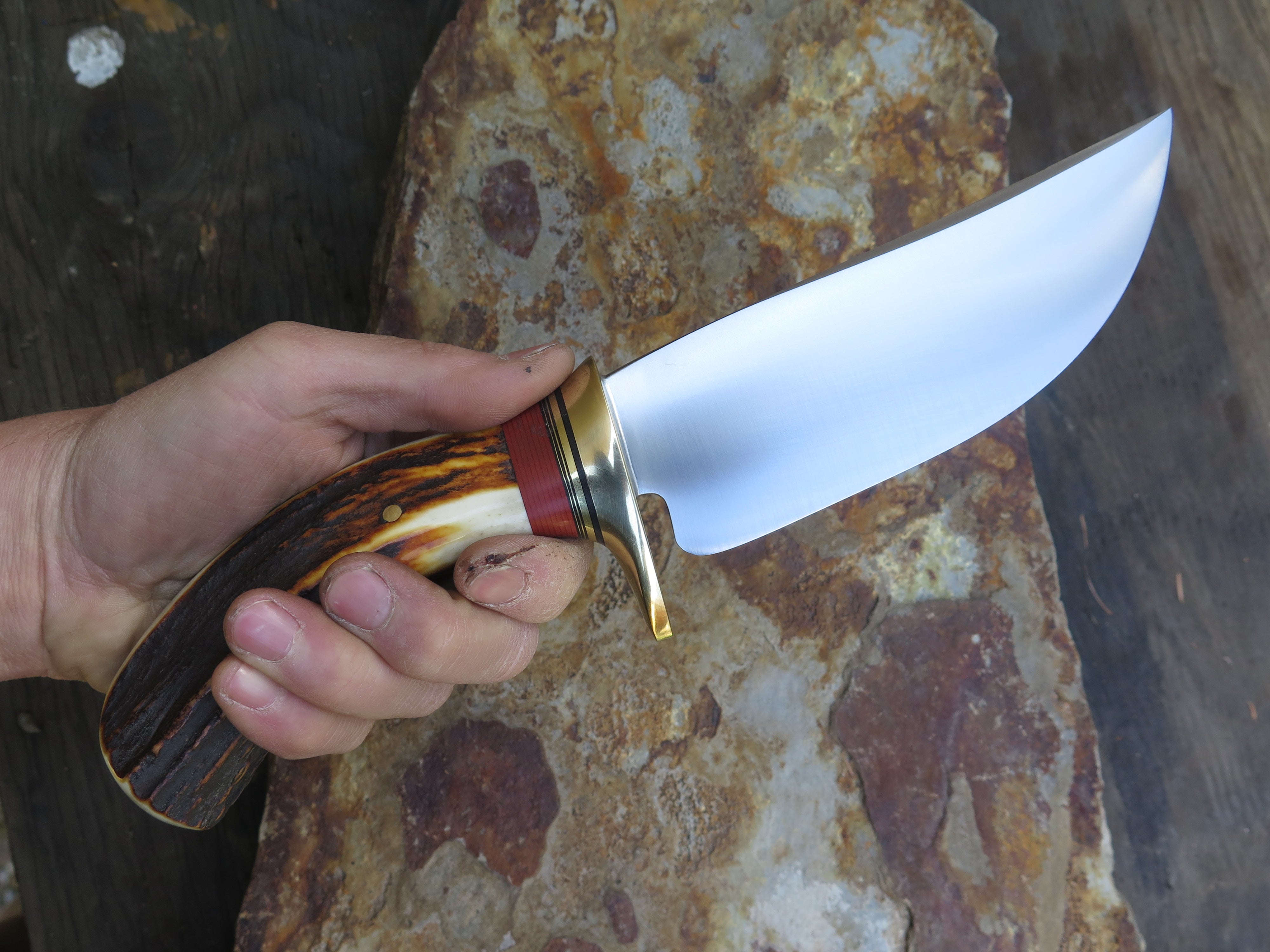 This beautiful new Hunter from Behring Made© is hand forged from 1/4" thick high carbon 01 tool steel and it measures just over 6" from tip to guard with a 2" belly as well as a razor sharp convex grind. The brass guard is soldered in place above black and maroon fiber with brass spacers that top a premium sambar stag handle that's pinned through the tang with brass. The overall length measures 11 3/8" and it comes in a custom sheath from Warlander Leather.