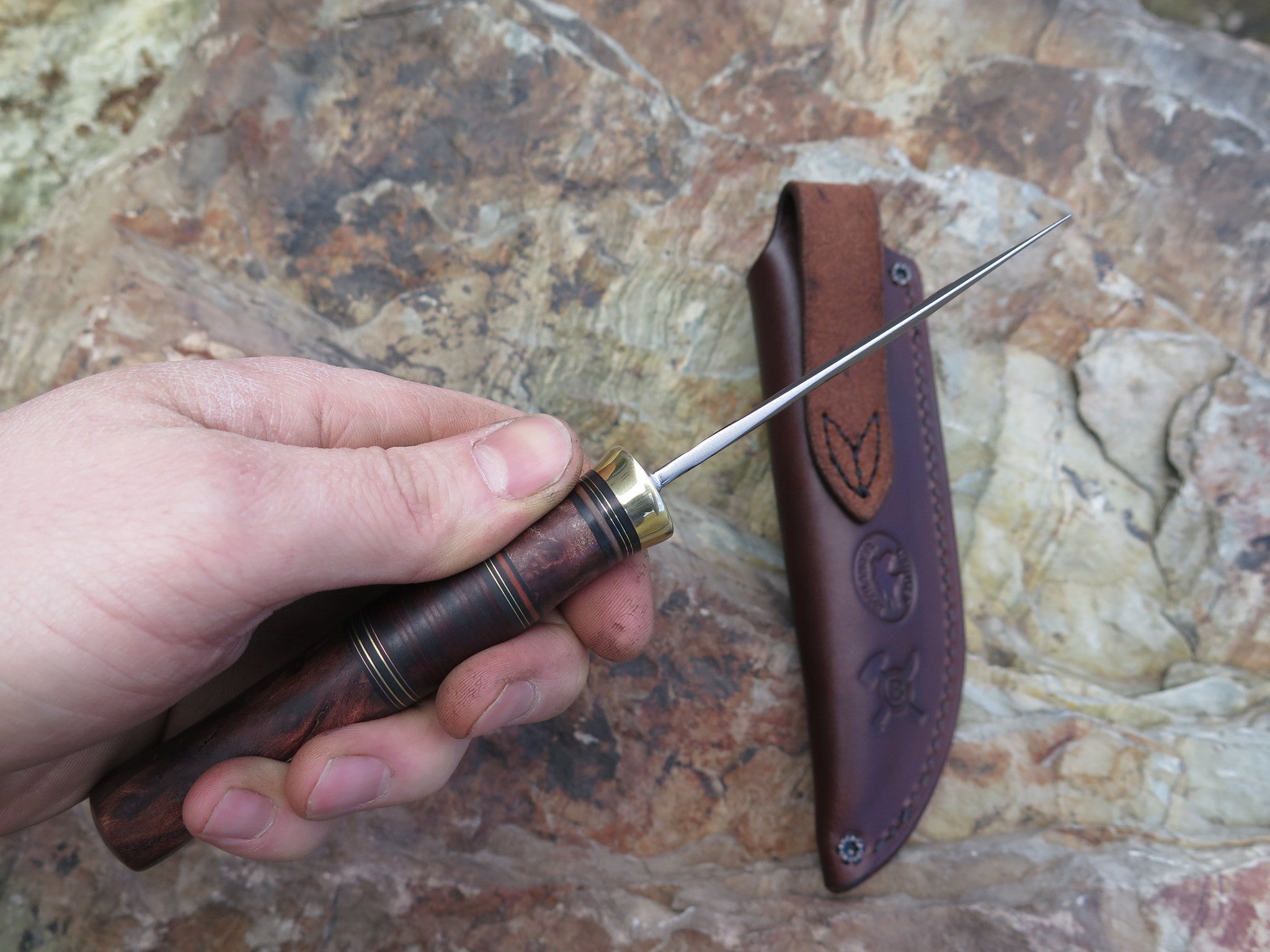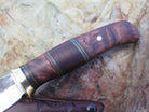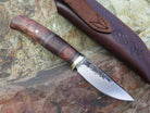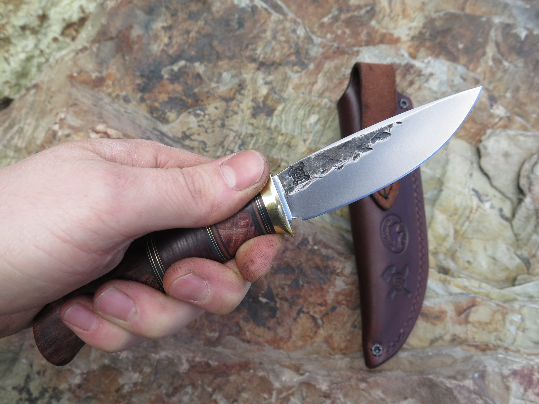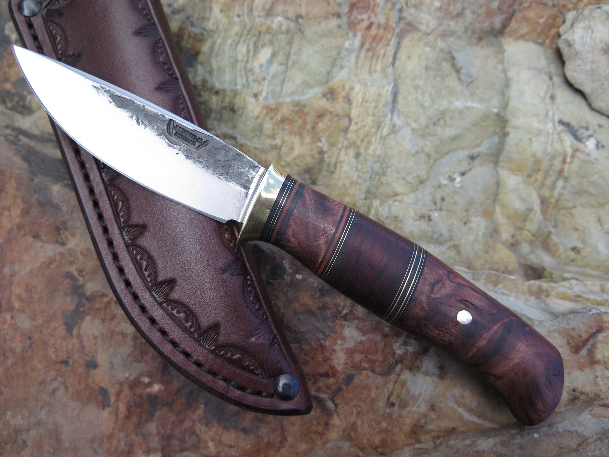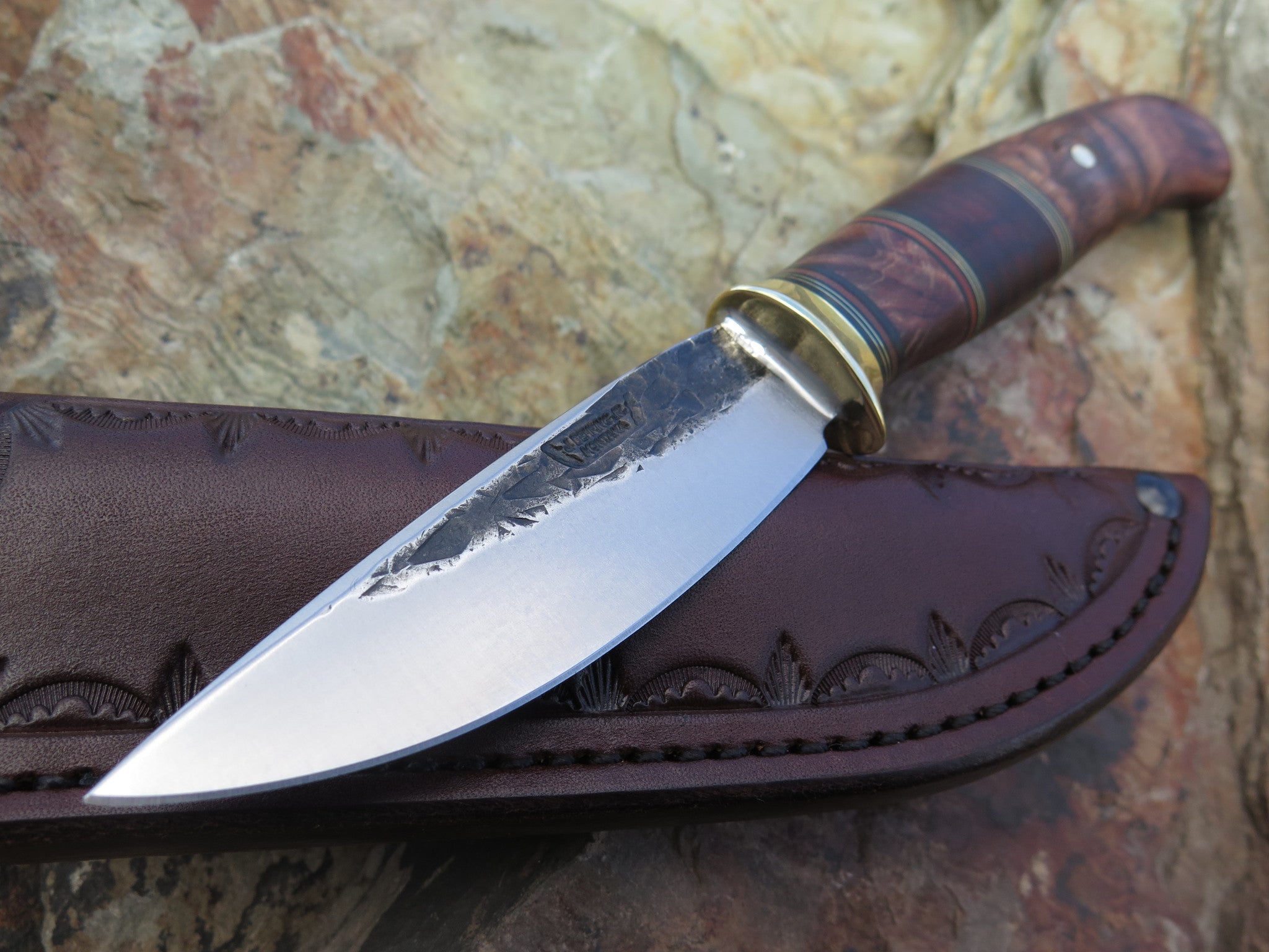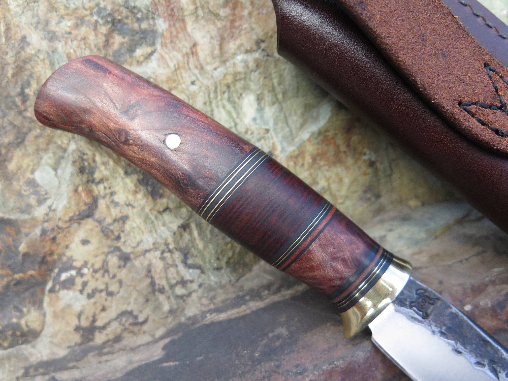 This beautiful new Drop Point from Behring Made™ is hand forged from 1/8" thick high carbon 01 tool steel and it measures 3 1/2" from tip to guard with a razor sharp hollow grind and a hammermark finish. The brass guard is soldered in place above black fiber, brass, copper, horsehide and redwood burl spacers as well as a redwood burl butt that's pinned through the tang with brass. The overall length measures 7 7/8" and it comes in a Warlander Leather pouch sheath. This an excellent little hunting knife or a classy every day carry.