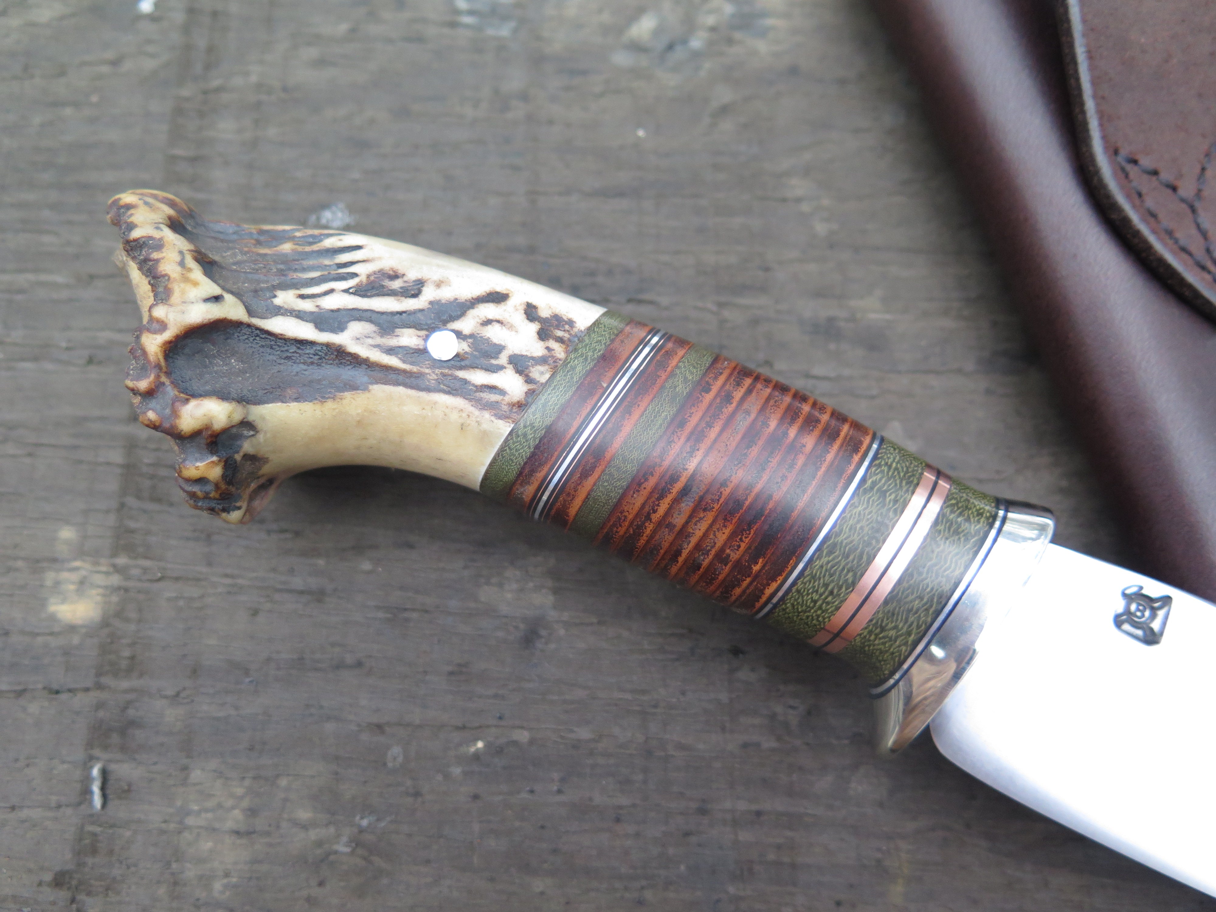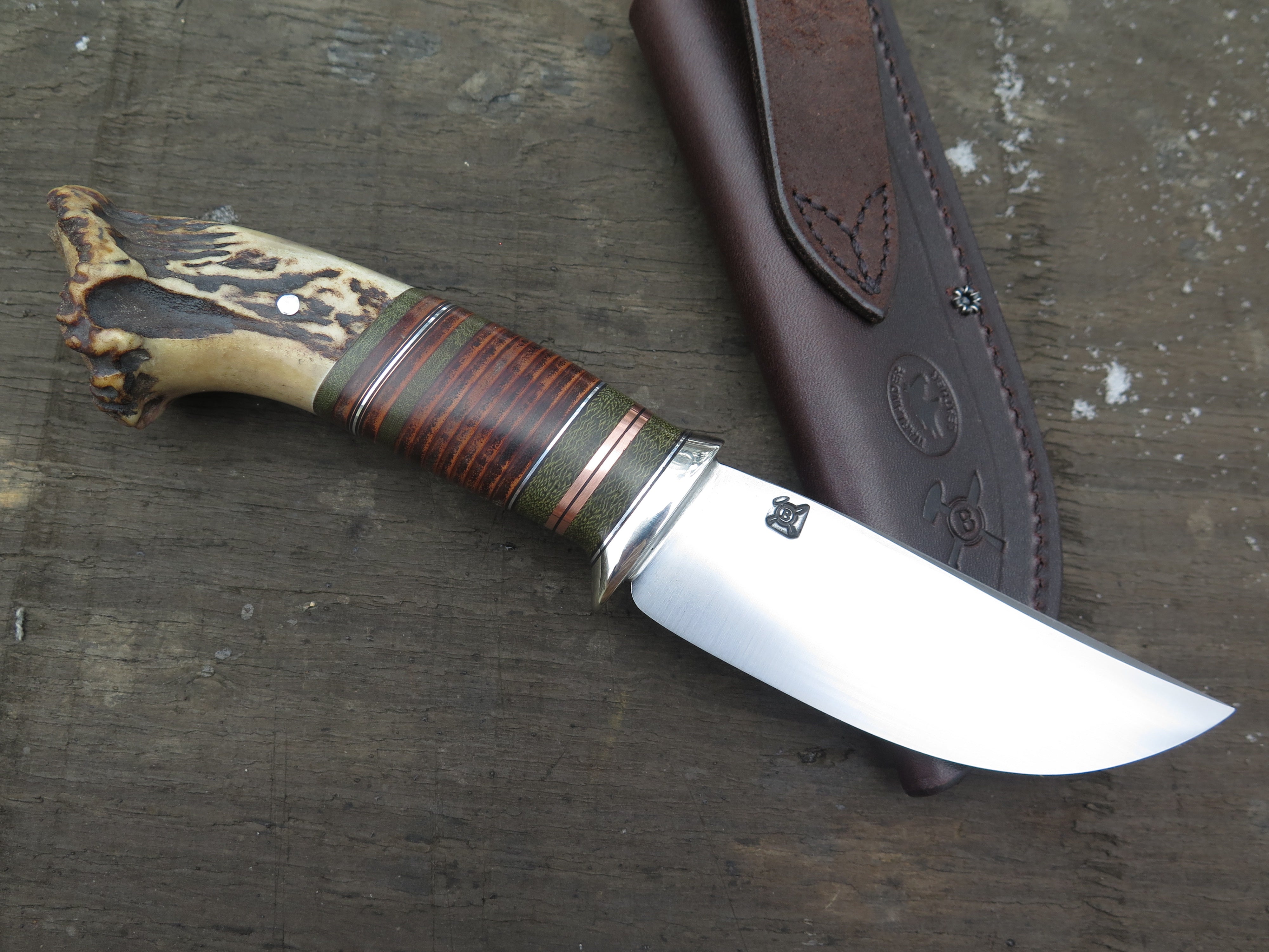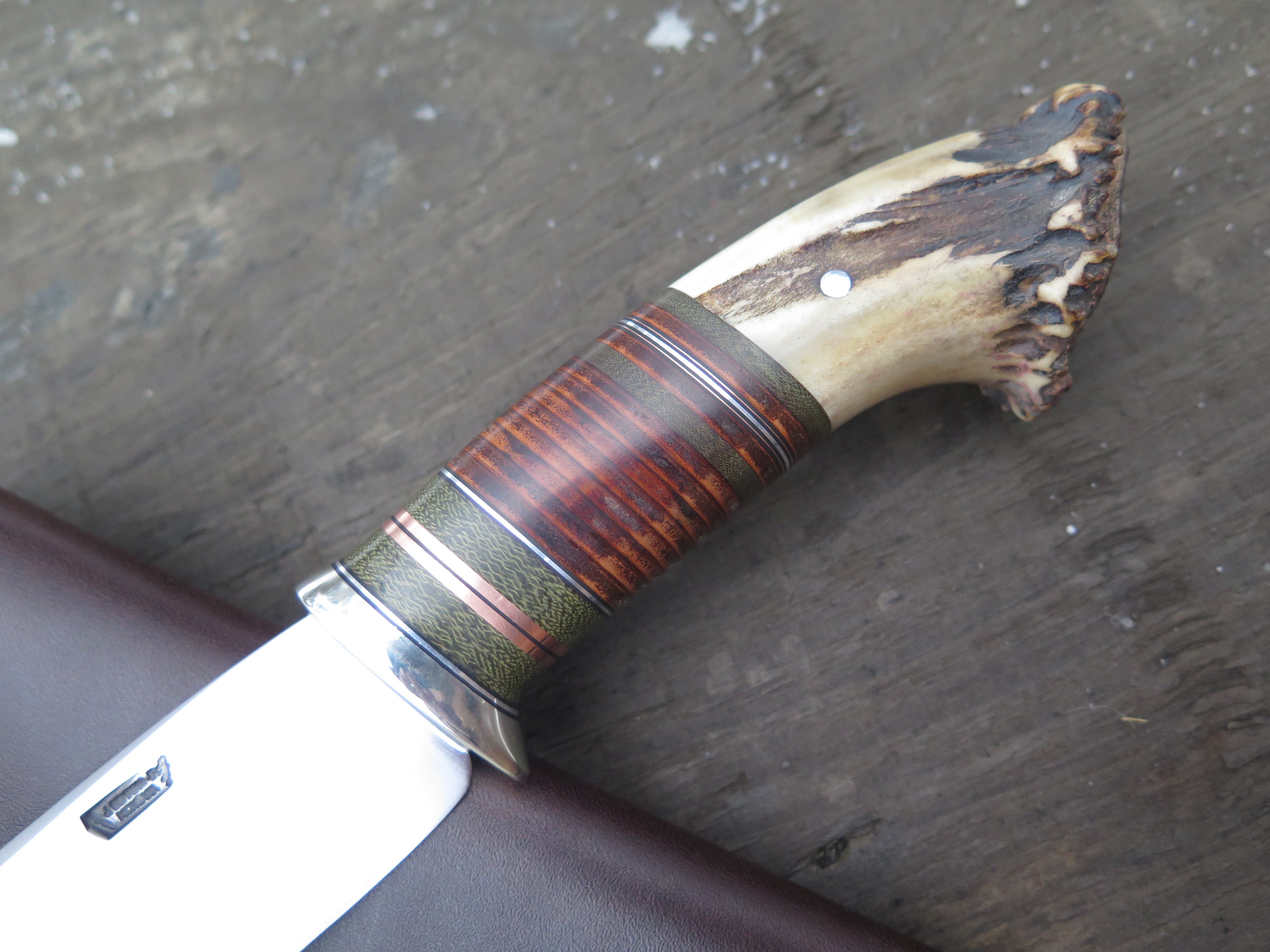 This classic Hunter from Behring Made© is hand forged from 3/16" thick high carbon 01 tool steel and it measures 4 1/2" from tip to guard with a razor sharp convex grind. The nickel silver guard is soldered in place above black fiber, green micarta, copper, aluminum and horsehide leather spacers that sit atop a premium sambar crown stag butt that's pinned with aluminum. The overall length measures just shy of 10" and it comes in a leather belt pouch sheath.