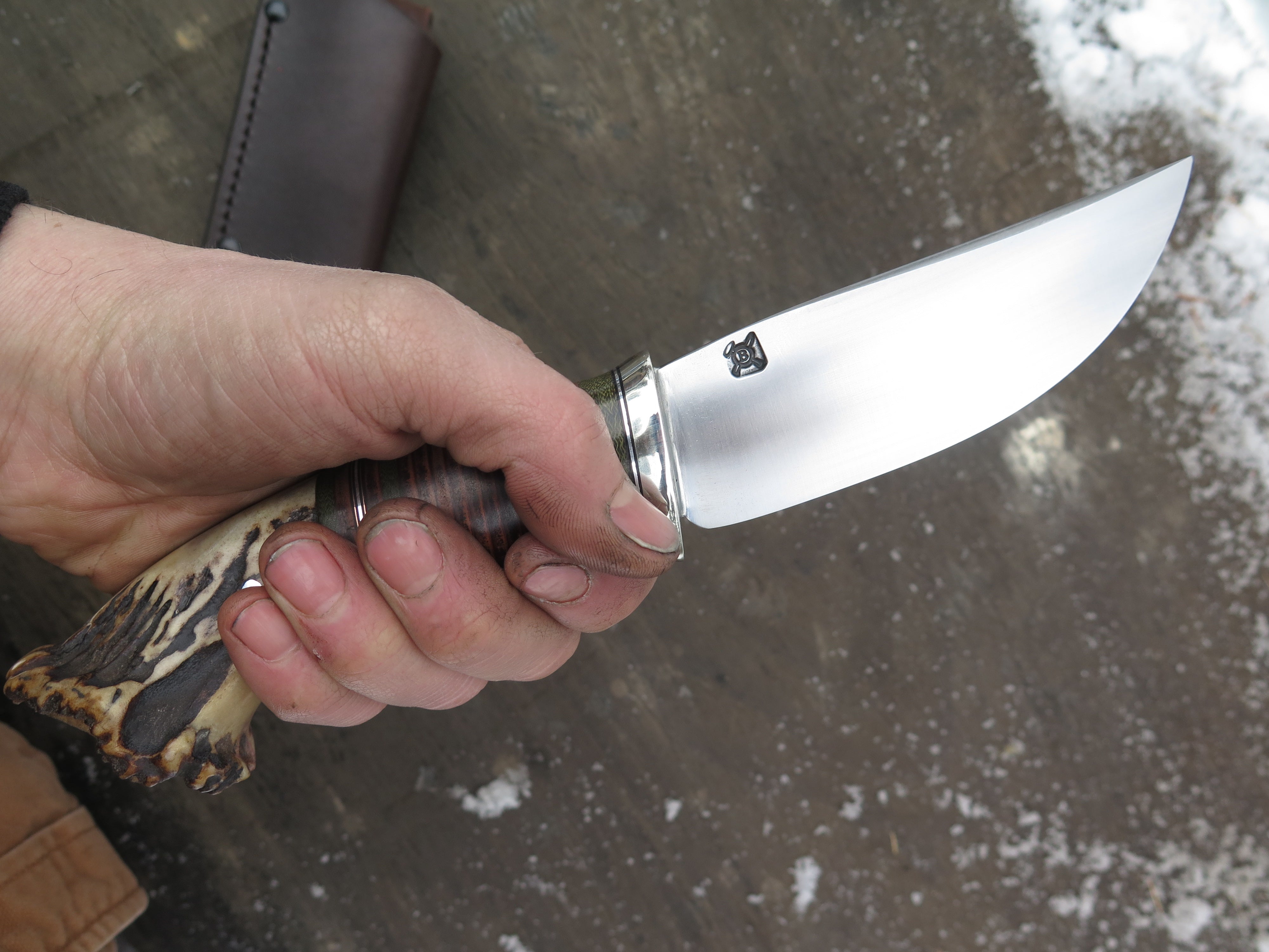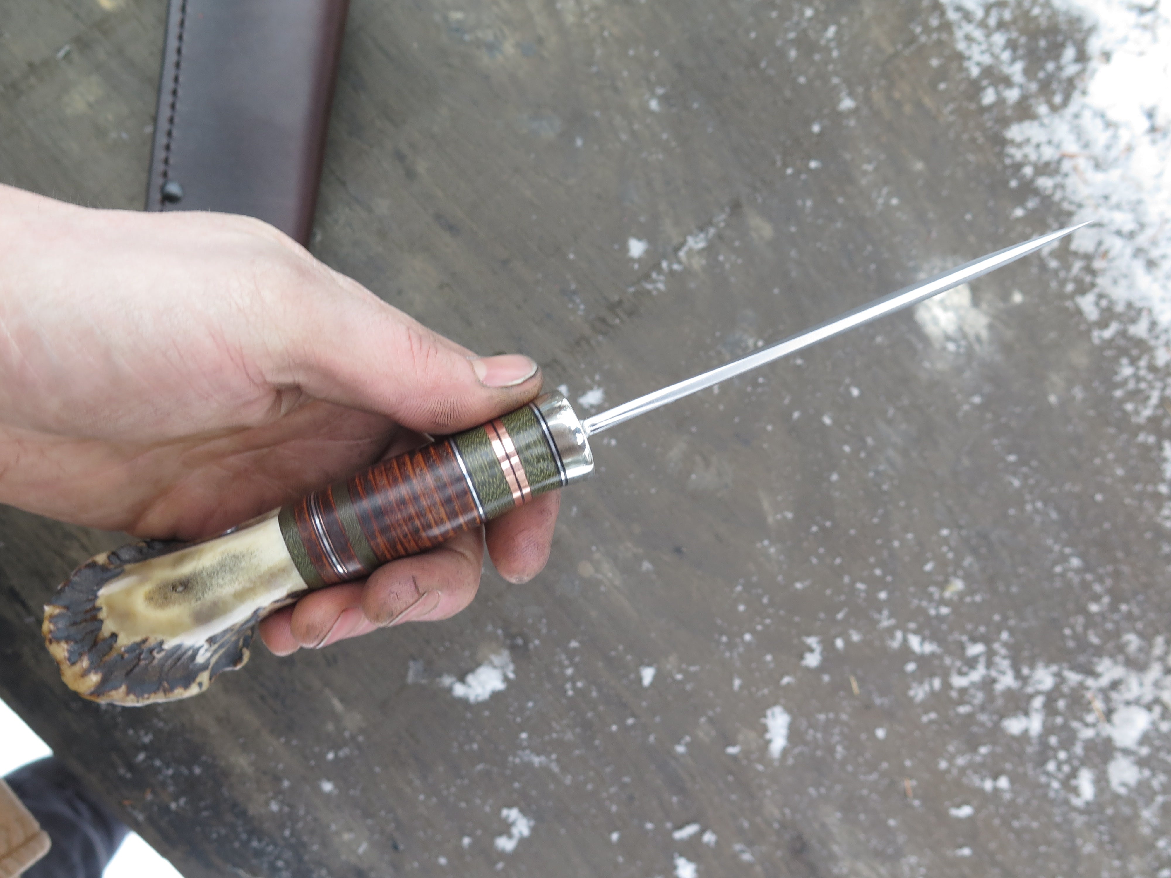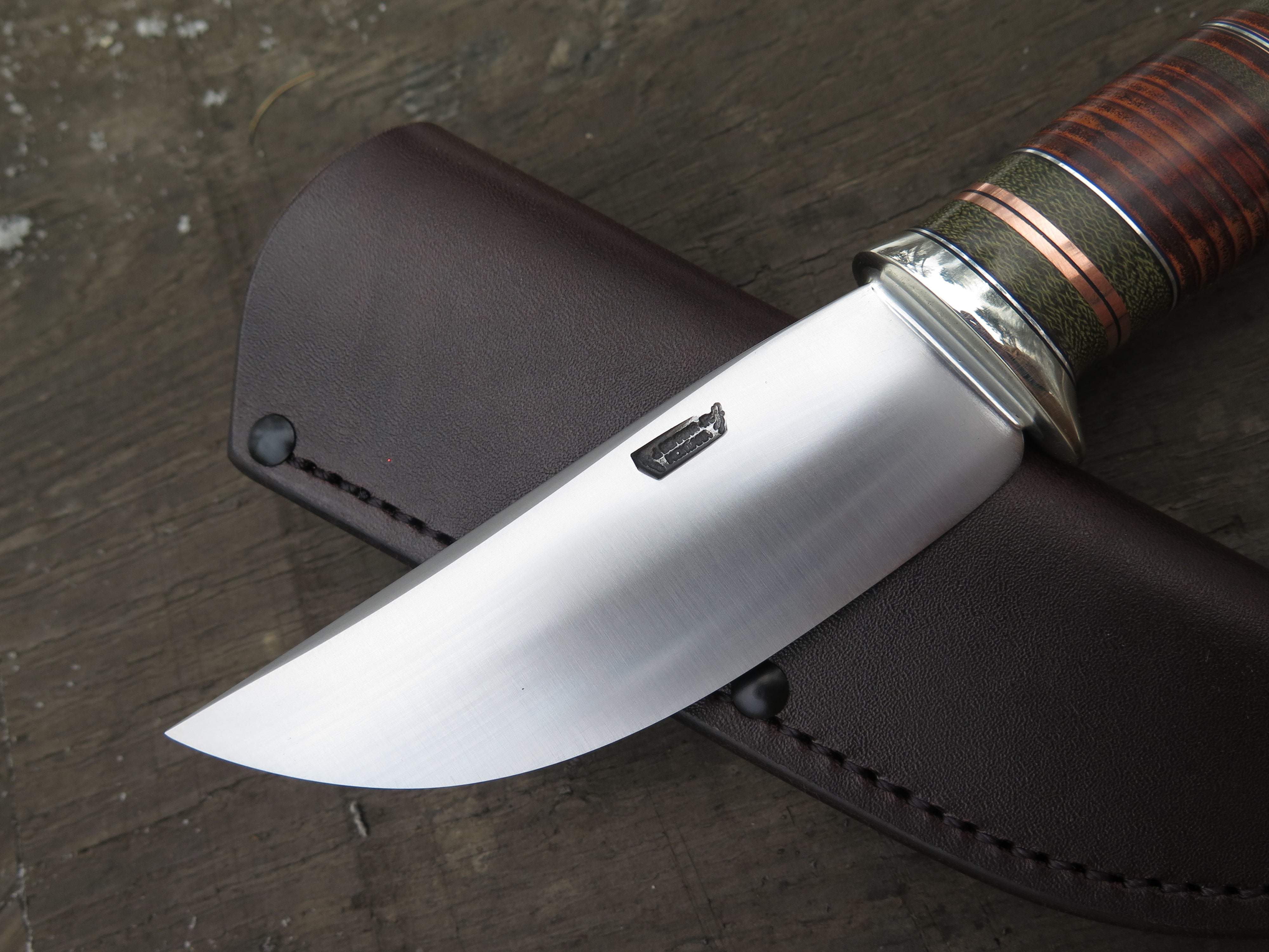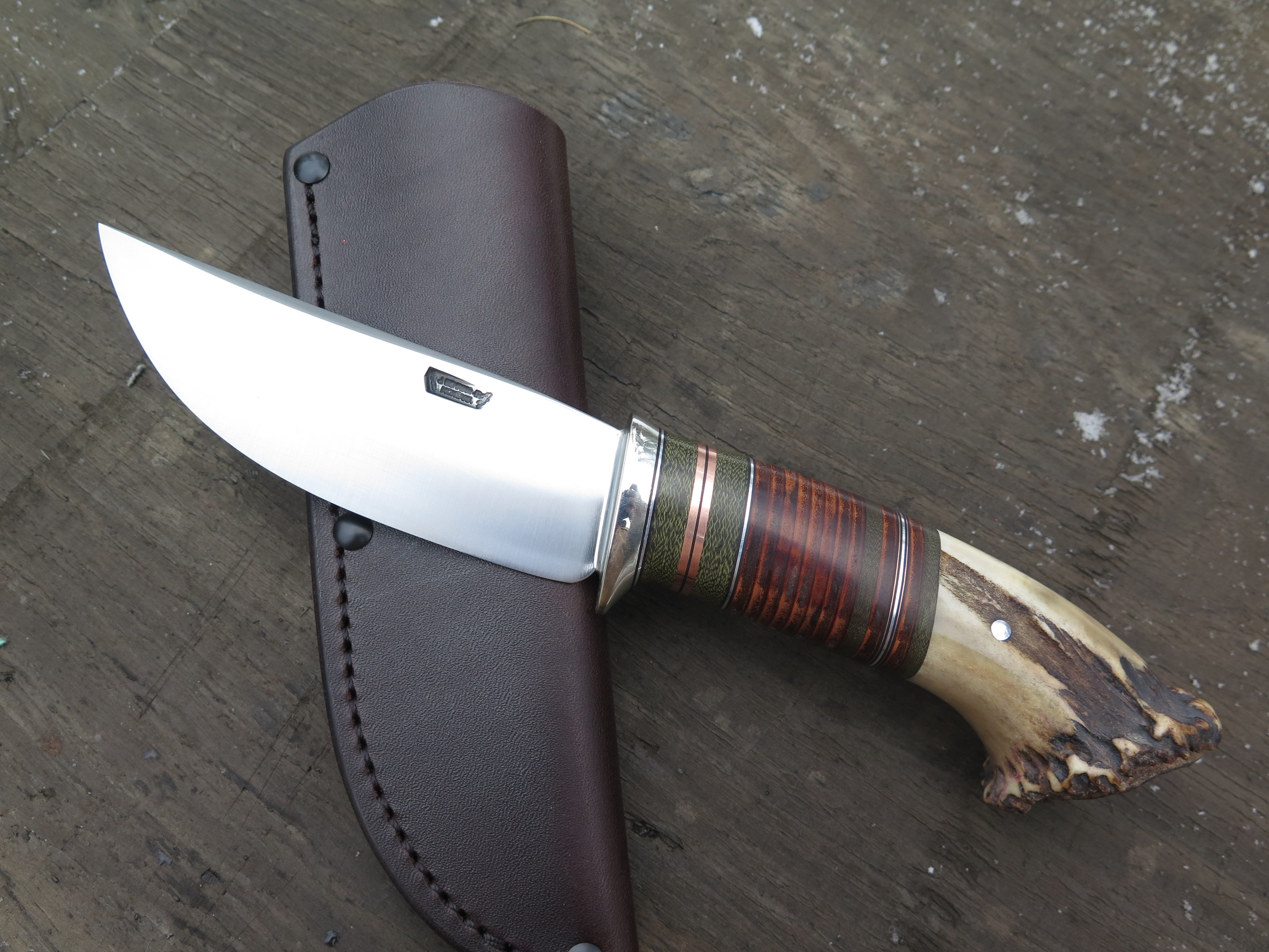 This classic Hunter from Behring Made© is hand forged from 3/16" thick high carbon 01 tool steel and it measures 4 1/2" from tip to guard with a razor sharp convex grind. The nickel silver guard is soldered in place above black fiber, green micarta, copper, aluminum and horsehide leather spacers that sit atop a premium sambar crown stag butt that's pinned with aluminum. The overall length measures just shy of 10" and it comes in a leather belt pouch sheath.