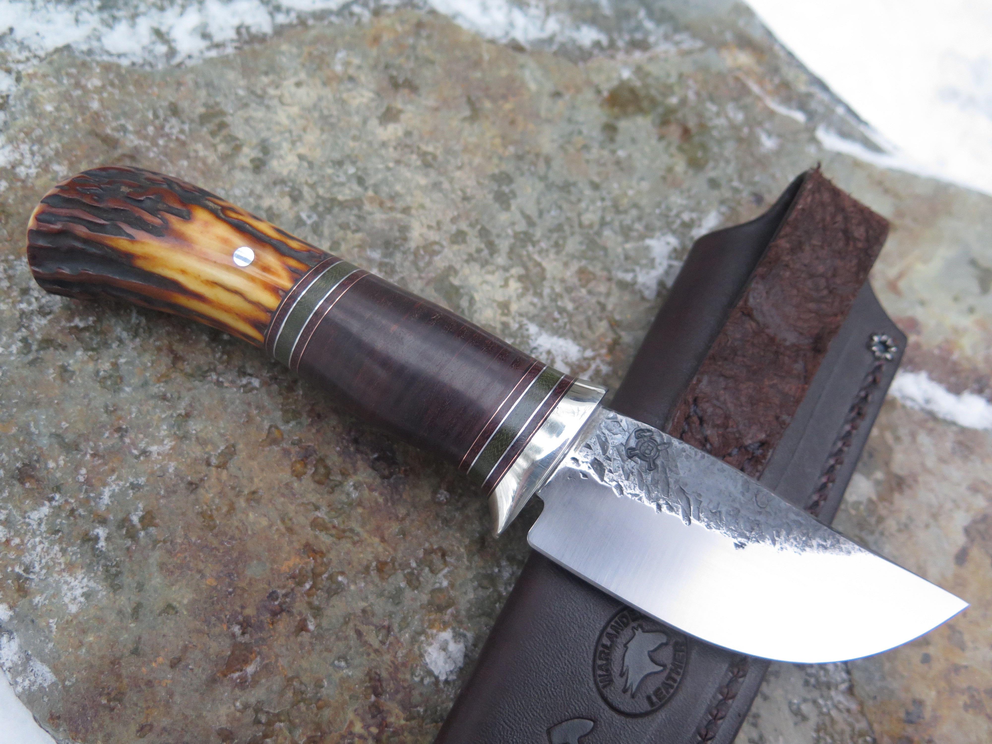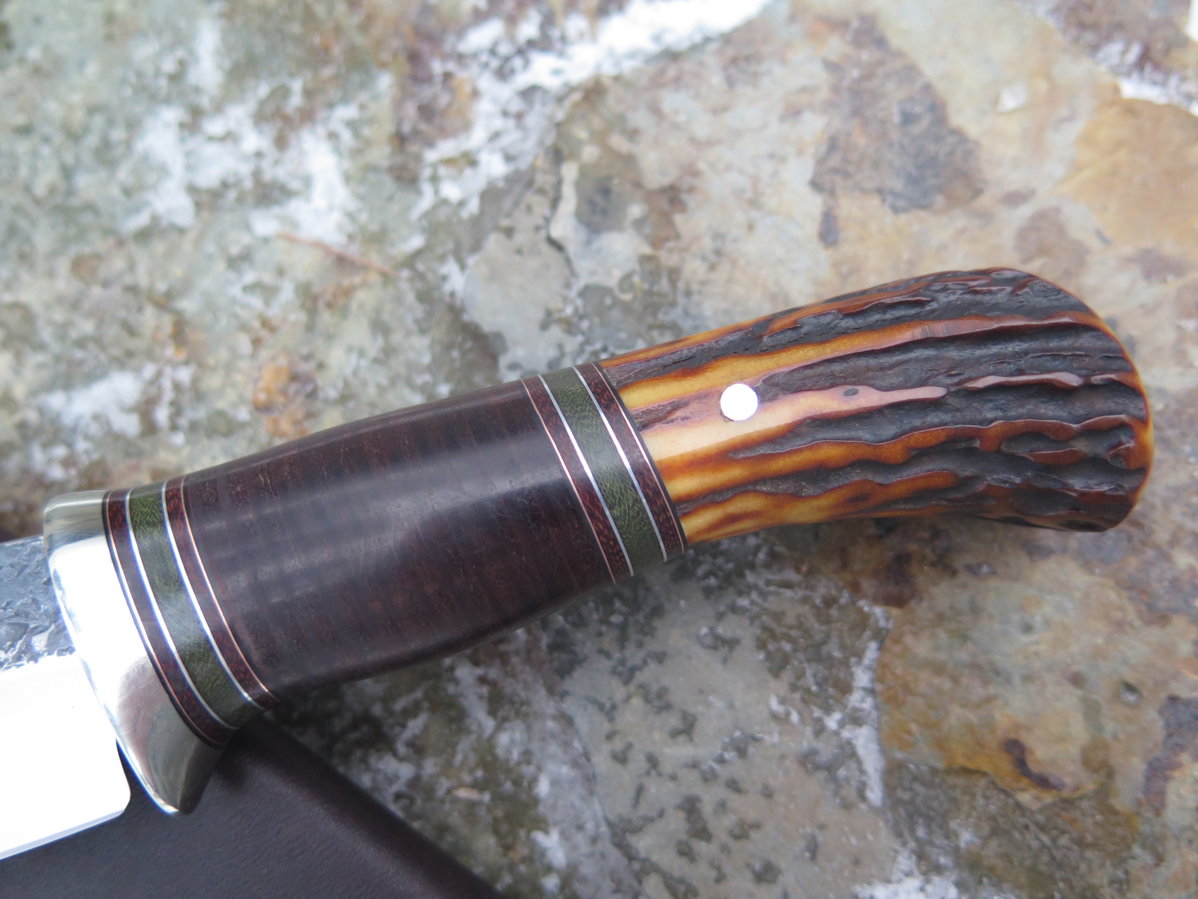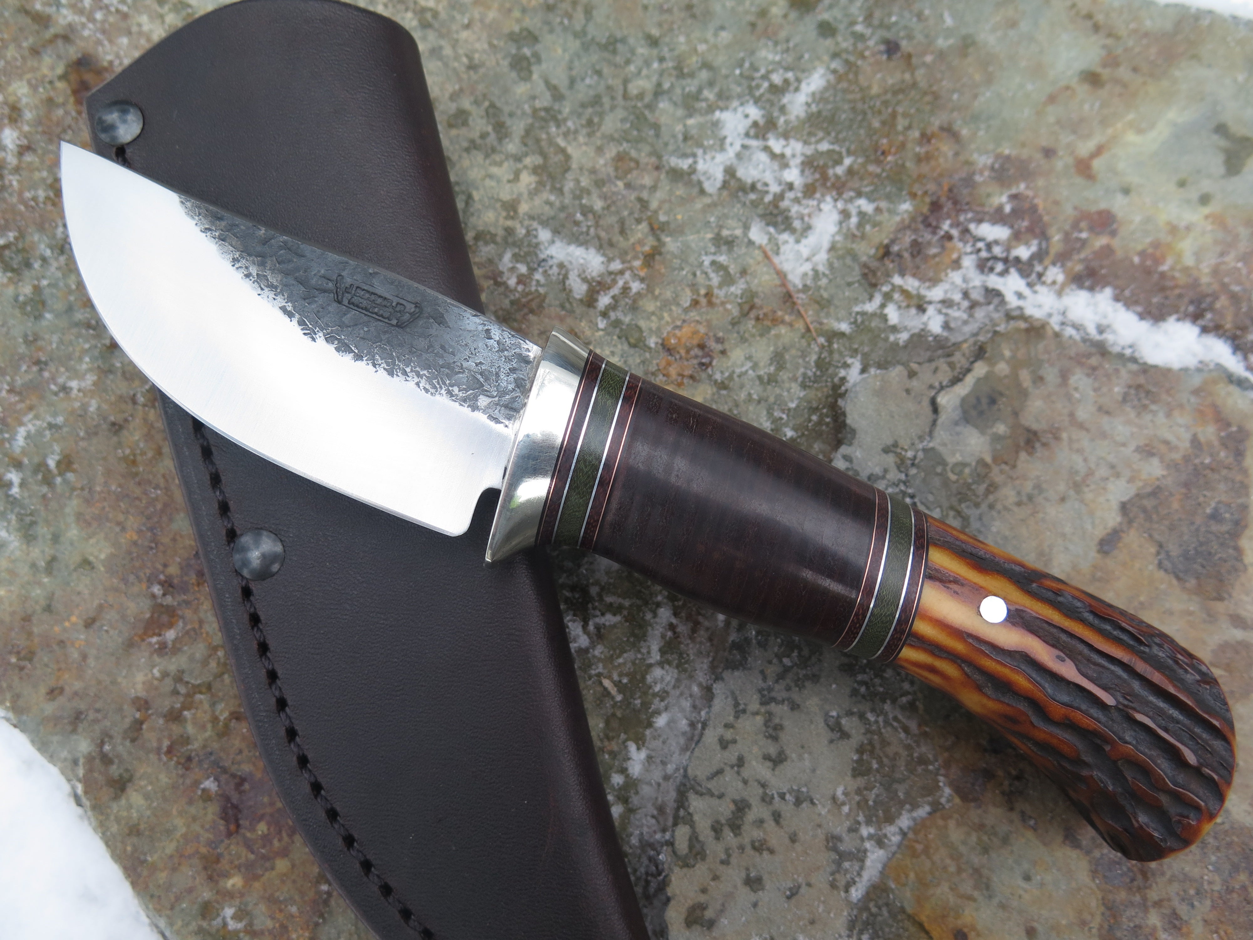 This beautiful new Sharptail from Behring Made© is hand forged from 3/16" thick high carbon 01 tool steel and it measures 3 1/2" from tip to guard with a razor sharp hollow grind and our hammermark finish. The nickel silver guard is soldered in place above black fiber, brown and green micarta, horsehide, aluminum and copper spacers with a premium sambar stag butt that's pinned through the tang with aluminum. The overall length measures 7 7/8" and it comes in a classic brown pouch sheath.