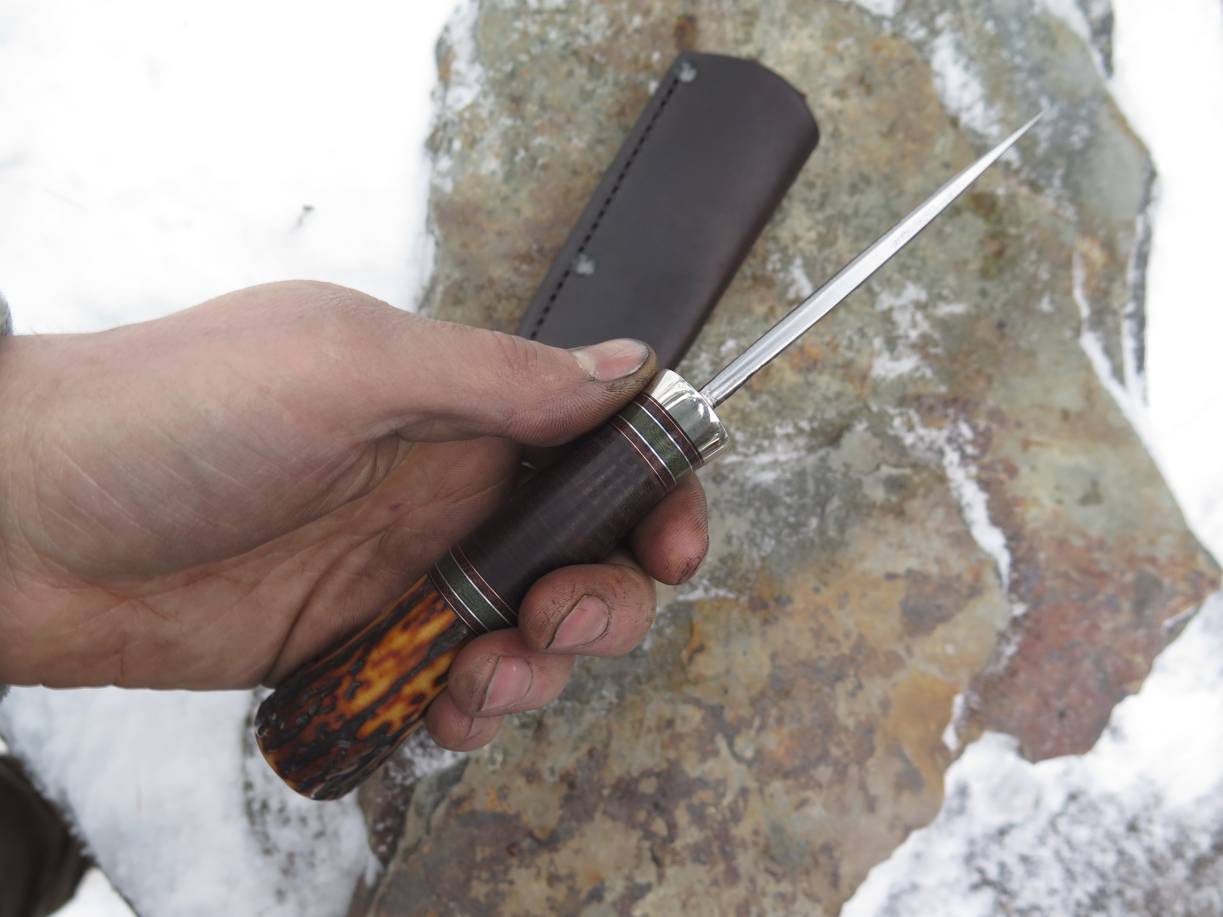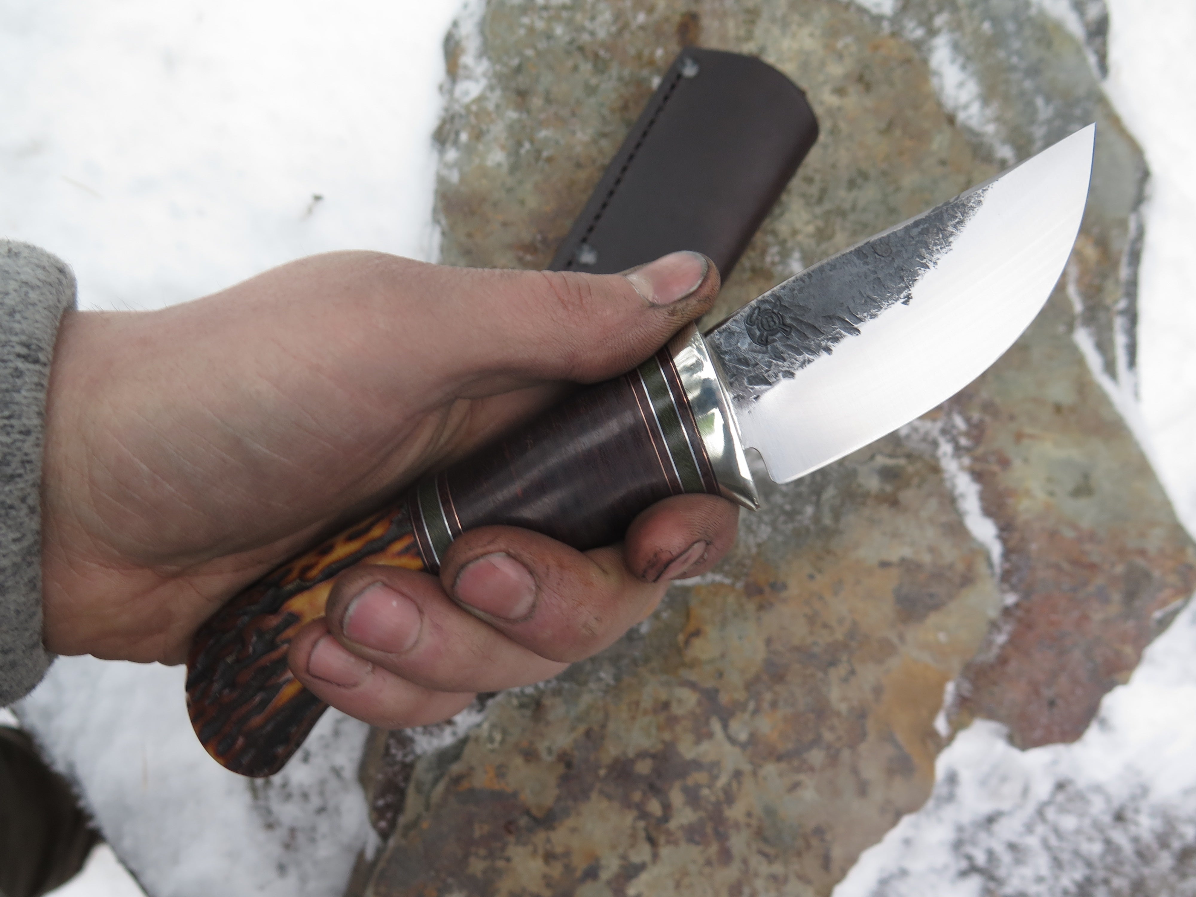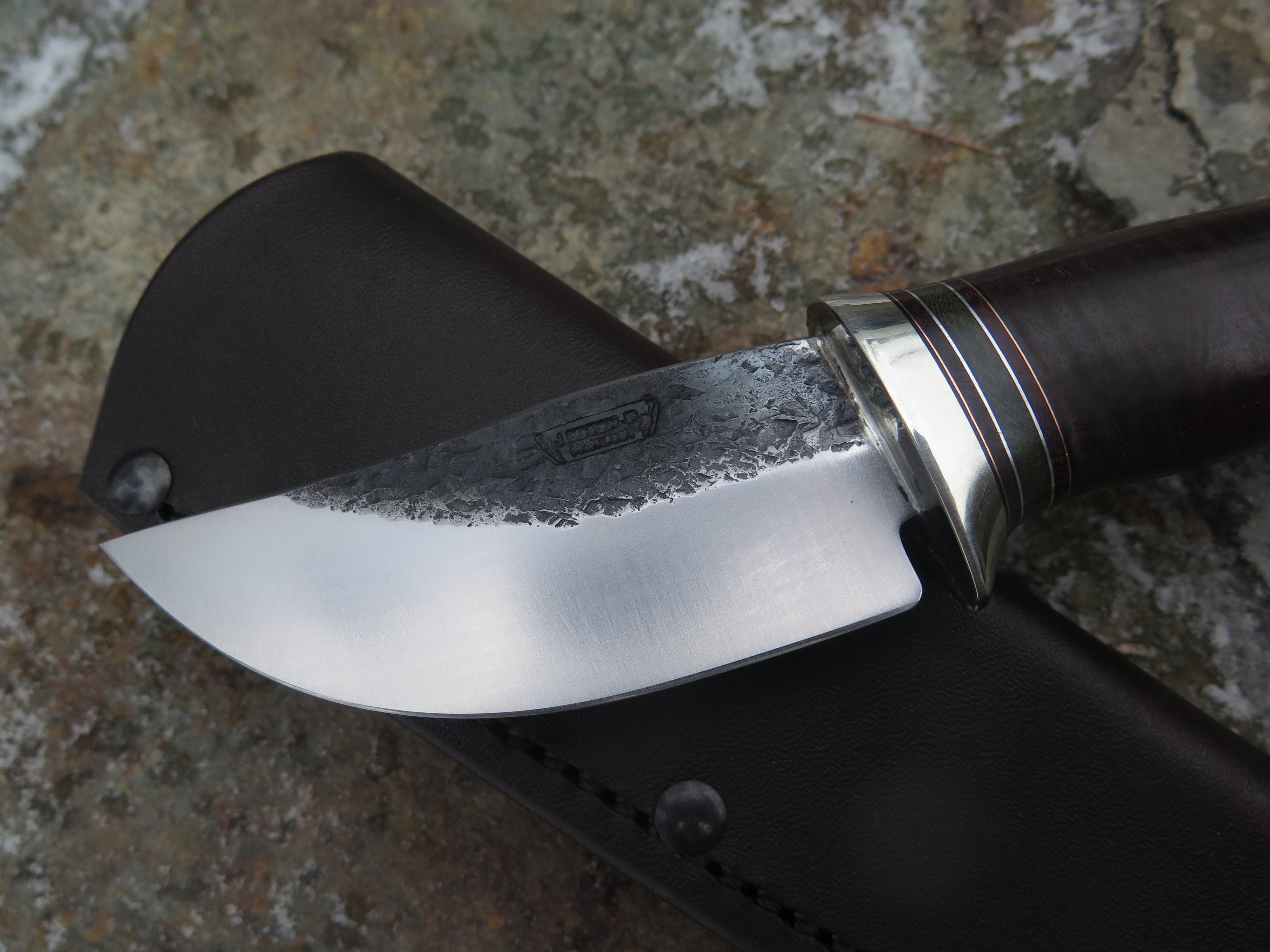 This beautiful new Sharptail from Behring Made© is hand forged from 3/16" thick high carbon 01 tool steel and it measures 3 1/2" from tip to guard with a razor sharp hollow grind and our hammermark finish. The nickel silver guard is soldered in place above black fiber, brown and green micarta, horsehide, aluminum and copper spacers with a premium sambar stag butt that's pinned through the tang with aluminum. The overall length measures 7 7/8" and it comes in a classic brown pouch sheath.