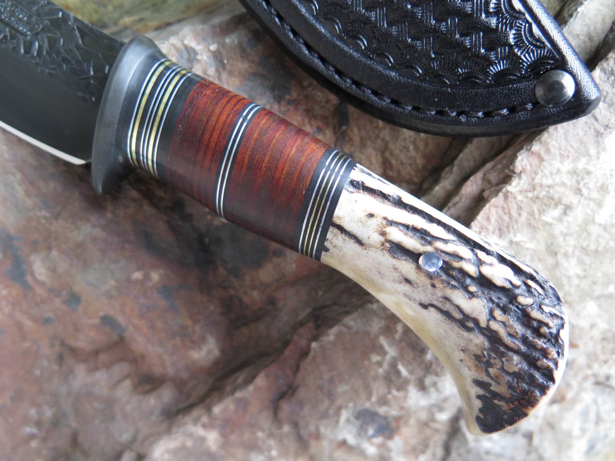 This bad ass Hunter from Behring Made is hand forged from 3/16" thick high carbon 01 tool steel and it measures 4 1/2" from tip to guard with a razor sharp hollow grind, hammermarks and our forced patina gun blued finish. The blued steel guard is soldered in place above black fiber, brass, aluminum and horsehide spacers that flow into the hand selected sambar stag butt that's pinned through the tang with aluminum. The overall length measures 9 1/4" and it comes in a Warlander Leather basketweave pouch sheath. Respect your hunt, respect your game, use a Behring Made.