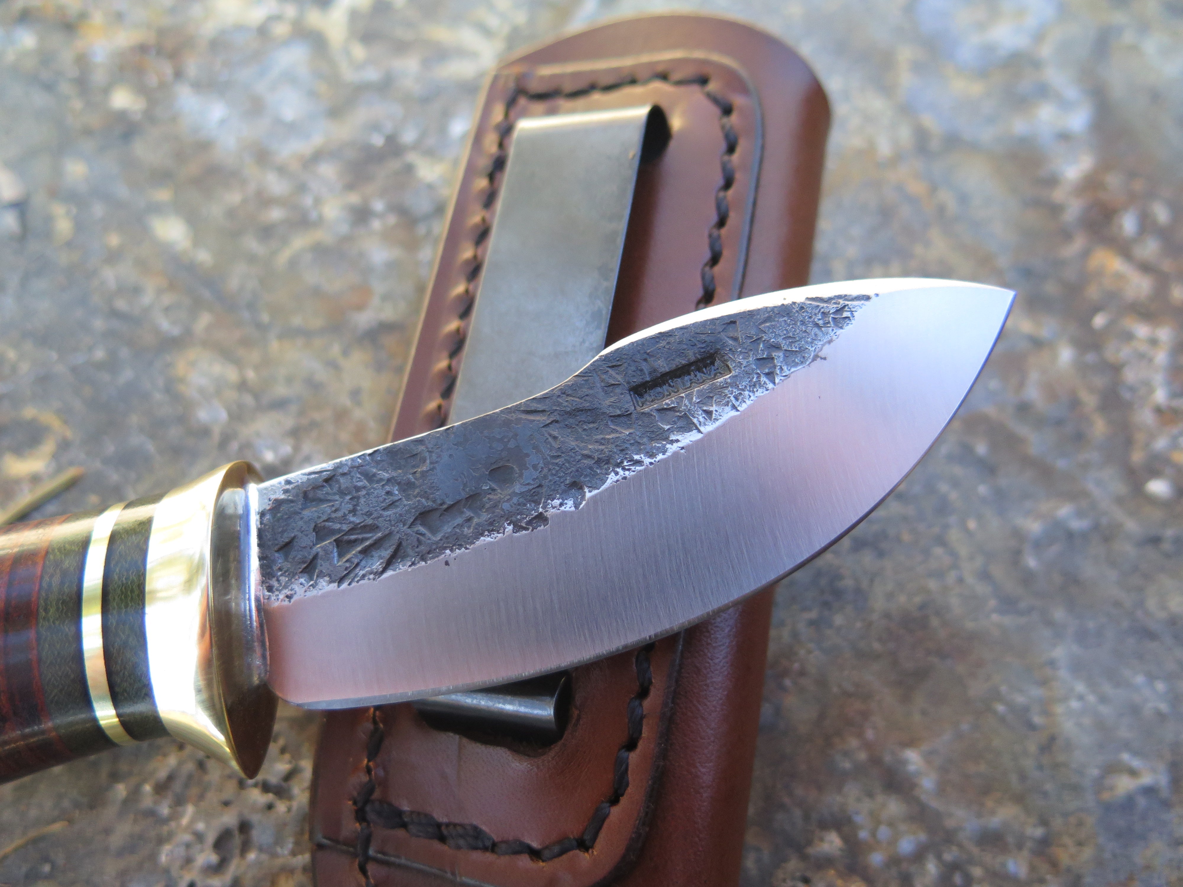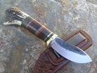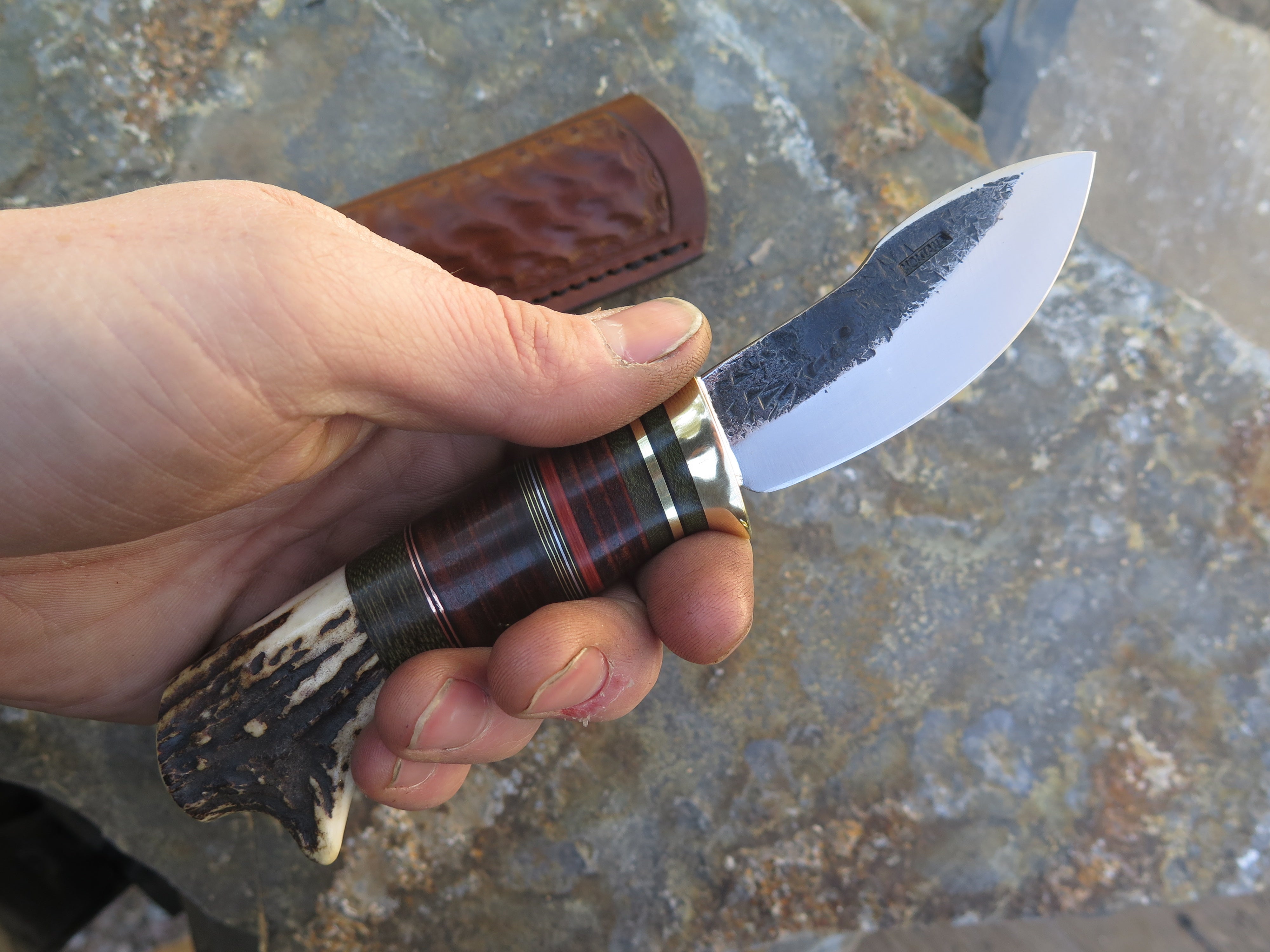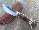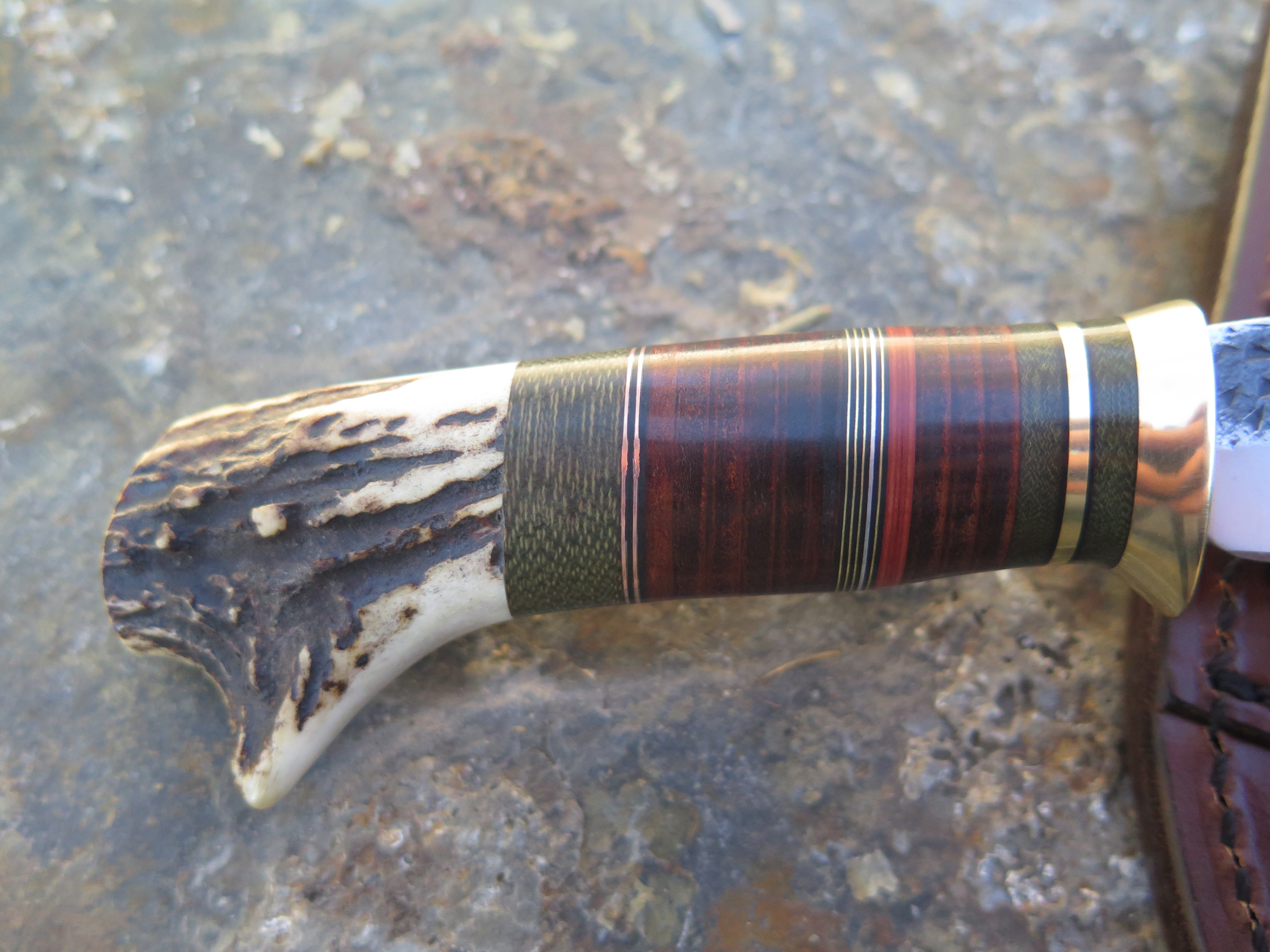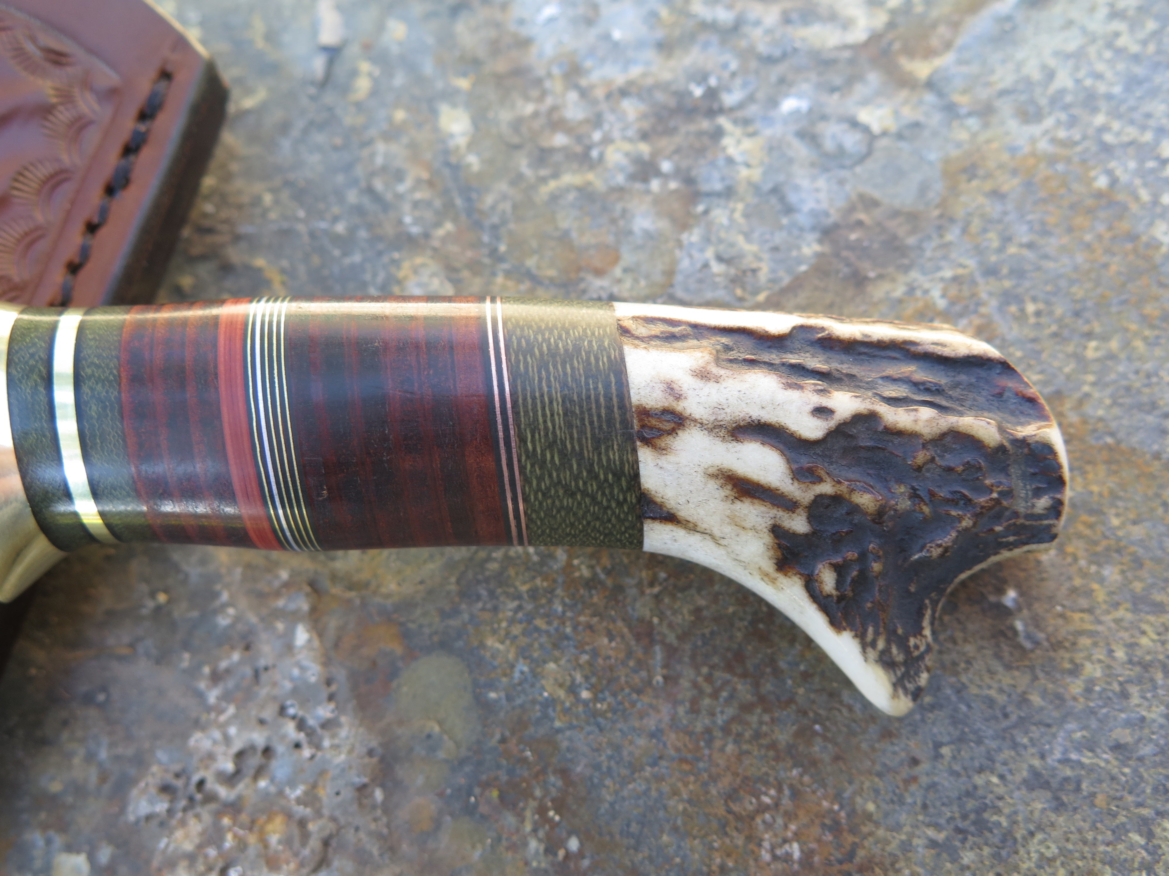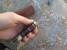 This beautiful new Behring Made© Canoe Pocket knife is hand forged out of 1/8" thick high carbon 01 tool steel and it measures 3" from tip to guard with a razor sharp hollow grind and our hammermark finish. The brass guard is soldered in place above black and maroon fiber, green micarta, brass, copper and horsehide leather spacers as well as a premium sambar stag butt with a naturally ergonomic crotch that fits the handle nicely. The overall length measures 7" and it comes in a spring clip pocket sheath designed to ride in the right hand pocket of your jeans.