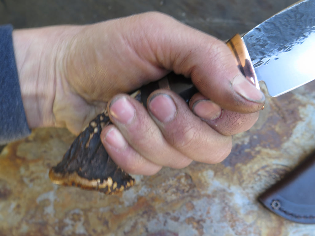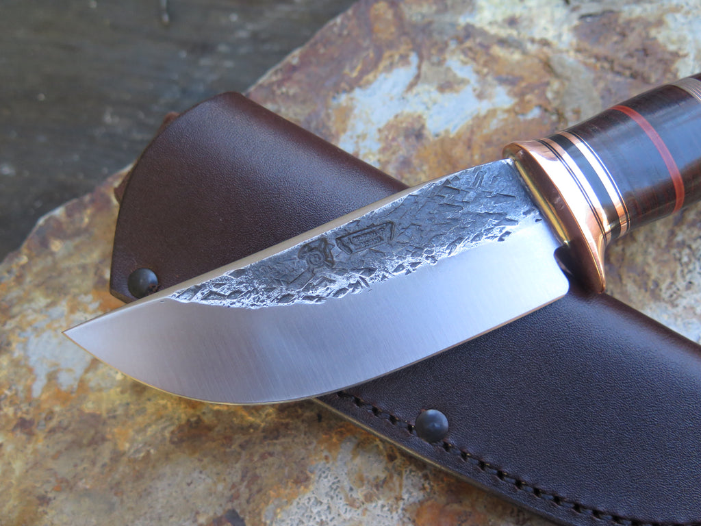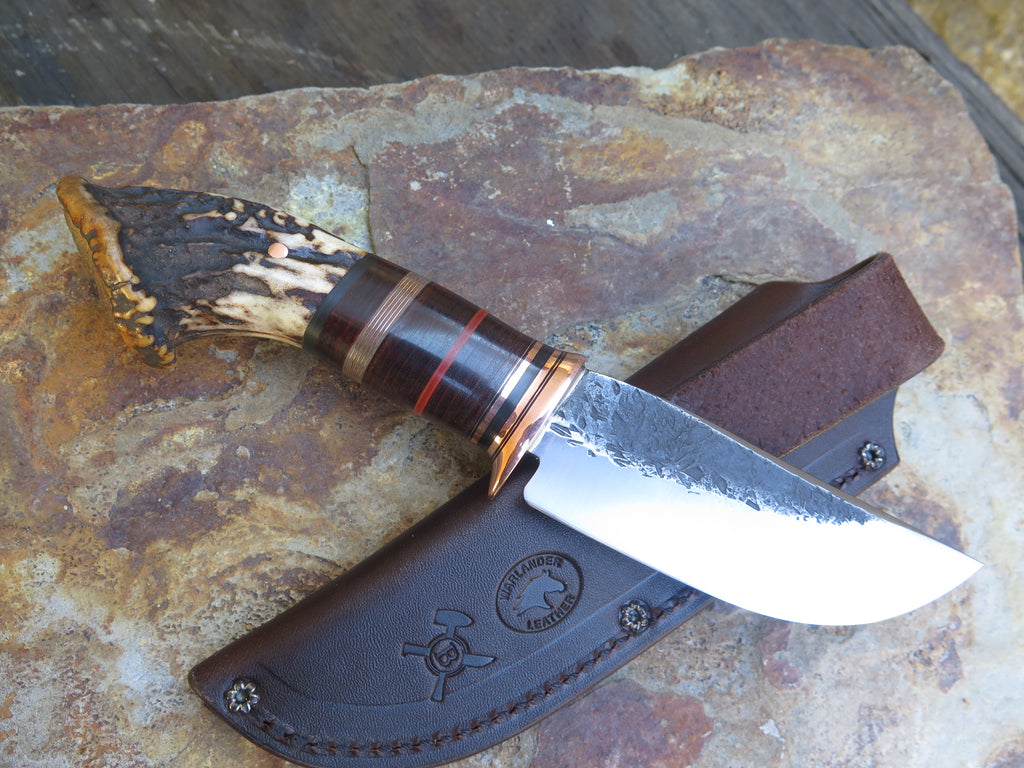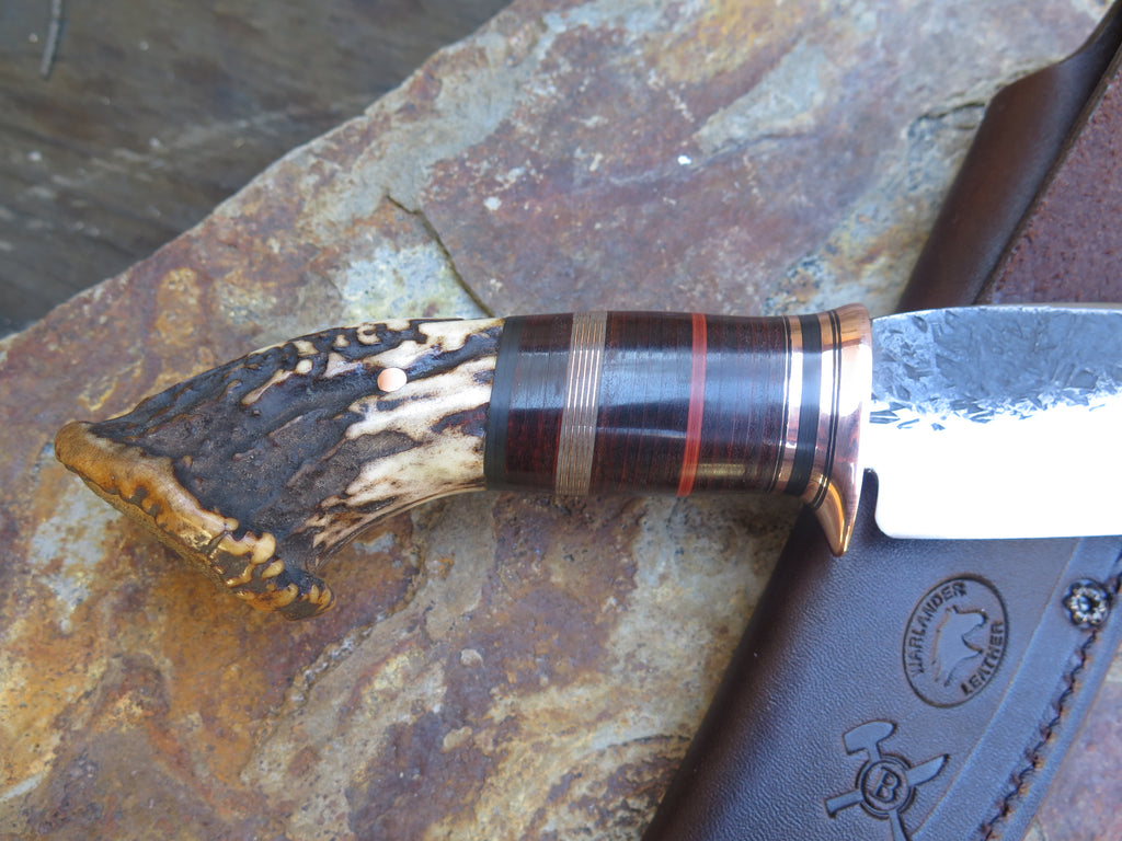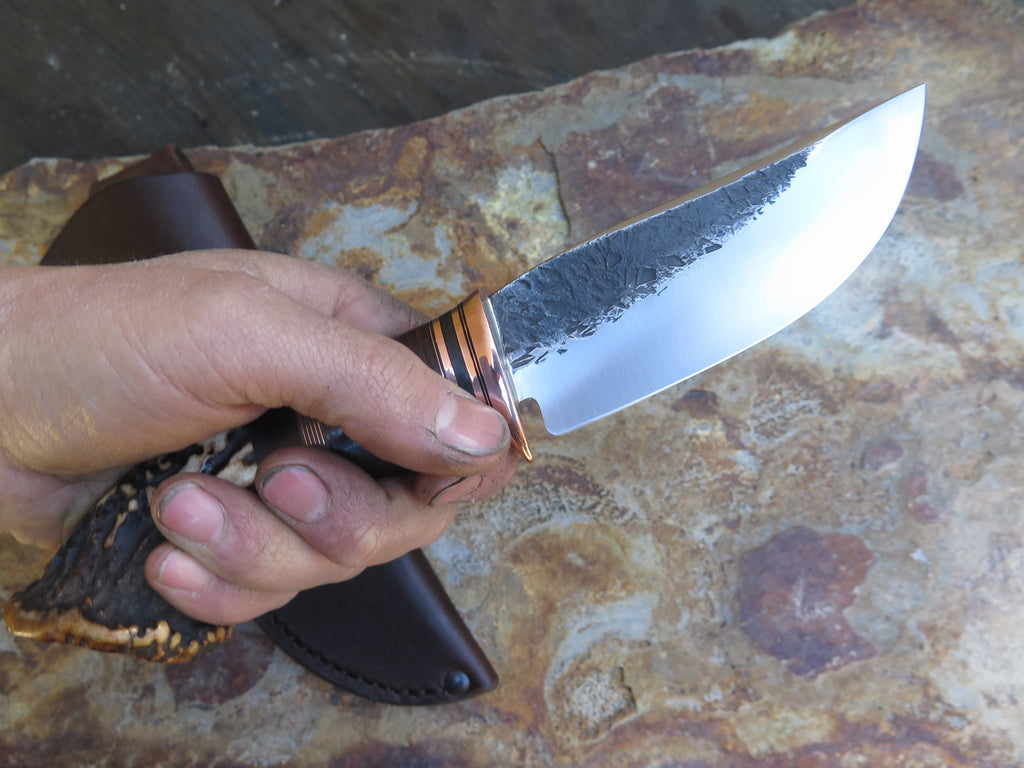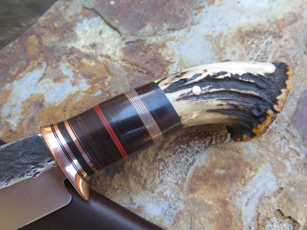 This bad ass new Hunter from Behring Made© is hand forged from 3/16" thick high carbon 01 tool steel and it measures 4 1/2" from tip to guard with a razor sharp hollow grind and our hammermark finish. The copper guard is soldered in place above black, maroon and gray fiber, copper and horsehide leather spacers as well as a premium sambar crown stag handle that's pinned through the tang with copper. The overall length measures 9 3/4", and it comes in a classic leather belt pouch sheath. The angle of the crown allows for about 3 1/4" of grip, which may be a bit too small for larger hands. Satisfaction is guaranteed so if it's not a perfect fit for you we can always make another- just ask!