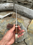 - Green Micarta, Aluminum, Copper, Black Fiber, Maroon Fiber, Mammoth Ivory, & Horsehide Handle