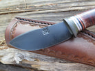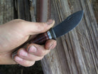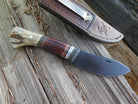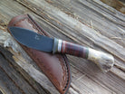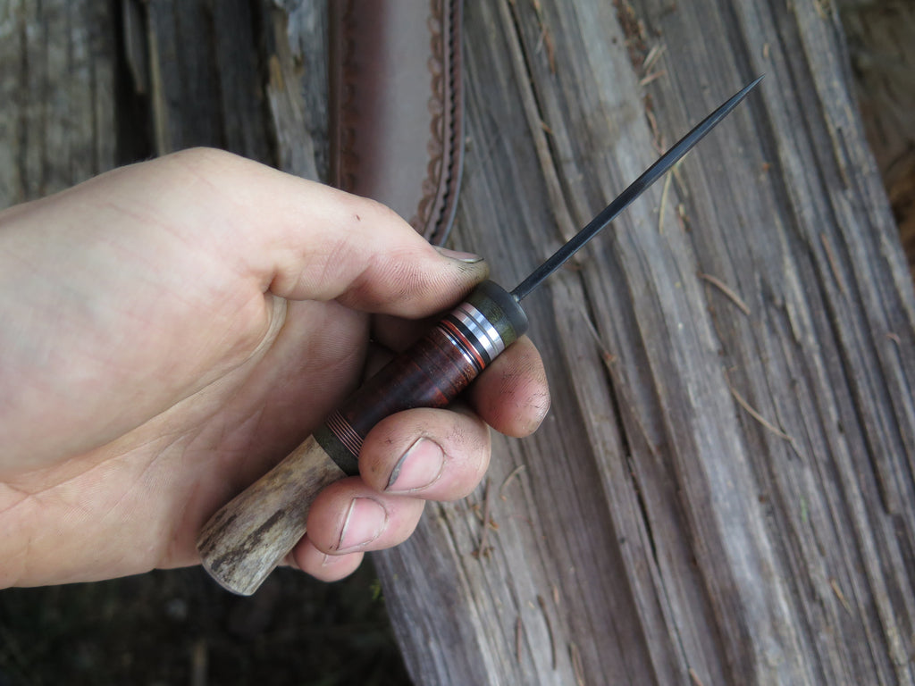 This bad ass new Pocket Canoe from Behring Made© is hand forged from 1/8" thick high carbon 01 tool steel and it measures 3" from tip to guard with a razor sharp convex grind and our forced patina blued finish. The blued steel guard is soldered in place above black, maroon and gray fiber, green micarta, aluminum, copper and horsehide leather. The whitetail stag butt is pinned through the tang with aluminum and the whole rig measures out to 6 3/8", plus it rides in the right hand pocket of your britches with the convenient clip sheath from Warlander Leather.
