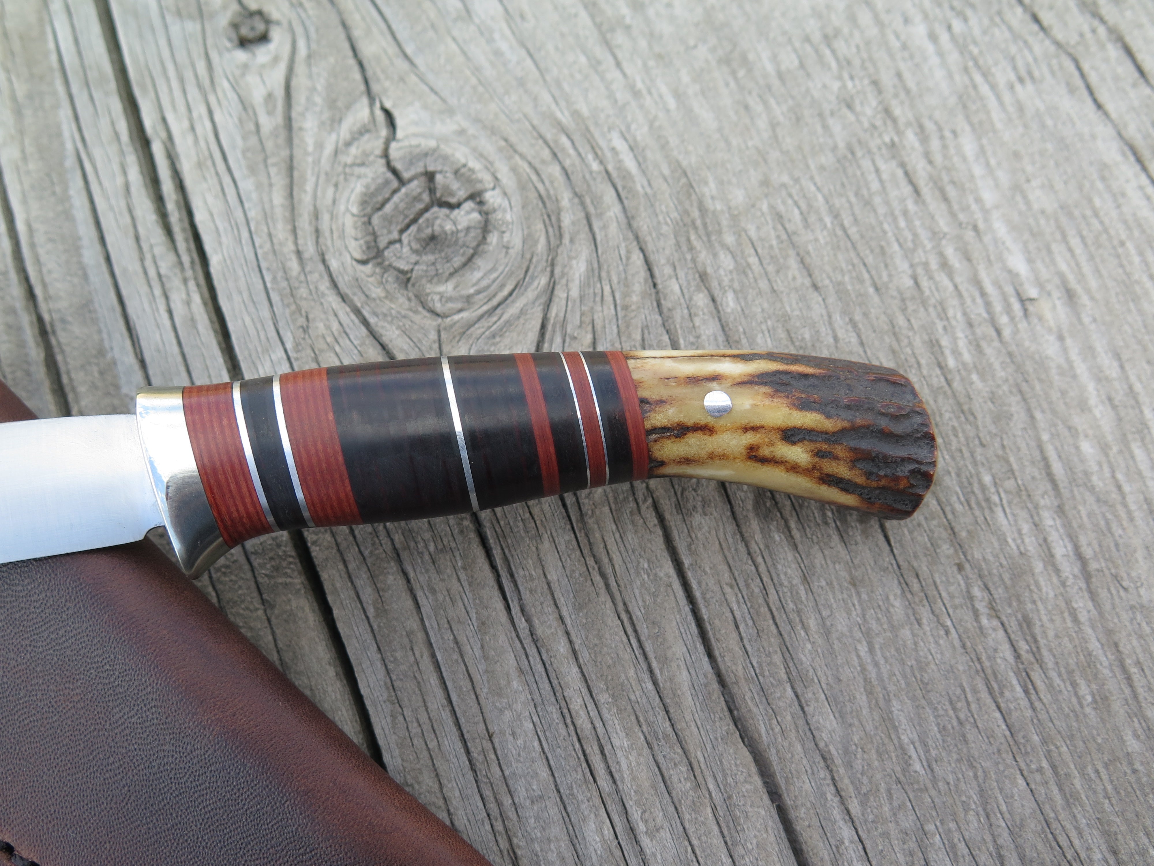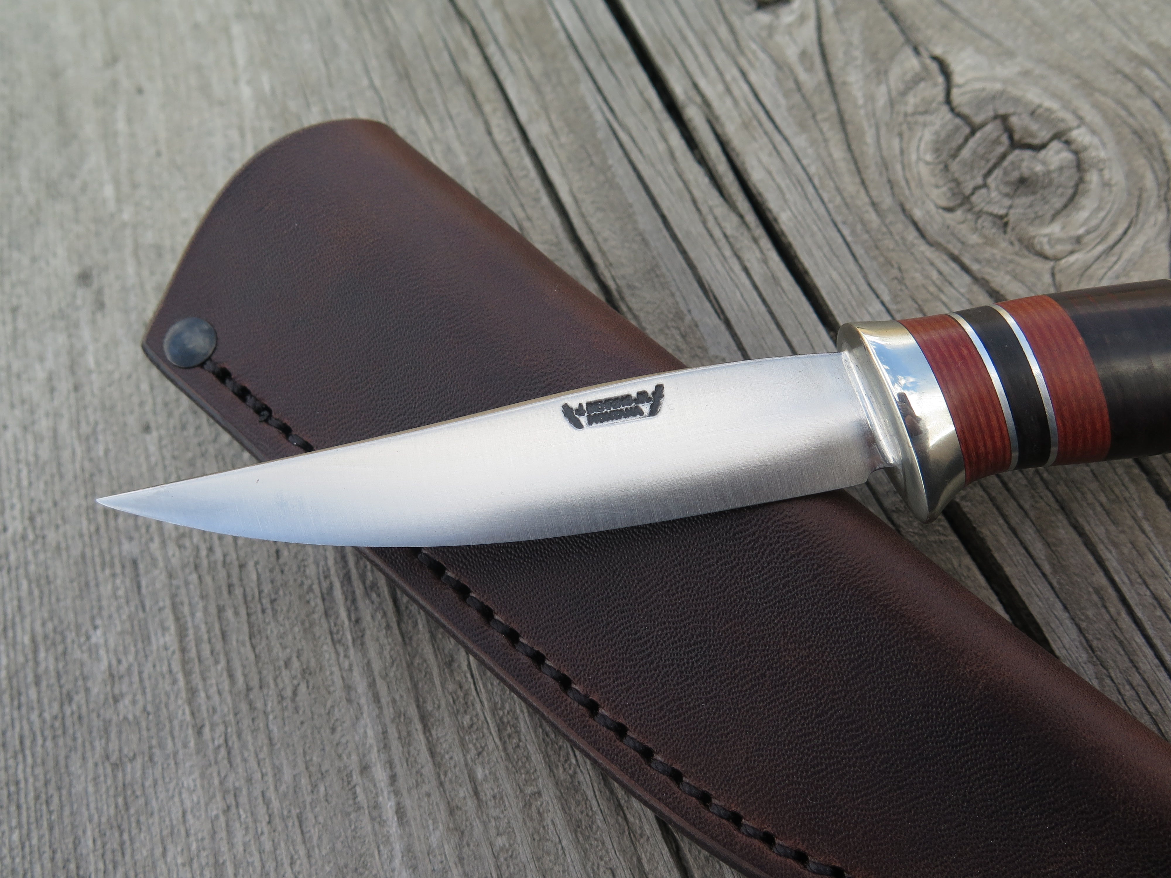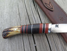 This may be a brand new knife, but the personality of this Behring Made© Pintail is instantly timeless. The 1/8" thick 440c stainless blade measures 4" from tip to guard with a razor sharp convex grind and is ideal for all things hunt, fish and small camp. The nickel silver guard is soldered in place above black and maroon fiber, aluminum and horsehide leather spacers finished off with a sambar stag butt that's pinned through the tang with aluminum. The overall length measures 8 1/8" and it comes in a classic Behring Made© pouch sheath for belt carry.