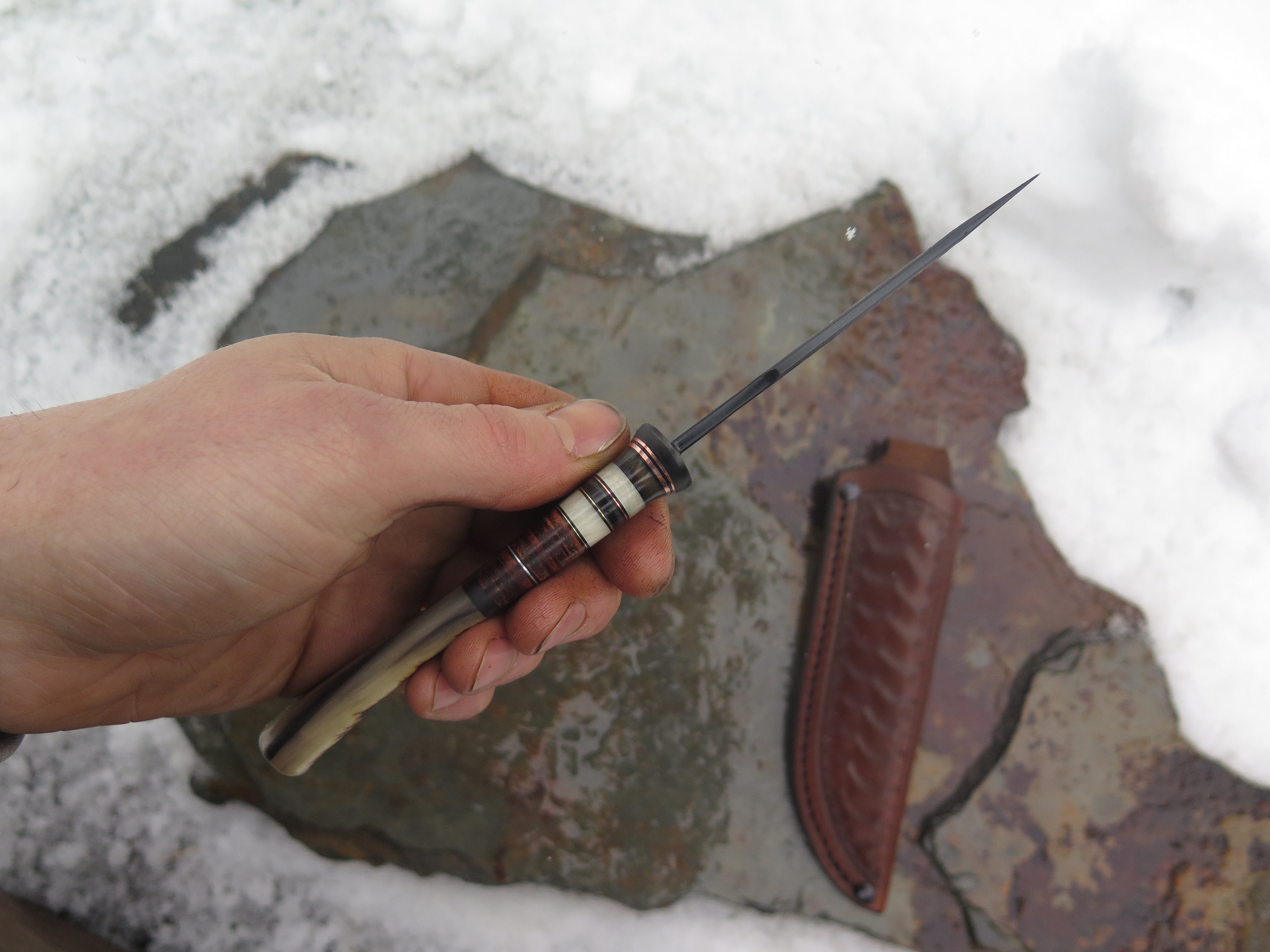 This awesome new modified Pintail from Behring Made© is hand forged from 1/8" thick high carbon 01 tool steel and it measures 3 3/4" from tip to guard with a razor sharp hollow grind, hammermarks and our forced patina blued finish. The blued steel guard is soldered in place above Dall's and Big horn sheep, black fiber, copper and aluminum spacers with a premium big horn handle that brings the overall length out to 8". The sheath comes from Warlander Leather with a premium tooling and your satisfaction is guaranteed.