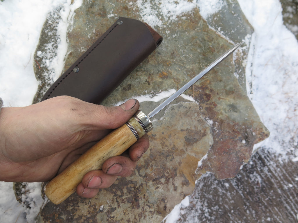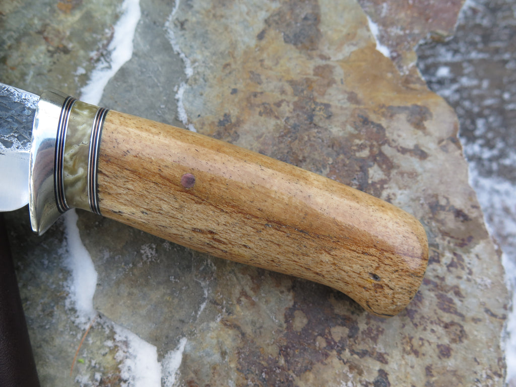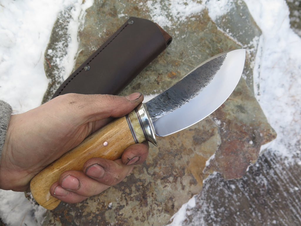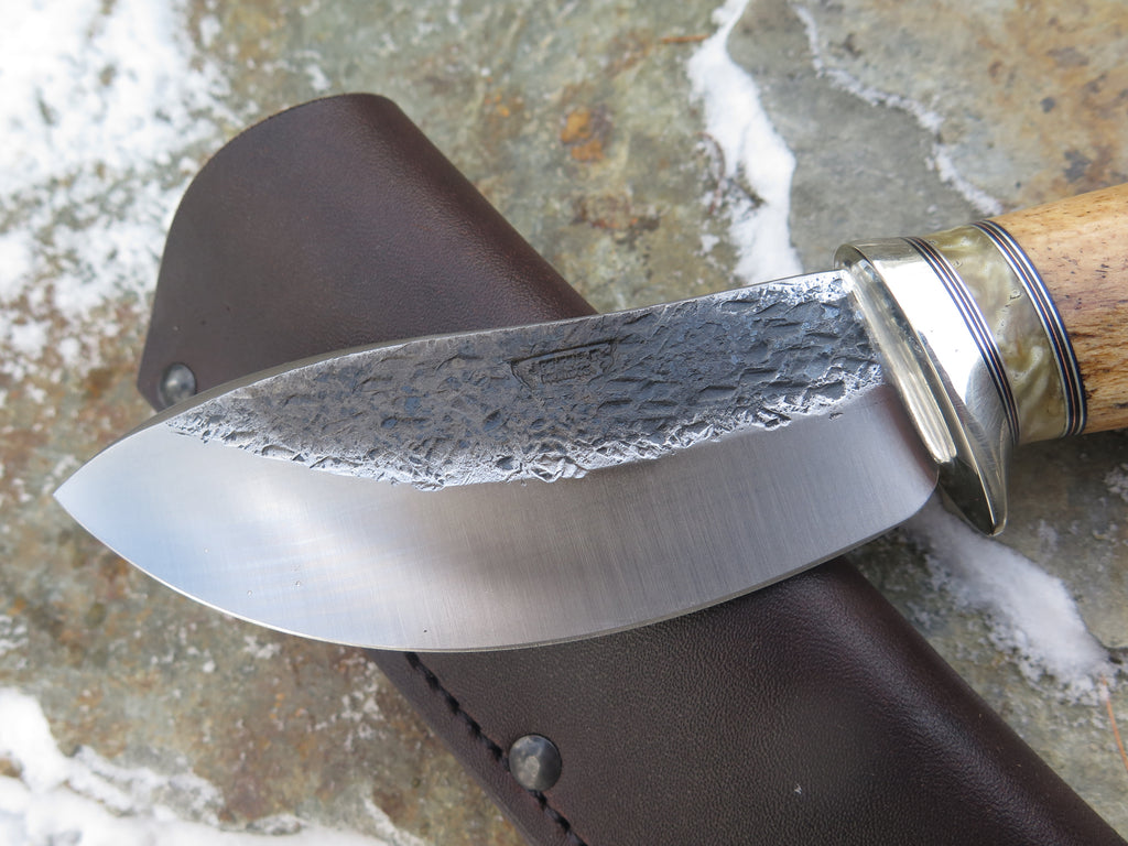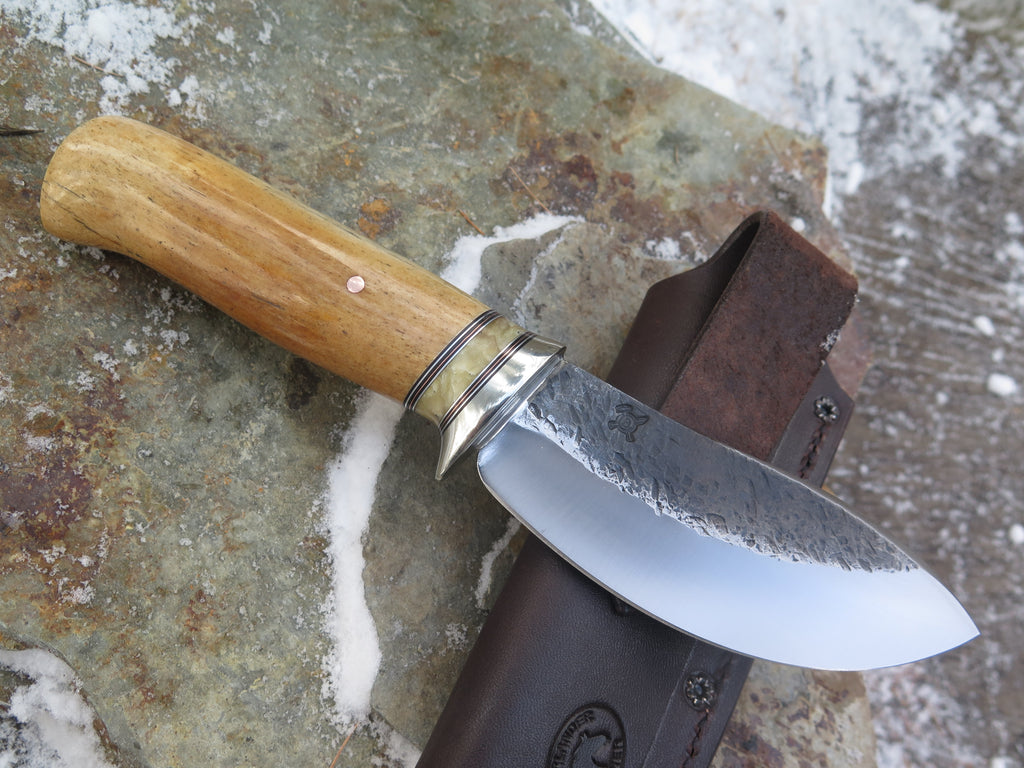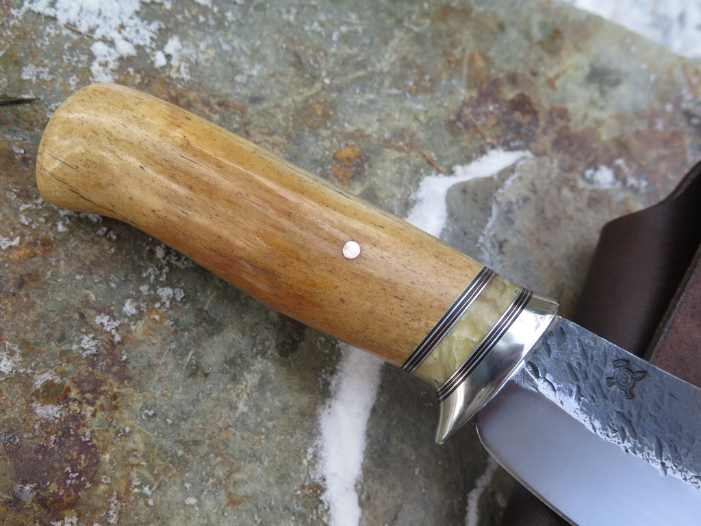 This beautiful Behring Made© Nessmuk is hand forged from 3/16" thick high carbon 01 tool steel and it measures 4 1/2" from tip to guard with a razor sharp hollow grind and our hammermark finish. The nickel silver guard is soldered in place above black fiber, aluminum, copper and musk ox boss spacers which top a premium Stellar's sea cow rib handle that's pinned with copper. The overall length measures 9" and it comes in a classic leather belt pouch sheath.