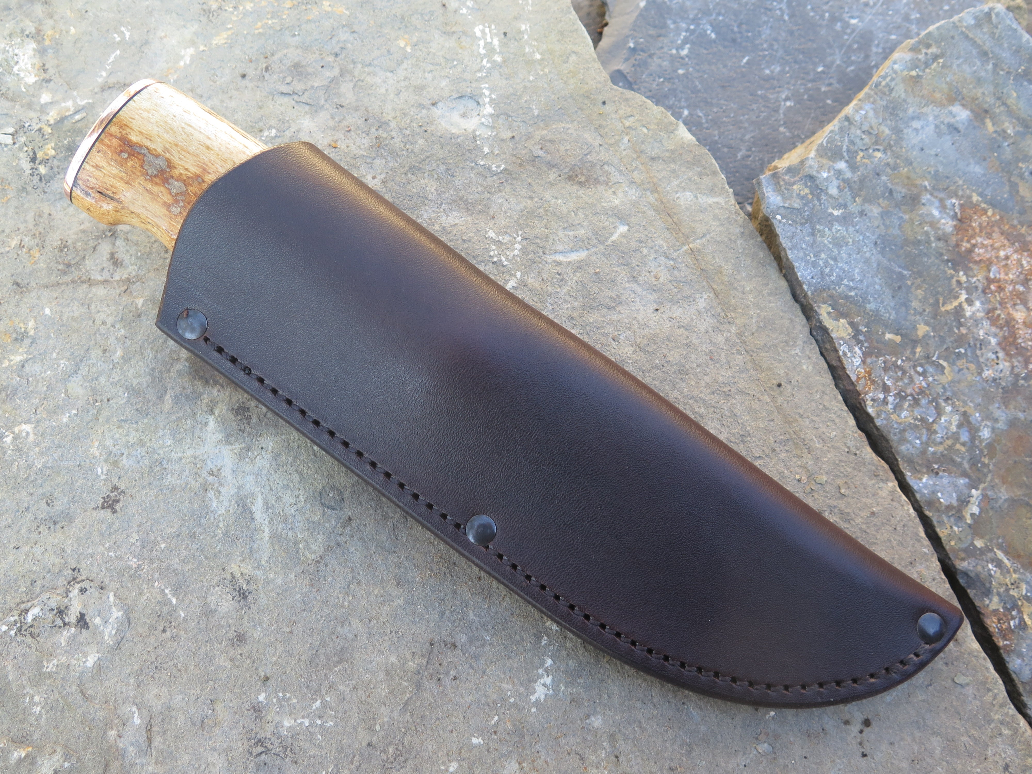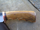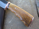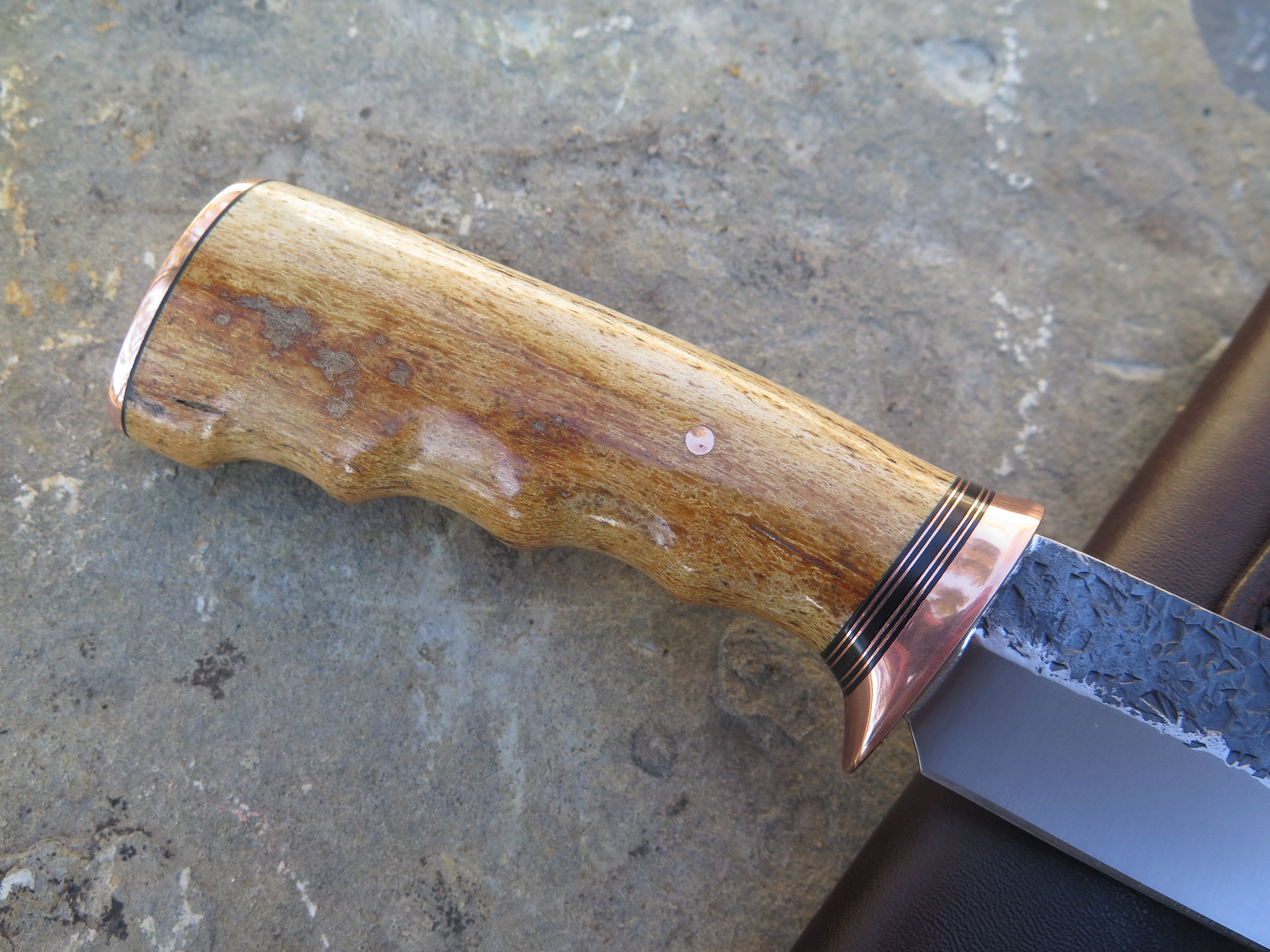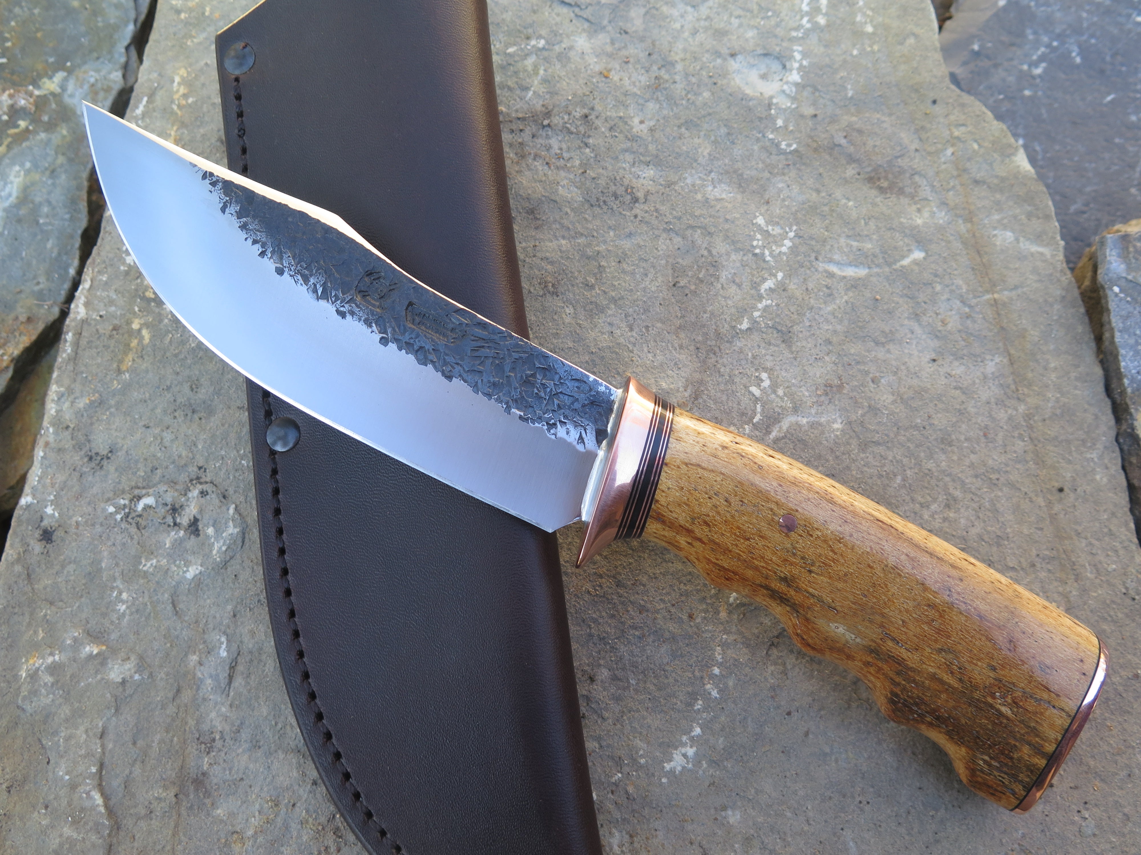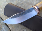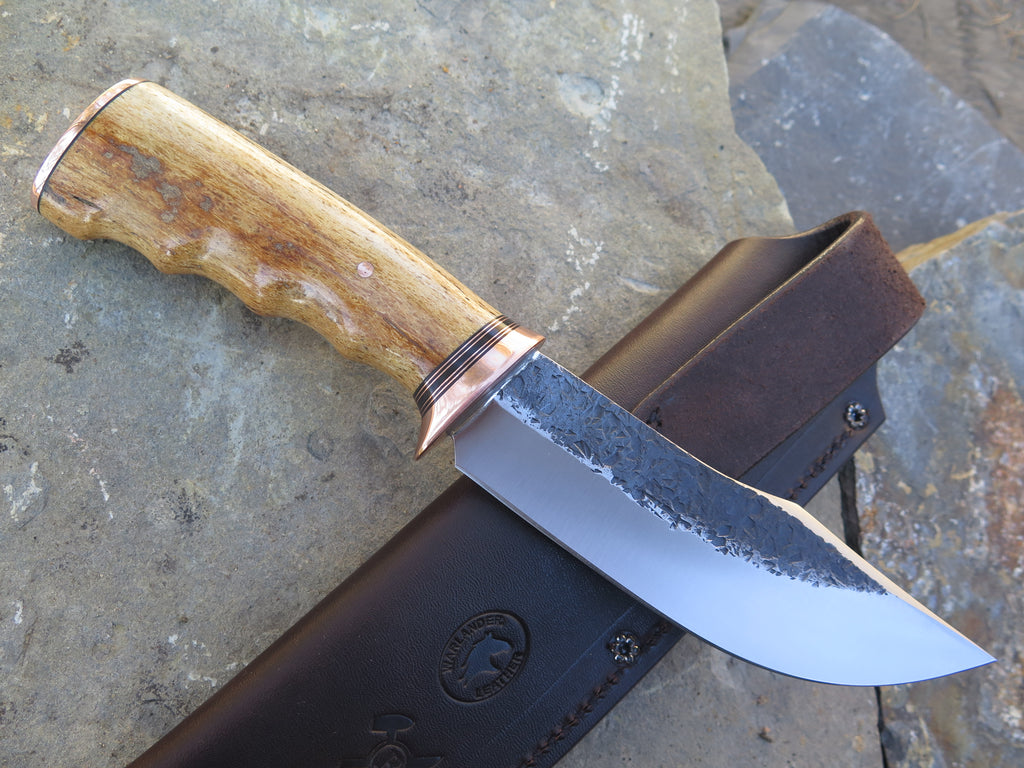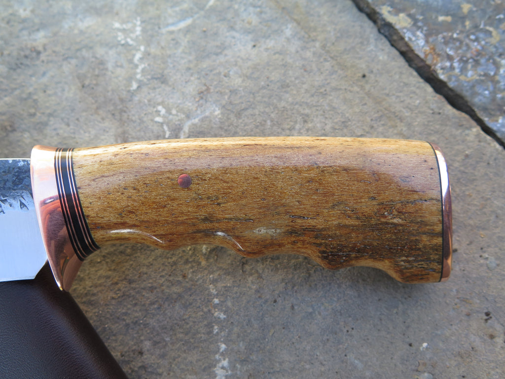 This bad ass new Behring Made© Clip Point is hand forged from 13/64" thick 5160 spring steel and it measures 5 1/4" from tip to guard with a razor sharp hollow grind and our hammermark finish. The copper guard is soldered in place above black fiber and copper spacers which top a beautiful finger grip Stellar's sea cow rib bone handle, which is also pinned and capped with copper. The overall length measures about 10" and it comes in a classic leather belt pouch sheath.