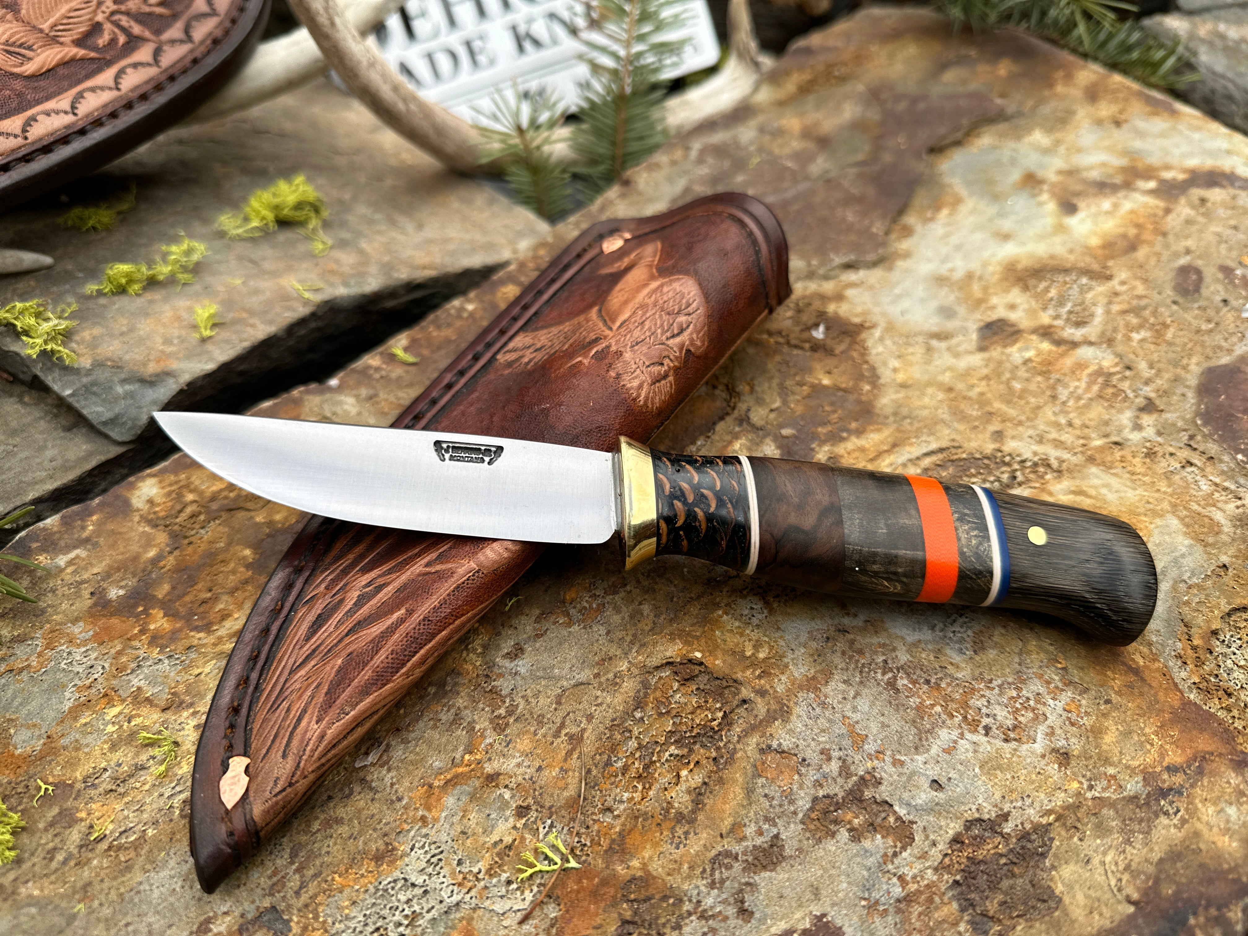- Green Pinecone, White Fiber, Turkish Walnut, Buckeye Burl, Orange G-10, Blue Fiber, and Bog Oak Handle
