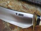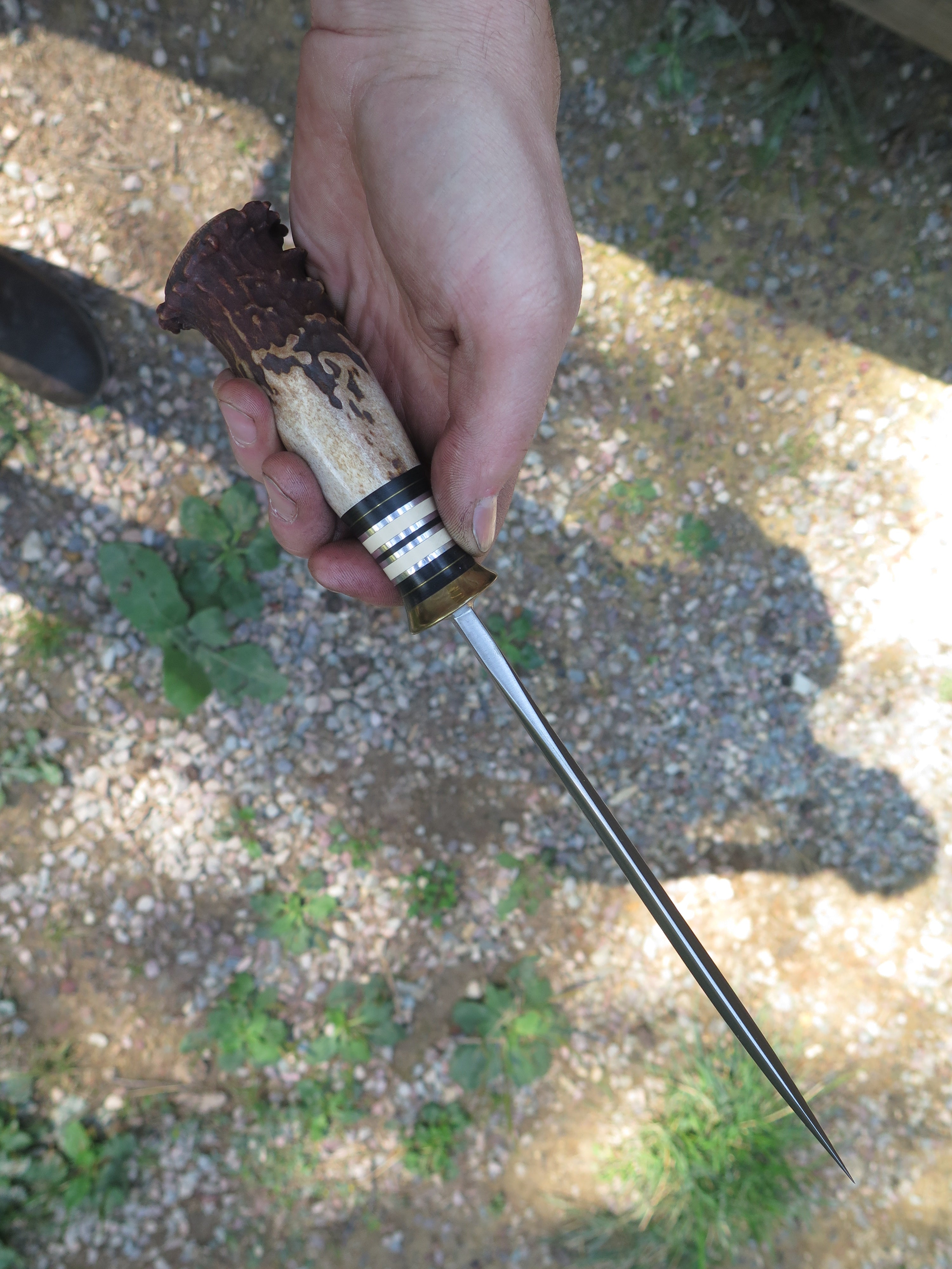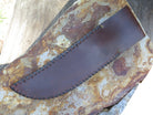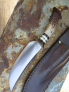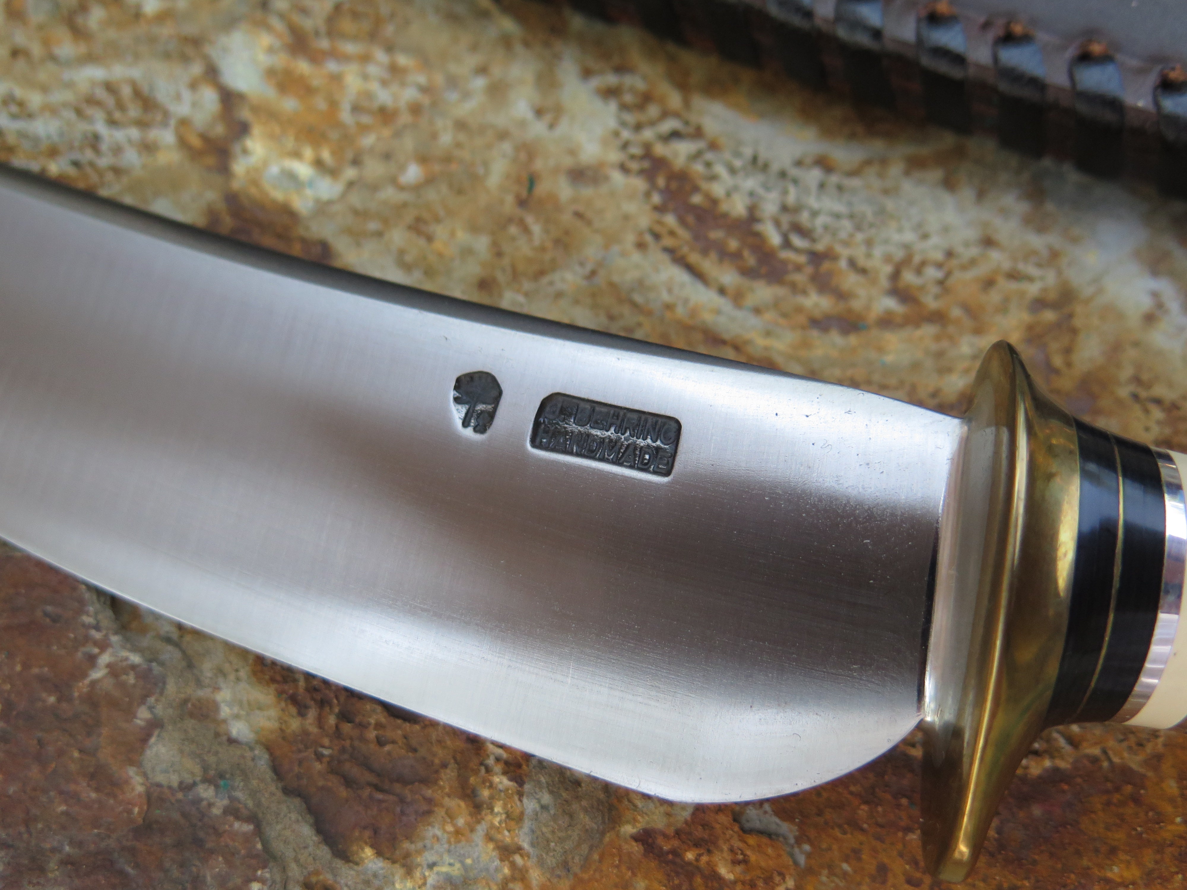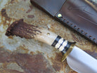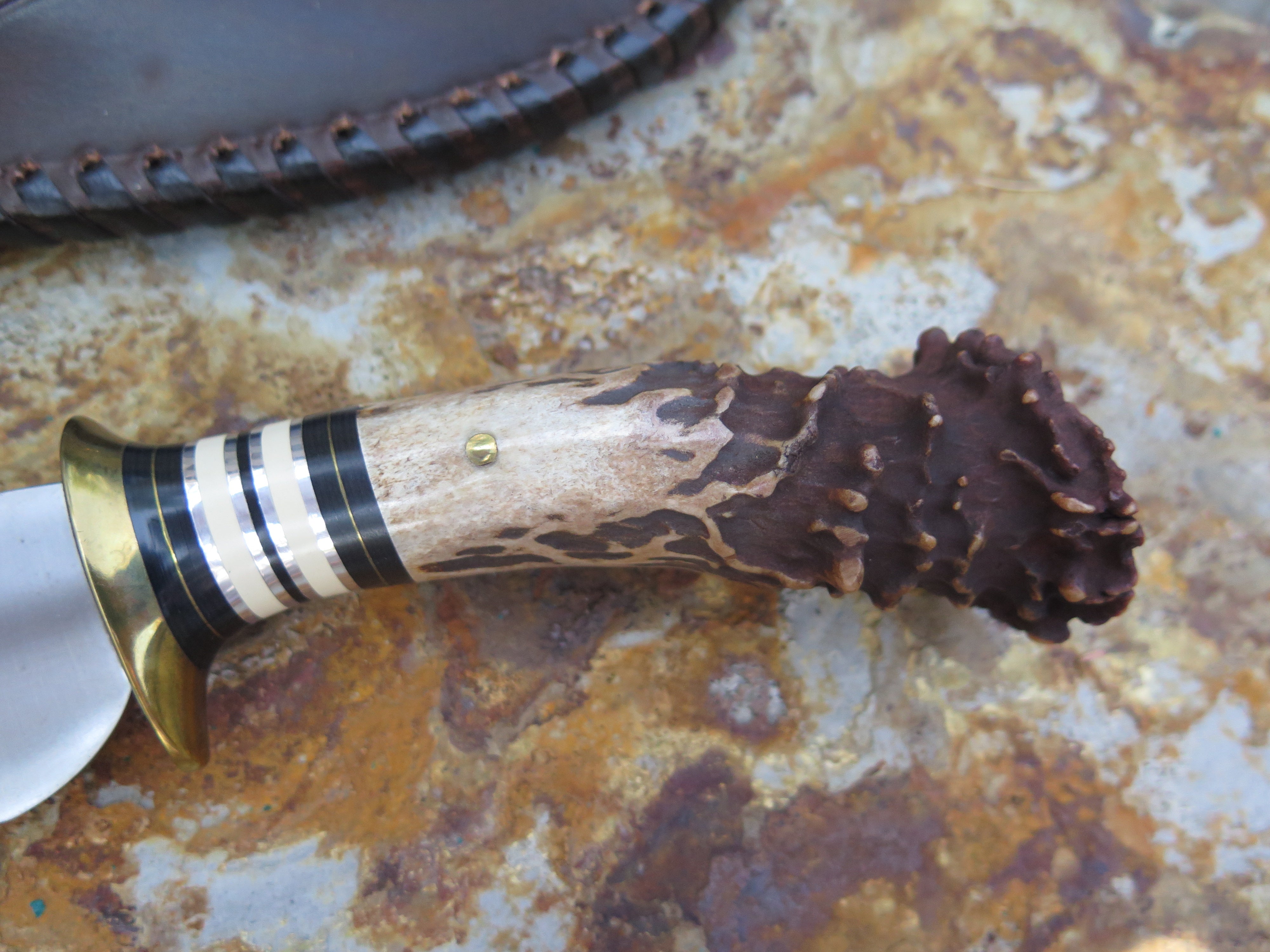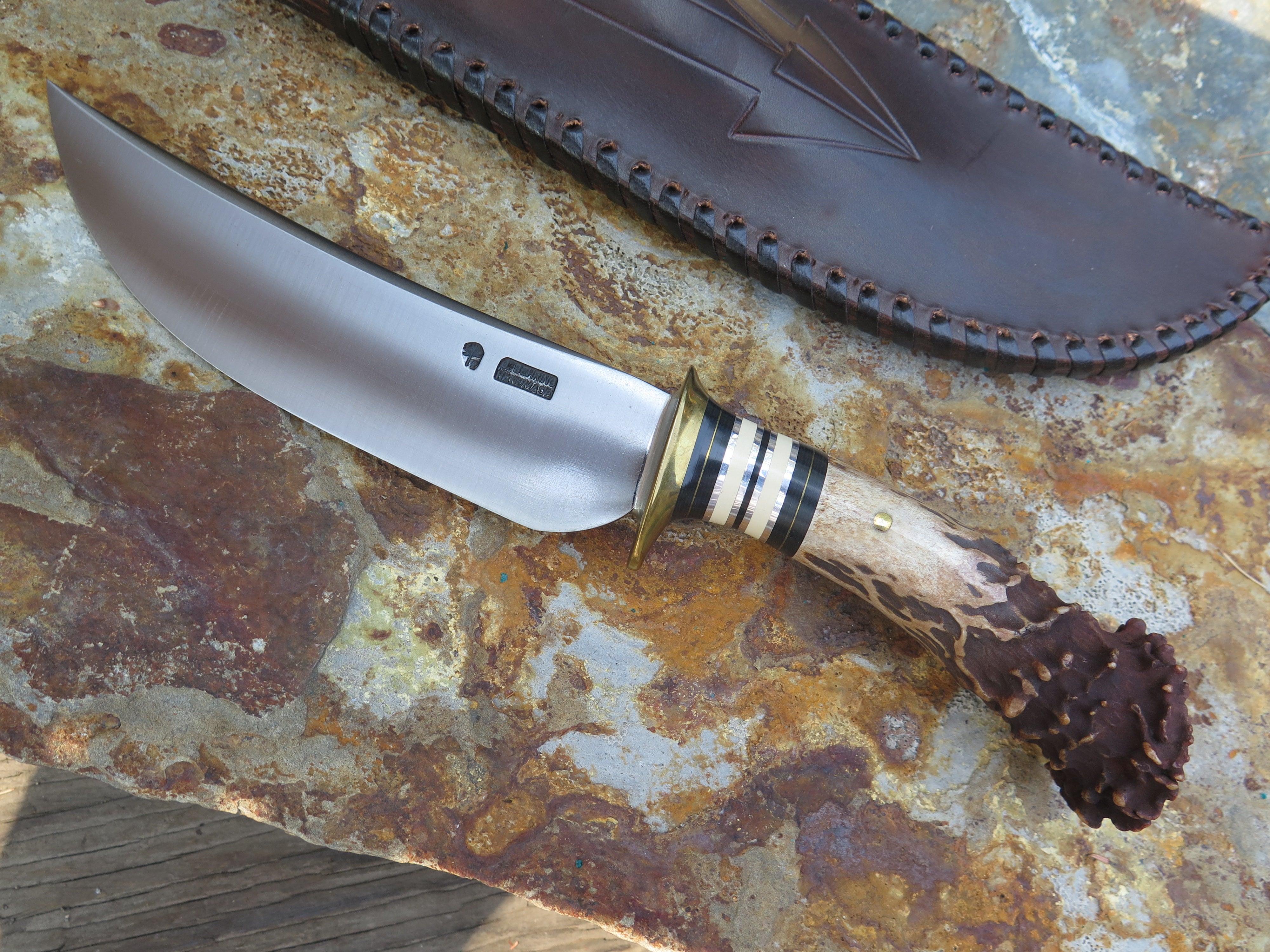 This incredible Tribute comes from James' father, AKA Treeman Knives of Michigan. Made as a replica to Bo Randall's original knife, this one was hand forged from 1/4" thick high carbon 01 tool steel and it measures 6 1/2" from tip to guard with a razor sharp convex grind. The brass guard is soldered in place above black fiber, brass, aluminum and ivory micarta spacers in addition to a crown stag handle that is pinned through the tang with brass. The overall length measures 11 5/8" and it comes in a custom leather sheath styled after Bo's original- same tooling and border lace!