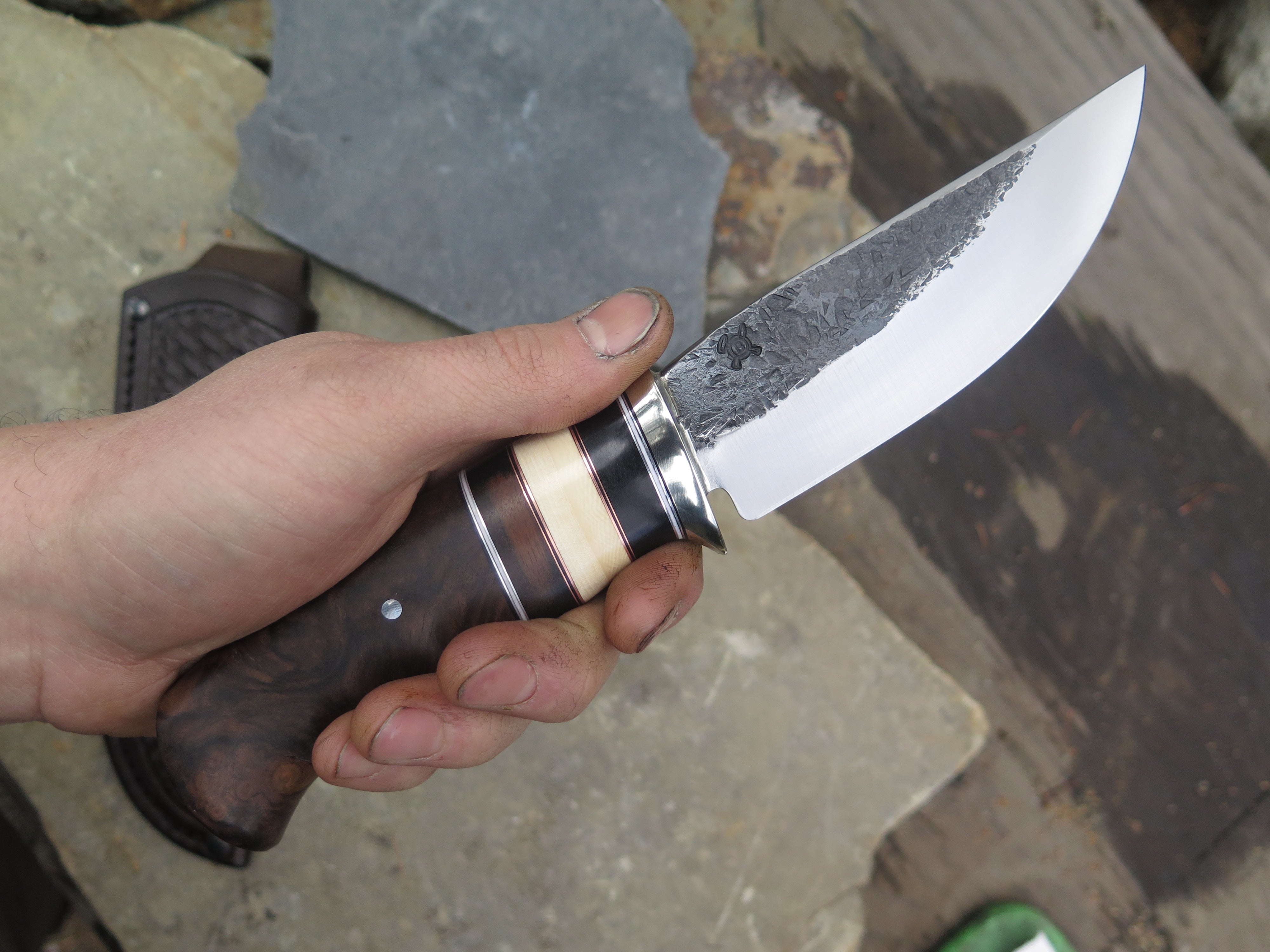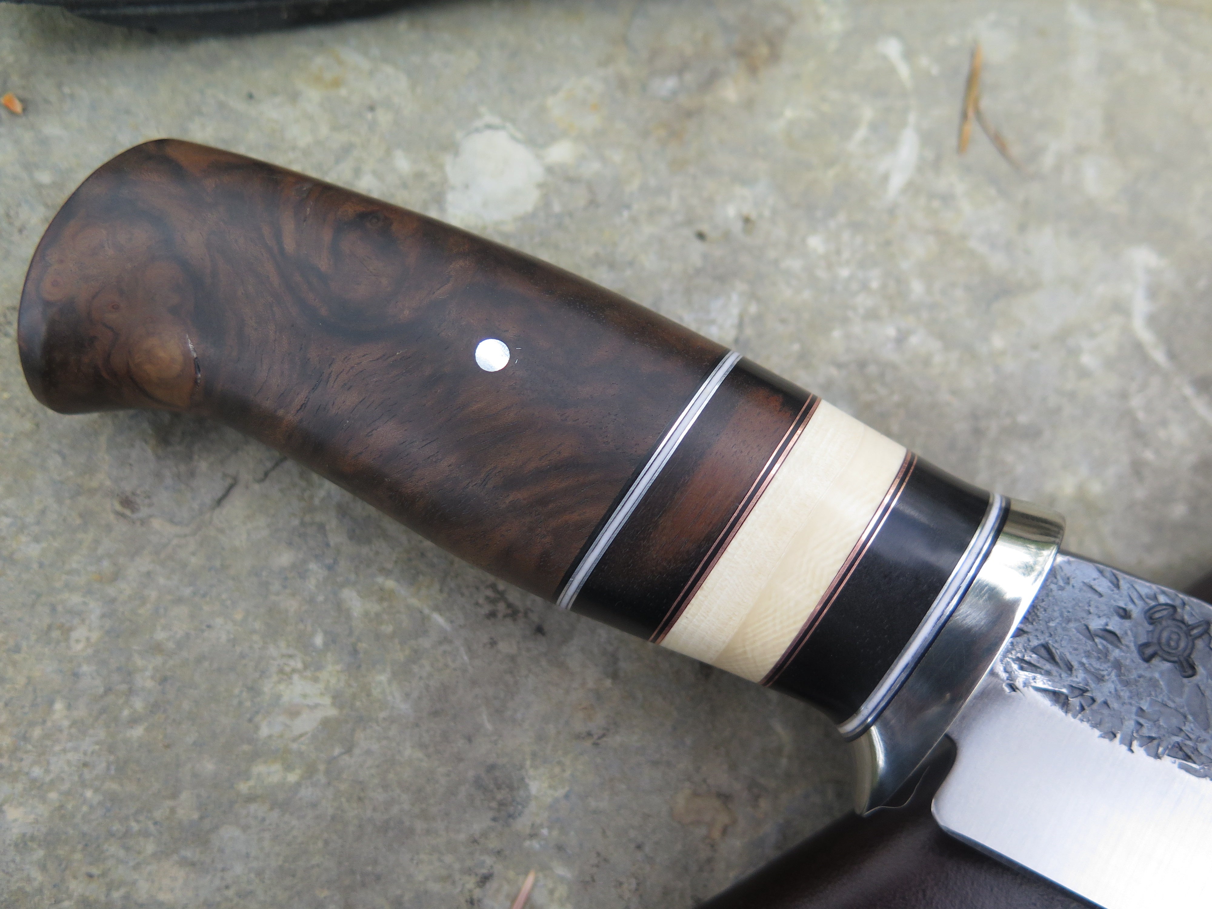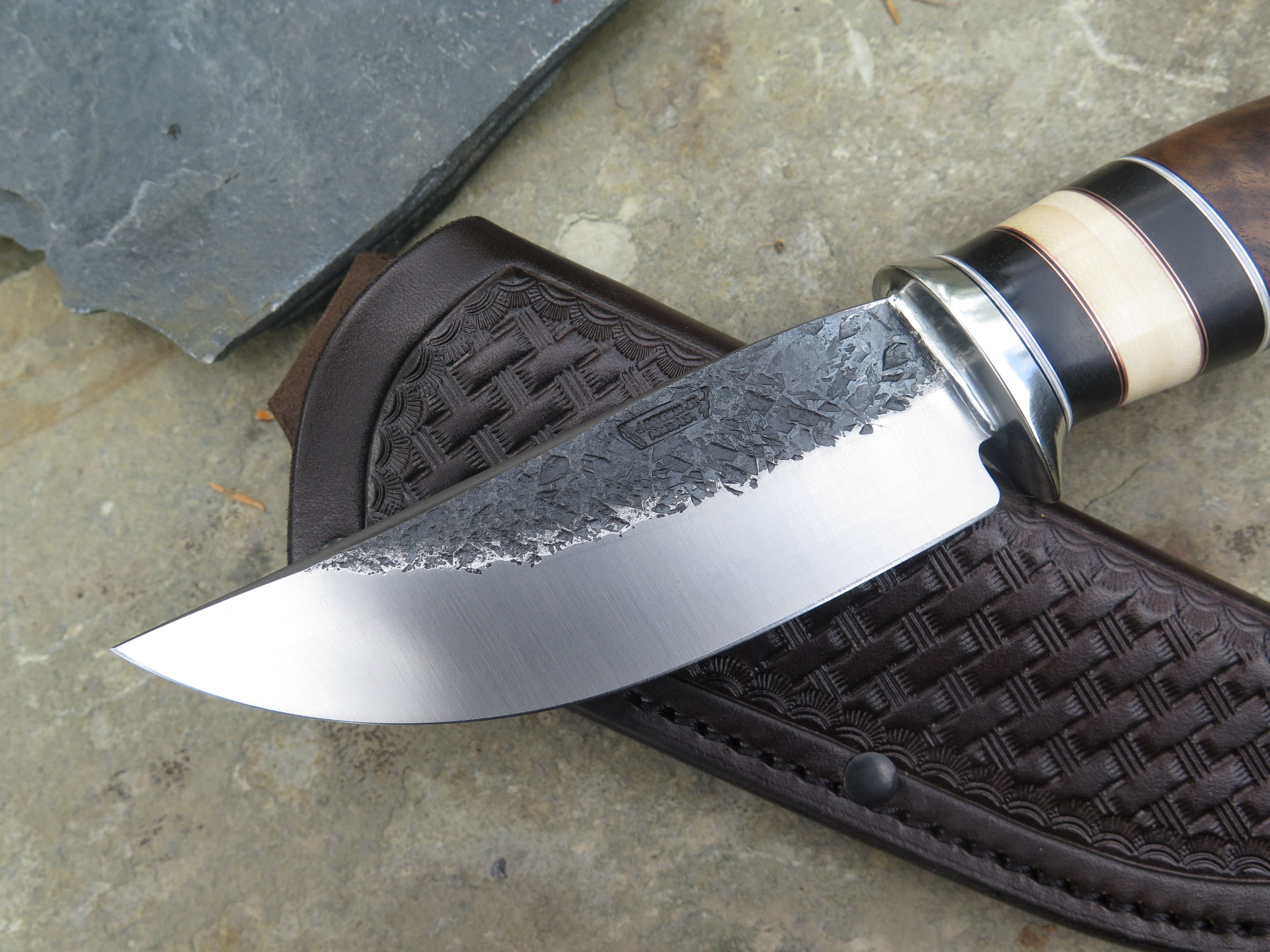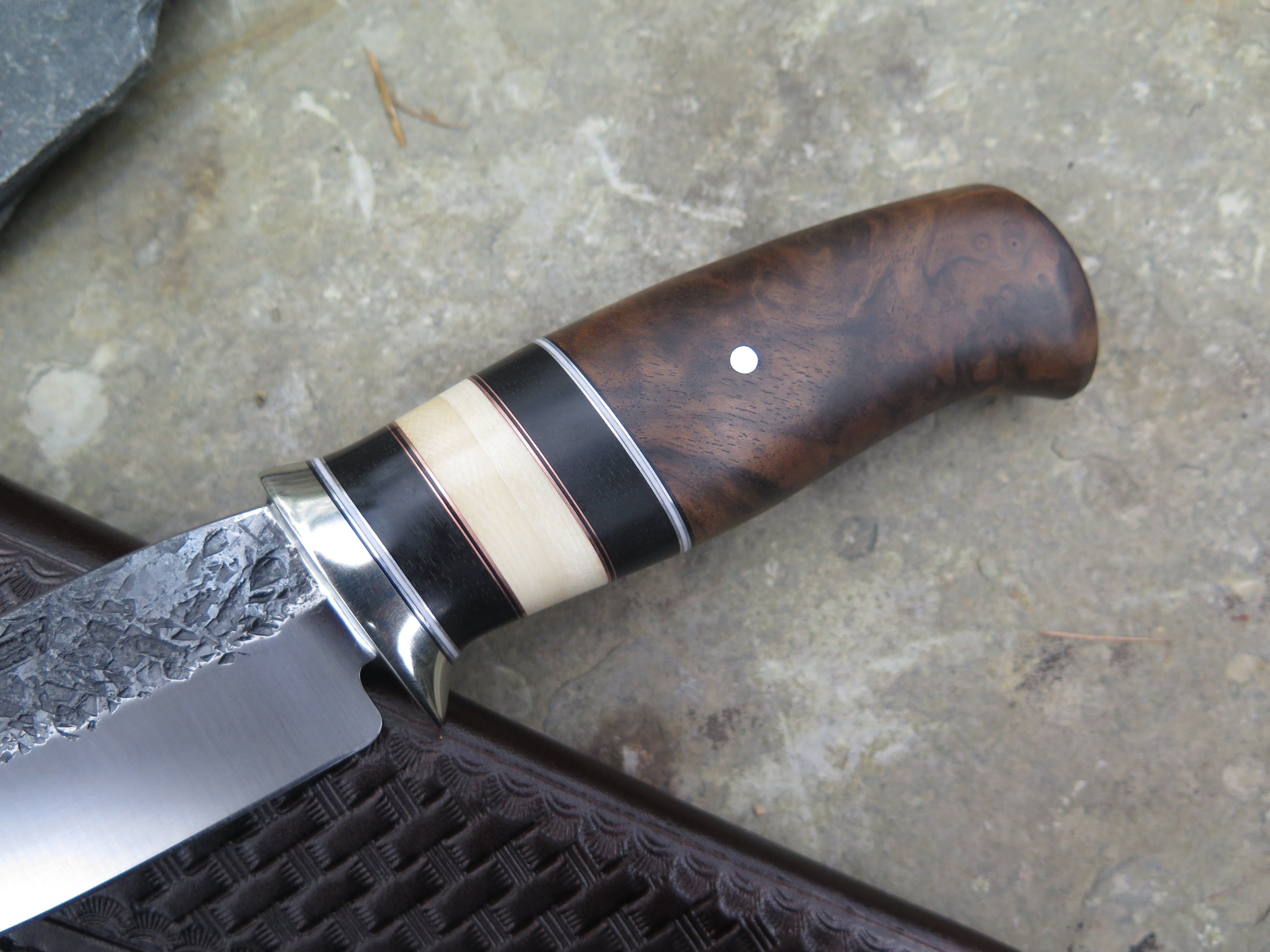 This incredible new Hunter from Behring Made© is hand forged from 3/16" thick high carbon 01 tool steel and it measures 4 3/4" from tip to guard with a razor sharp hollow grind and our hammermark finish. The nickel silver guard is soldered in place above black and white fiber, copper, aluminum, ancient mammoth and African ebony spacers which top the Turkish walnut handle with gorgeous figure. The aluminum pin runs through the tang and overall length measures 9 3/8", plus we fit it with a custom basketweave tooled pouch sheath.