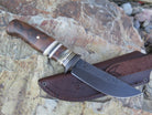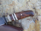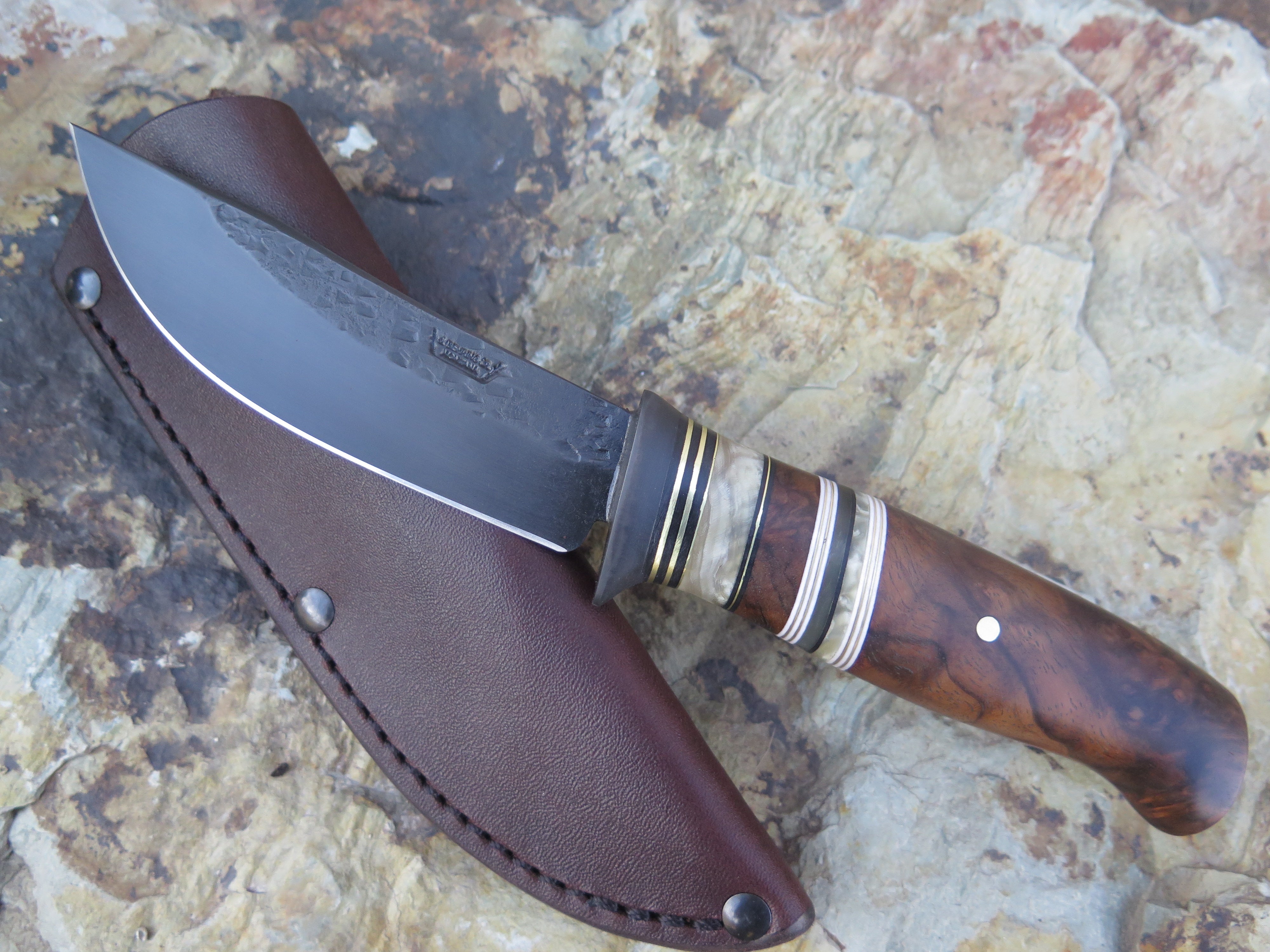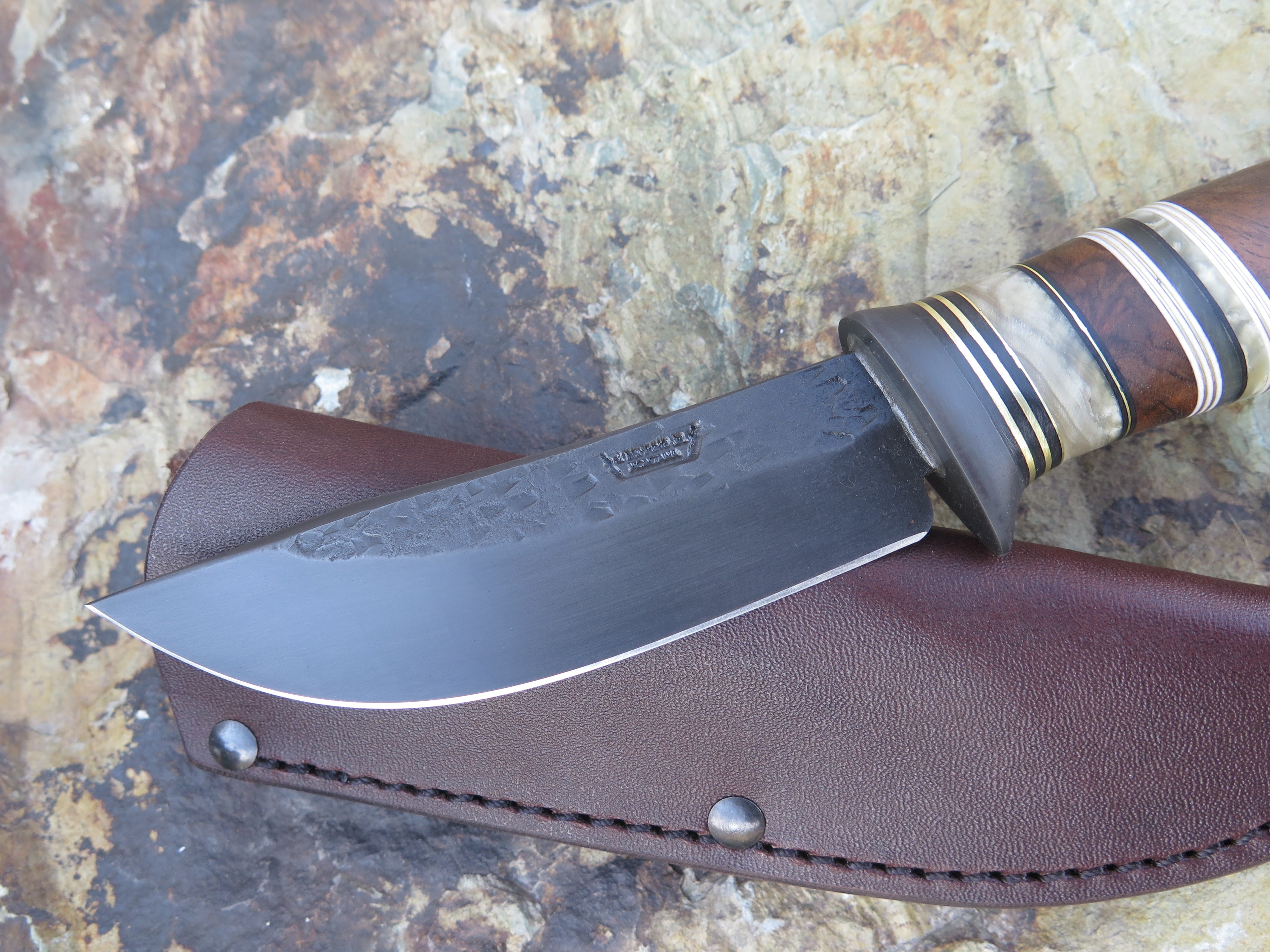 This beautiful new Clip Point from Behring Made© is hand forged from 3/16" thick high carbon 01 tool steel and it measures 4 1/4" from tip to guard with a razor sharp hollow grind and our hammermark finish. The blued steel guard is soldered in place above black and white fiber, musk ox boss and brass spacers surrounded by outstanding walnut that we imported directly from Turkey. The brass pin runs securely through the tang and overall length measures 8 3/4", plus it comes in classic and clean belt pouch.