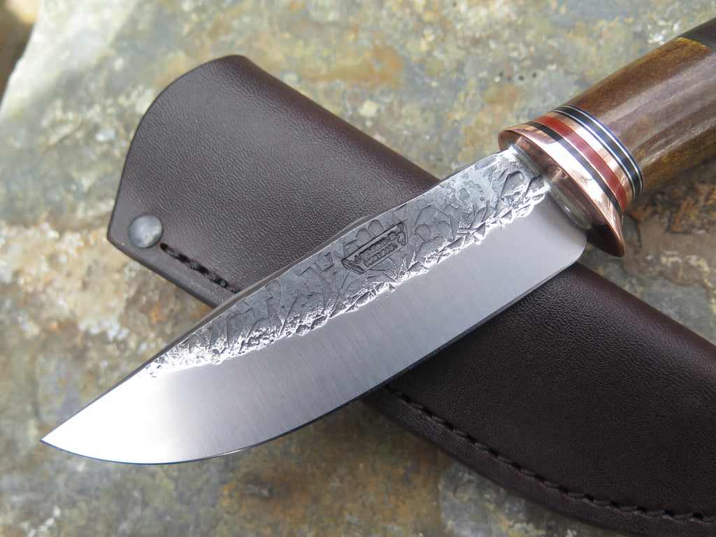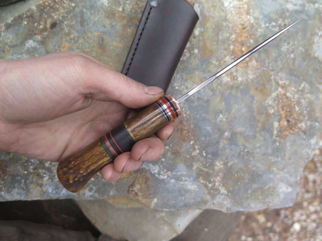 This incredible new Scagel Tribute from Behring Made© is hand forged from 1/8" thick high carbon 01 tool steel and it measures 4 1/4" from tip to guard with a razor sharp hollow grind and our hammermark finish. The copper guard is soldered in place above black and maroon fiber, green micarta, aluminum, copper and horsehide spacers with a two-piece stack of shiras moose that is pinned through the tang with copper. The overall length measures 8 1/2" and it comes in a classic pouch sheath.