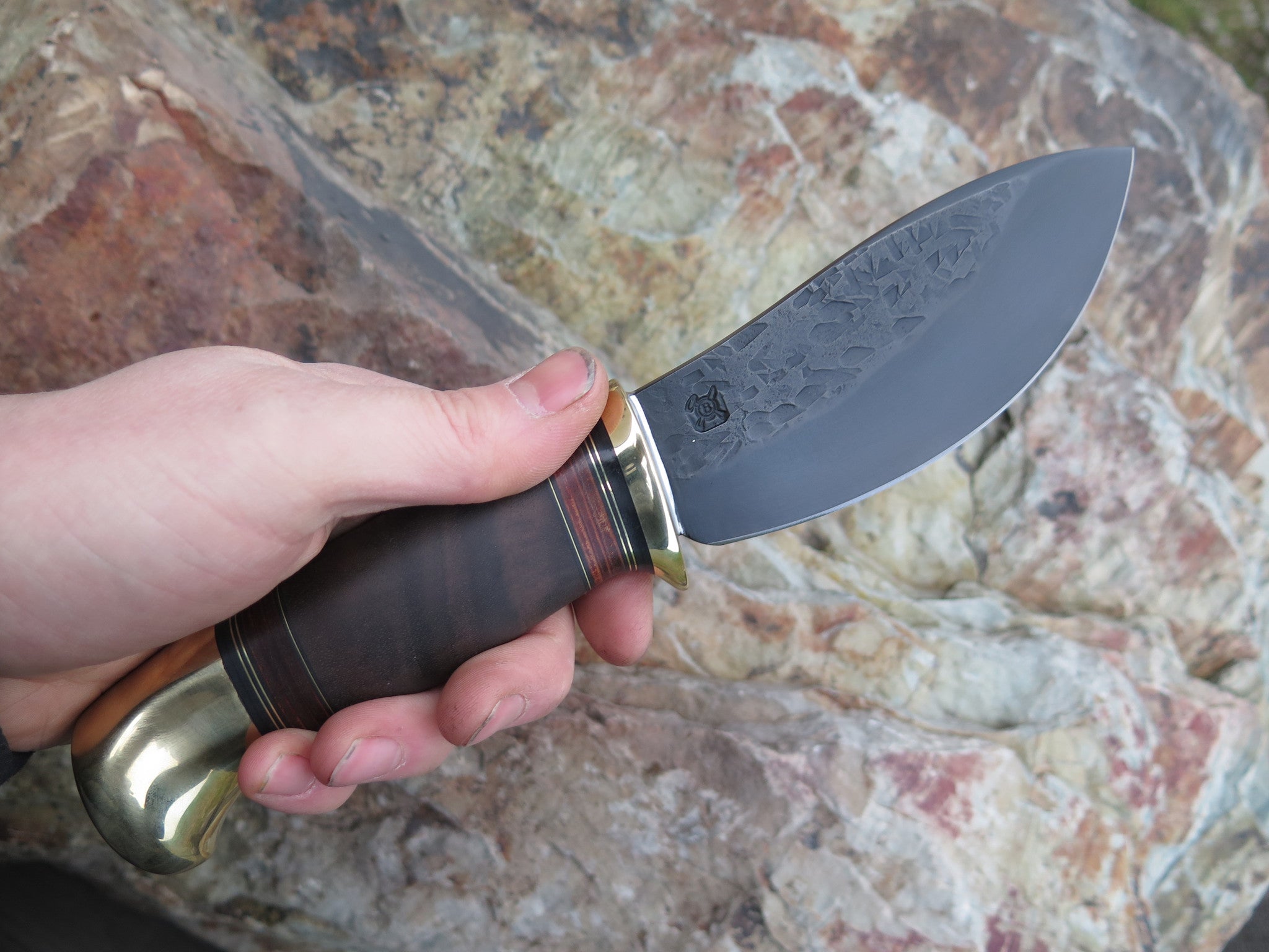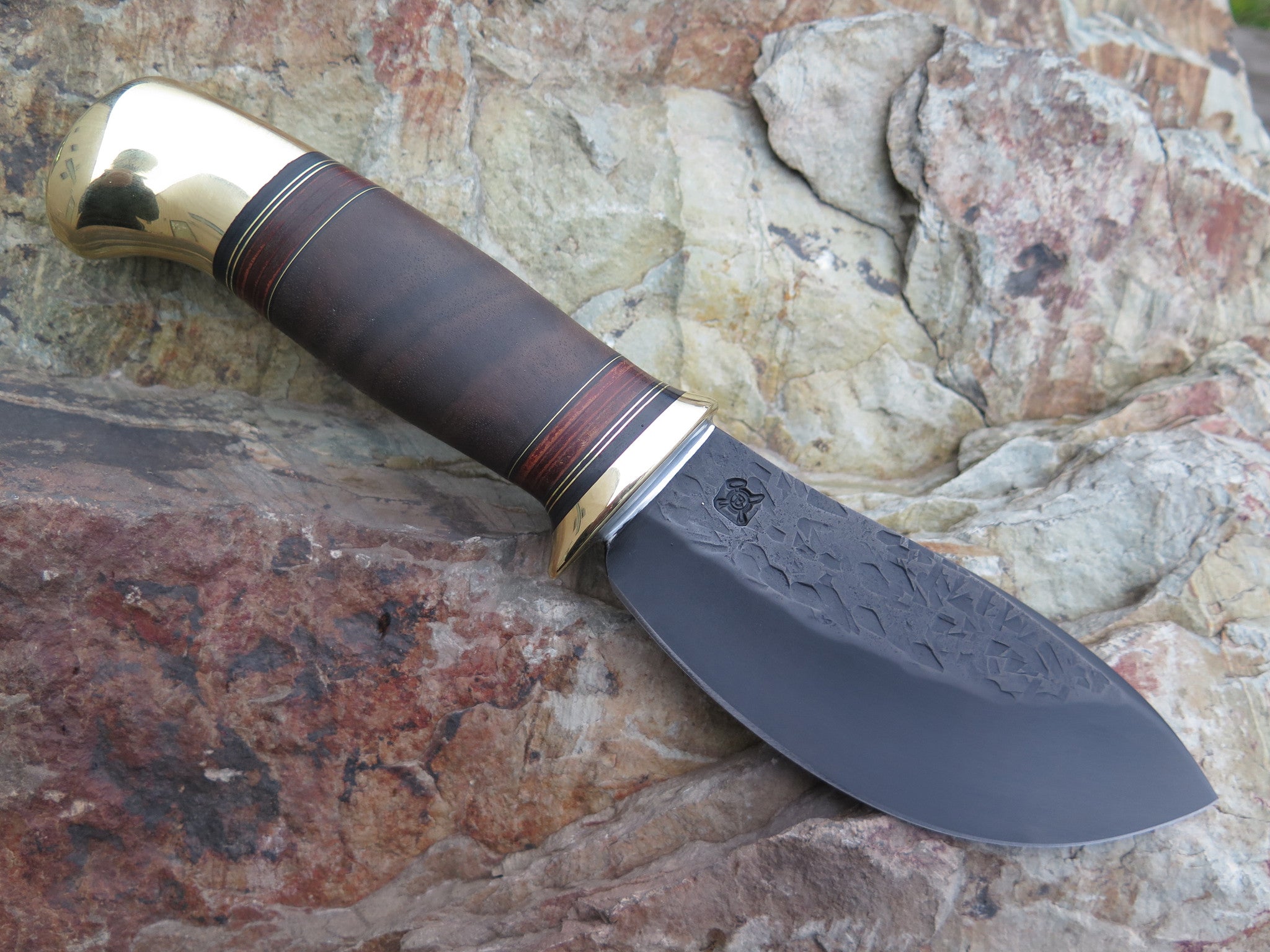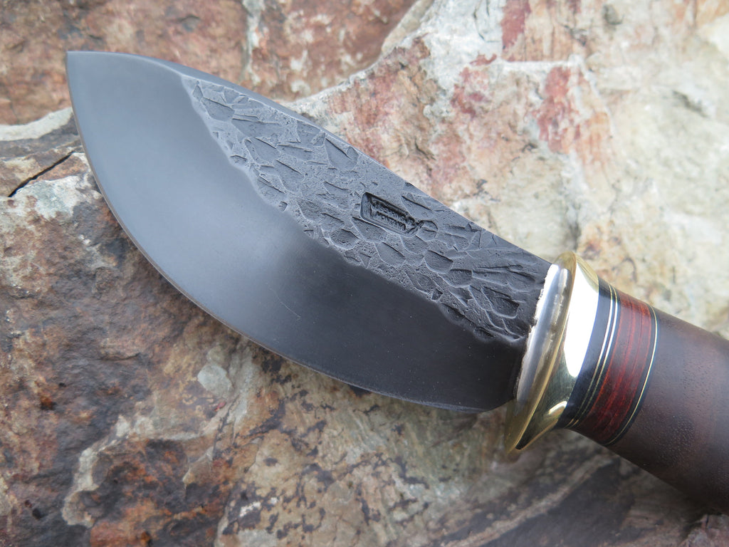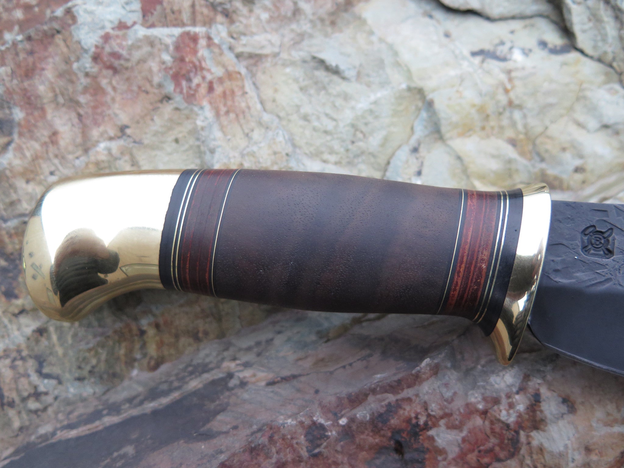 This incredible new Behring Made™ Nessmuk is hand forged from 3/16" thick high carbon 01 tool steel and it measures 4 3/4" from tip to guard with a razor sharp hollow grind and our forced patina blued finish. The brass guard is soldered in place above a stack of black fiber, brass, horsehide and gorgeous walnut as well as a big brass butt that's pinned through the tang with brass for a rock solid construction that's guaranteed for life. The overall length measures 9 1/2" and it will come in a custom sheath from Warlander Leather.