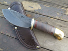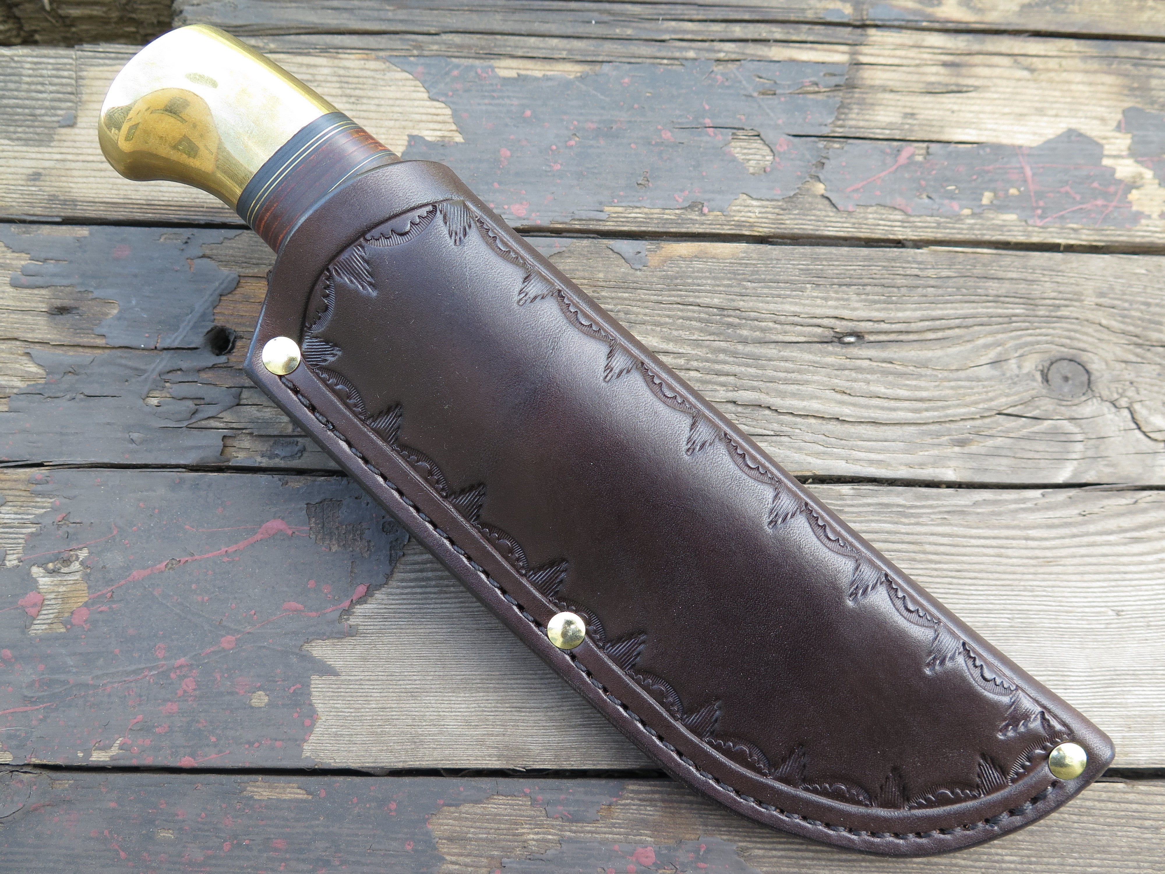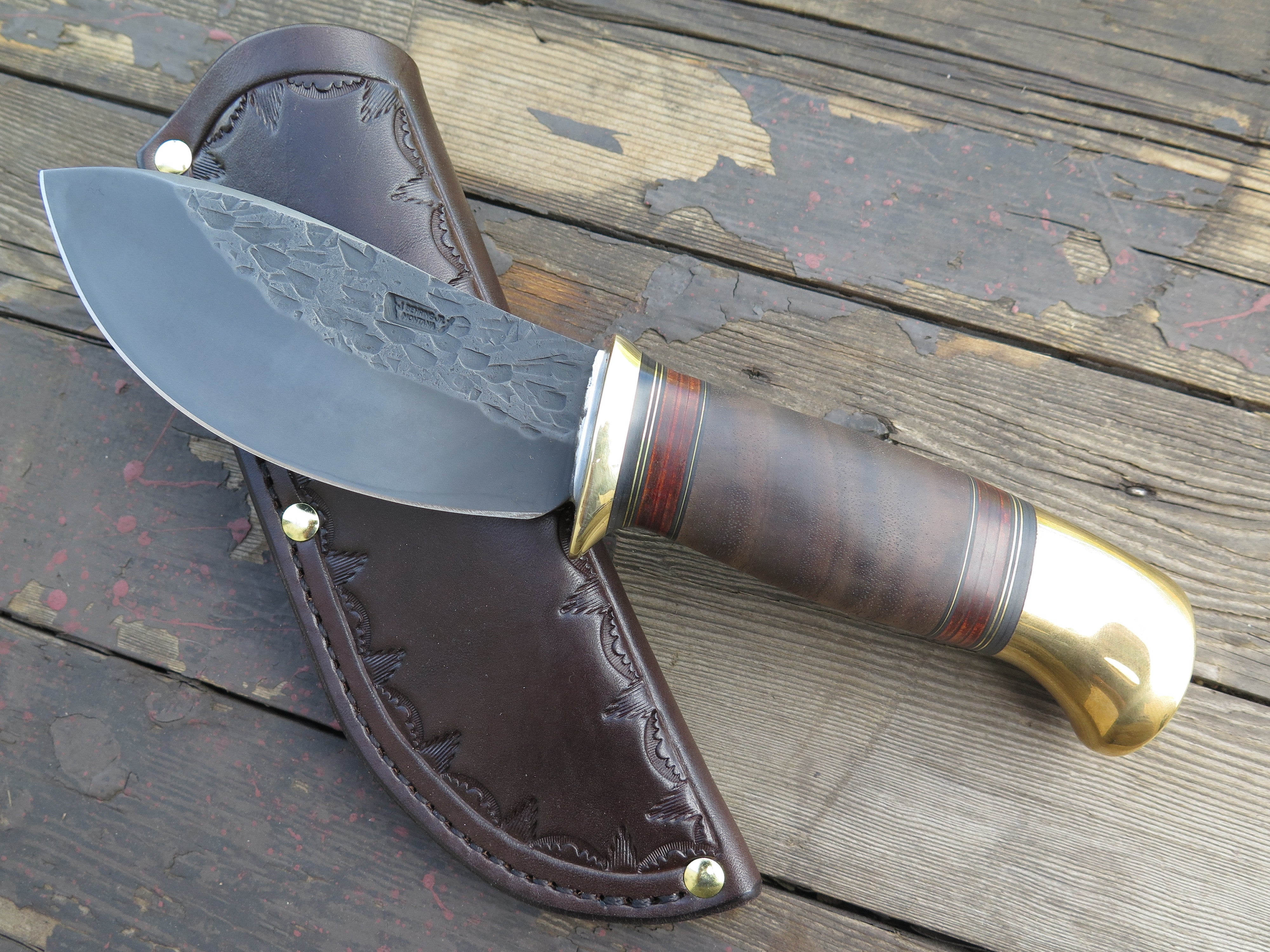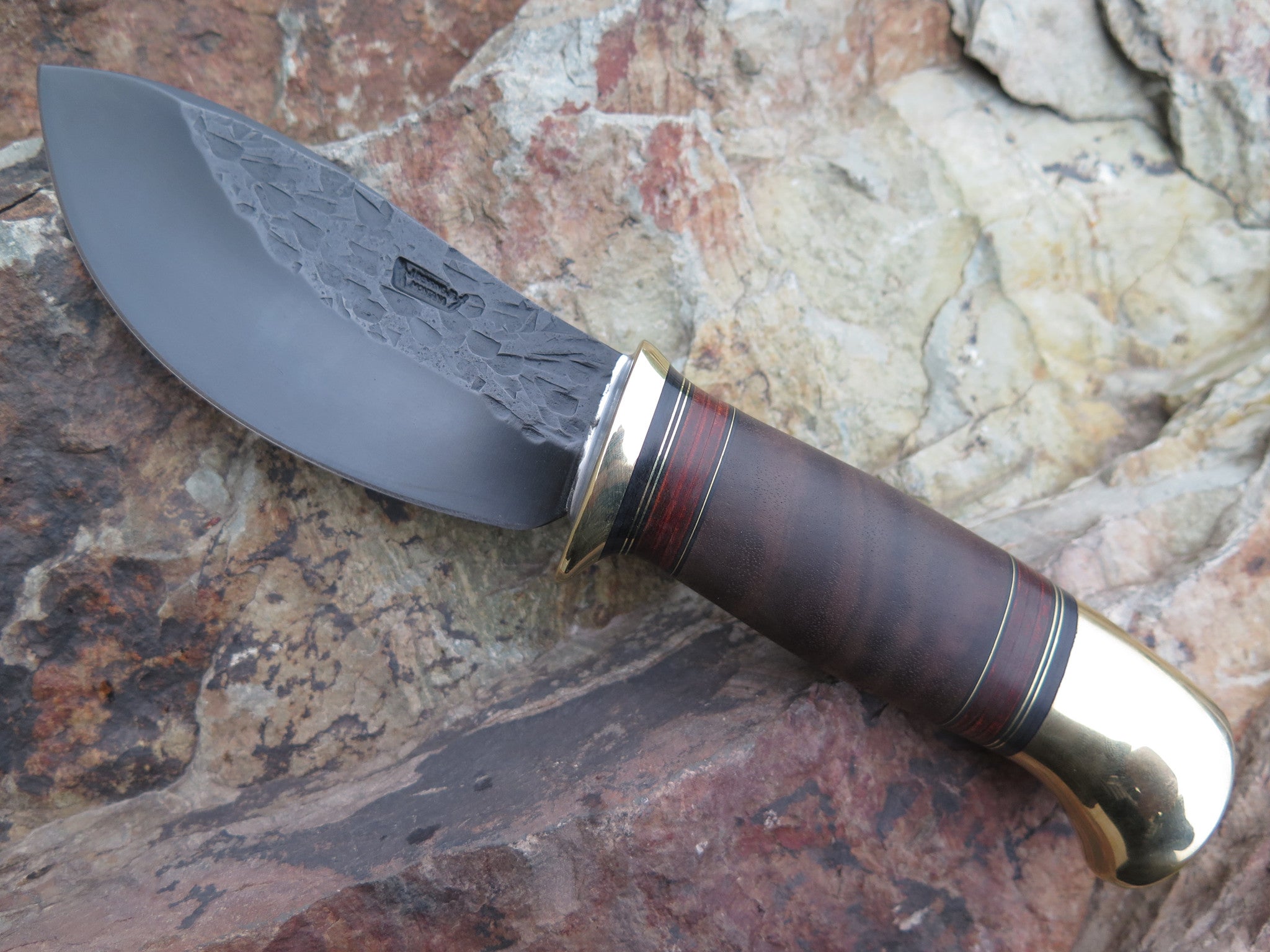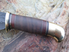 This incredible new Behring Made™ Nessmuk is hand forged from 3/16" thick high carbon 01 tool steel and it measures 4 3/4" from tip to guard with a razor sharp hollow grind and our forced patina blued finish. The brass guard is soldered in place above a stack of black fiber, brass, horsehide and gorgeous walnut as well as a big brass butt that's pinned through the tang with brass for a rock solid construction that's guaranteed for life. The overall length measures 9 1/2" and it will come in a custom sheath from Warlander Leather.