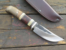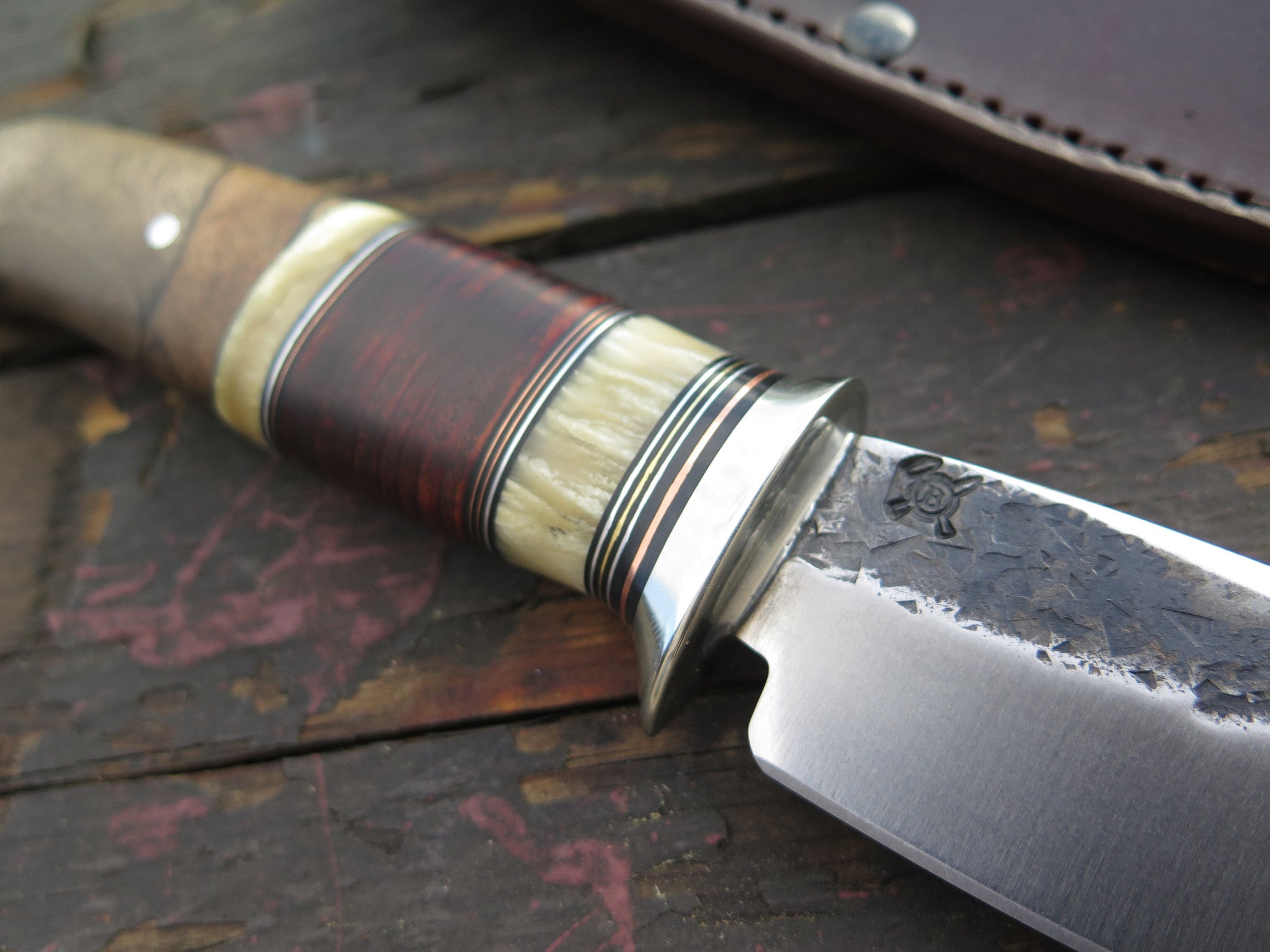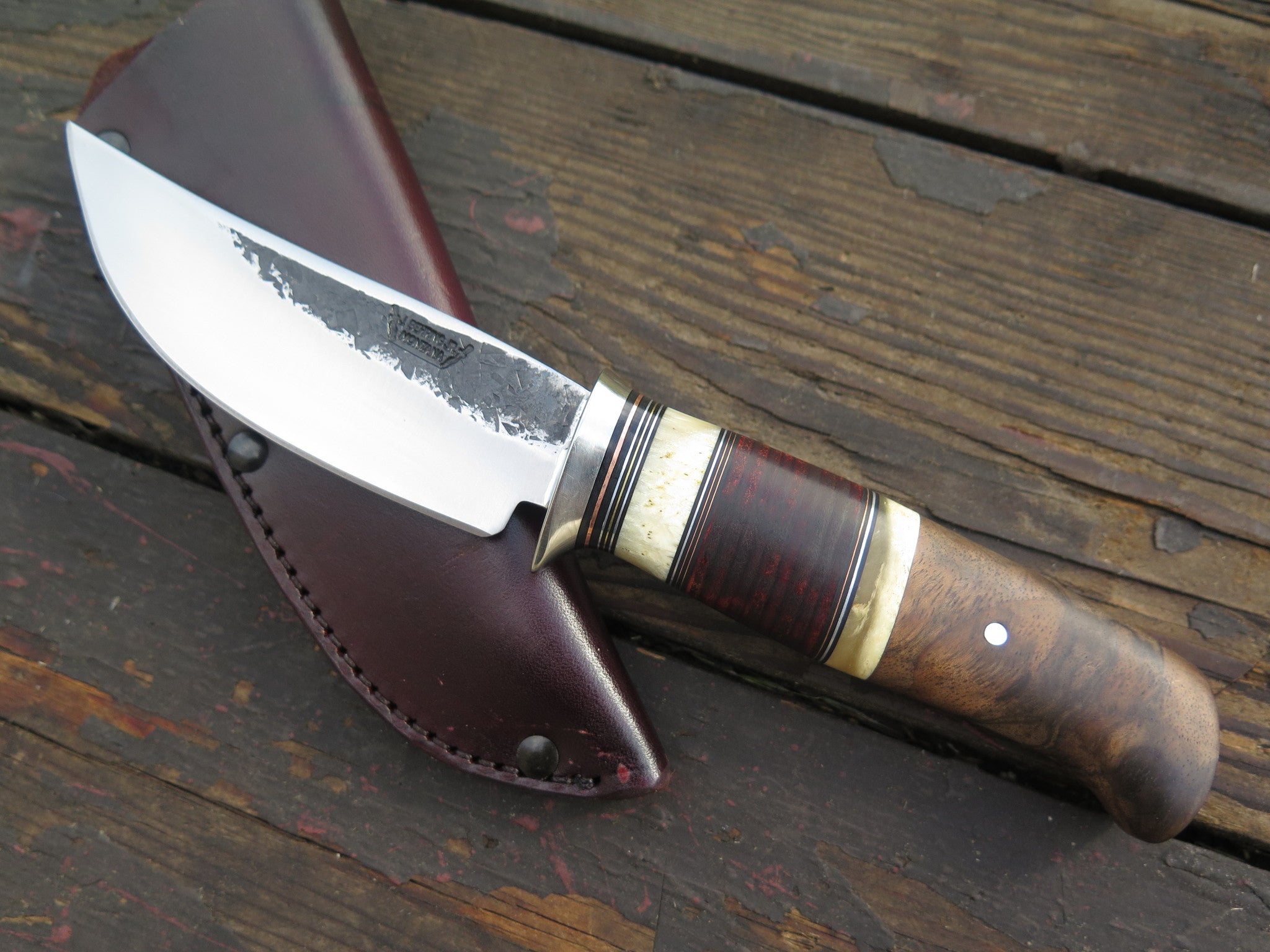 This beautiful hunter from Behring Made knives is hand forged from high carbon 01 tool steel and it measures 4 3/4" from tip to guard with a razor sharp hollow grind and a hammermark finish. The nickel silver guard is soldered in place above black, copper, aluminum, horsehide and musk ox boss spacers. The walnut butt is pinned with aluminum and brings the overall length to 9 3/4", plus it comes in a Behring Made pouch sheath.
