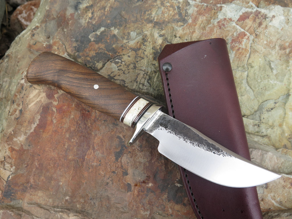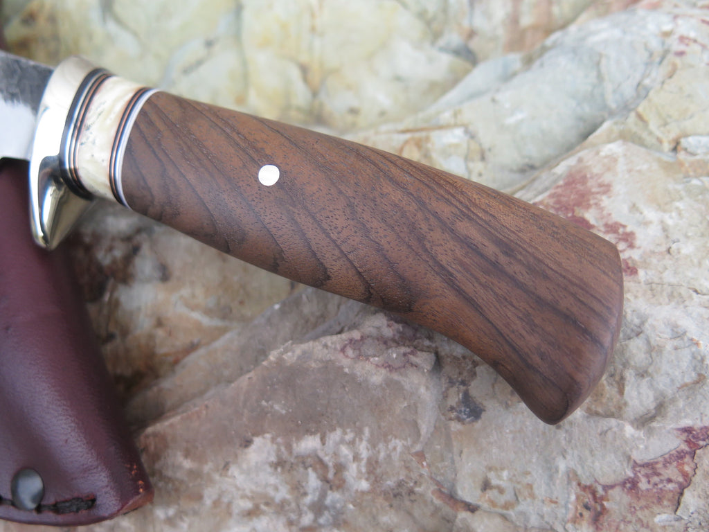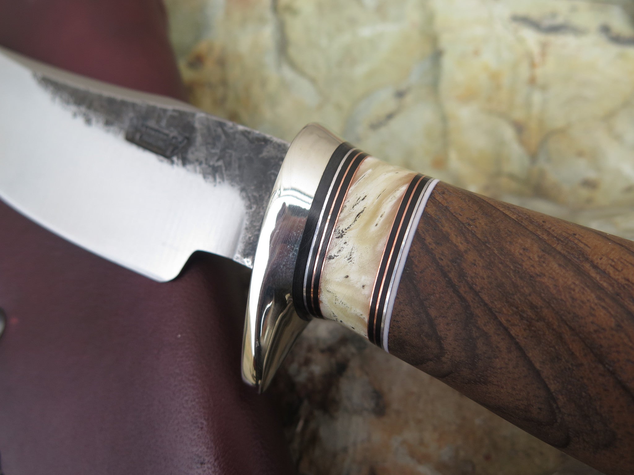 This beautiful Behring Made hunter is hand forged from high carbon steel and measures 4" from tip to guard with a razor sharp hollow grind and a hammermark finish. The nickel silver guard is soldered in place above black, white, copper, aluminum and musk ox boss spacers. The hand-selected walnut handle is pinned with aluminum and brings the overall length to 8 3/4" and it comes in our Behring Made pouch style sheath.