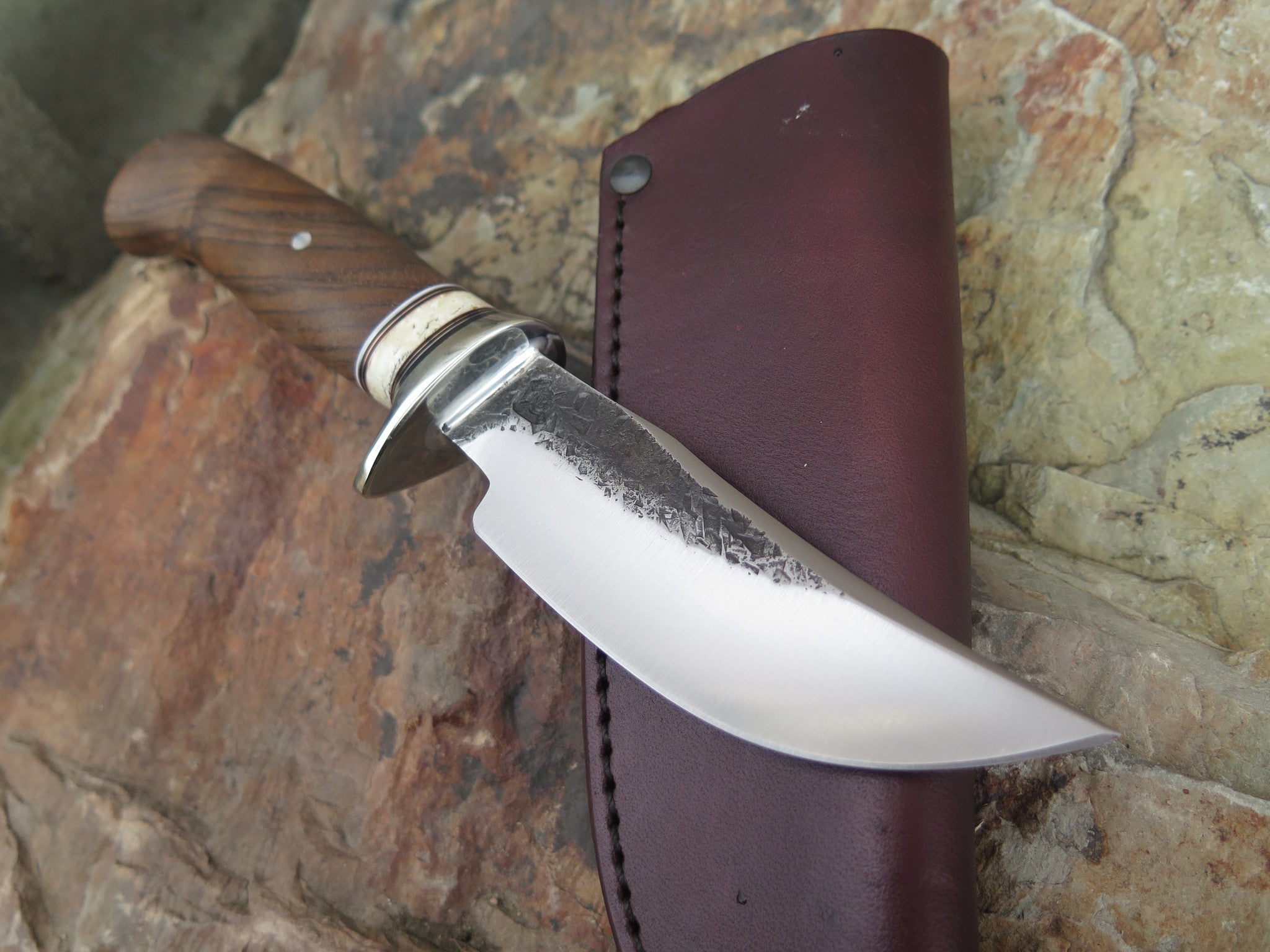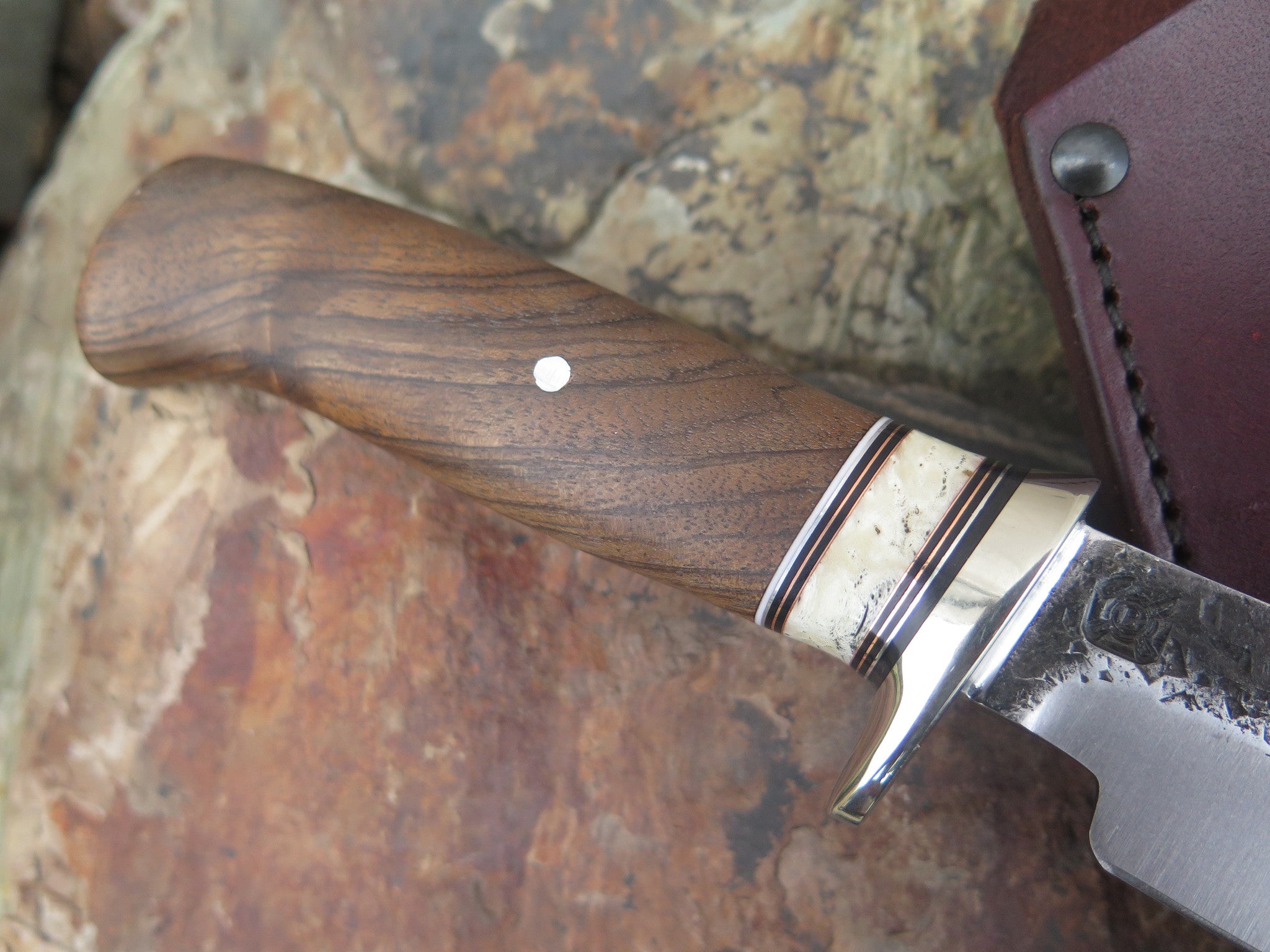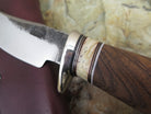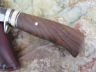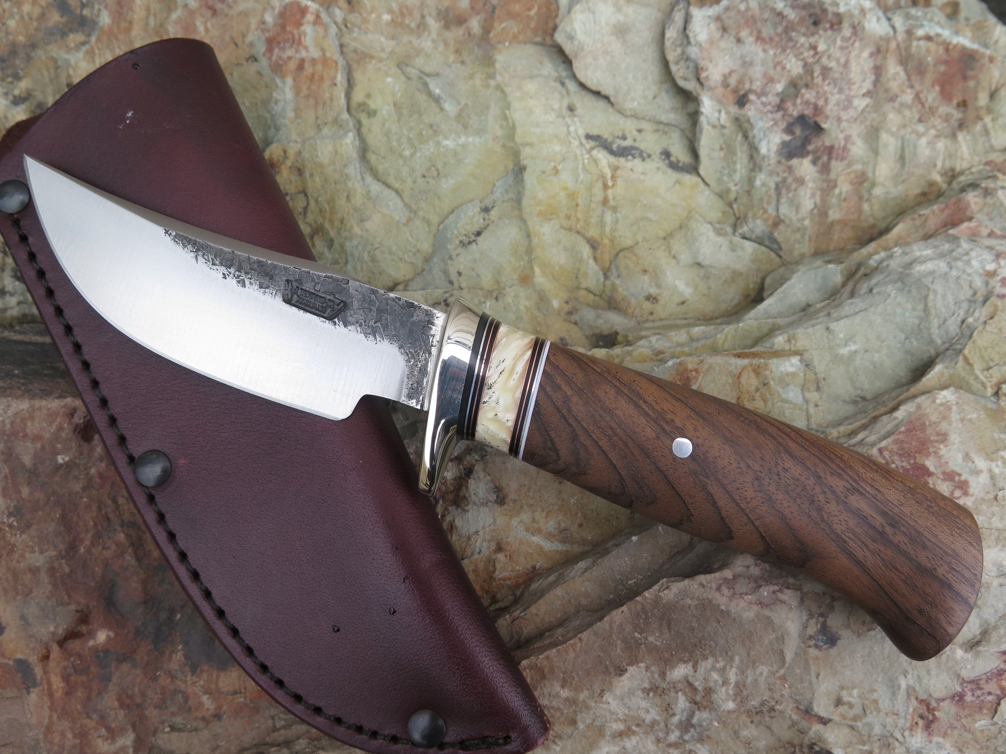 This beautiful Behring Made hunter is hand forged from high carbon steel and measures 4" from tip to guard with a razor sharp hollow grind and a hammermark finish. The nickel silver guard is soldered in place above black, white, copper, aluminum and musk ox boss spacers. The hand-selected walnut handle is pinned with aluminum and brings the overall length to 8 3/4" and it comes in our Behring Made pouch style sheath.