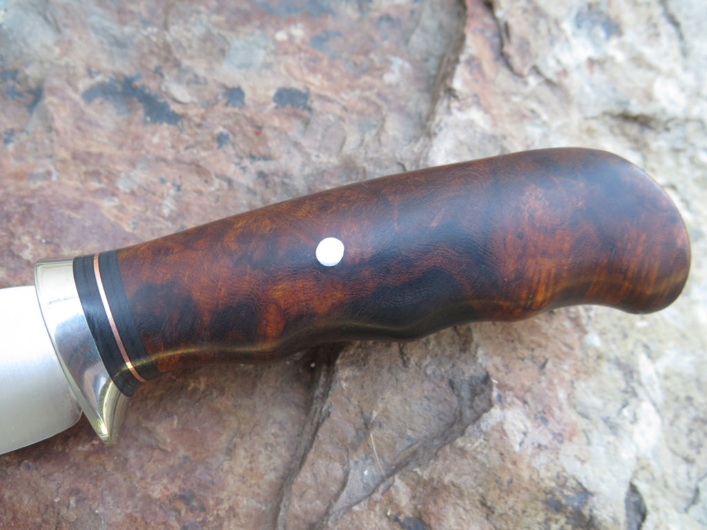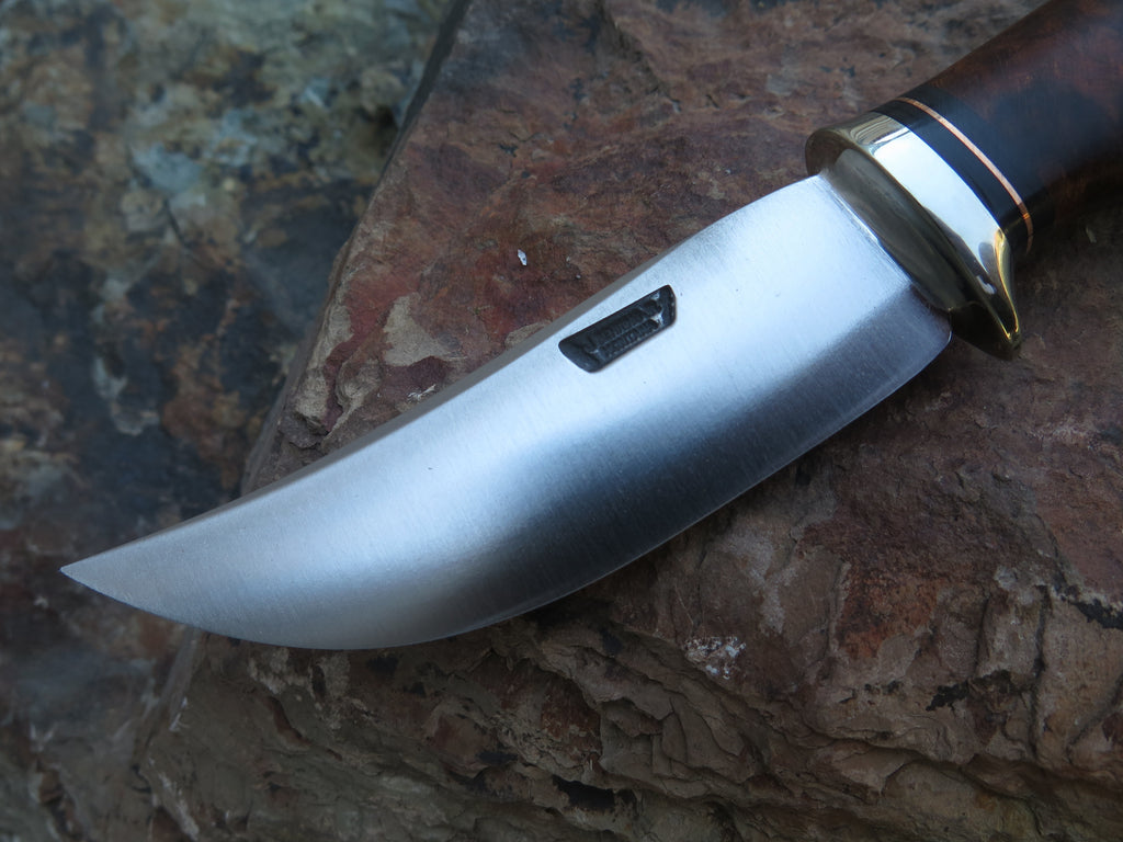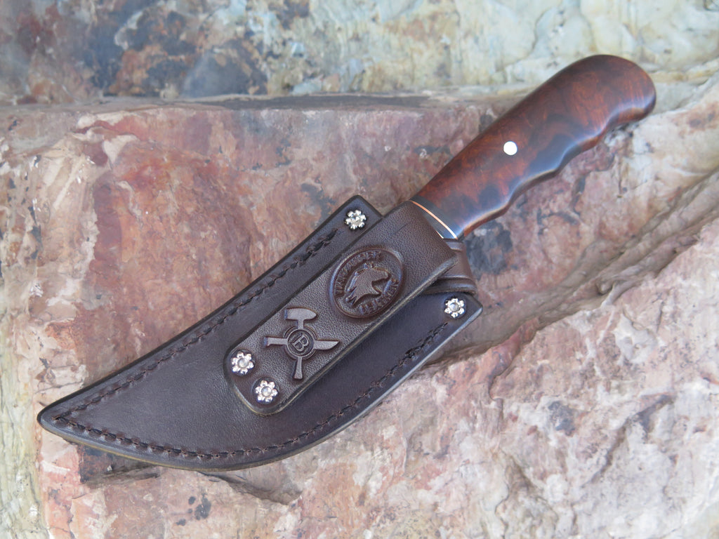 This beautiful new Skinner from Behring Made™ is handmade from 1/8" thick 440c stainless steel and it measures 4" from tip to guard with a razor sharp convex grind. The nickel silver guard is silver soldered in place above black fiber and copper spacers as well as a premium desert ironwood handle that's ground with a Ward Gay style finger grip handle that is also pinned through the tang with aluminum. Overall length measures 8 1/2" and it comes in a custom sheath from Warlander Leather.