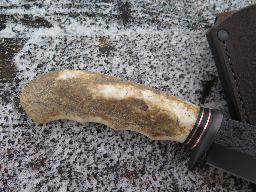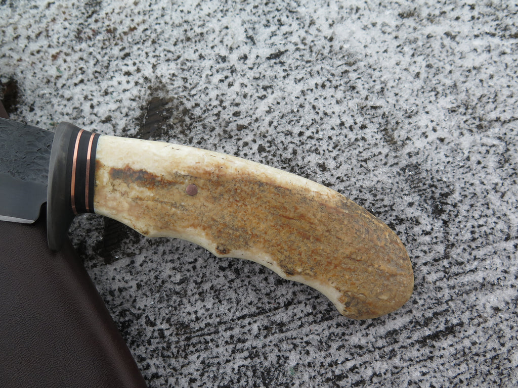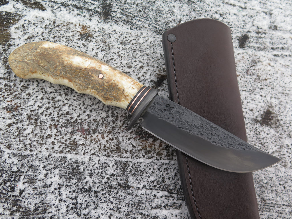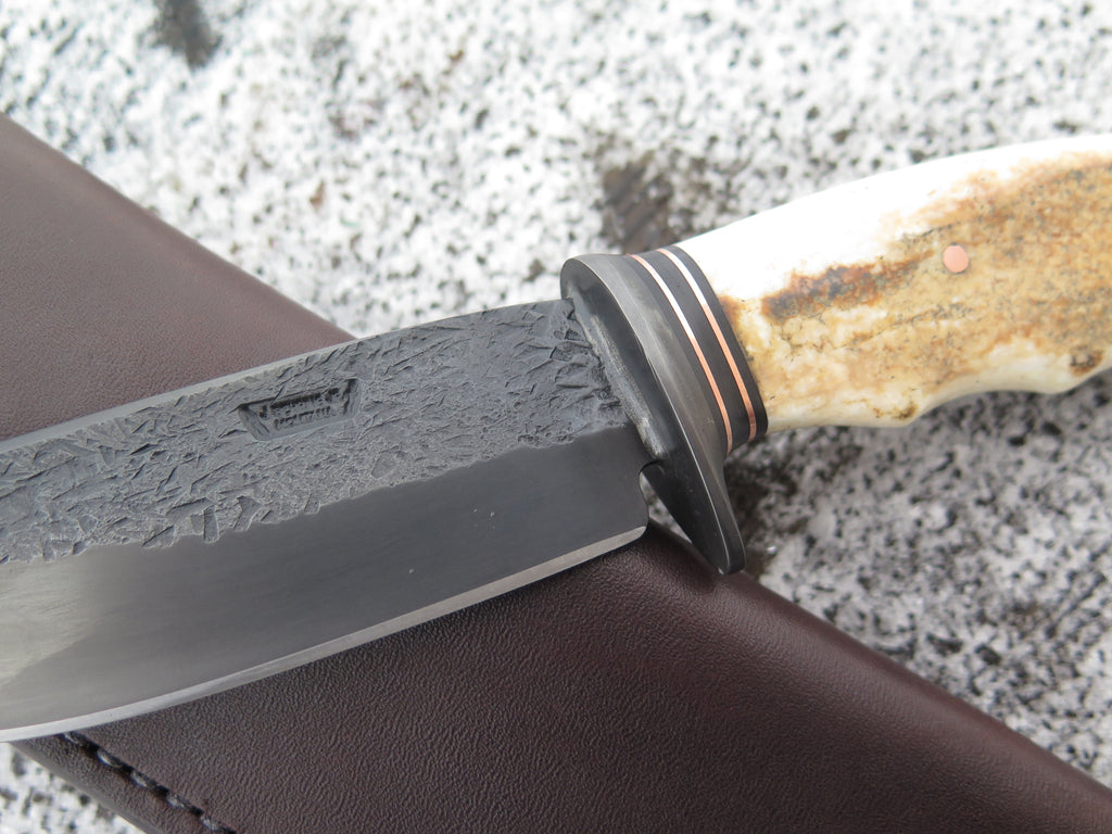 This outstanding new Hunter from Behring Made© is hand forged from 3/16" thick high carbon 01 tool steel and it measures 4 3/4" from tip to guard with a razor sharp hollow grind, hammermarks and our forced patina blued finish. The blued steel guard is soldered in place above black fiber with copper spacers as well, and the premium fossil walrus ivory handle is ground with the Ward Gay style finger grips, plus we pinned it with copper. The overall length measures 9 7/8" and it comes in a classic pouch sheath from Warlander Leather.