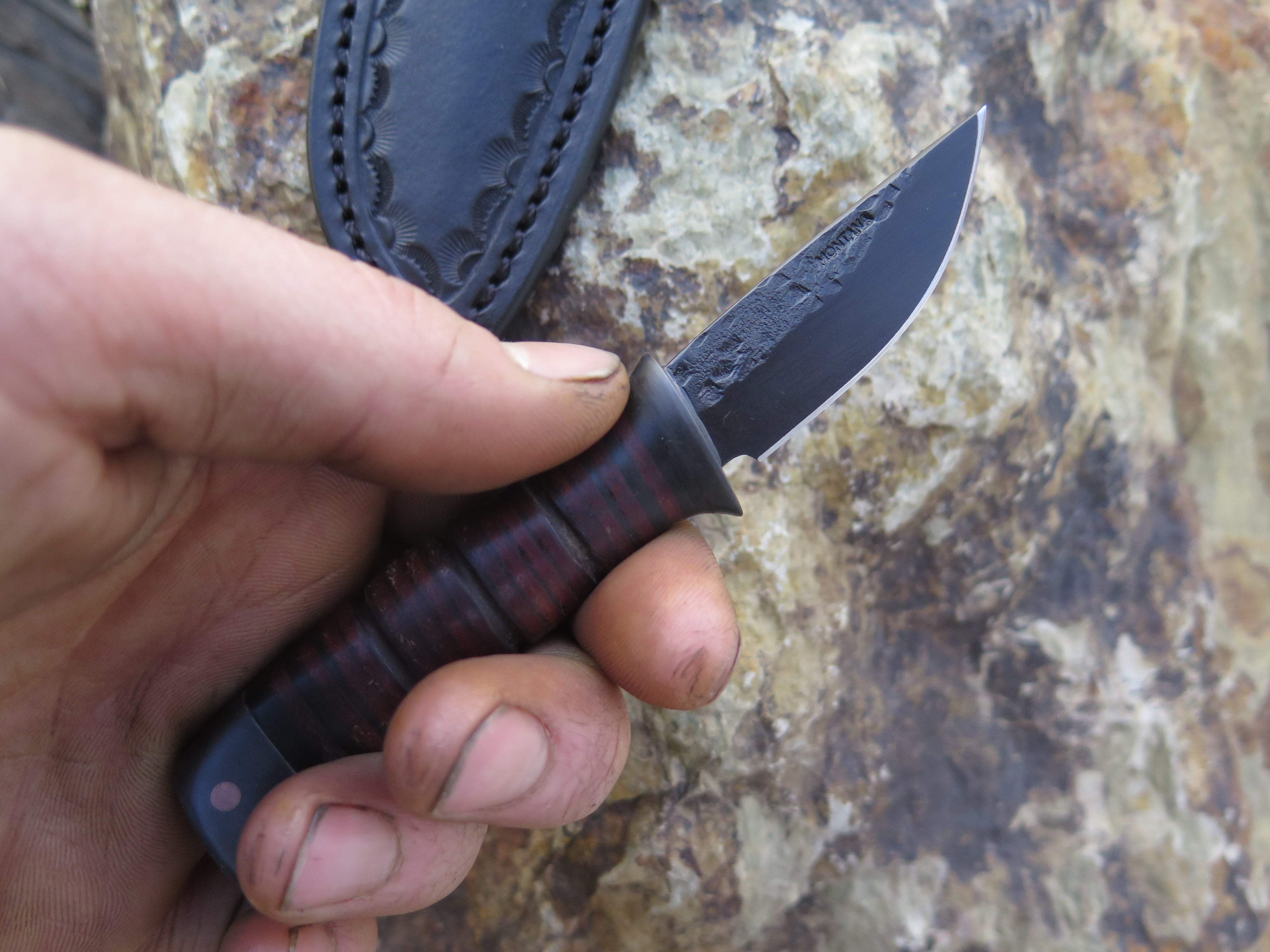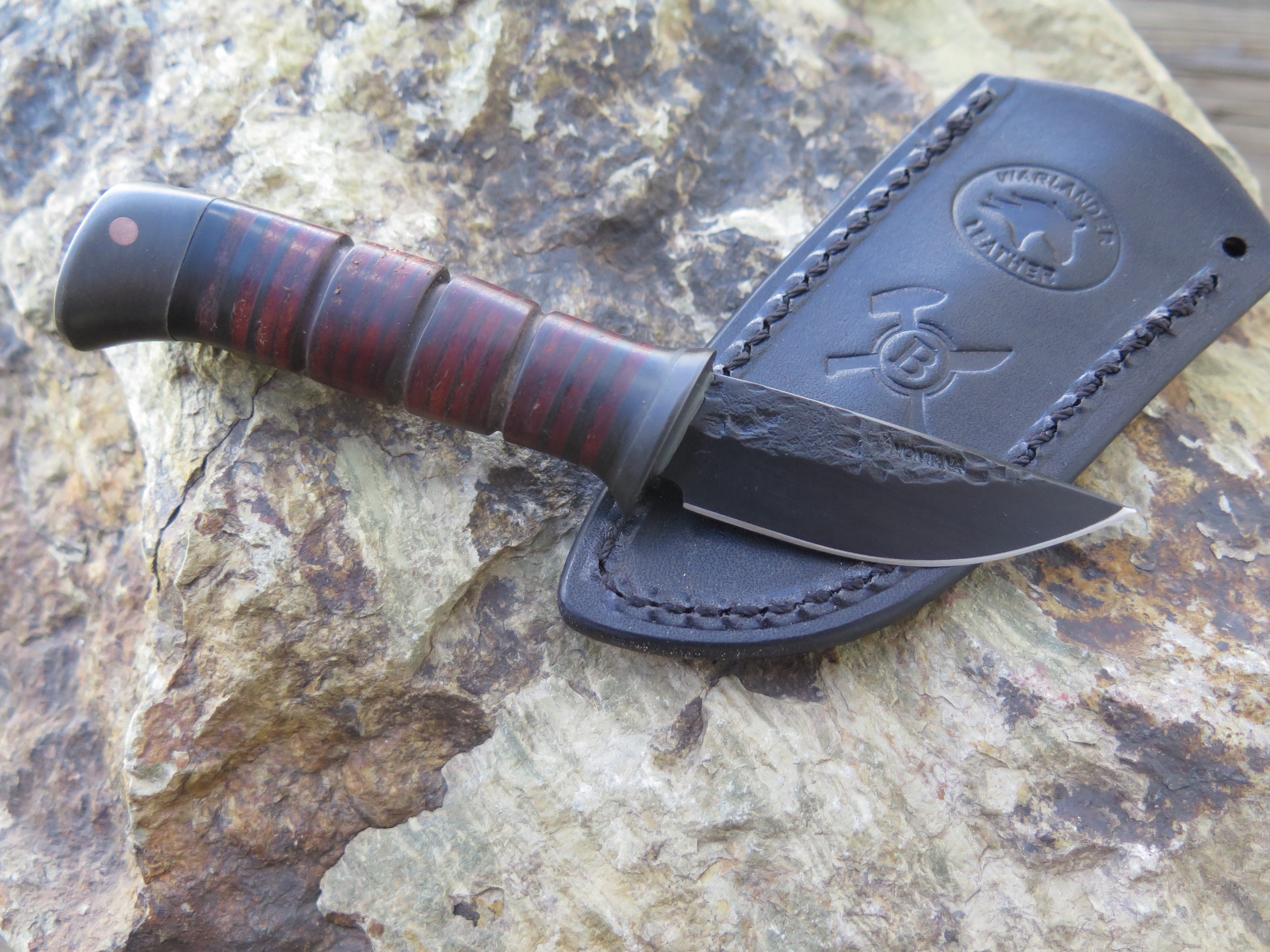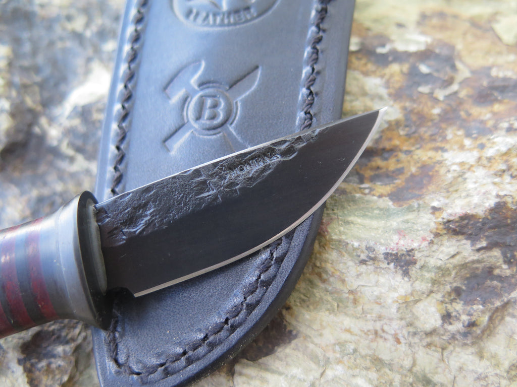This incredible 5th pocket from Behring Made© is hand forged from 1/8" thick high carbon 01 tool steel and it measures 2" from tip to guard with a razor sharp hollow grind, hammermarks and our forced patina blued finish. The blued steel guard is soldered in place above a WWII inspired stack of scalloped horsehide leather spacers and a steel butt that we've pinned through the tang with copper. The overall length measures 5" and we've got this one shipping in sleeve designed for your 5th pocket. This knife is made to order. Current lead times are 6 - 8 weeks.