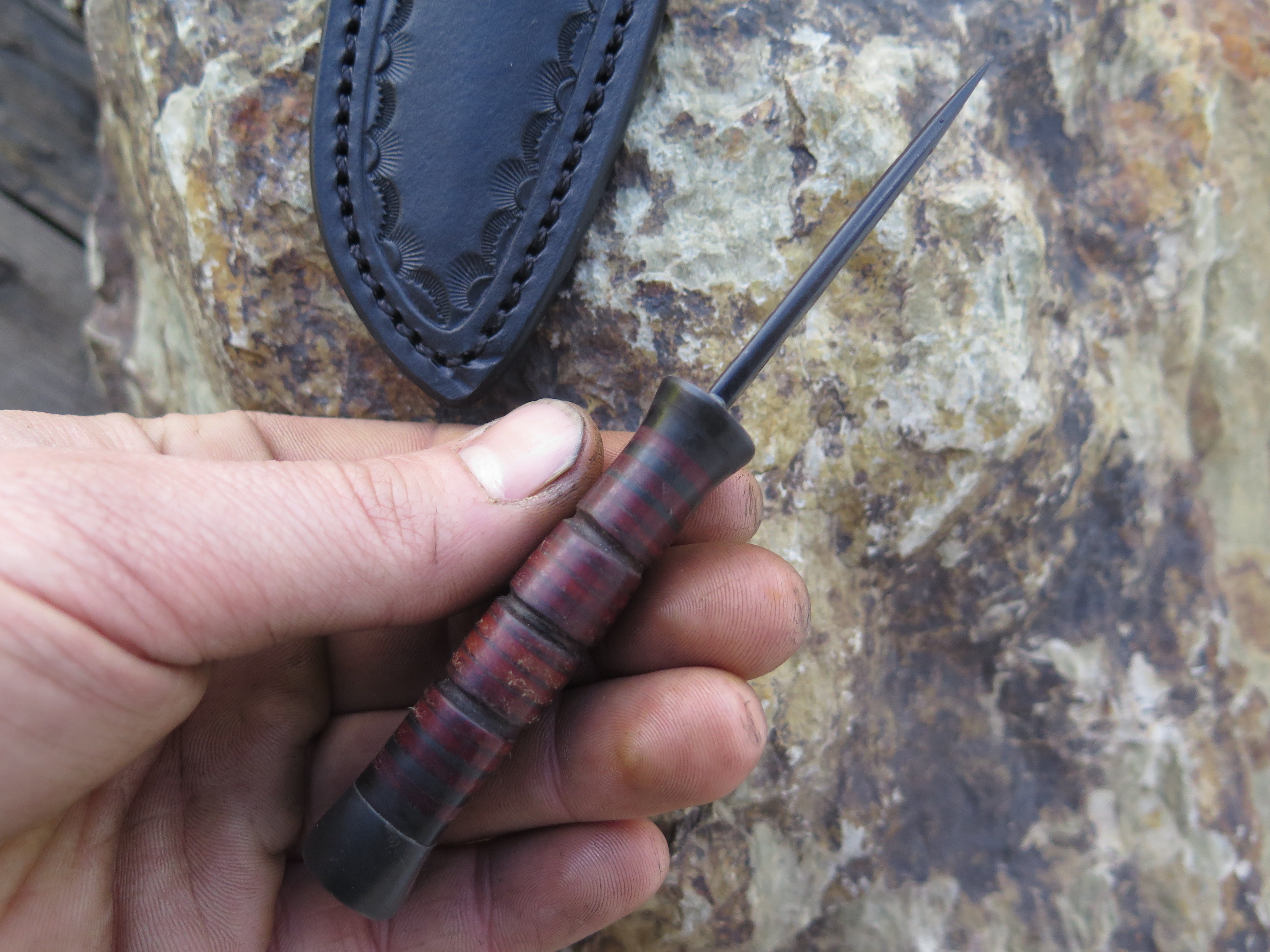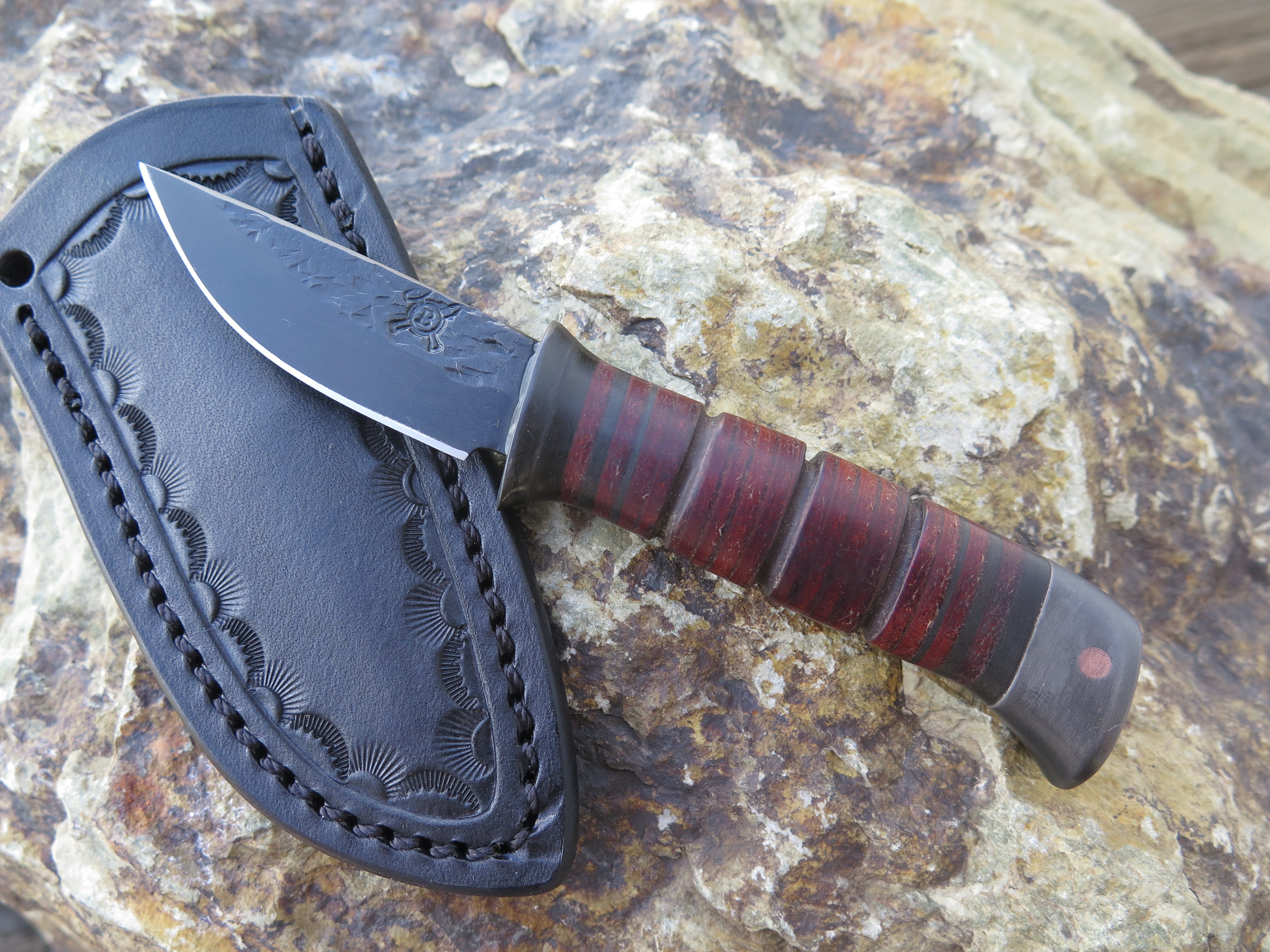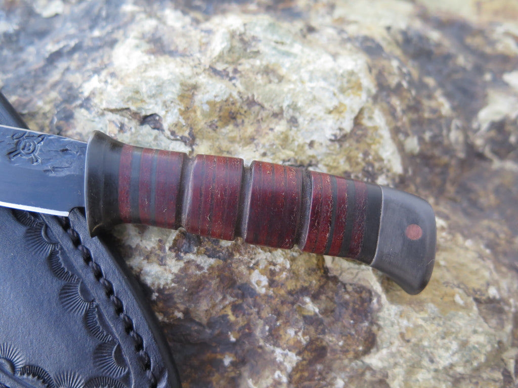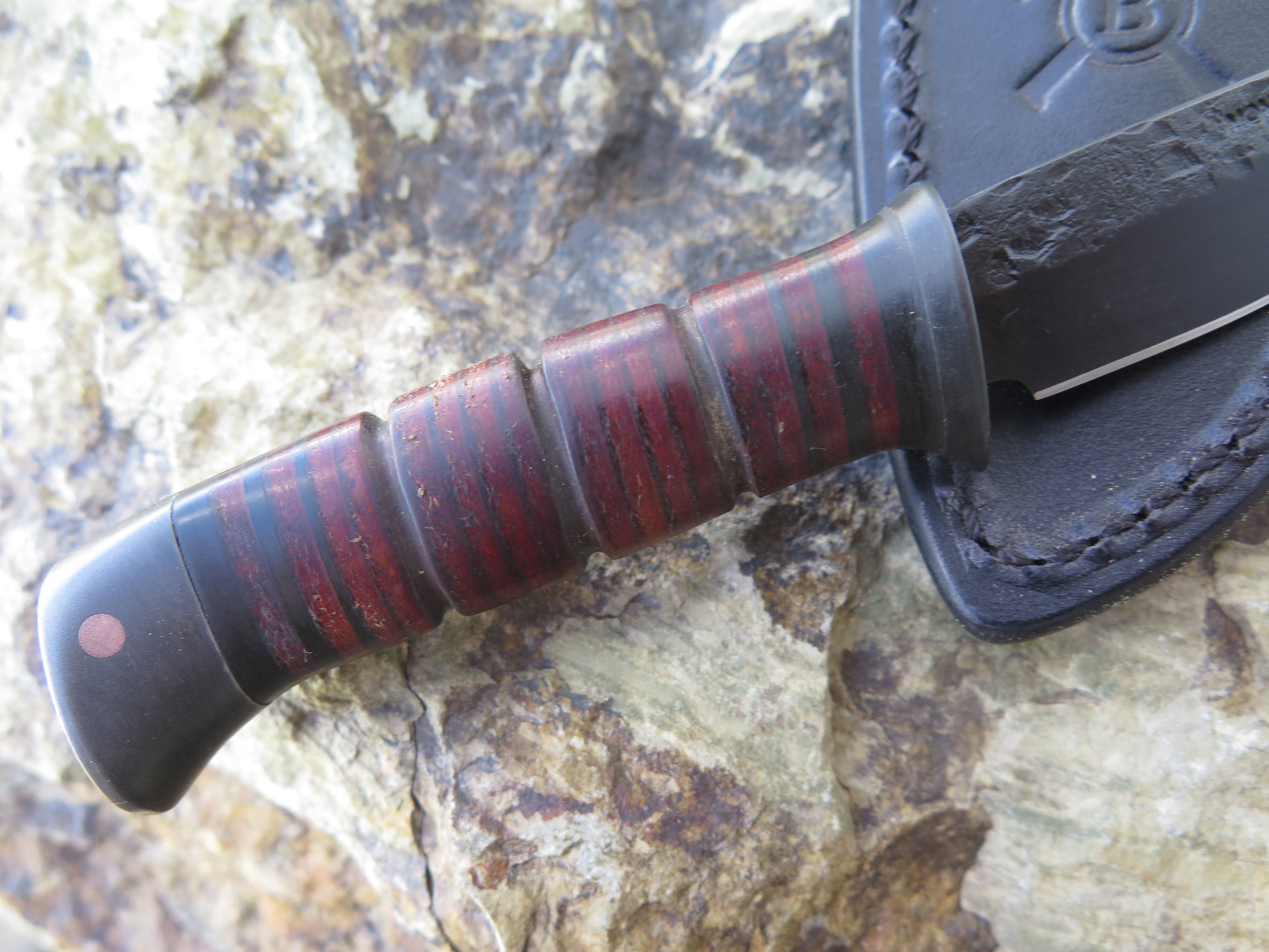 This incredible 5th pocket from Behring Made© is hand forged from 1/8" thick high carbon 01 tool steel and it measures 2" from tip to guard with a razor sharp hollow grind, hammermarks and our forced patina blued finish. The blued steel guard is soldered in place above a WWII inspired stack of scalloped horsehide leather spacers and a steel butt that we've pinned through the tang with copper. The overall length measures 5" and we've got this one shipping in sleeve designed for your 5th pocket. This knife is made to order. Current lead times are 6 - 8 weeks.