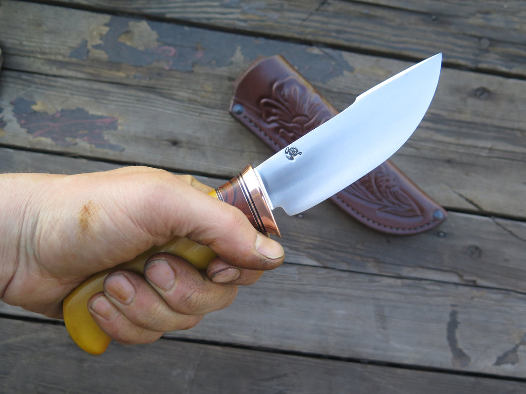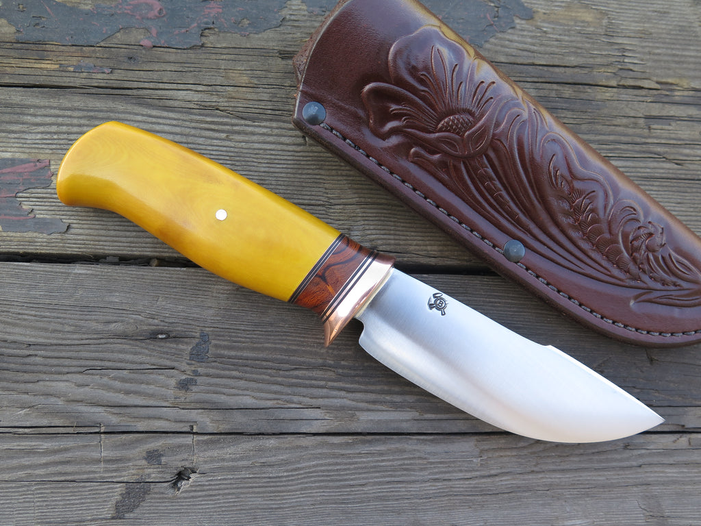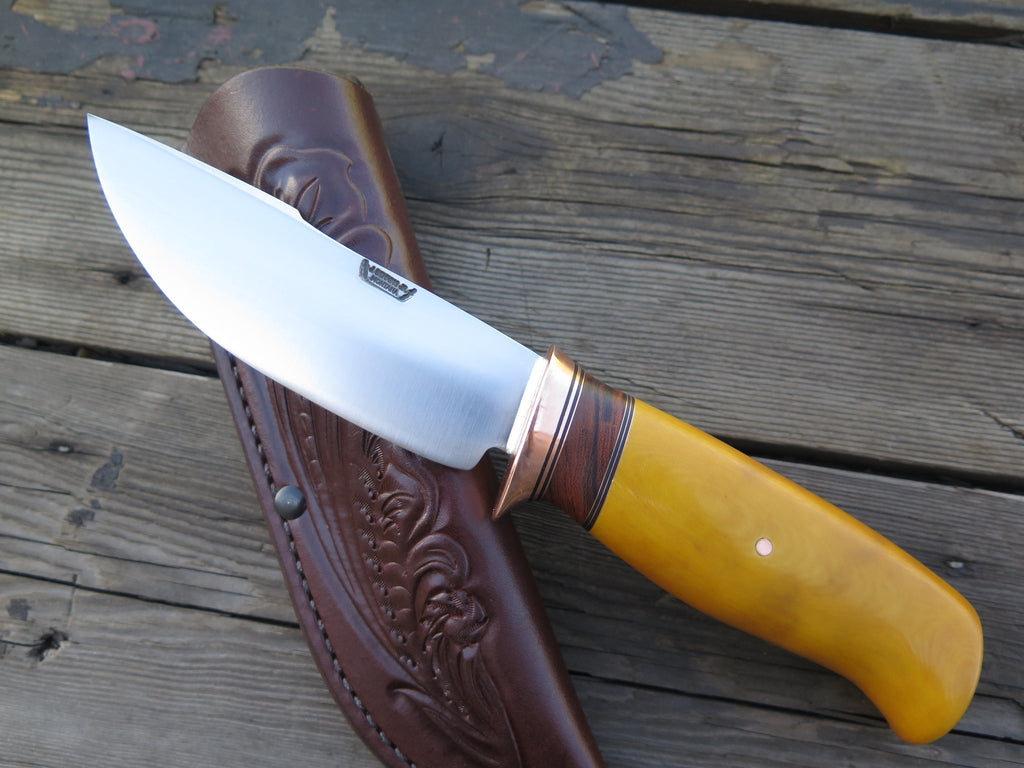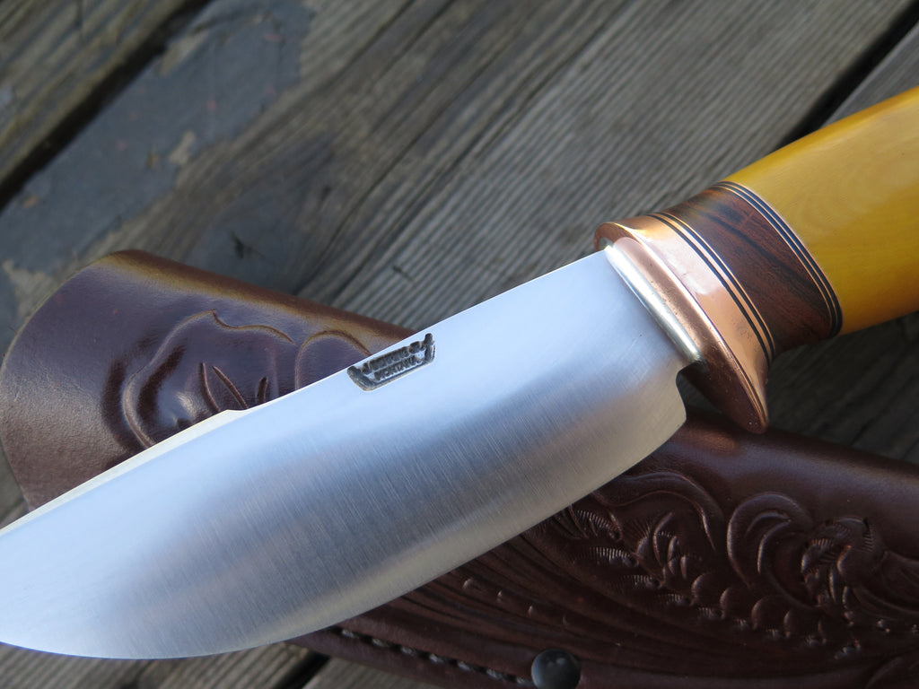 The Woodcraft has been an American classic ever since WL Marble introduced it in the earlier 1900's. This one from Behring Made™ is hand forged from high carbon 01 tool steel and it measures 4 1/2" from tip to guard with a razor sharp convex grind. The copper guard is soldered in place above black fiber, copper and desert ironwood burl spacers as well as a beautiful yellow canvas micarta handle. Overall length measures 9 1/8" and it comes the shown Warlander Leather pouch sheath.