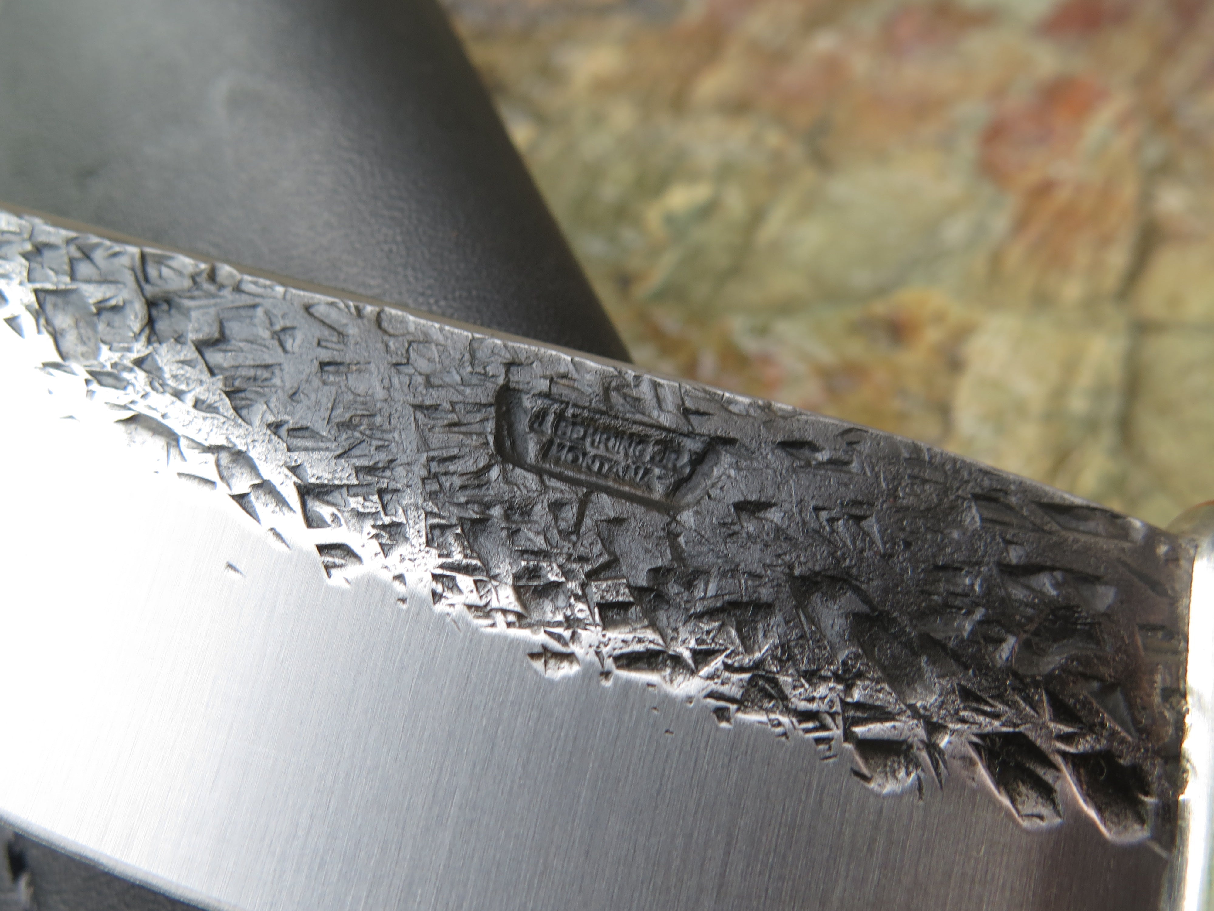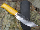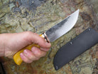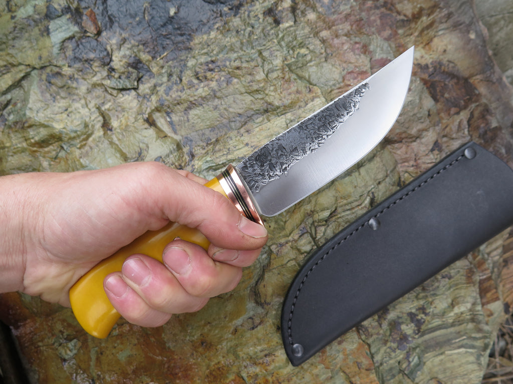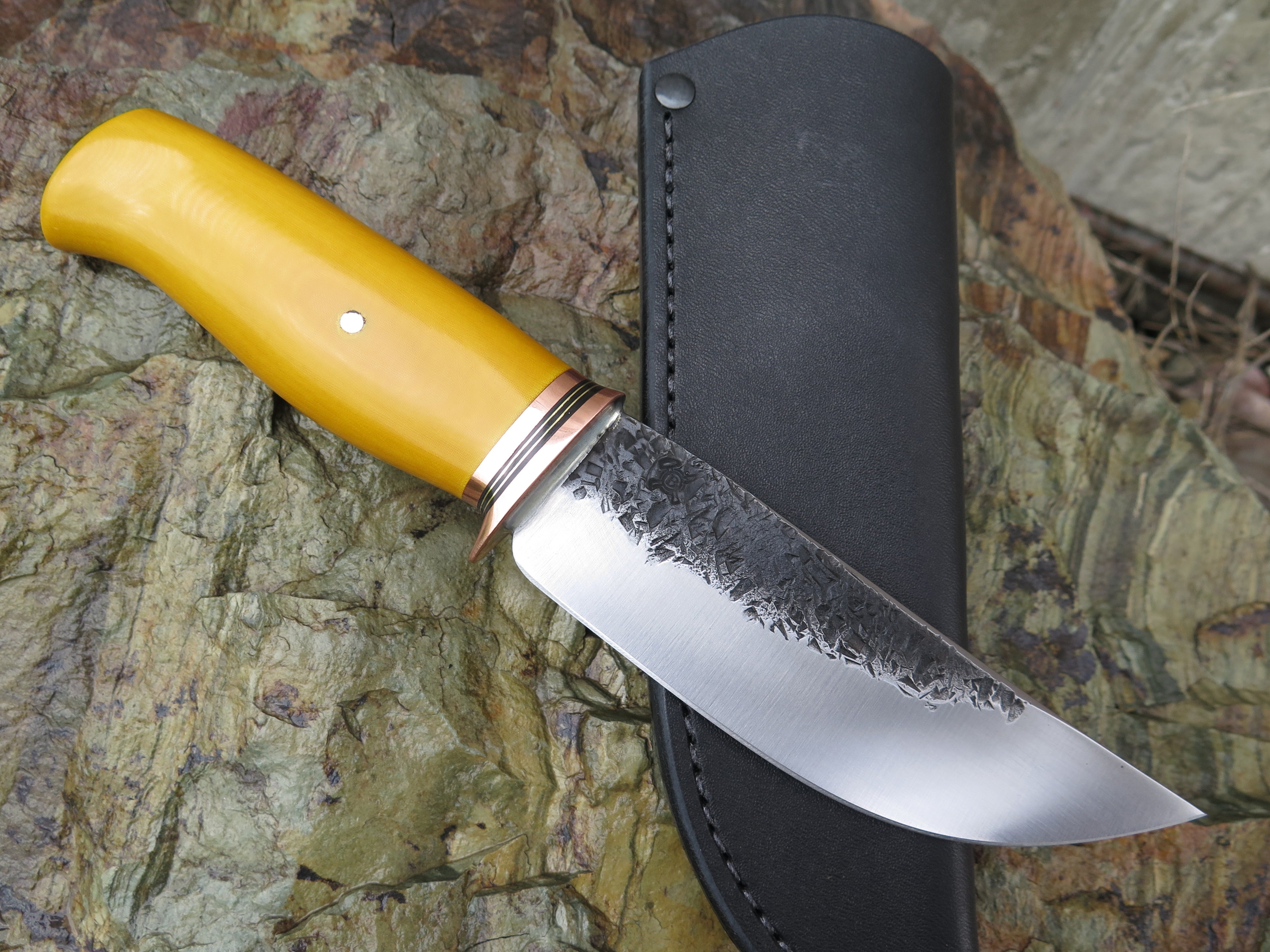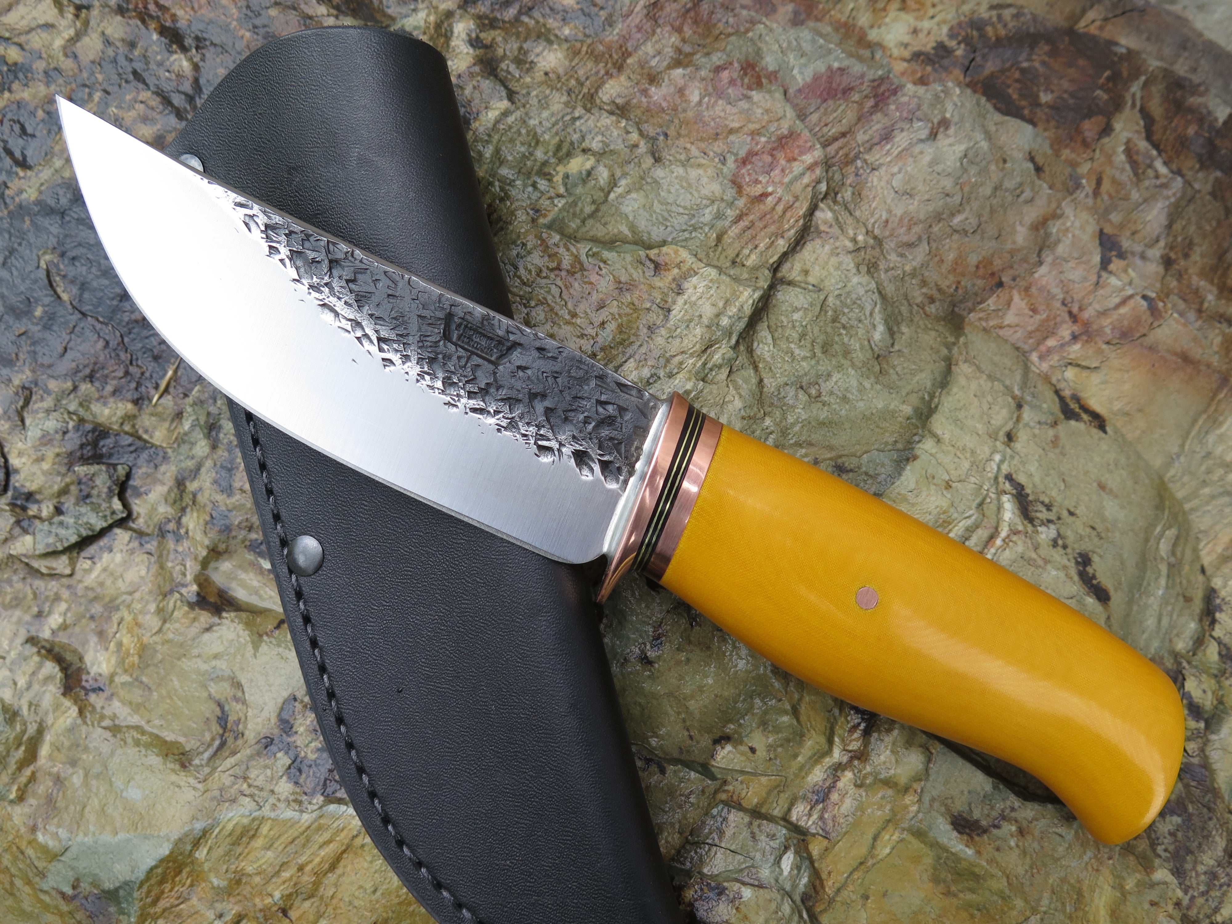 This beautiful new Hunter from Behring Made™ is hand forged from 3/16 thick high carbon 01 tool steel and it measures 4 3/4" from tip to guard with a razor sharp hollow grind and our hammermark finish. The copper guard is soldered in place above black fiber and copper spacers as well as a yellow micarta handle that we've pinned with copper as well. The overall length measures 9 1/4" and it comes in a Warlander Leather pouch sheath.