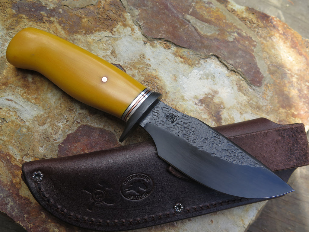 This bad ass Alaskan from Behring Made© is hand forged from 3/16" thick high carbon 01 tool steel and it measures 4 1/2" from tip to guard with a razor sharp hollow grind, hammermarks and our forced patina blued finish. The blued steel guard is soldered in place above black fiber, copper and aluminum spacers as well as a yellow linen micarta handle that's pinned through the tang with copper. The overall length measures 9" and it comes in a classic brown leather belt pouch sheath.