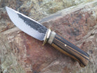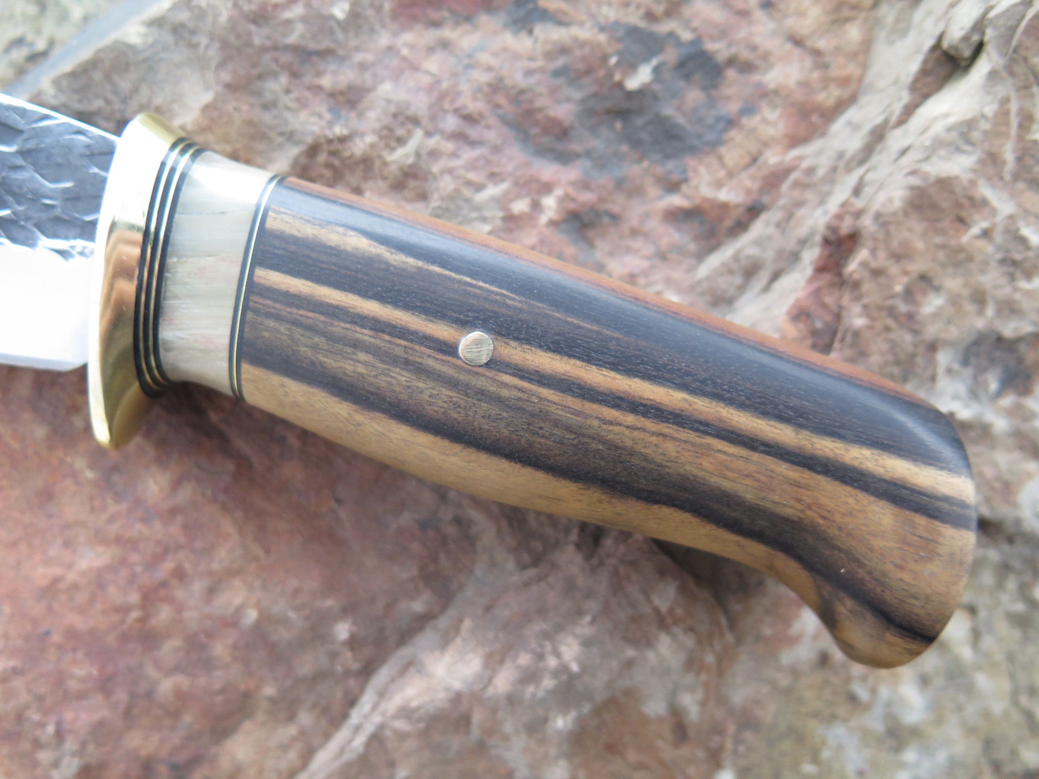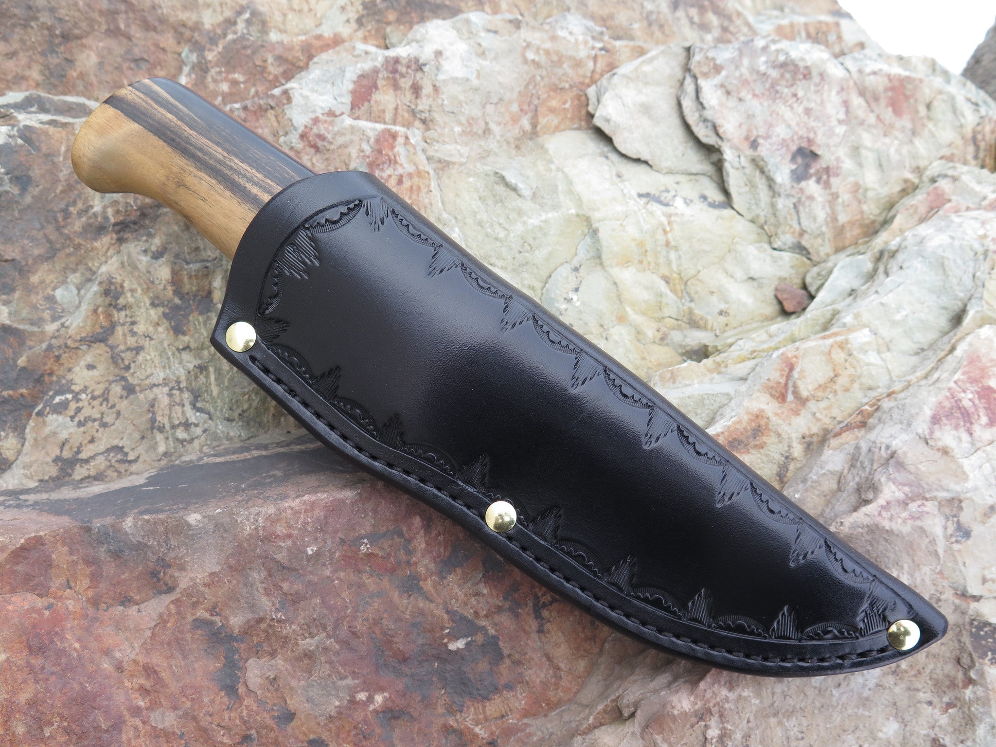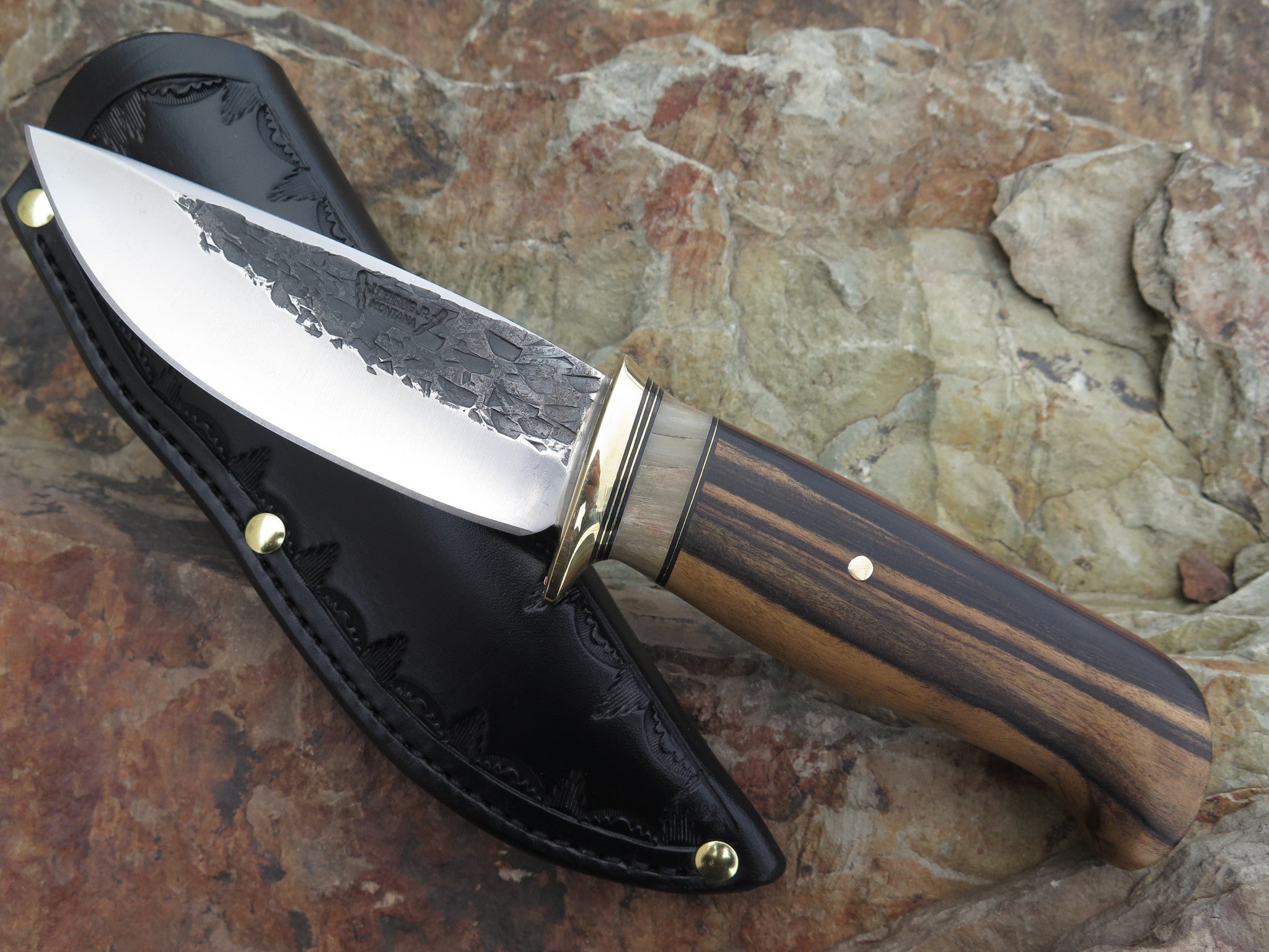 This new Drop Point from Behring Made is hand forged from 3/16" thick high carbon 01 tool steel and it measures 4 3/4" from tip to guard with a razor sharp hollow grind and a hammermark finish. The brass guard is soldered in place above black fiber, brass and Dall sheep horn spacers that beautifully accent the black and white ebony handle that is pinned with brass. The overall length measures 9 5/8", plus it comes in a custom sheath from Warlander Leather.