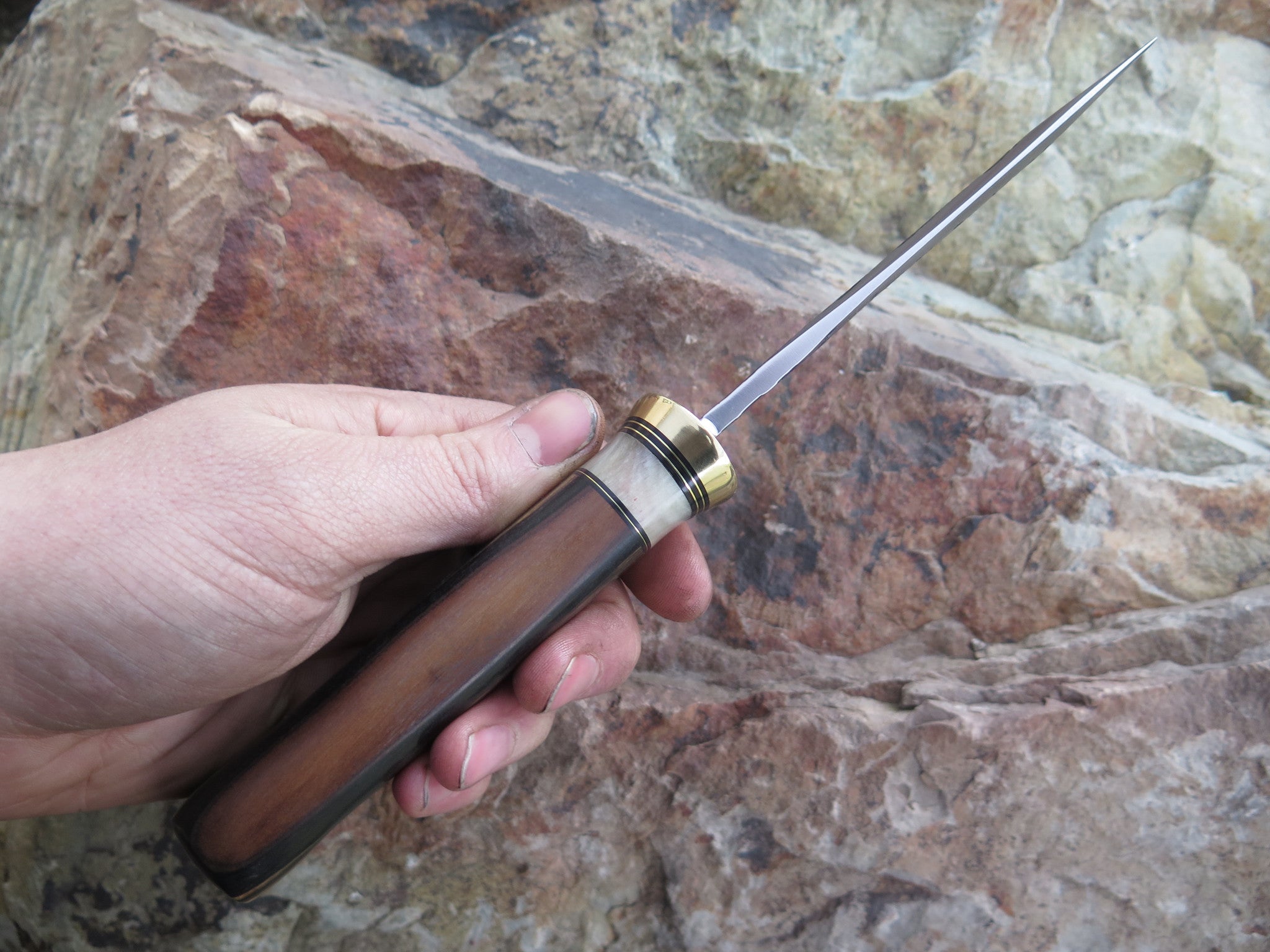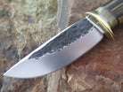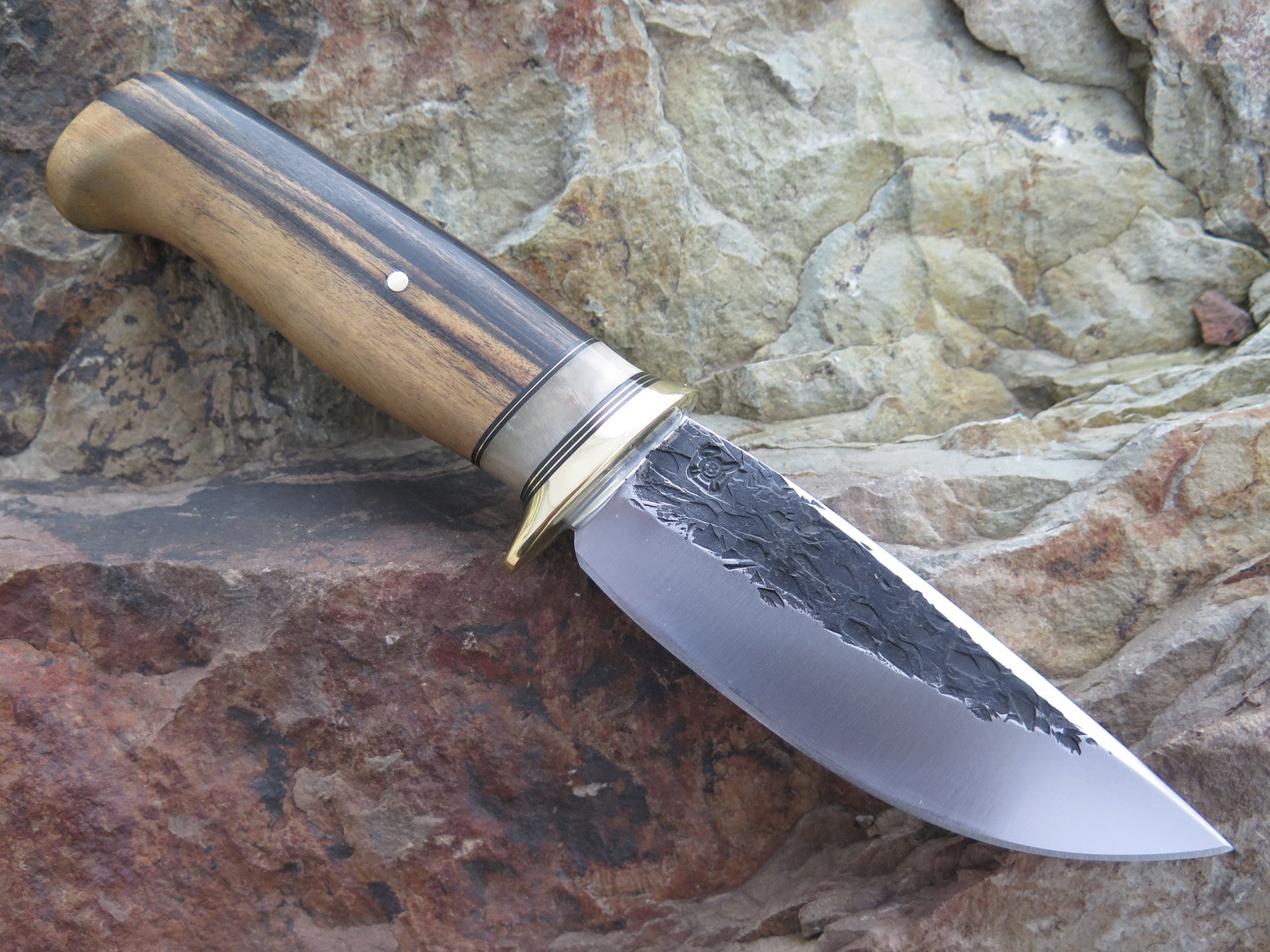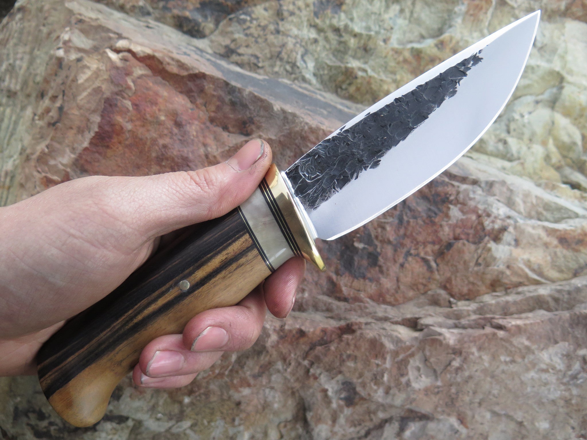 This new Drop Point from Behring Made is hand forged from 3/16" thick high carbon 01 tool steel and it measures 4 3/4" from tip to guard with a razor sharp hollow grind and a hammermark finish. The brass guard is soldered in place above black fiber, brass and Dall sheep horn spacers that beautifully accent the black and white ebony handle that is pinned with brass. The overall length measures 9 5/8", plus it comes in a custom sheath from Warlander Leather.