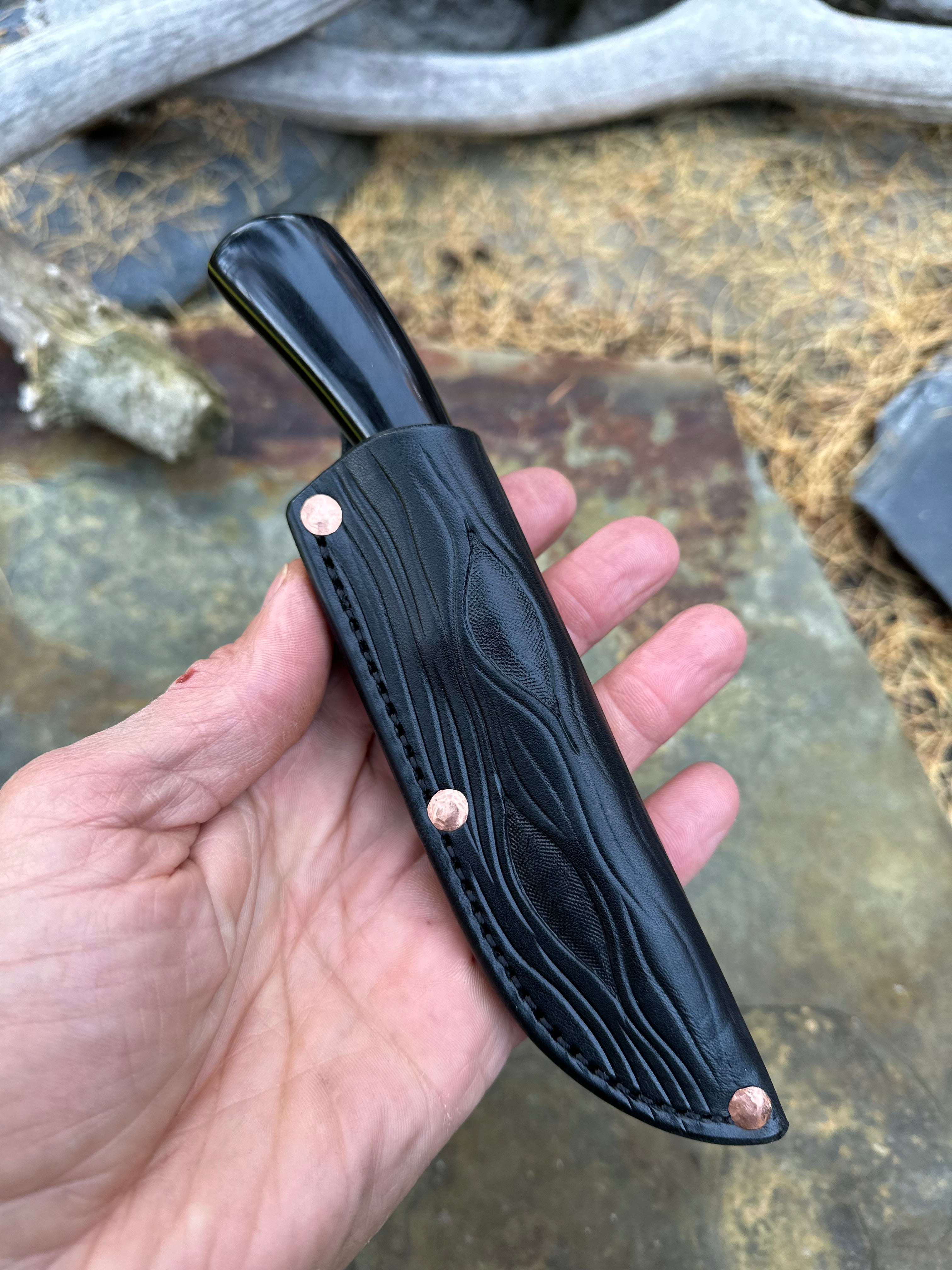- Black Pouch Sheath with Hand Carved Tree Bark Theme, & Copper Rivets