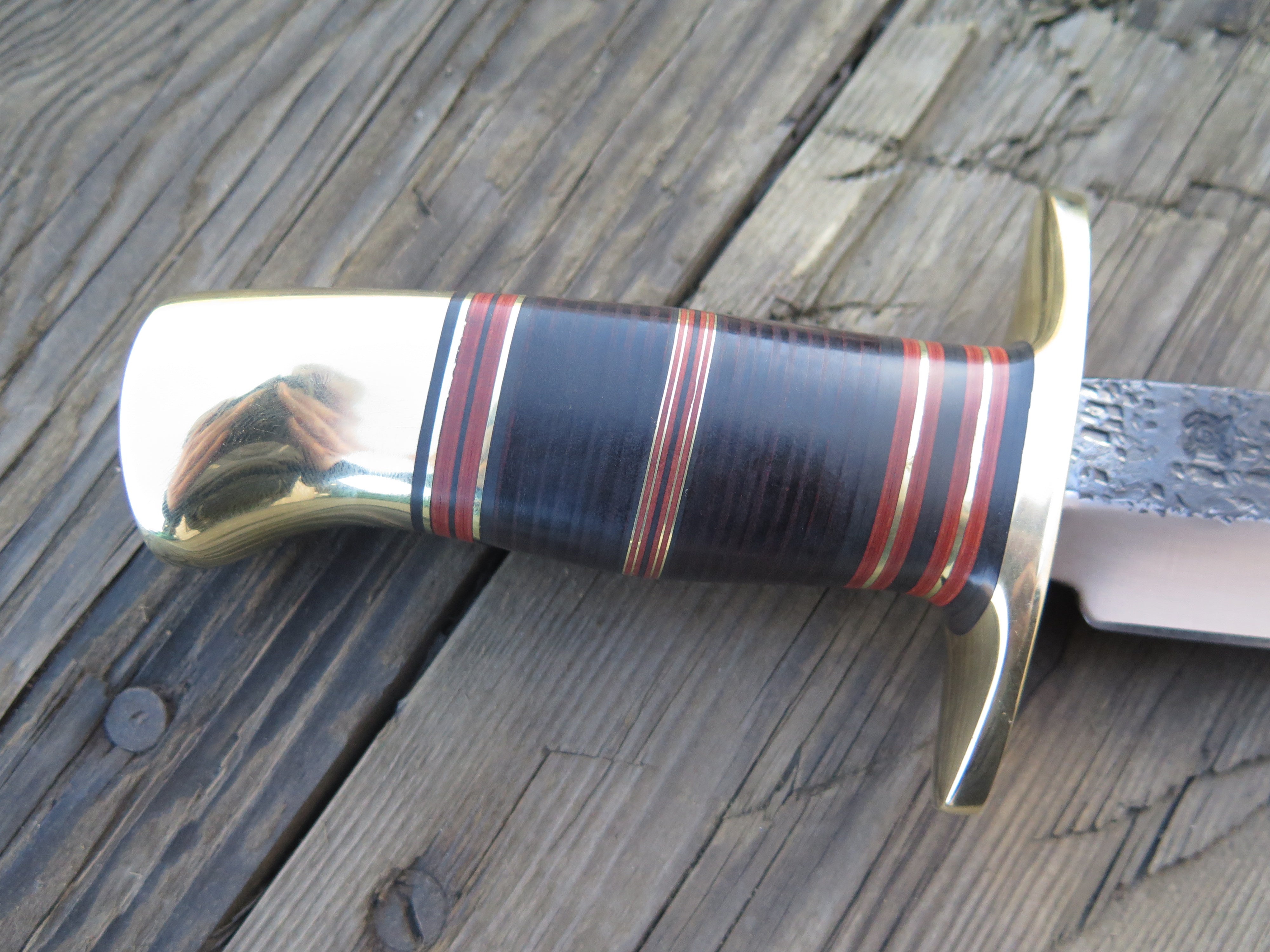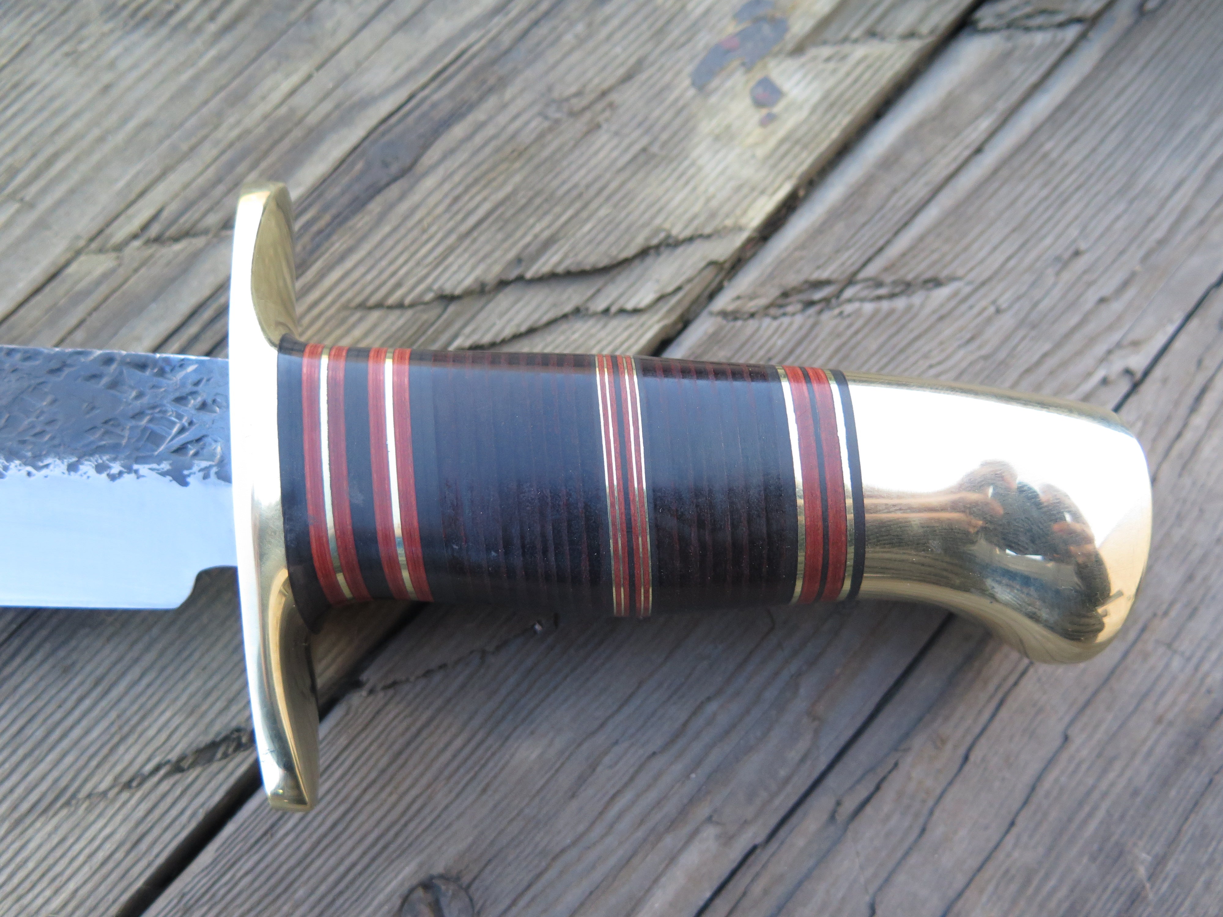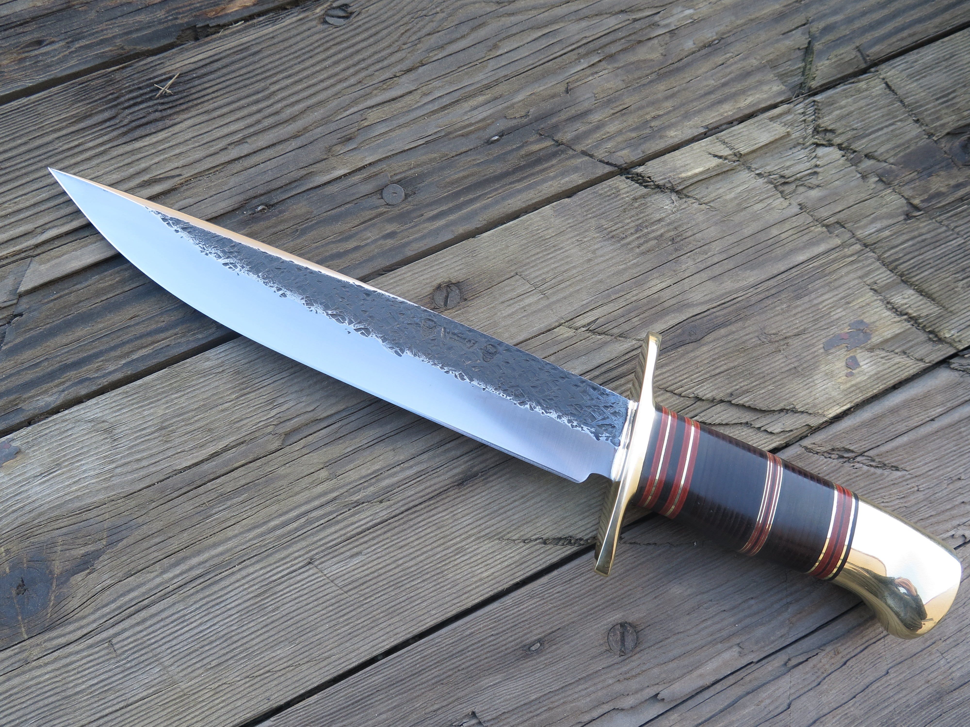 This beastly new XL Fighter from Behring Made© is hand forged from 1/4" thick 5160 spring steel and it measures 9 1/2" from tip to guard with a razor sharp hollow grind and our hammermark finish. The tall brass guard is soldered in place above black and maroon fiber, brass and horsehide leather spacers that top a big ol' brass butt that is also pinned with brass. The overall length measures 14" and it will come in a custom sheath from Warlander Leather.