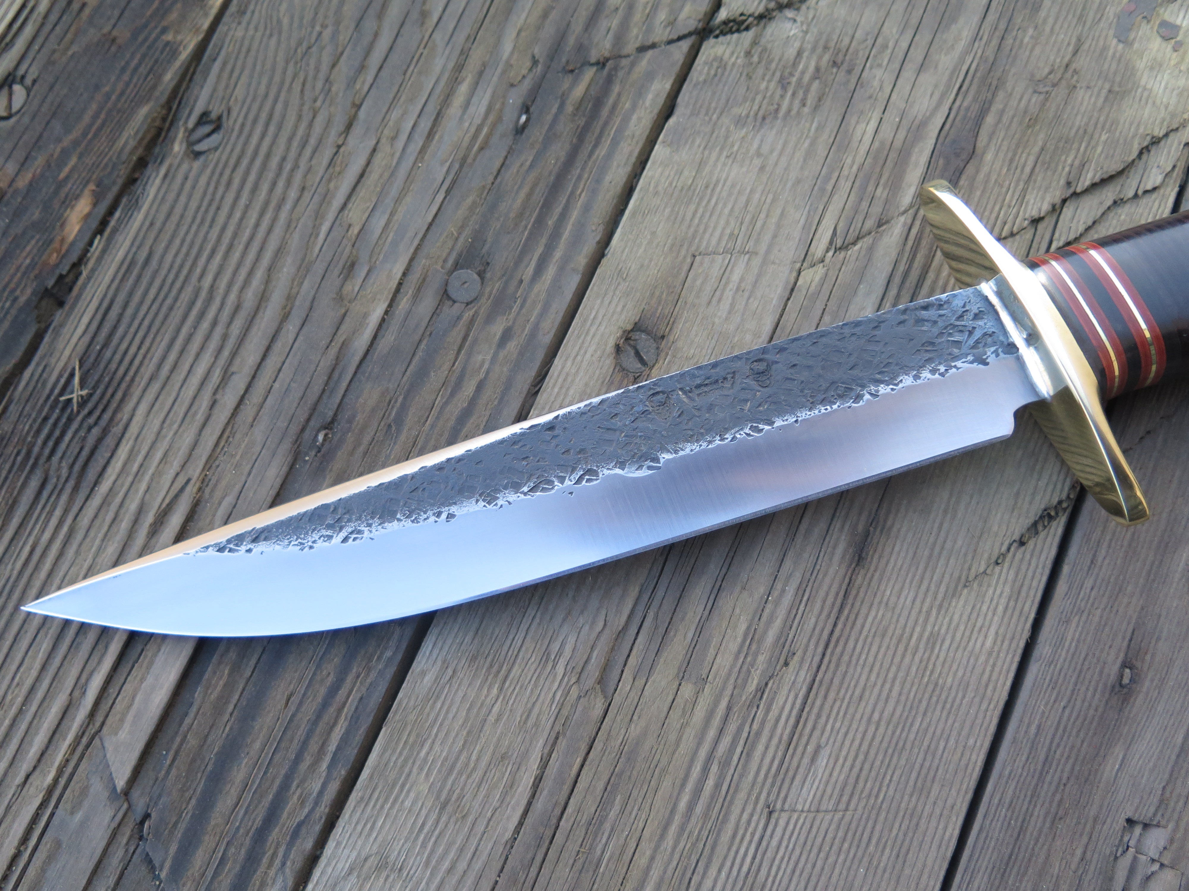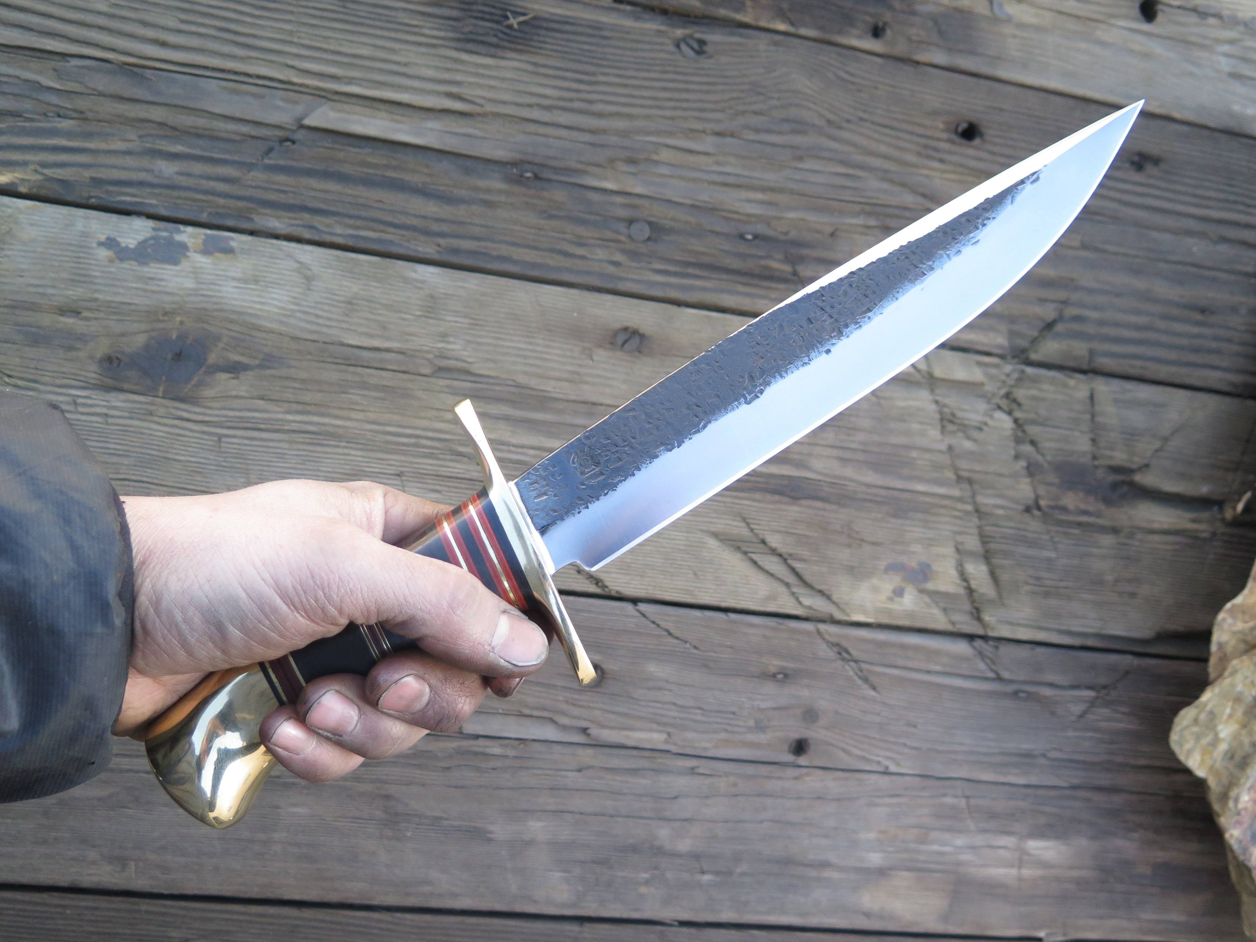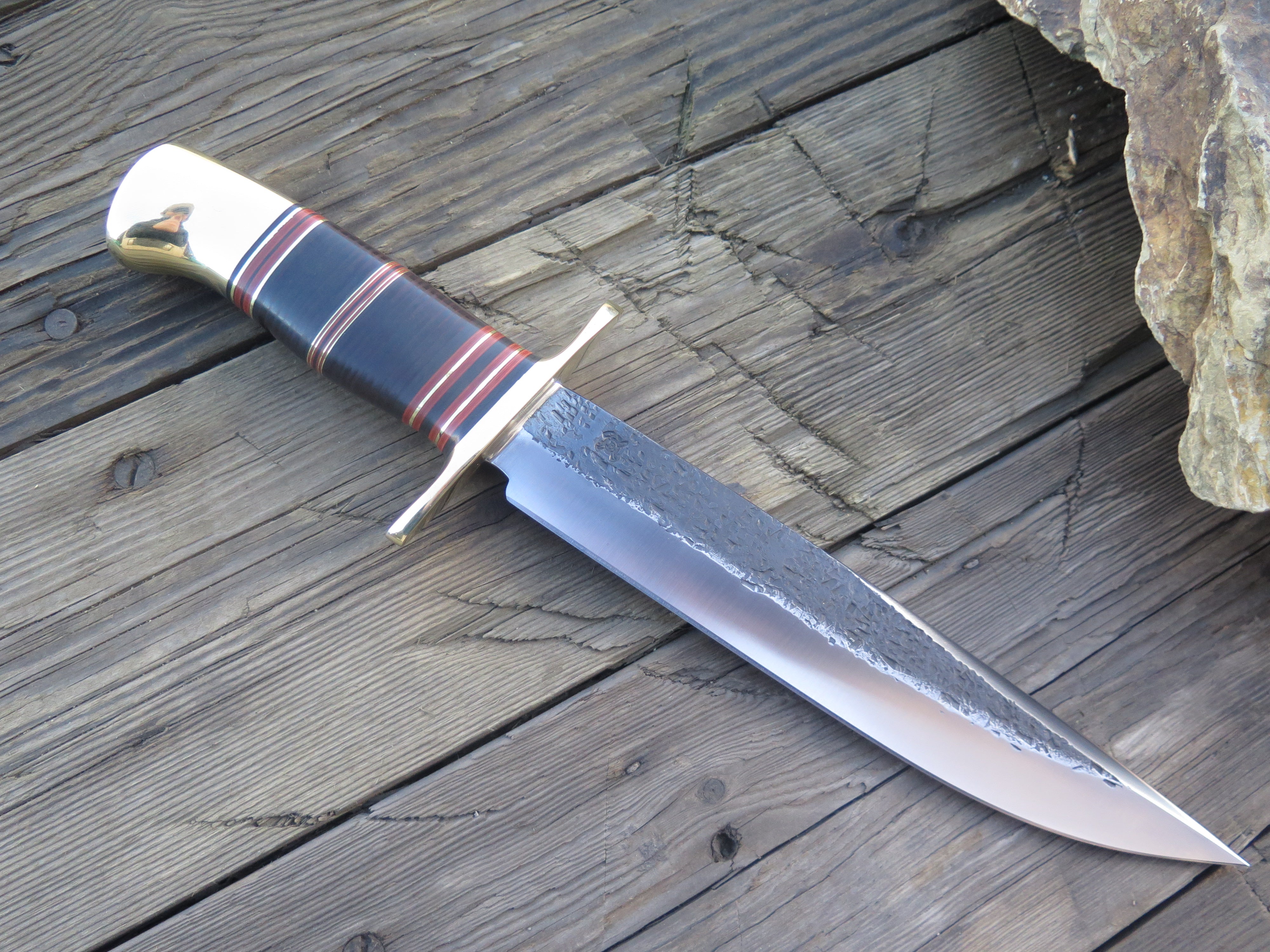 This beastly new XL Fighter from Behring Made© is hand forged from 1/4" thick 5160 spring steel and it measures 9 1/2" from tip to guard with a razor sharp hollow grind and our hammermark finish. The tall brass guard is soldered in place above black and maroon fiber, brass and horsehide leather spacers that top a big ol' brass butt that is also pinned with brass. The overall length measures 14" and it will come in a custom sheath from Warlander Leather.