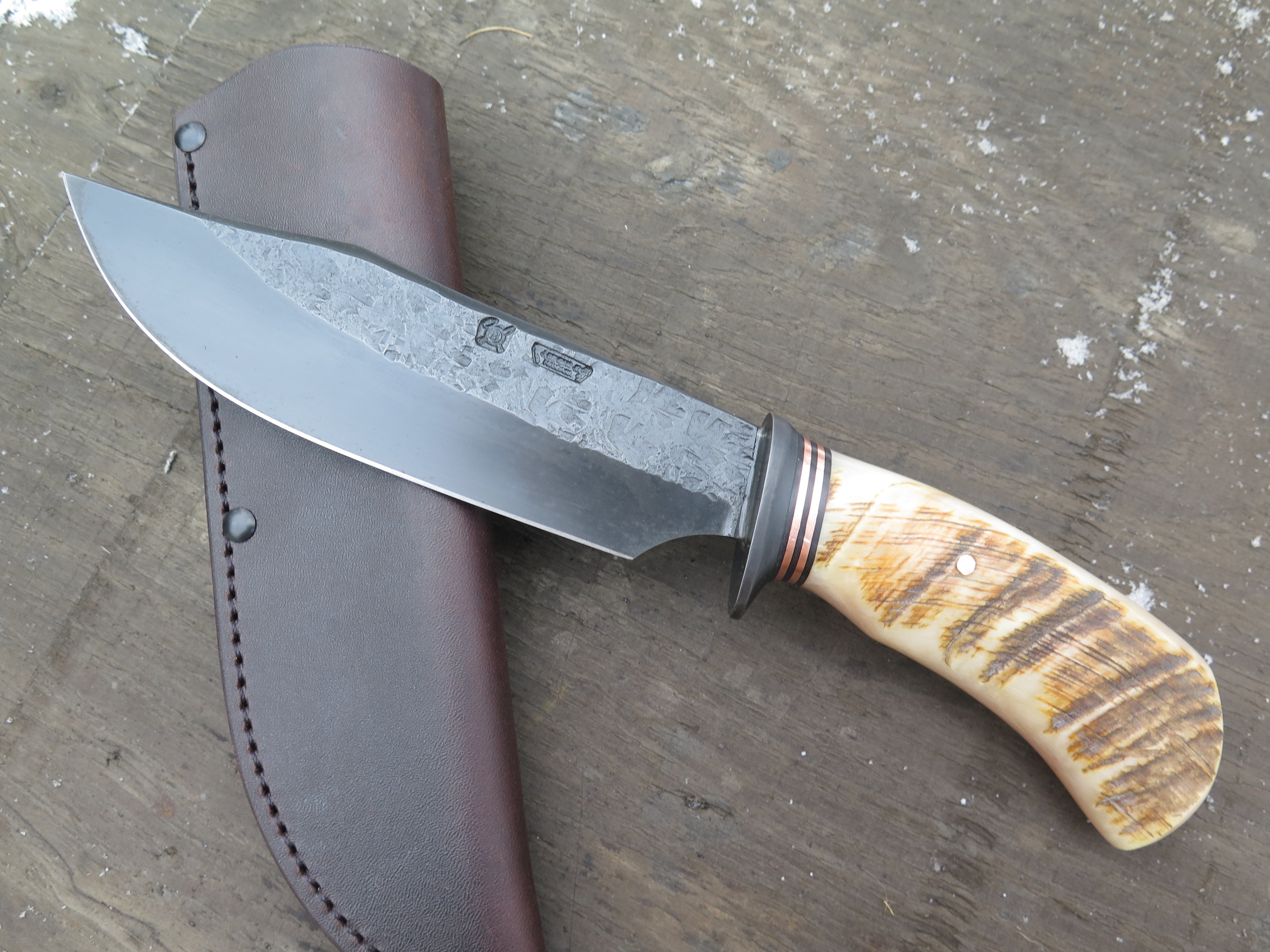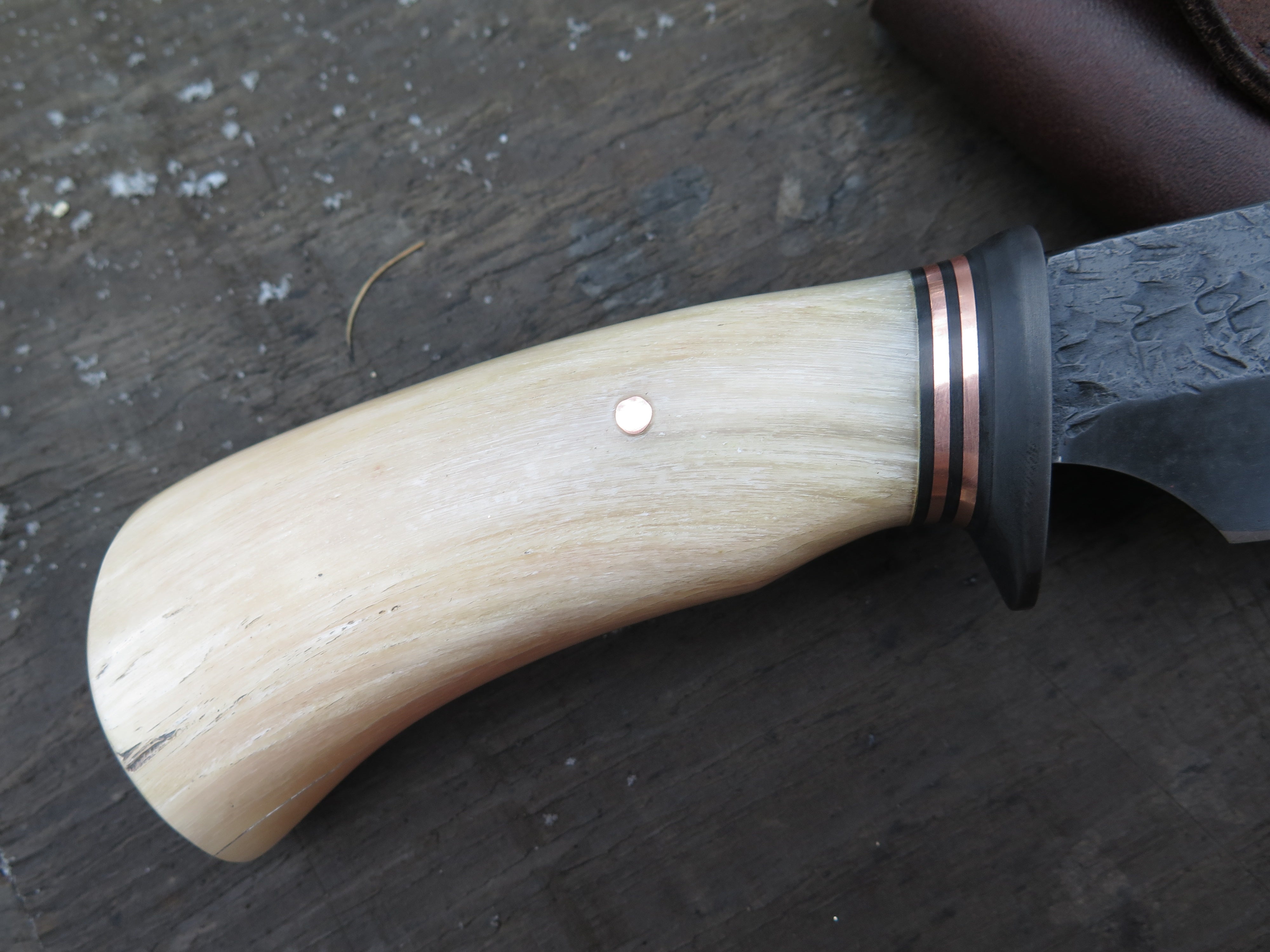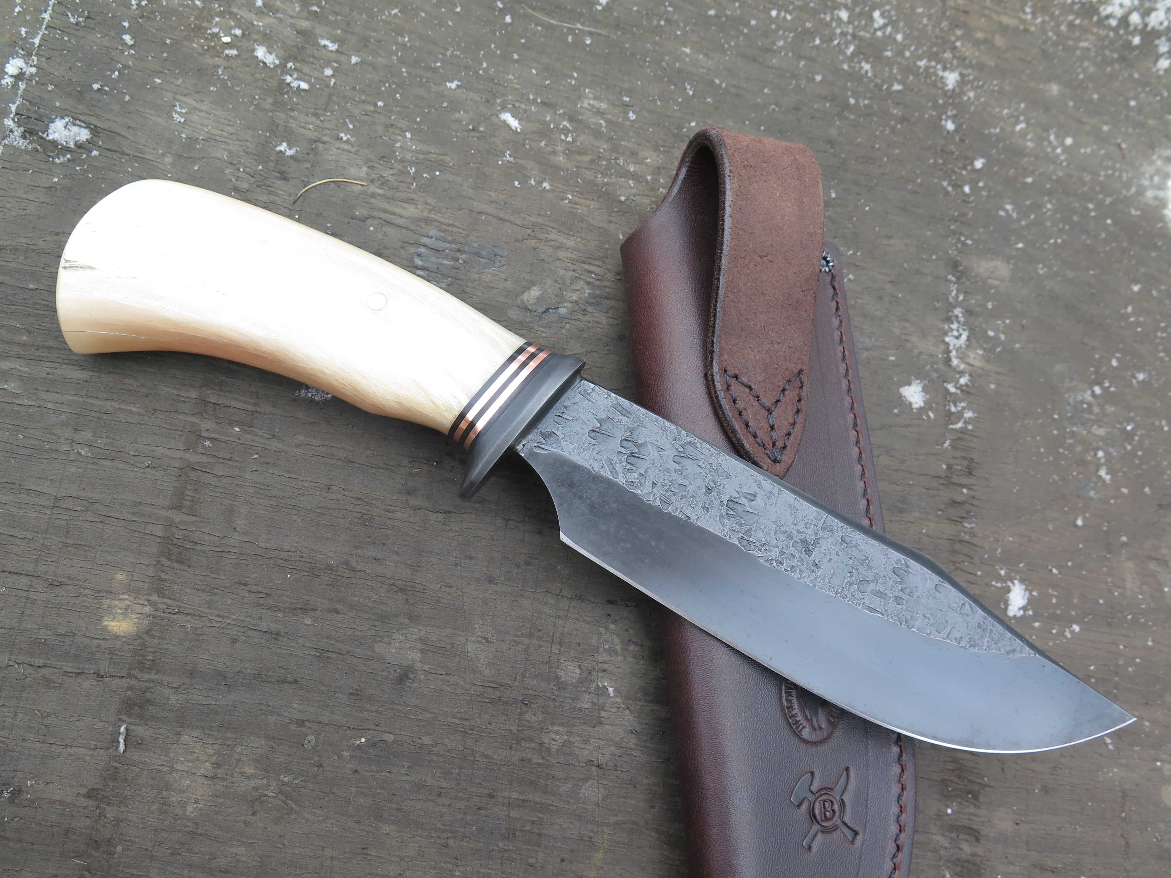 This new Bushmaster from Behring Made© is hand forged from 1/4" thick high carbon 01 tool steel and it measures 6 1/2" from tip to guard with a razor sharp hollow grind, hammermarks and a forced patina blued finish. The blued steel guard is soldered in place above black fiber and copper spacers as well as a premium Dall's sheep horn handle that we have pinned through the tang with copper. The overall length measures 11 3/8" and it also comes in a classic belt pouch sheath.