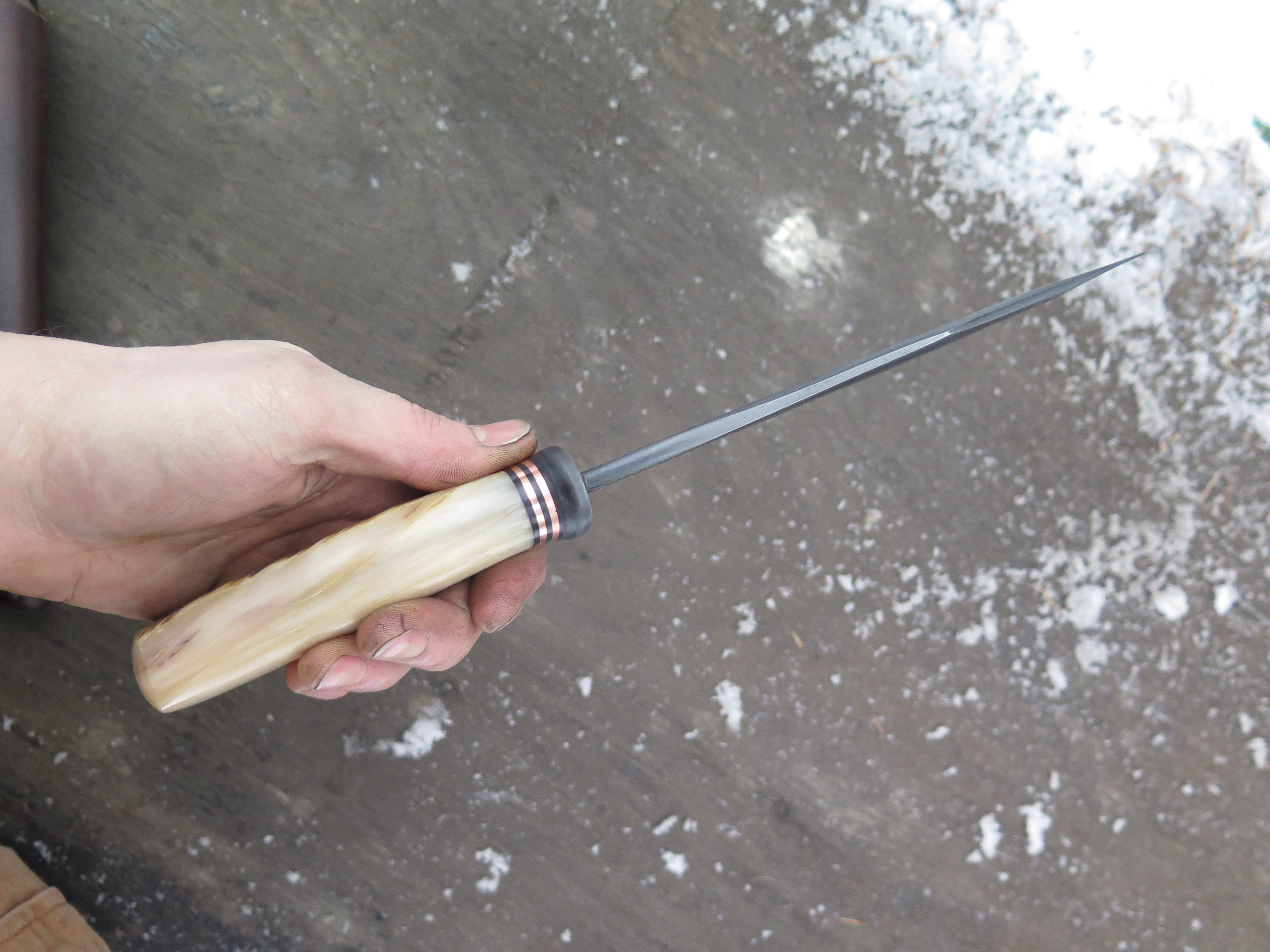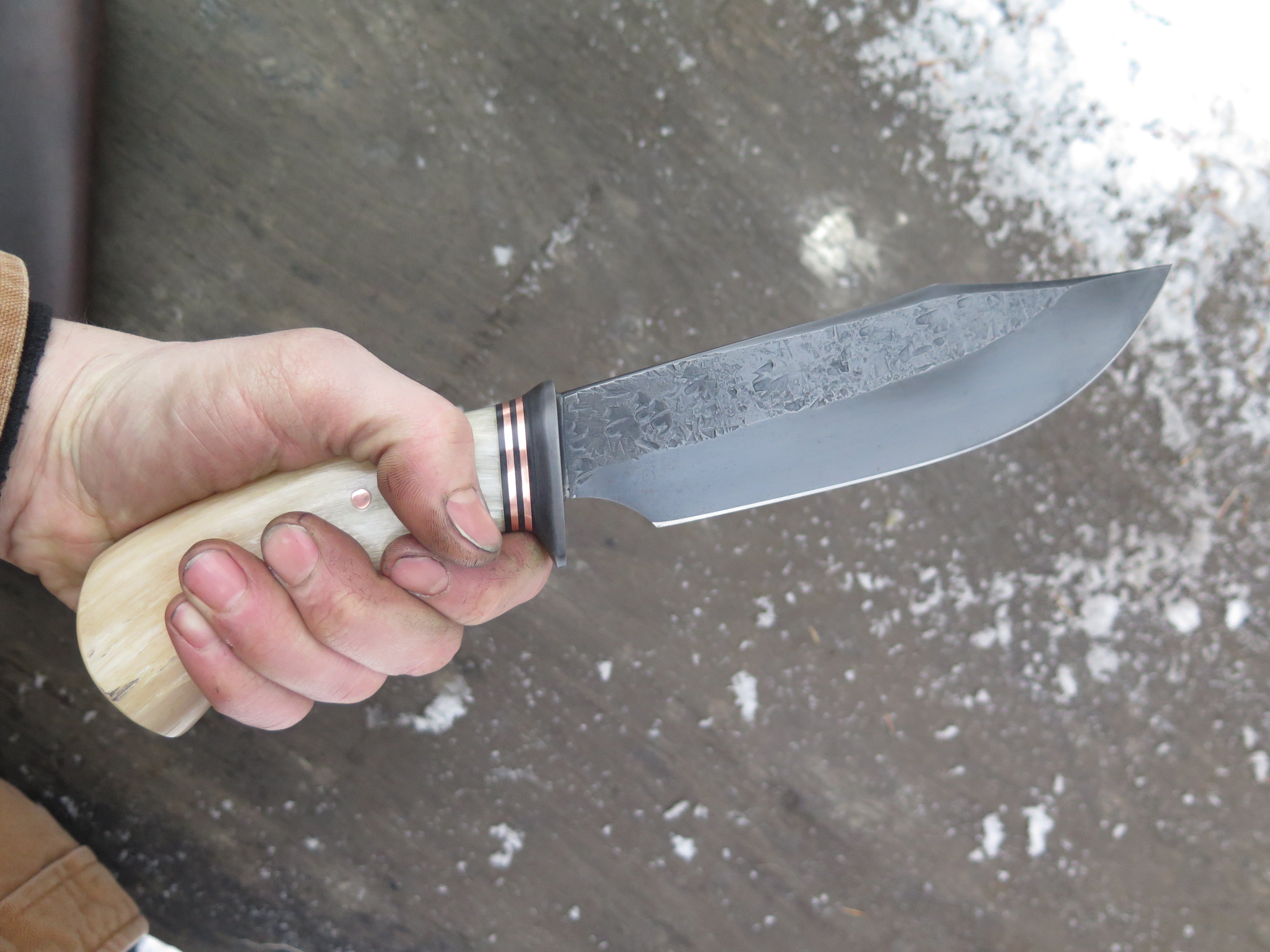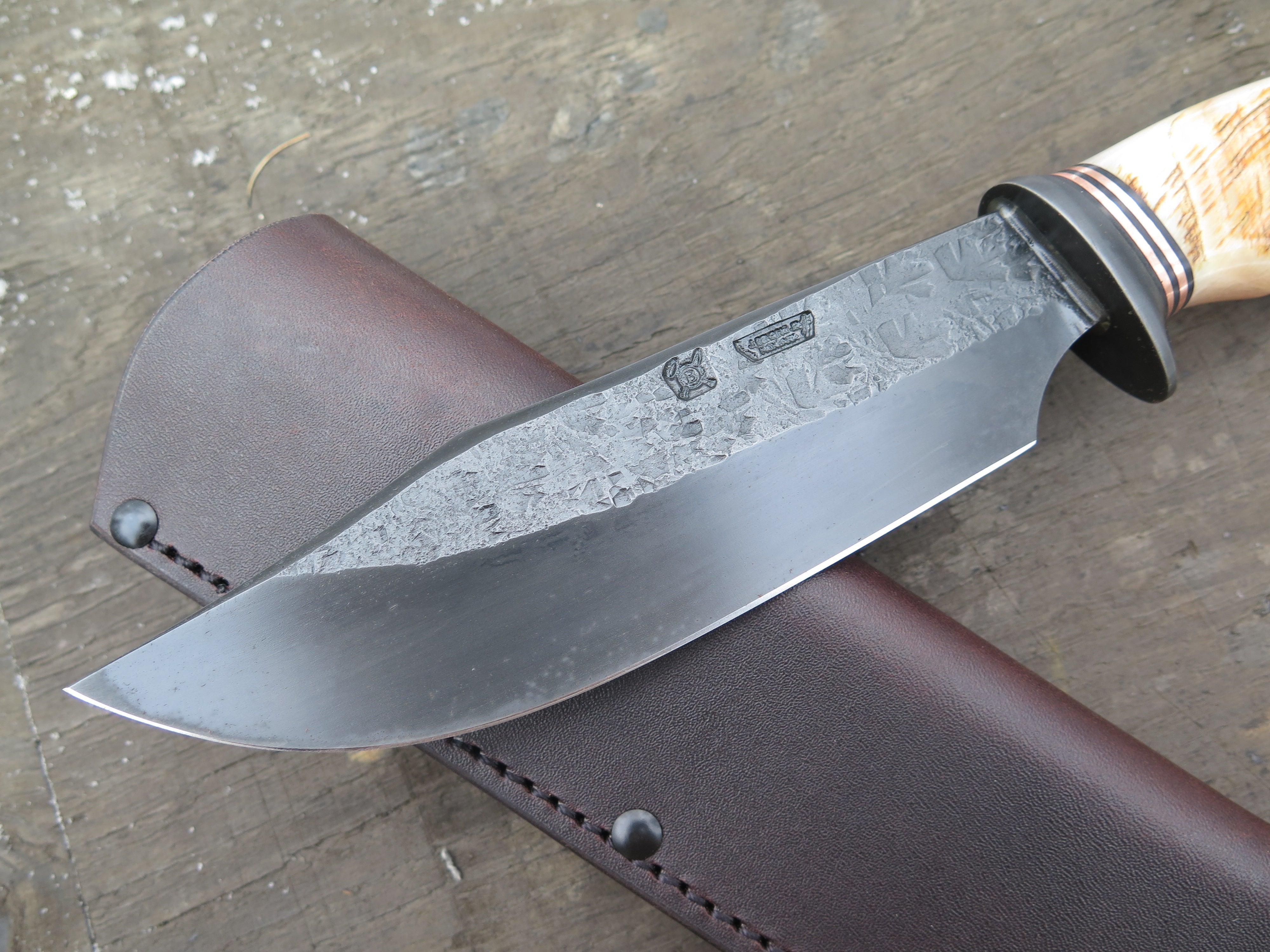 This new Bushmaster from Behring Made© is hand forged from 1/4" thick high carbon 01 tool steel and it measures 6 1/2" from tip to guard with a razor sharp hollow grind, hammermarks and a forced patina blued finish. The blued steel guard is soldered in place above black fiber and copper spacers as well as a premium Dall's sheep horn handle that we have pinned through the tang with copper. The overall length measures 11 3/8" and it also comes in a classic belt pouch sheath.