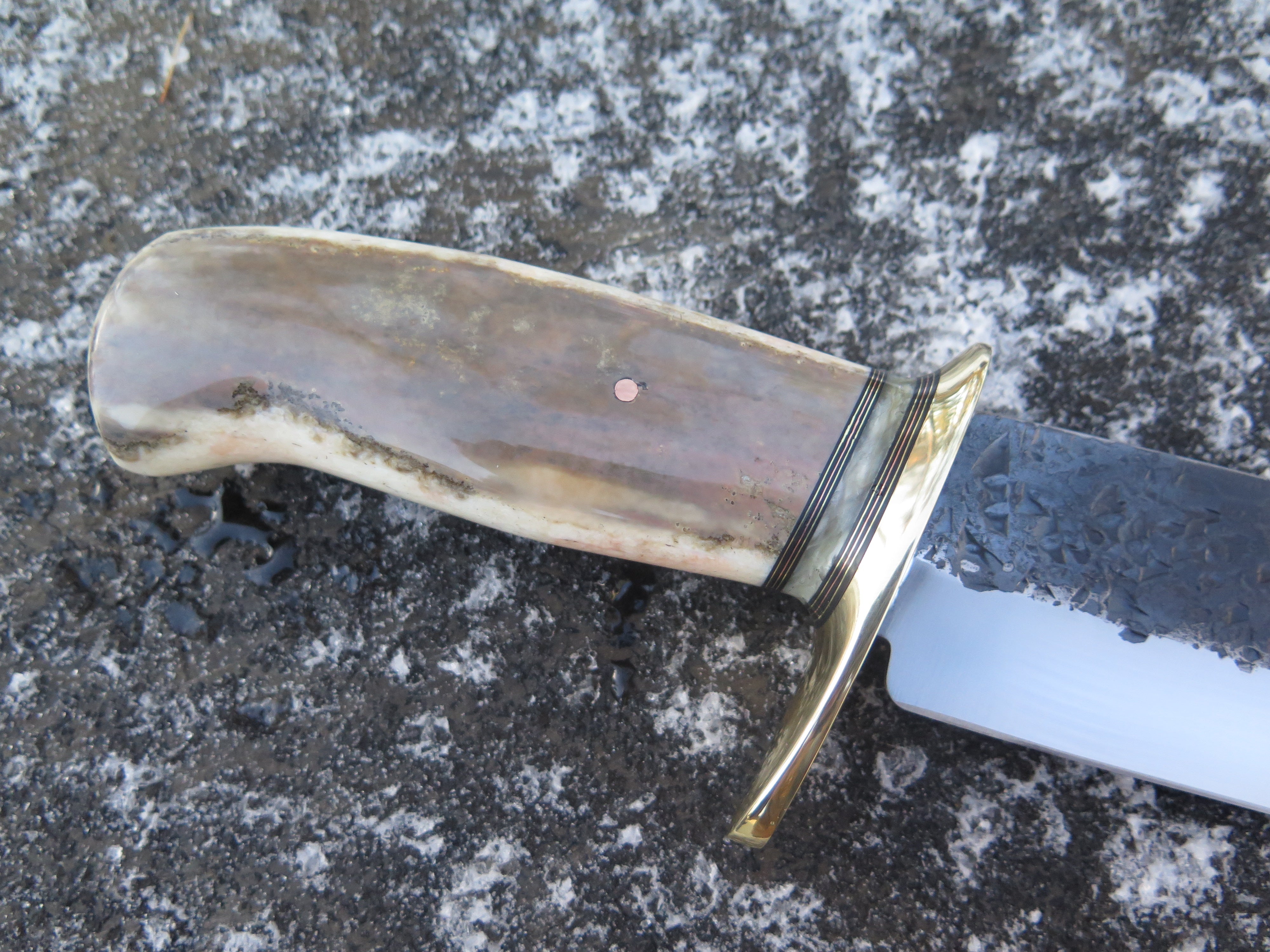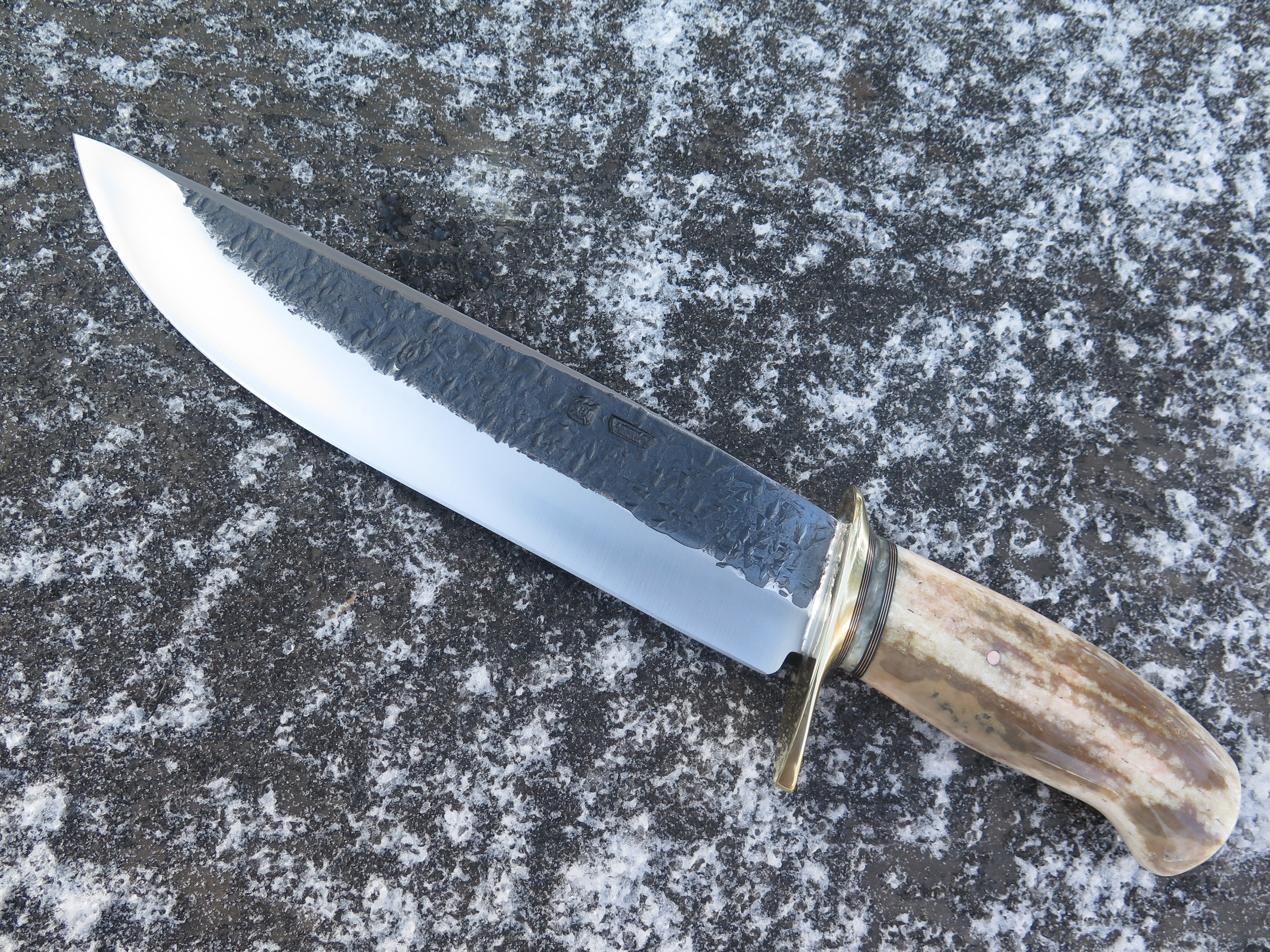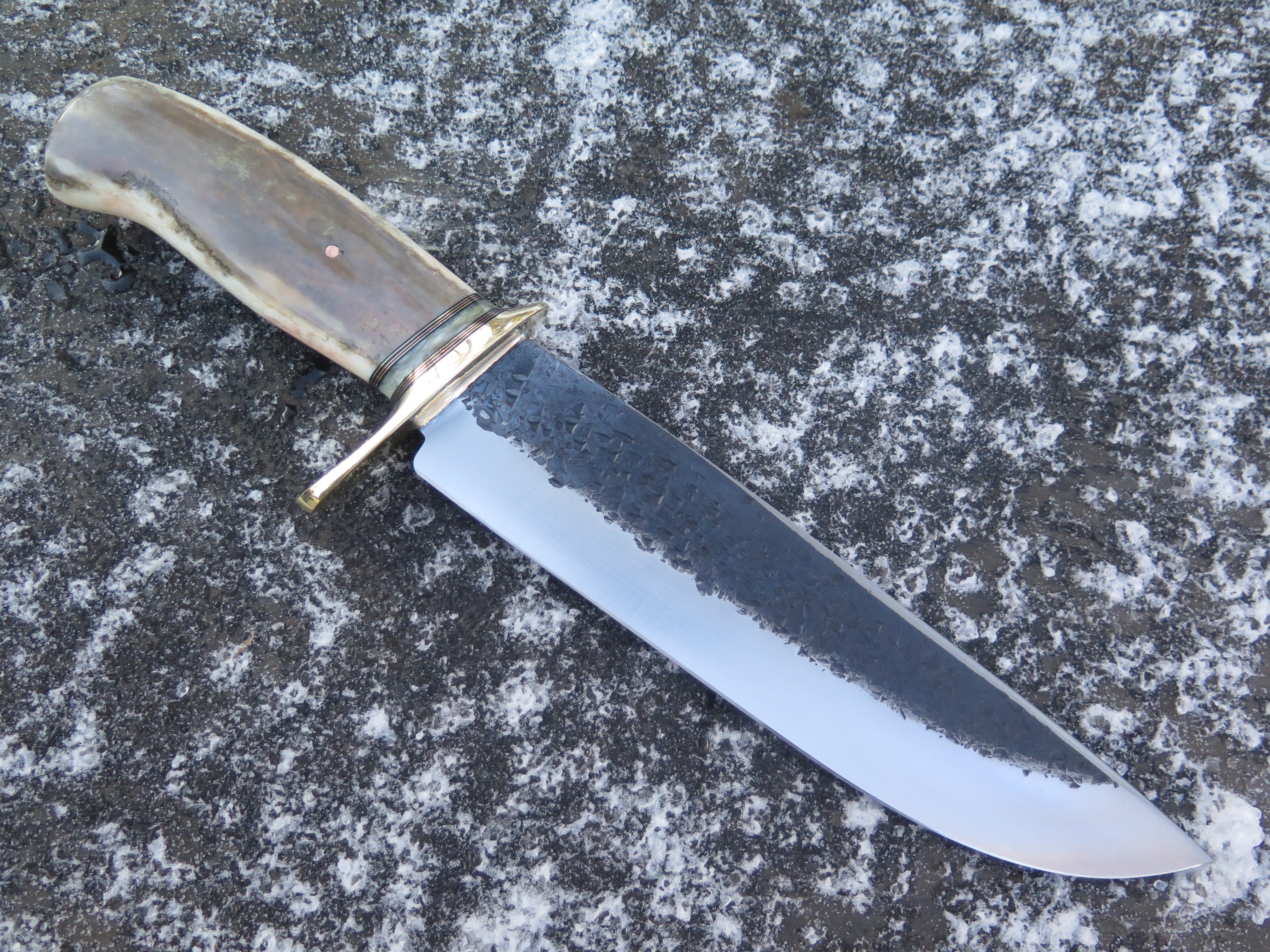 This new Drop Point Camp Knife from Behring Made© is hand forged from 1/4" thick high carbon 01 tool steel and it measures 10" from tip to guard with a razor sharp hollow grind and our hammermark finish. The brass guard is soldered in place above black fiber, copper, brass and musk ox boss spacers in addition to a premium fossil walrus ivory handle that's pinned through the tang with copper. Overall length measures 15" and it comes in a custom sheath from Warlander Leather. *CONTACT TO ORDER