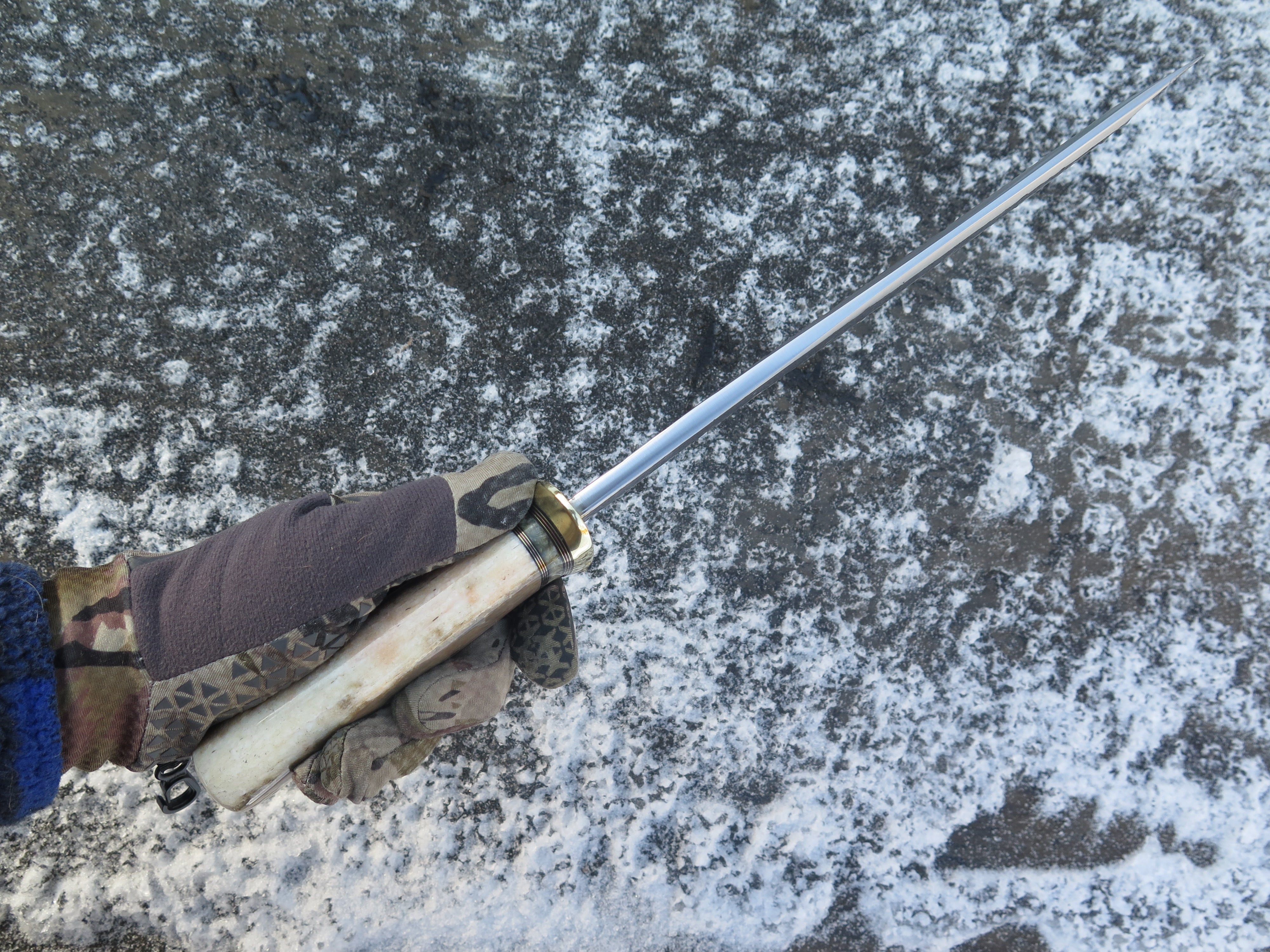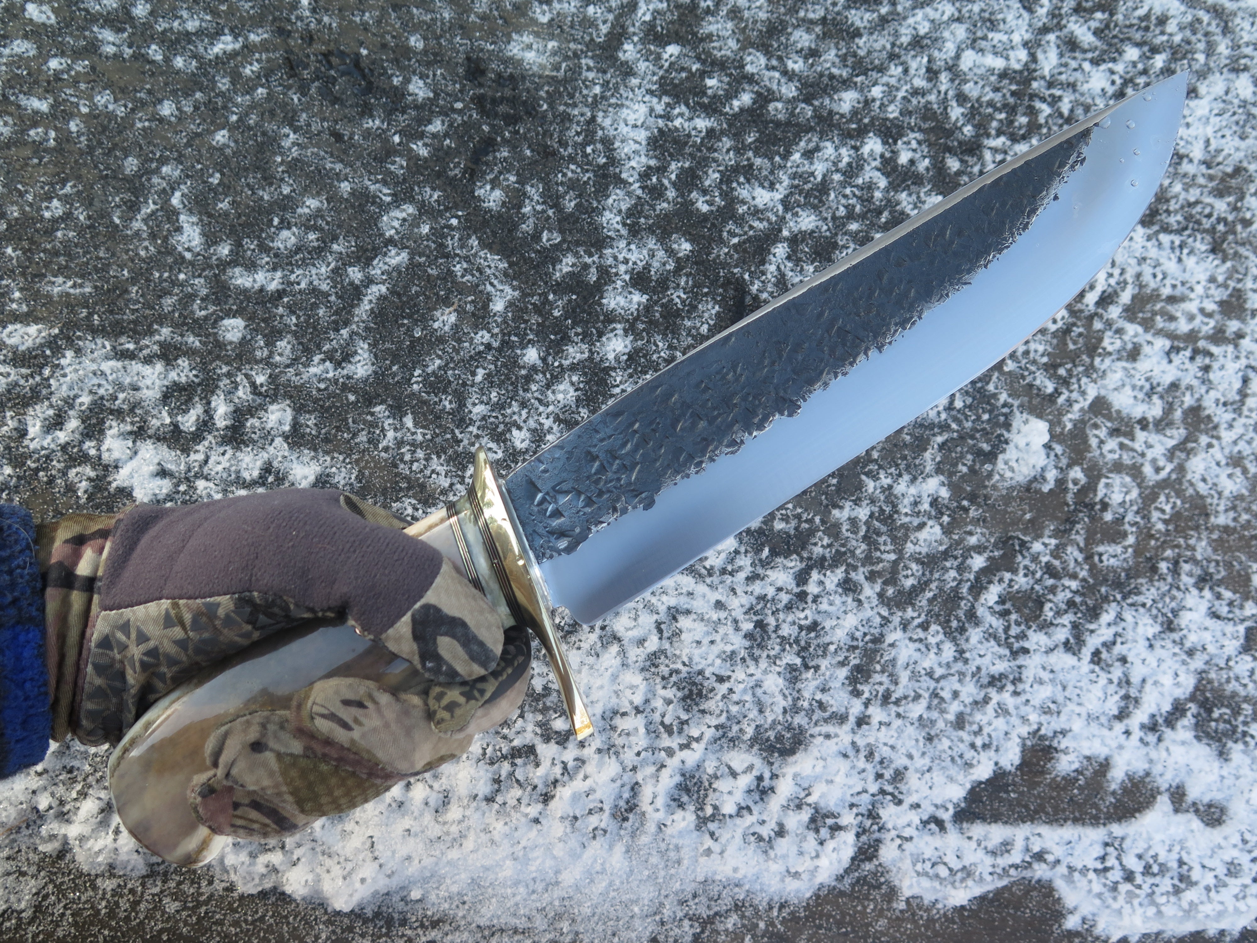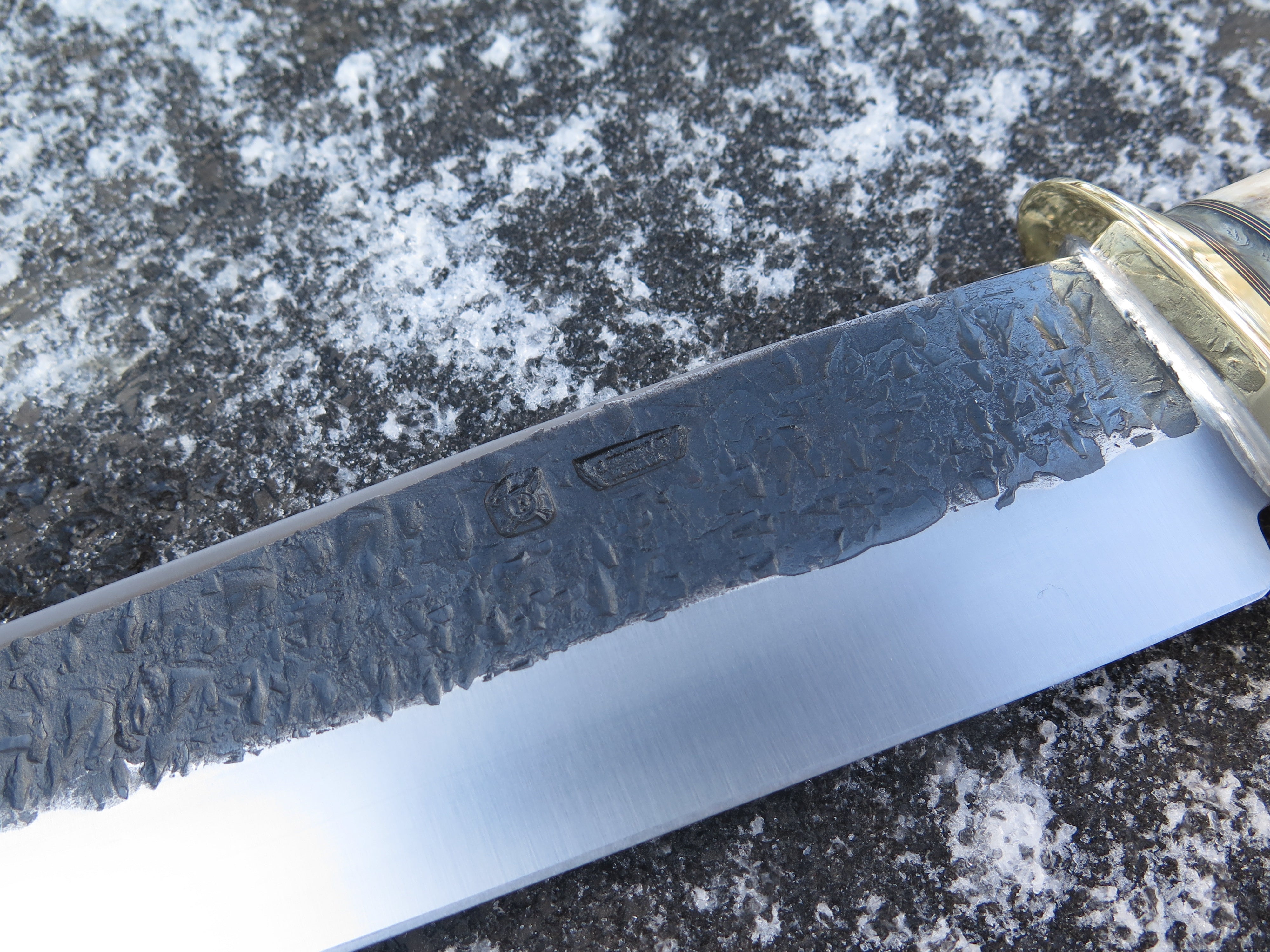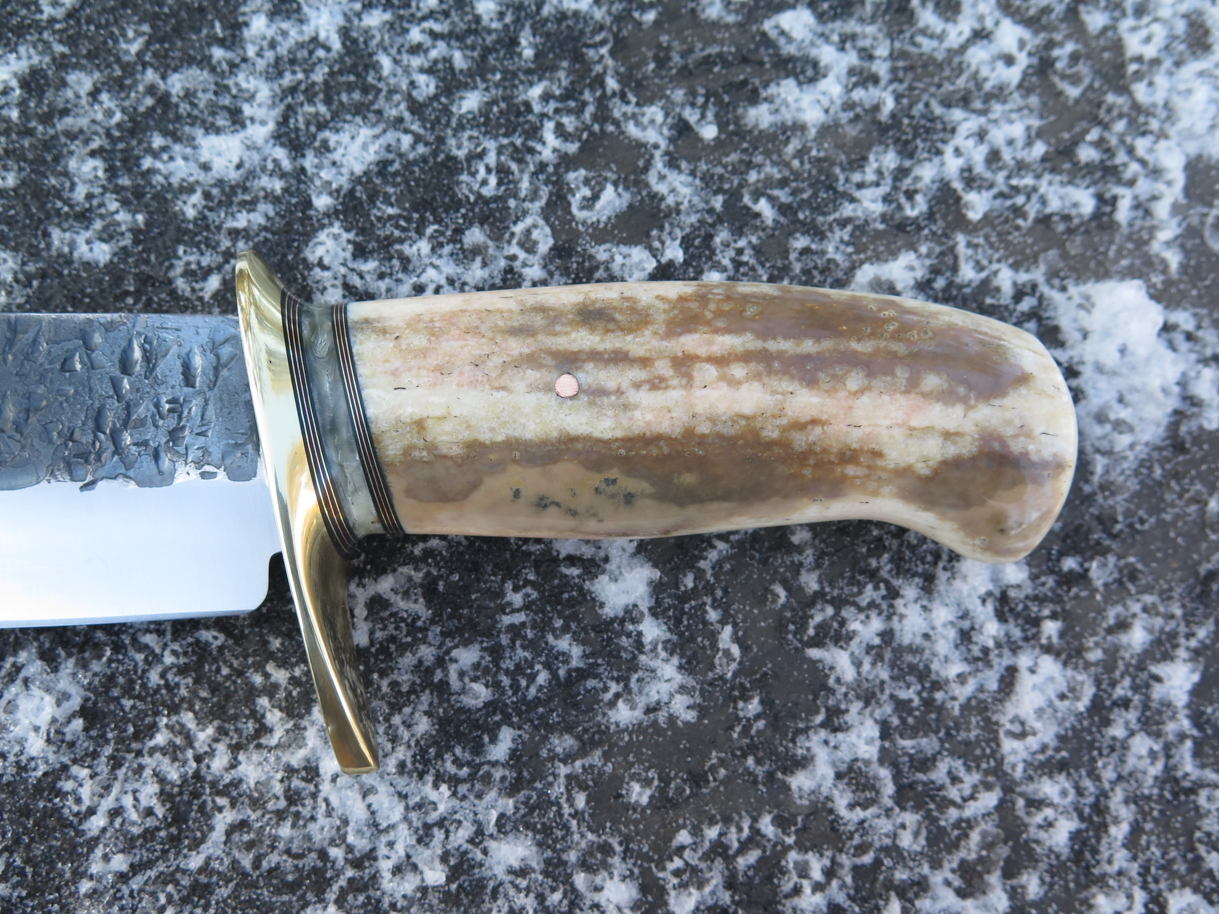 This new Drop Point Camp Knife from Behring Made© is hand forged from 1/4" thick high carbon 01 tool steel and it measures 10" from tip to guard with a razor sharp hollow grind and our hammermark finish. The brass guard is soldered in place above black fiber, copper, brass and musk ox boss spacers in addition to a premium fossil walrus ivory handle that's pinned through the tang with copper. Overall length measures 15" and it comes in a custom sheath from Warlander Leather. *CONTACT TO ORDER