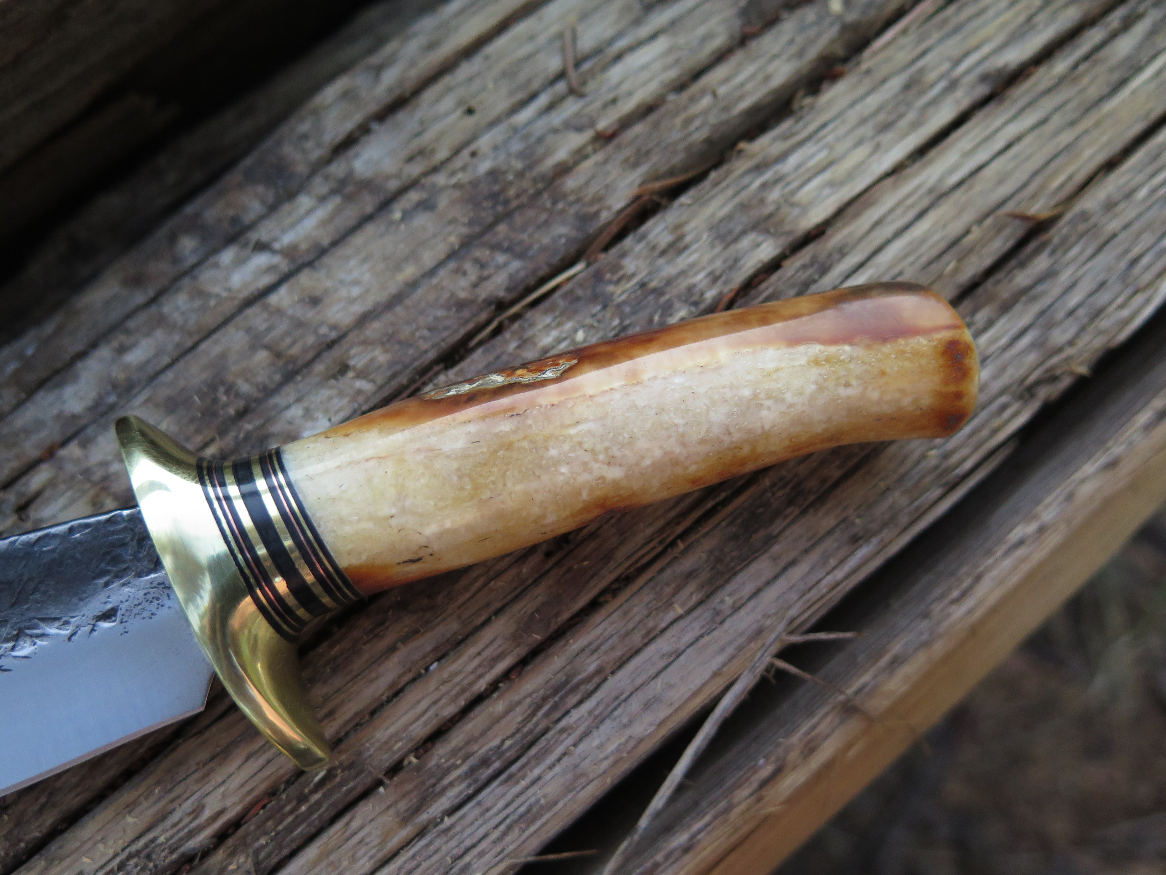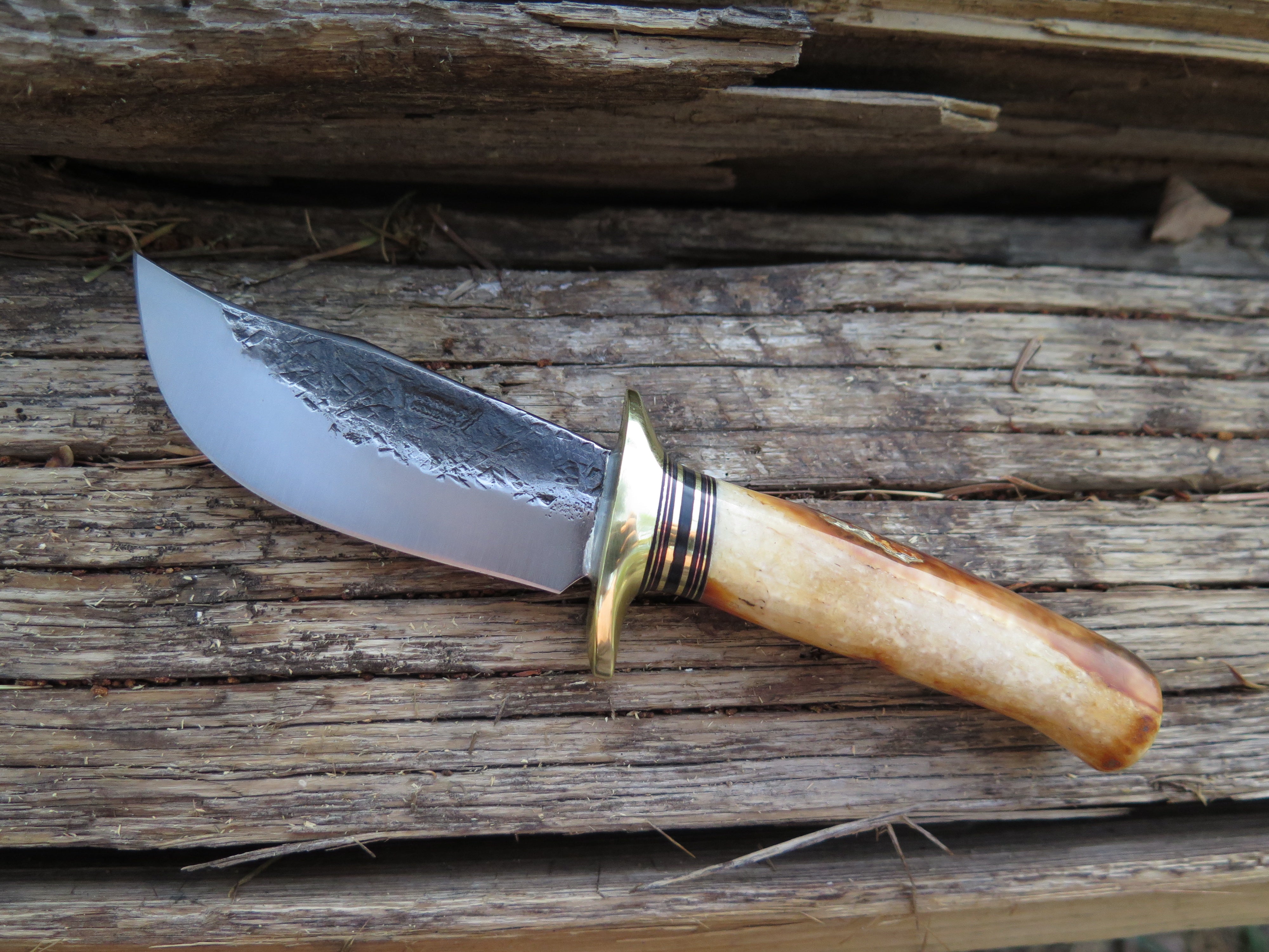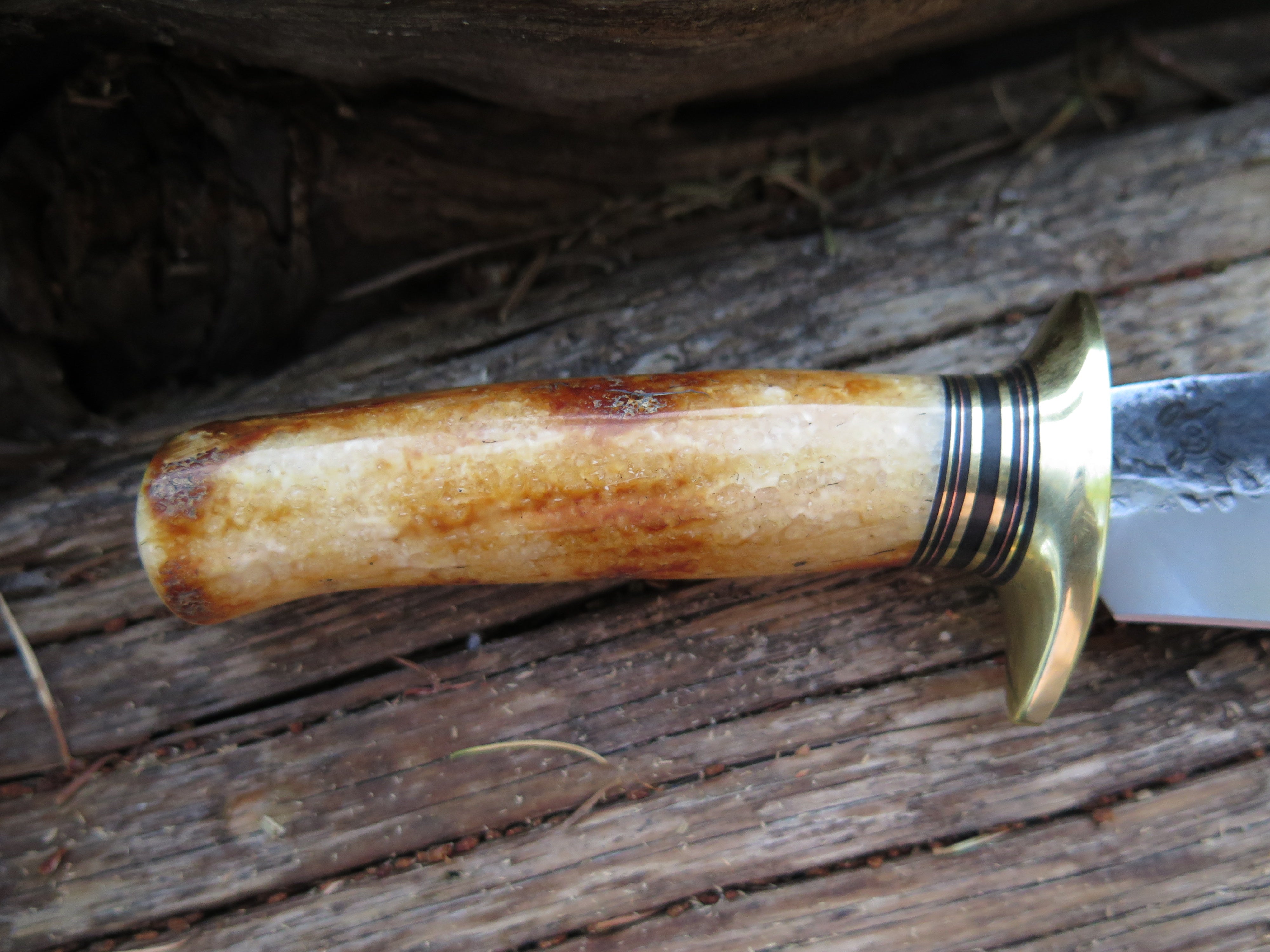 This incredible new offering from Behring Made© is the Little Bowie- hand forged from 1/8" thick high carbon 01 tool steel it measures 3 1/4" from tip to guard with a razor sharp hollow grind and our hammermark finish. The forged brass s-guard is soldered in place above black fiber, brass, and copper spacers in addition to a beautiful handle of premium fossil walrus ivory. The overall length measures 6 5/8" and it will come in a custom sheath from Warlander Leather.