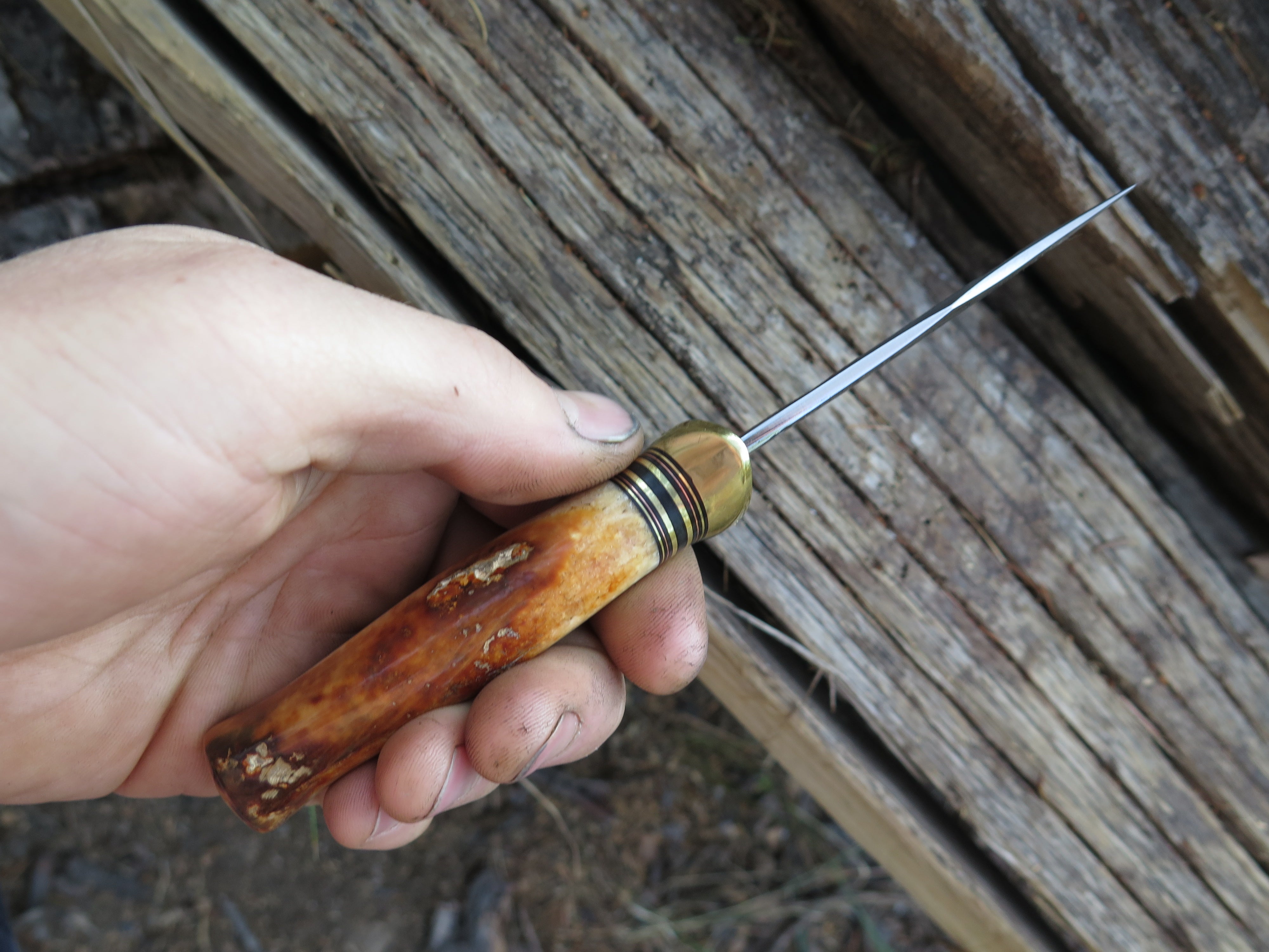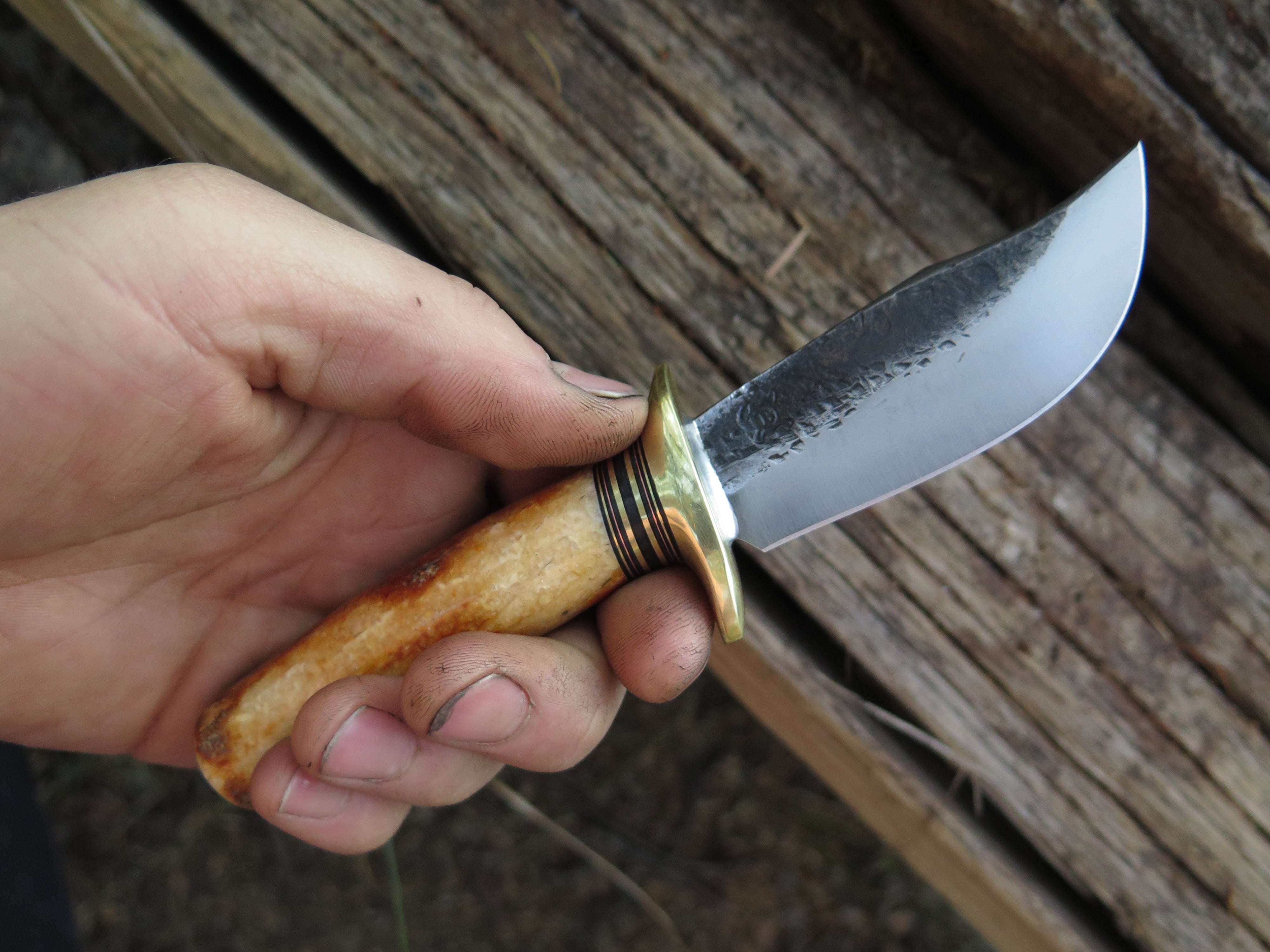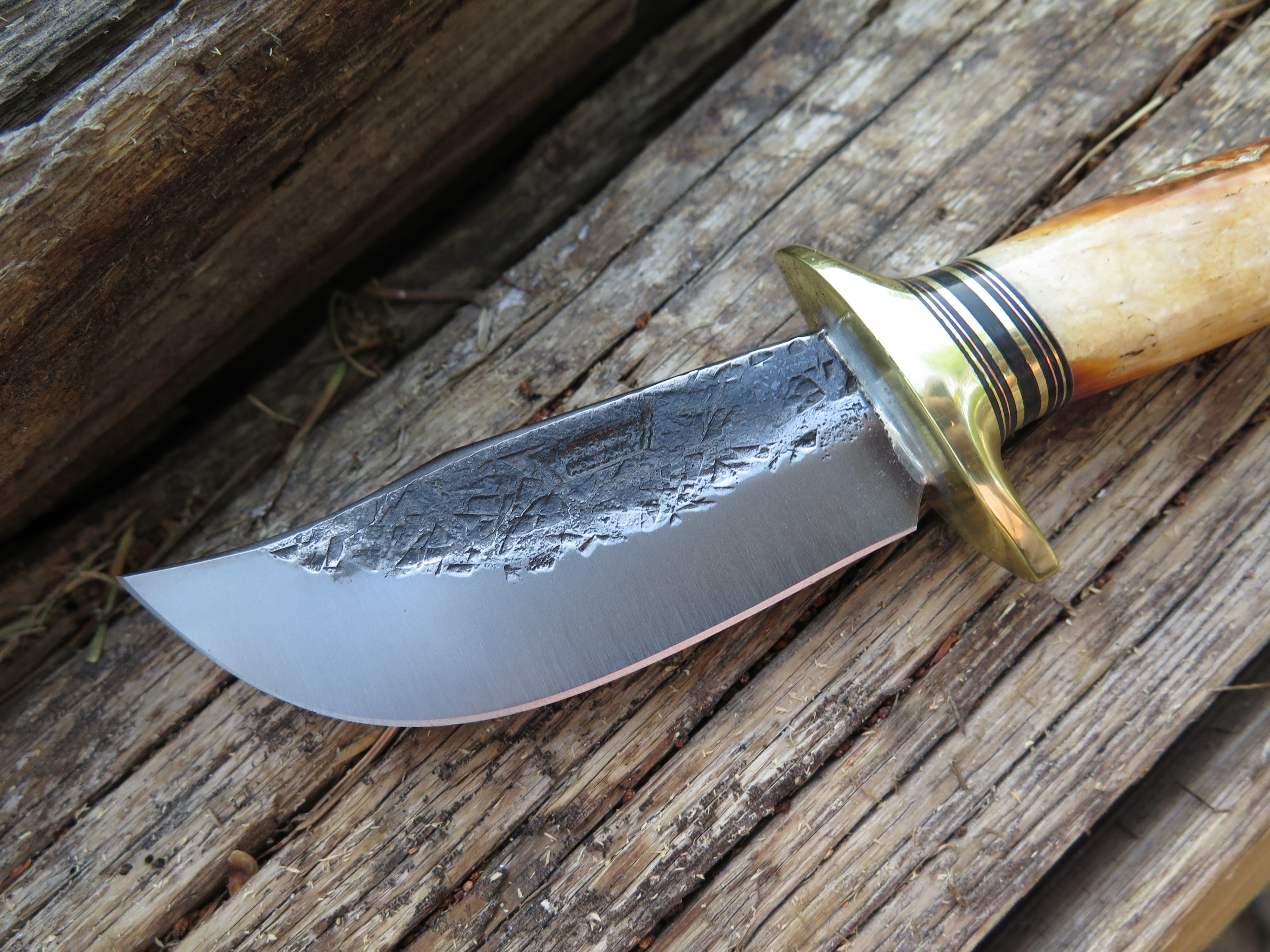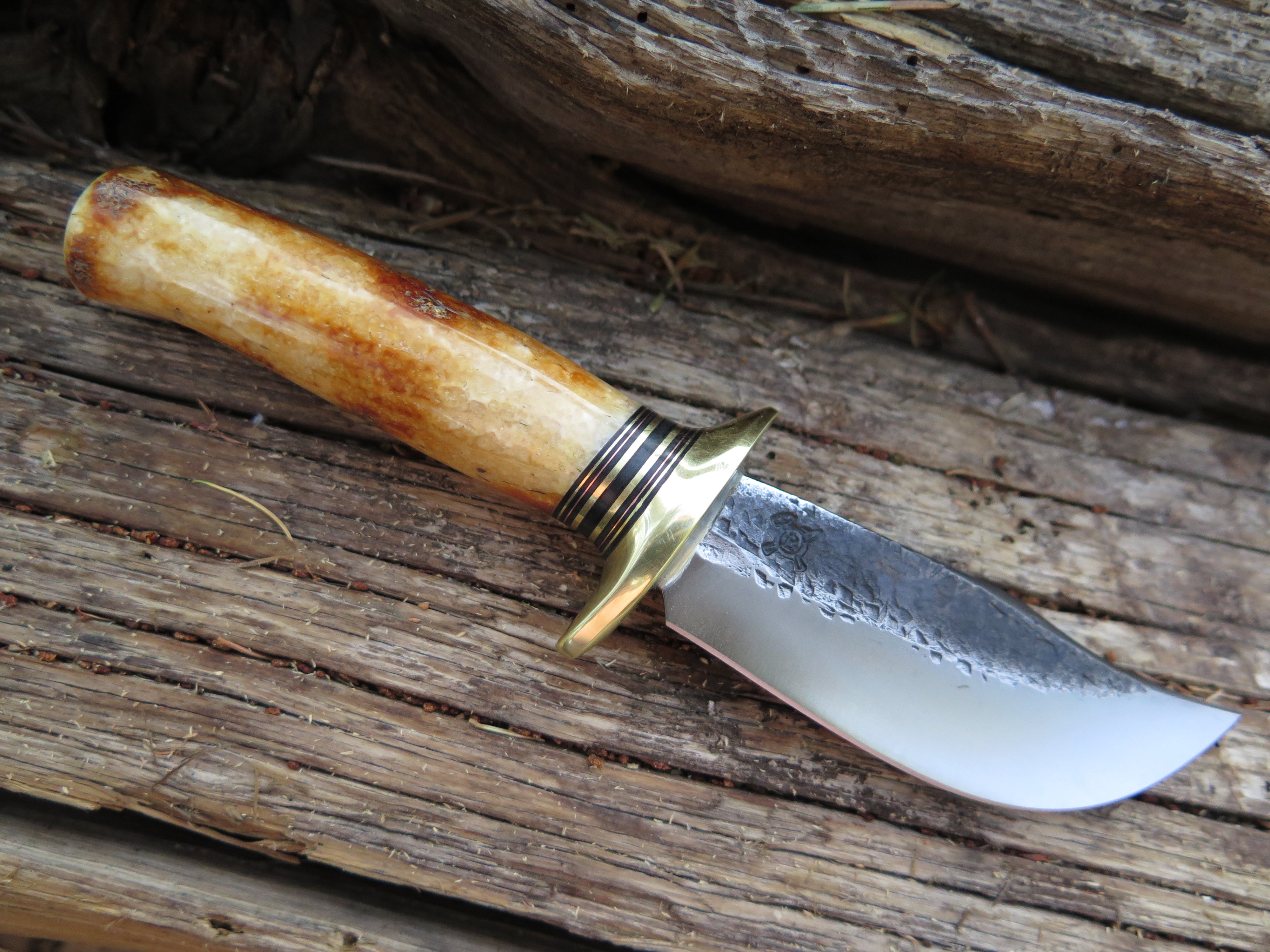 This incredible new offering from Behring Made© is the Little Bowie- hand forged from 1/8" thick high carbon 01 tool steel it measures 3 1/4" from tip to guard with a razor sharp hollow grind and our hammermark finish. The forged brass s-guard is soldered in place above black fiber, brass, and copper spacers in addition to a beautiful handle of premium fossil walrus ivory. The overall length measures 6 5/8" and it will come in a custom sheath from Warlander Leather.
