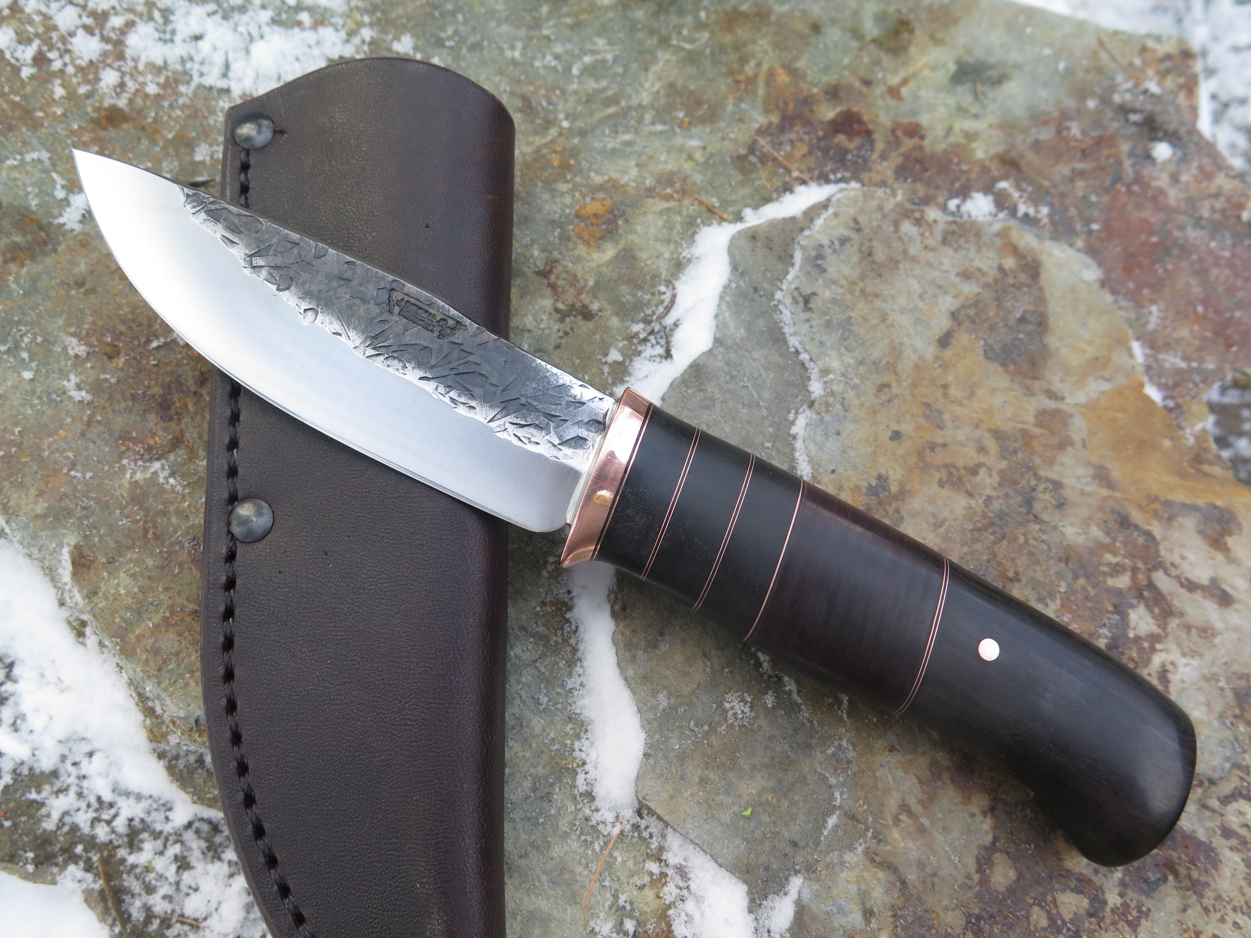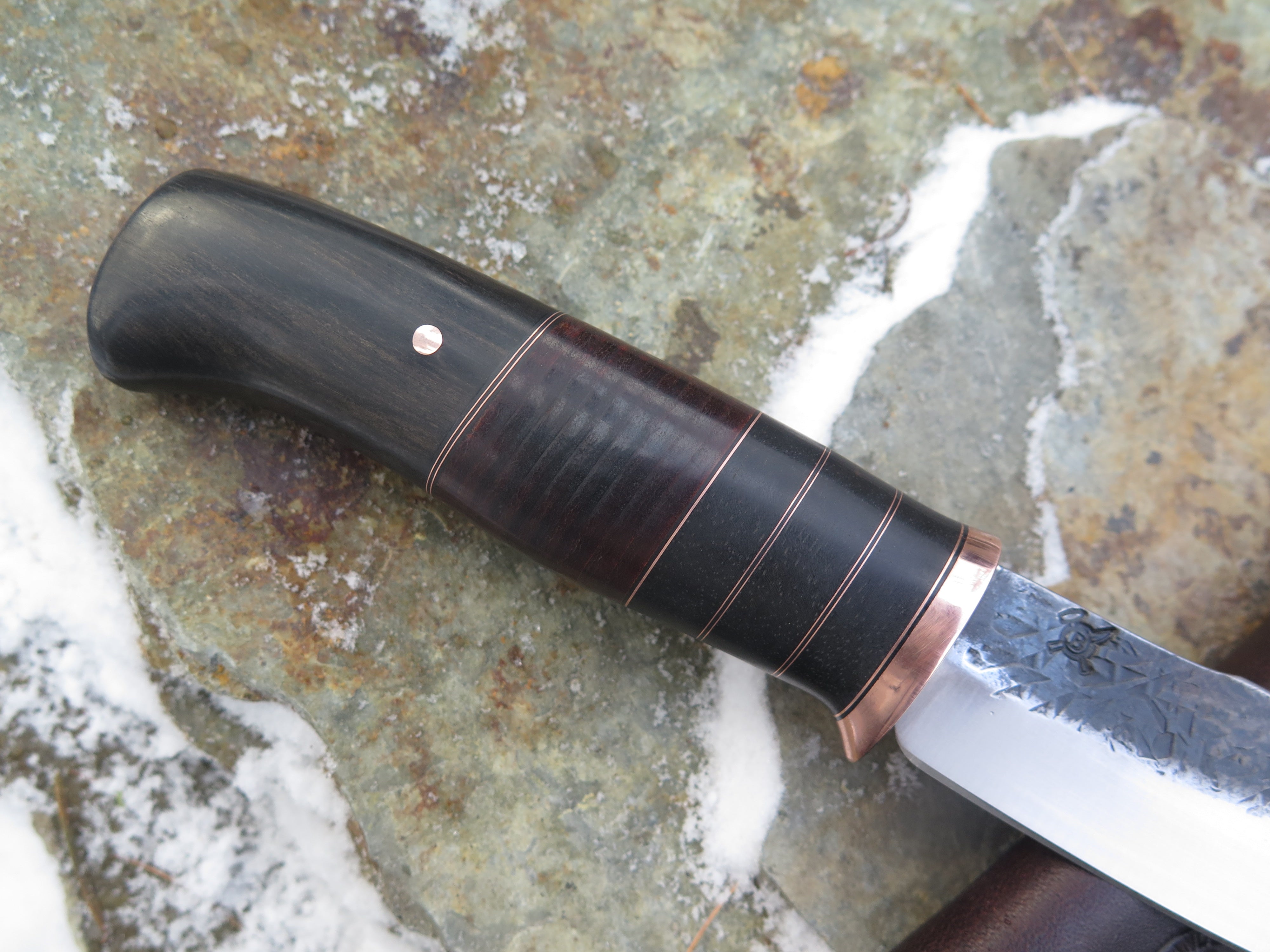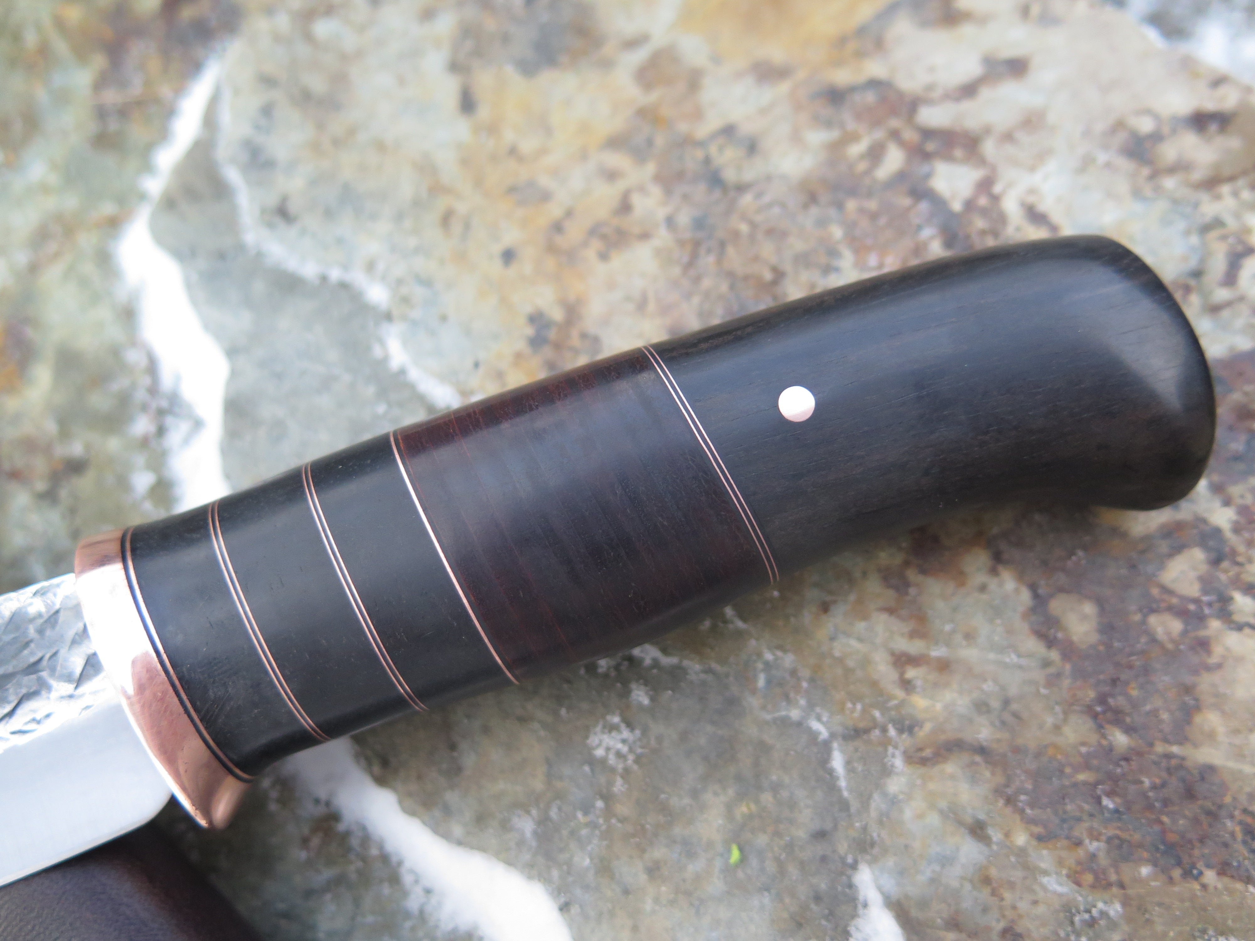 This bad ass new modified drop point from Behring Made© is hand forged from 1/8" thick high carbon 01 tool steel and it measures 4 1/4" from tip to guard with a razor sharp hollow grind and our hammermark finish. The copper guard is soldered in place above black fiber, copper, ebony and horsehide leather spacers as well as an ebony butt that is pinned through the tang with copper. The overall length measures 8 3/4" and it comes in a classic leather belt pouch sheath.