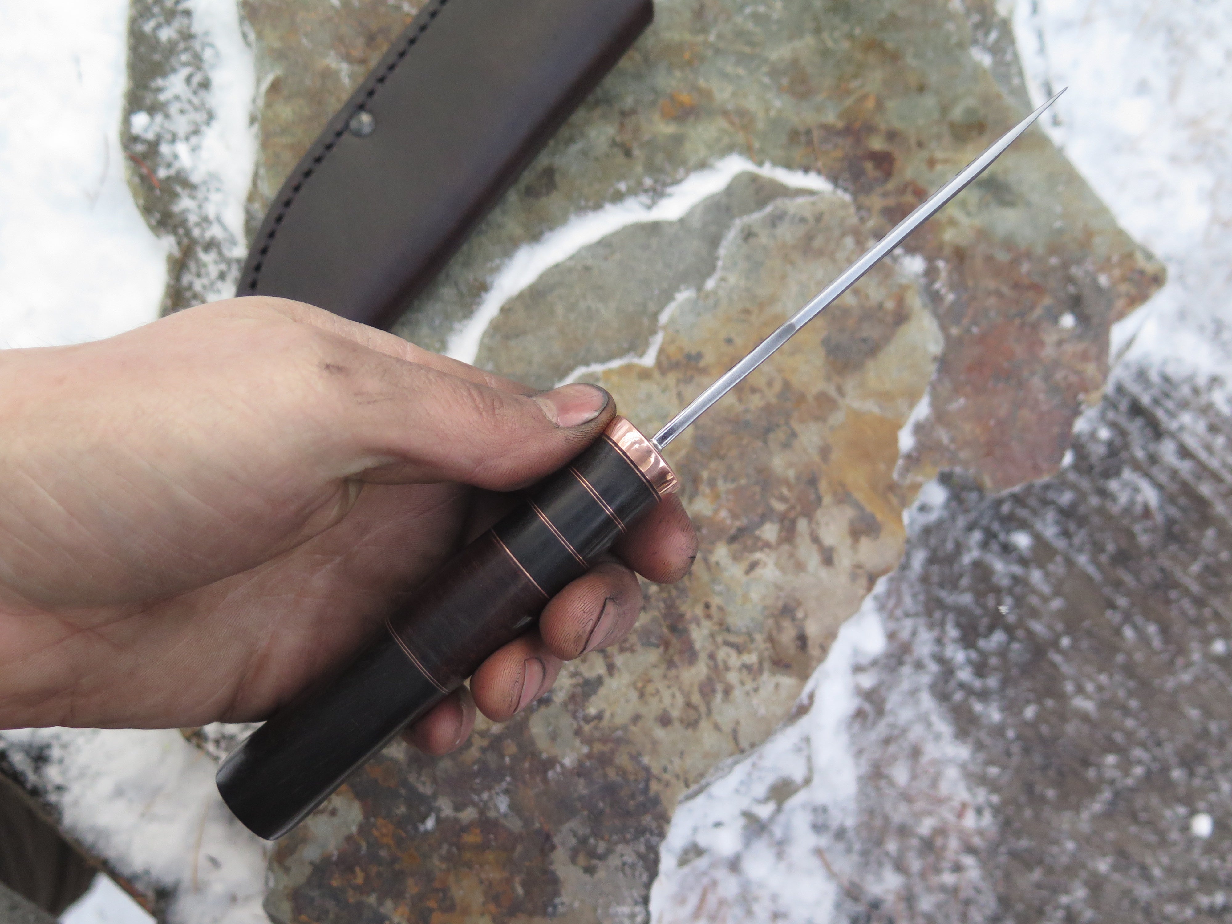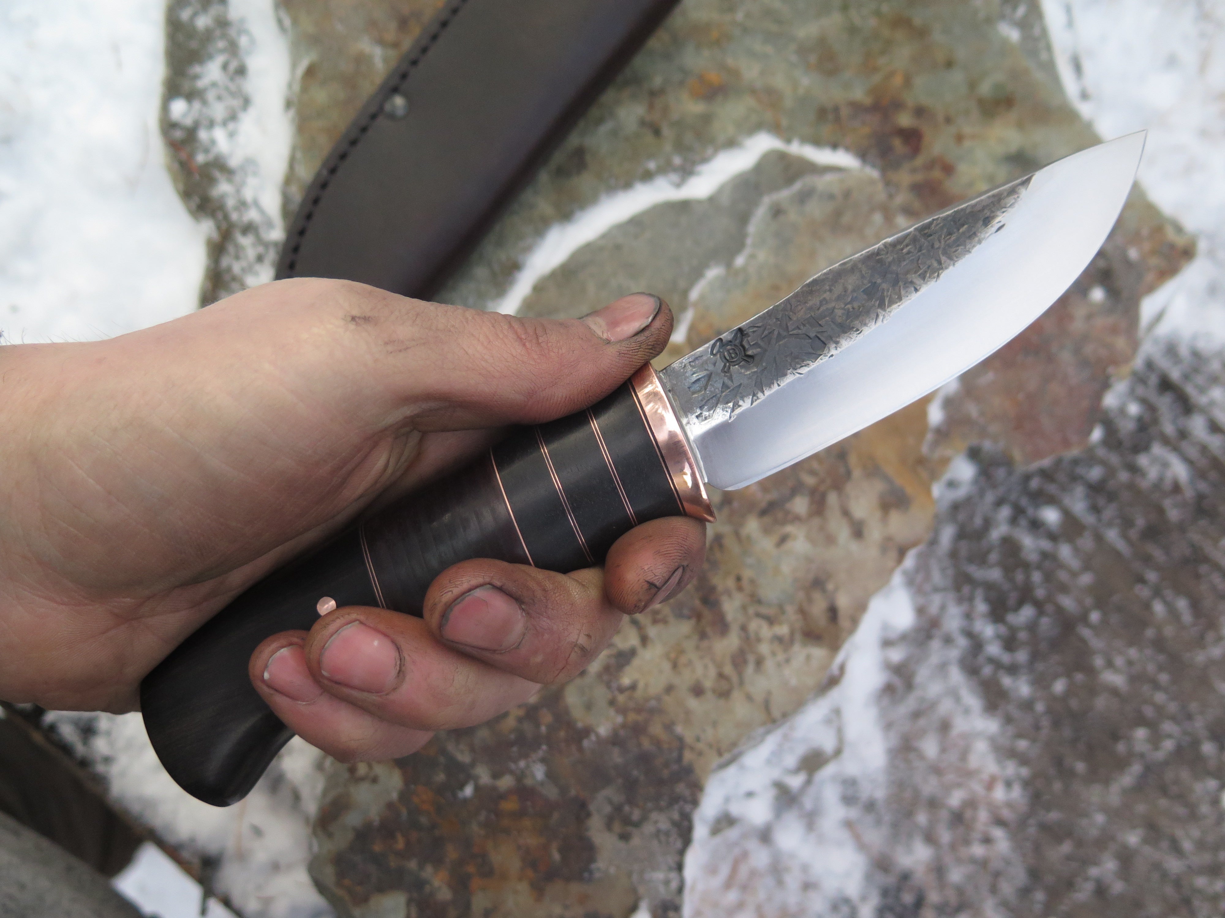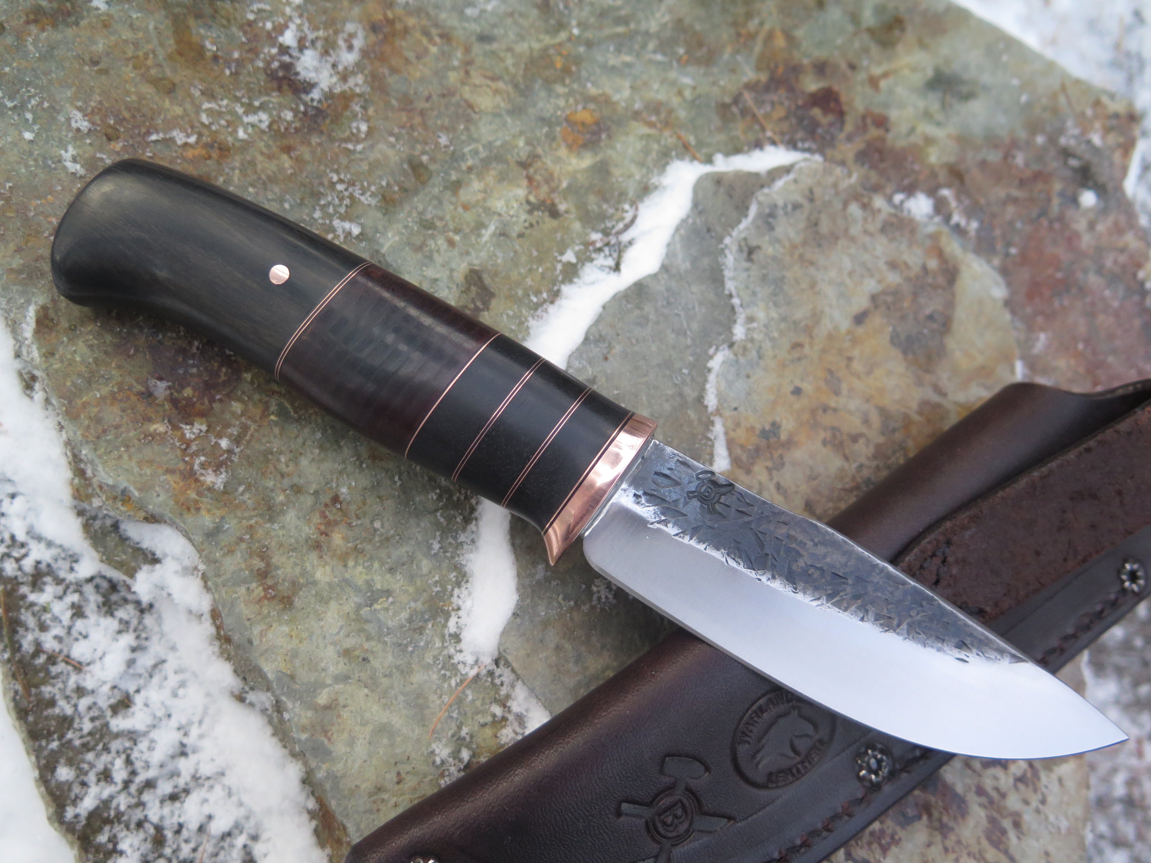 This bad ass new modified drop point from Behring Made© is hand forged from 1/8" thick high carbon 01 tool steel and it measures 4 1/4" from tip to guard with a razor sharp hollow grind and our hammermark finish. The copper guard is soldered in place above black fiber, copper, ebony and horsehide leather spacers as well as an ebony butt that is pinned through the tang with copper. The overall length measures 8 3/4" and it comes in a classic leather belt pouch sheath.