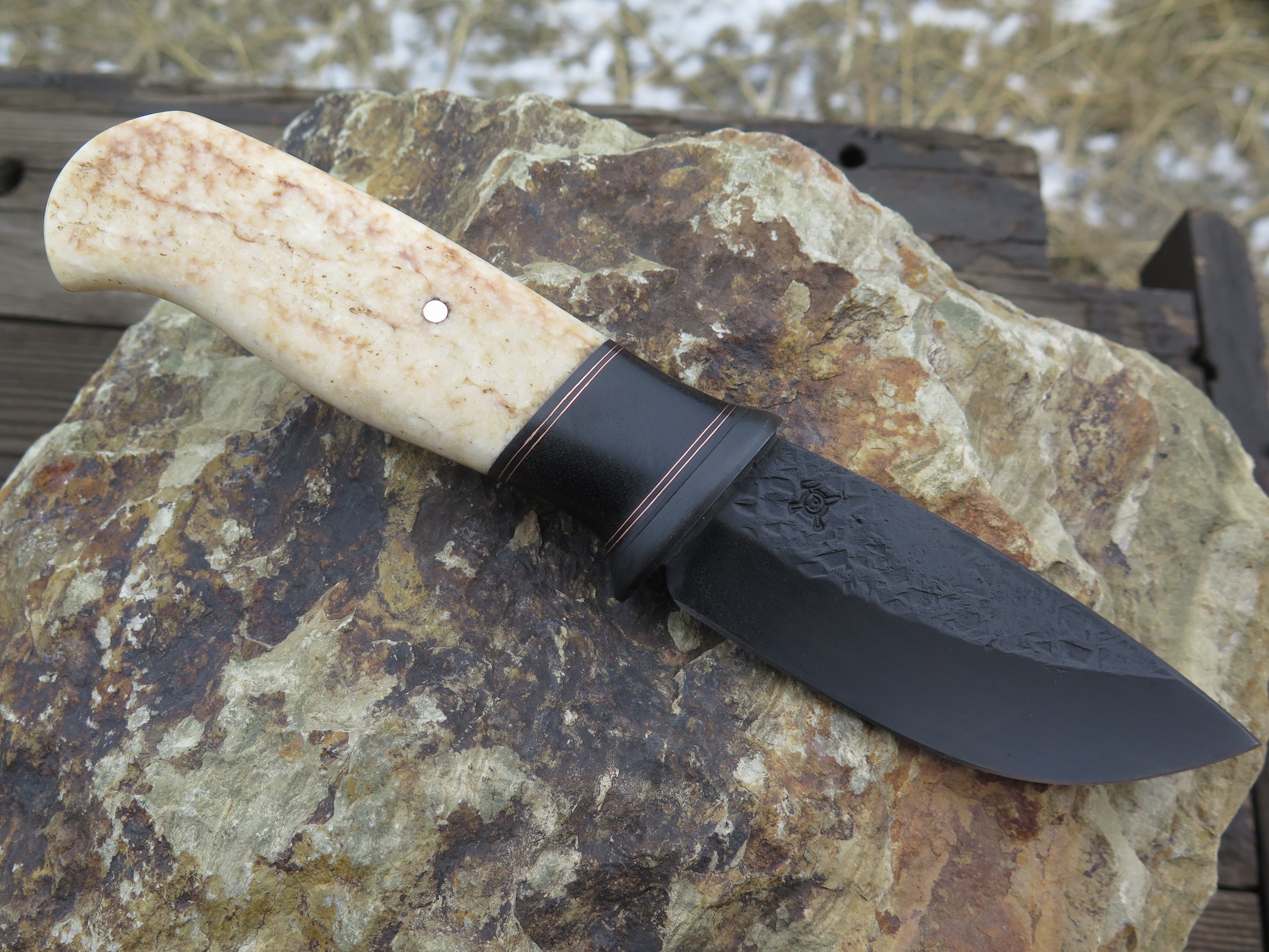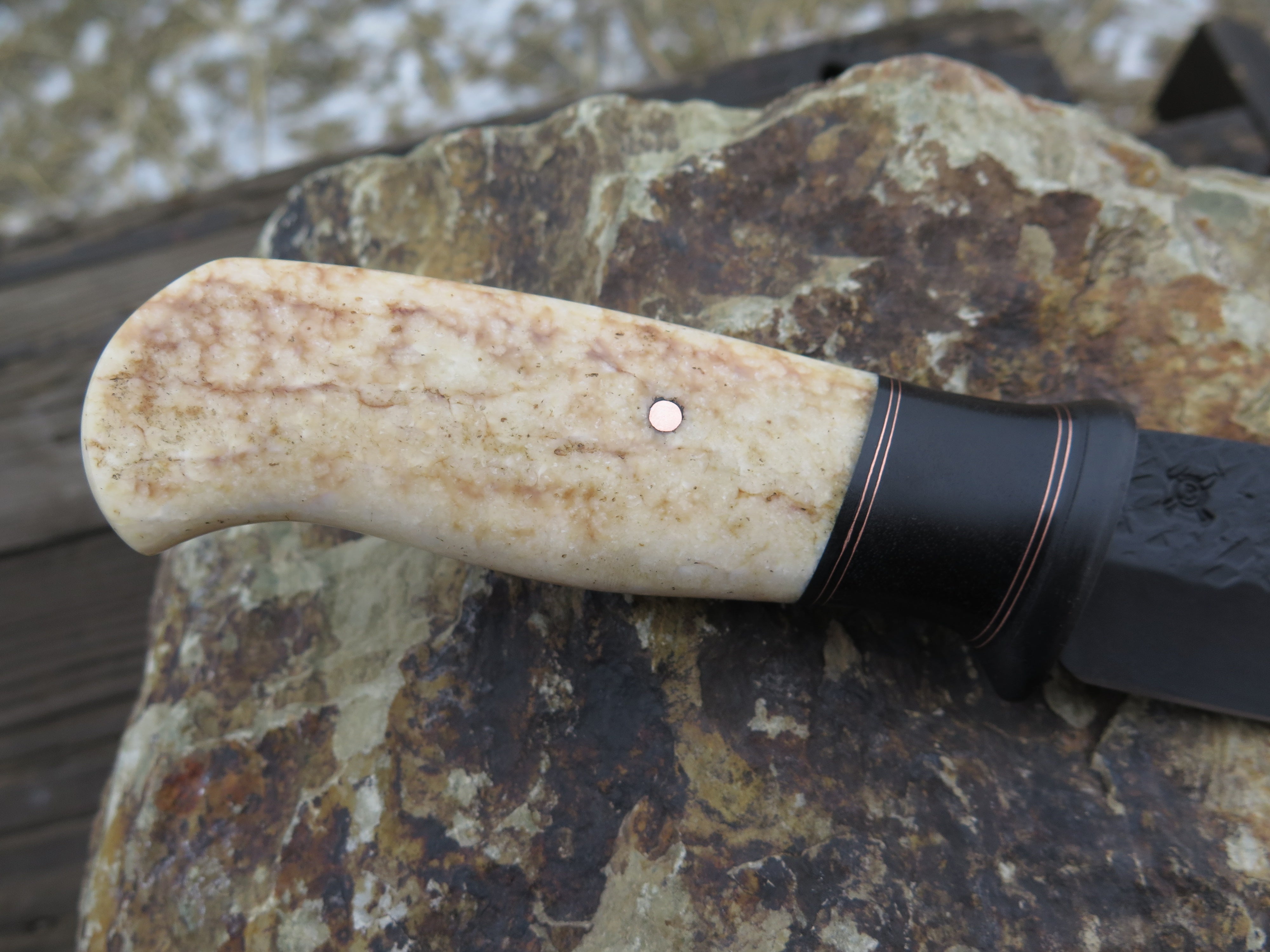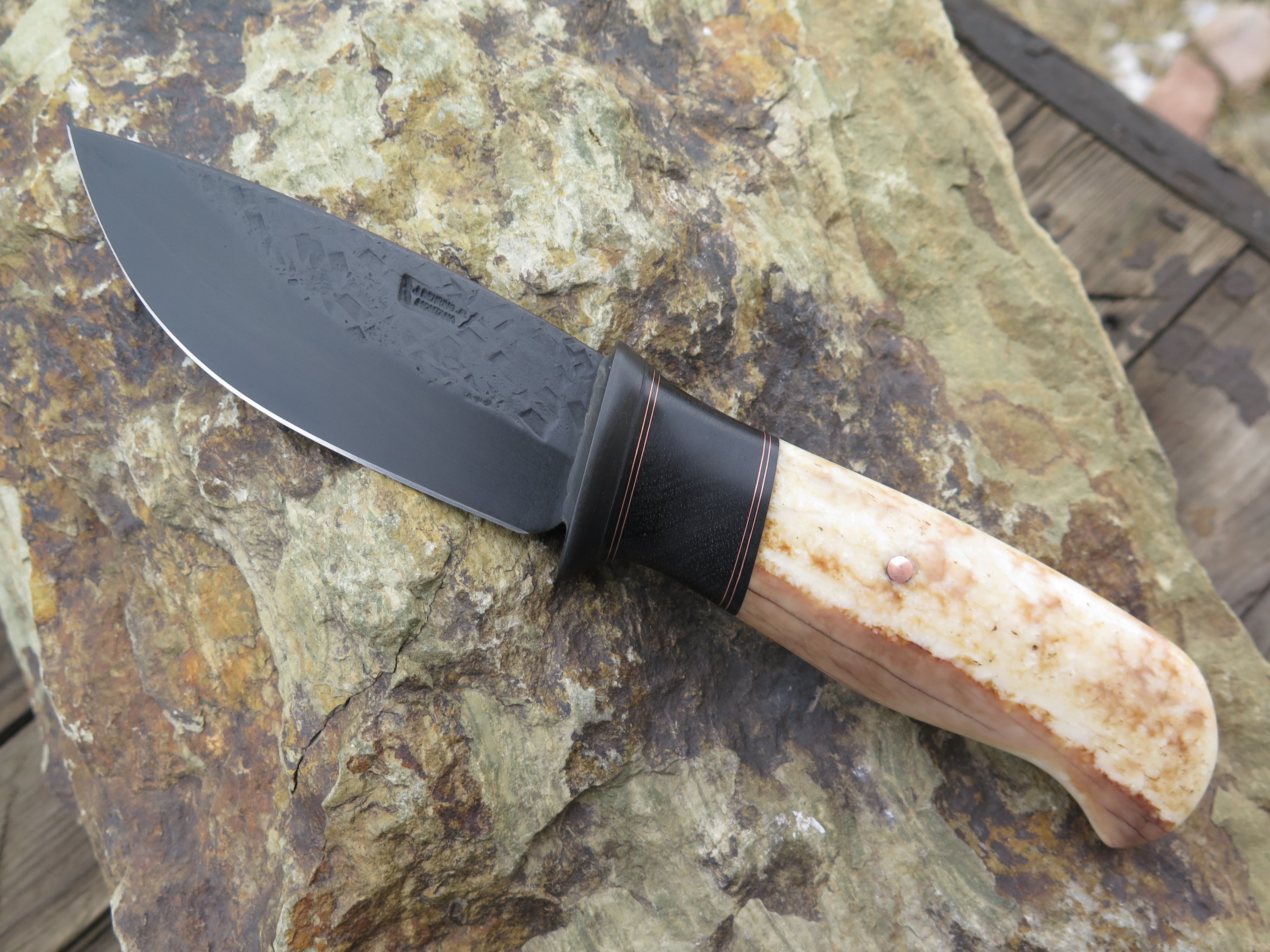 This beautiful new Drop Point from Behring Made© is hand forged from 1/8" thick high carbon 01 tool steel and it measures 4" from tip to guard with a razor sharp hollow grind, hammermarks and our forced patina blued finish. The blued steel guard is soldered in place above black fiber, copper and ebony wood spacers with a high contrasting premium fossil walrus ivory handle. The copper pin rungs through the tang and the overall length comes out to measure 8 1/4", plus this one comes in a custom pouch sheath from Warlander Leather.