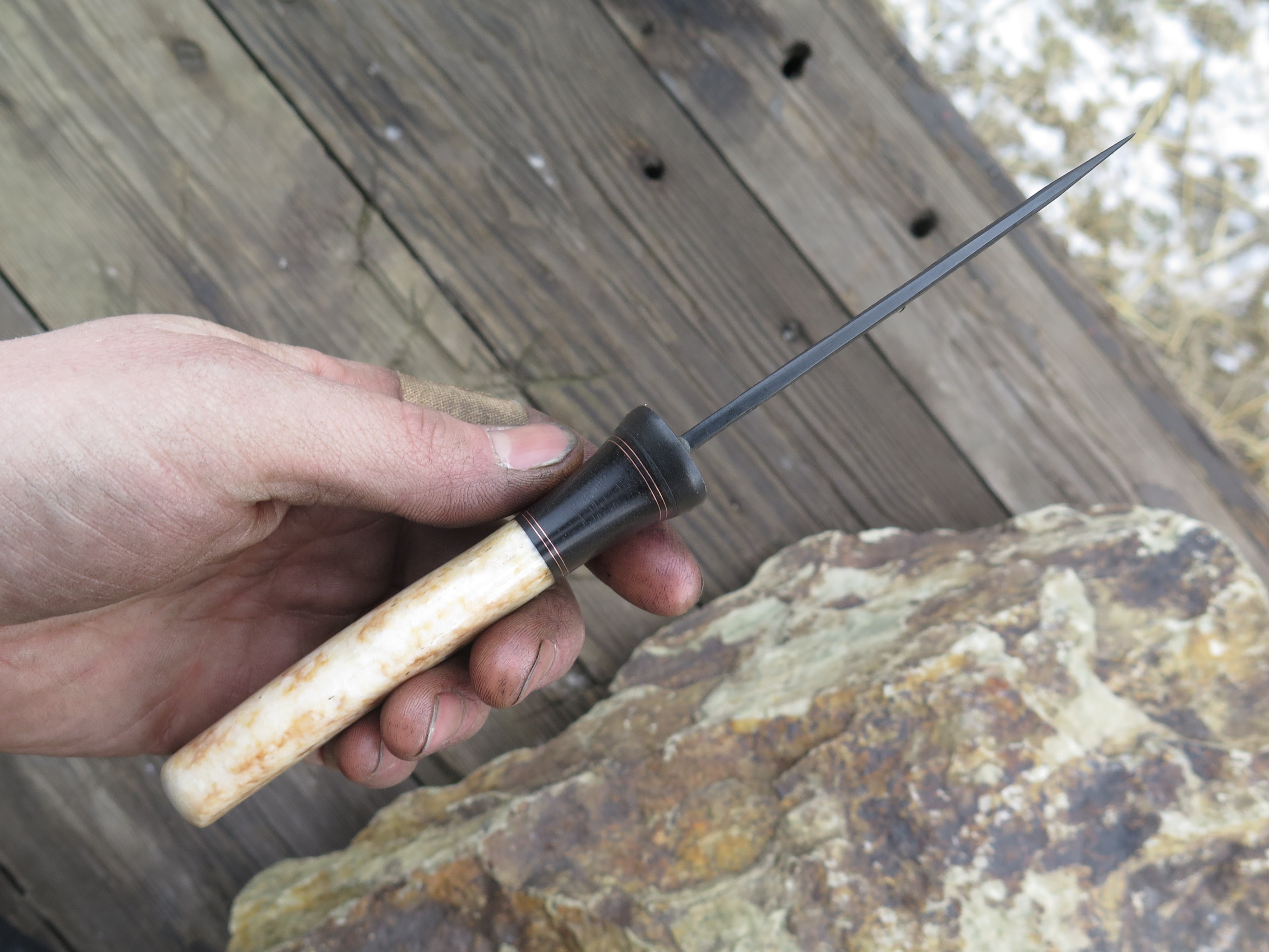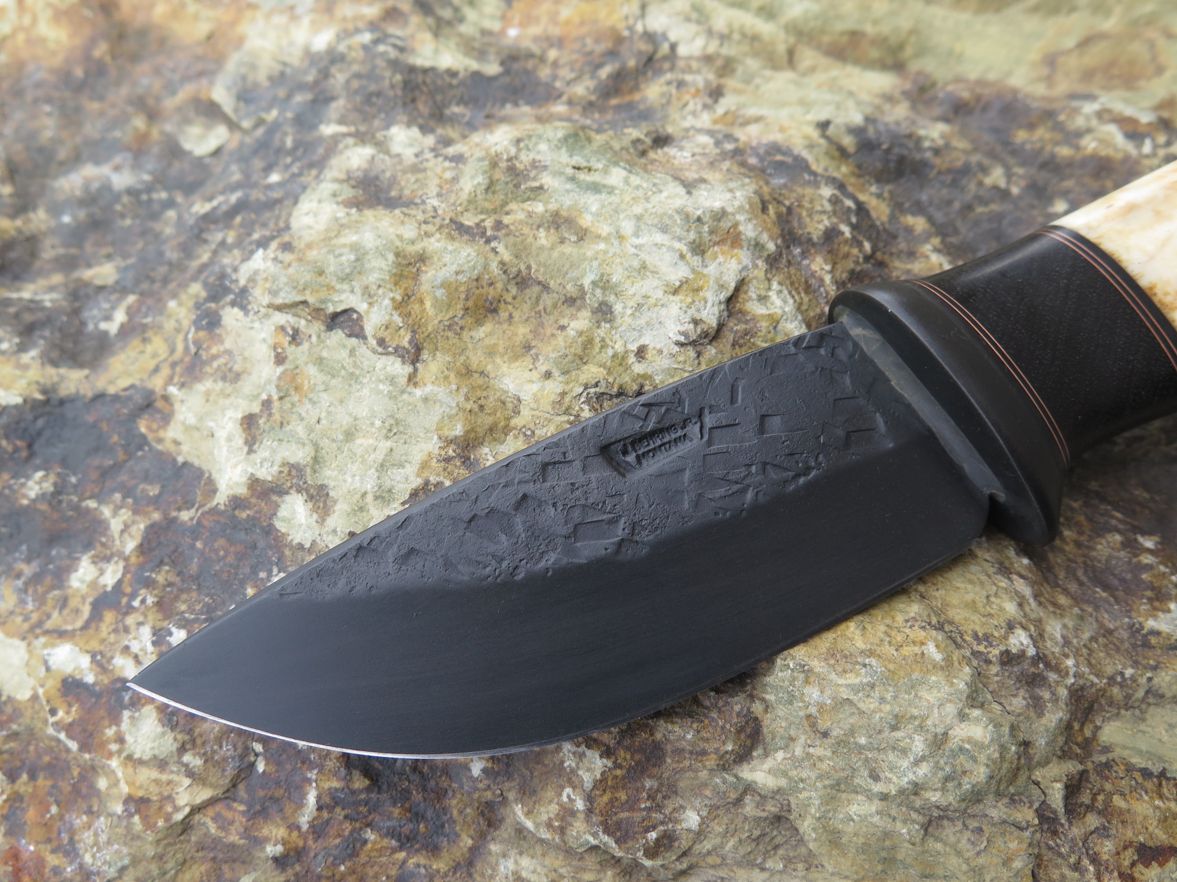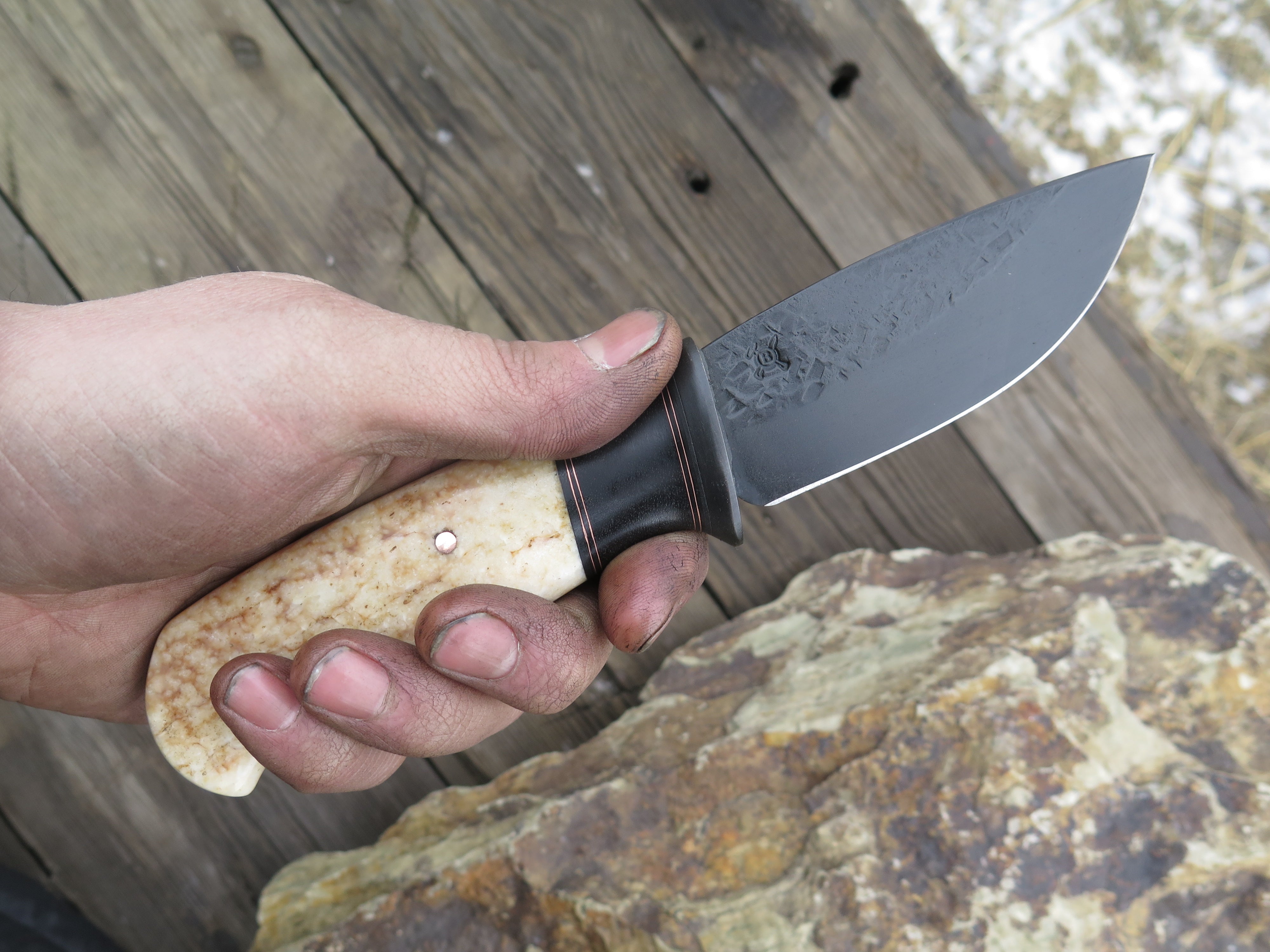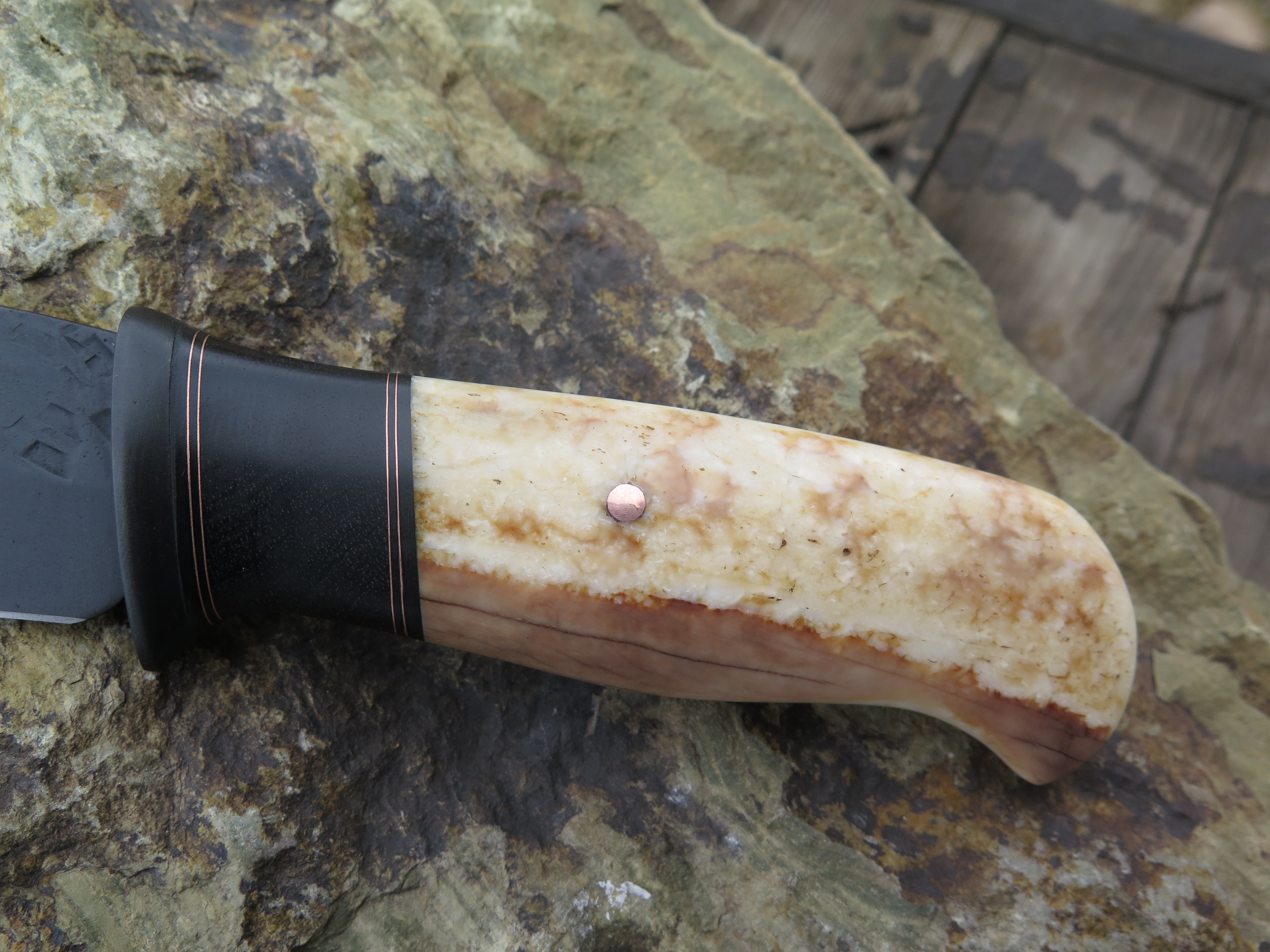 This beautiful new Drop Point from Behring Made© is hand forged from 1/8" thick high carbon 01 tool steel and it measures 4" from tip to guard with a razor sharp hollow grind, hammermarks and our forced patina blued finish. The blued steel guard is soldered in place above black fiber, copper and ebony wood spacers with a high contrasting premium fossil walrus ivory handle. The copper pin rungs through the tang and the overall length comes out to measure 8 1/4", plus this one comes in a custom pouch sheath from Warlander Leather.