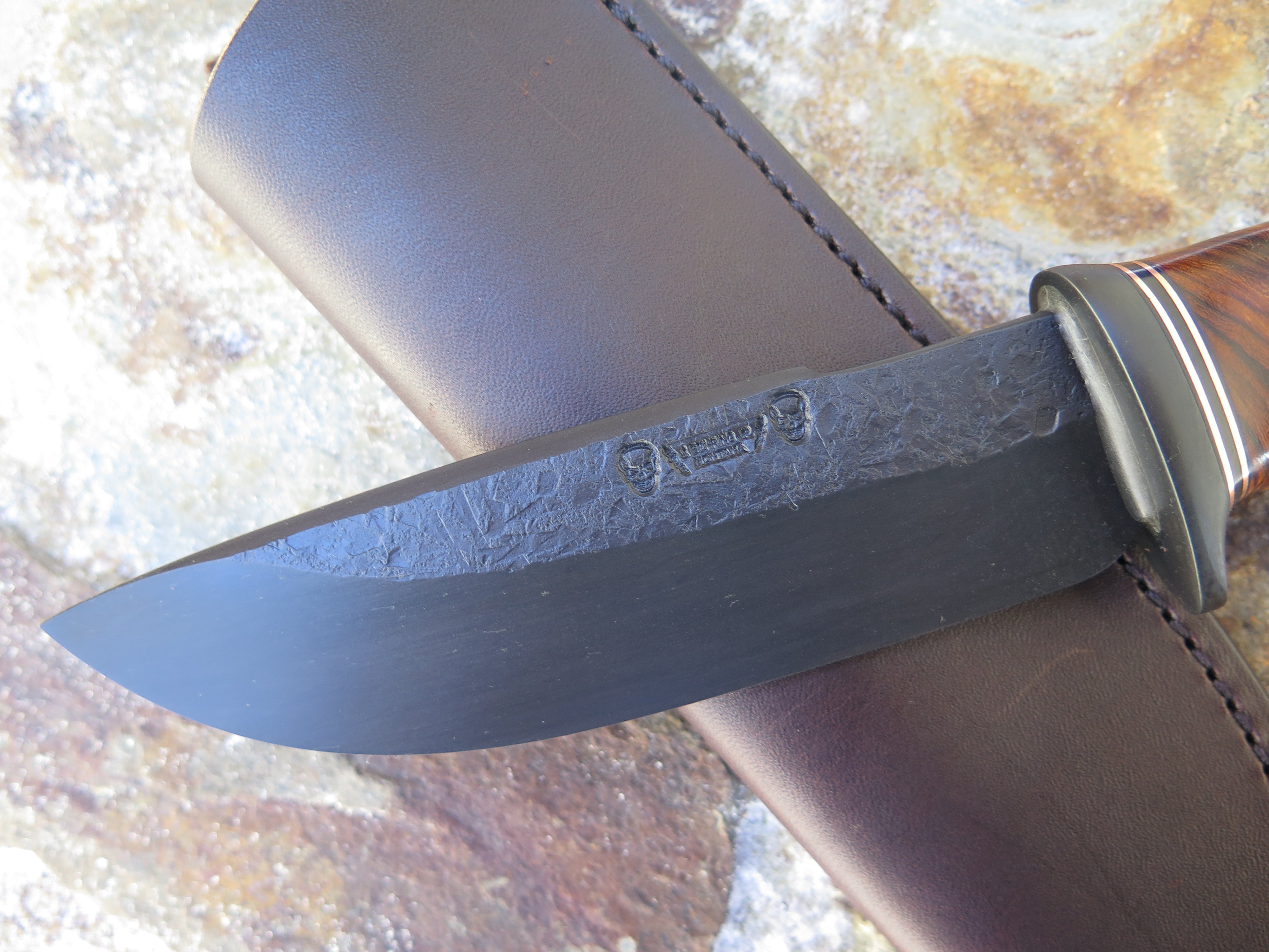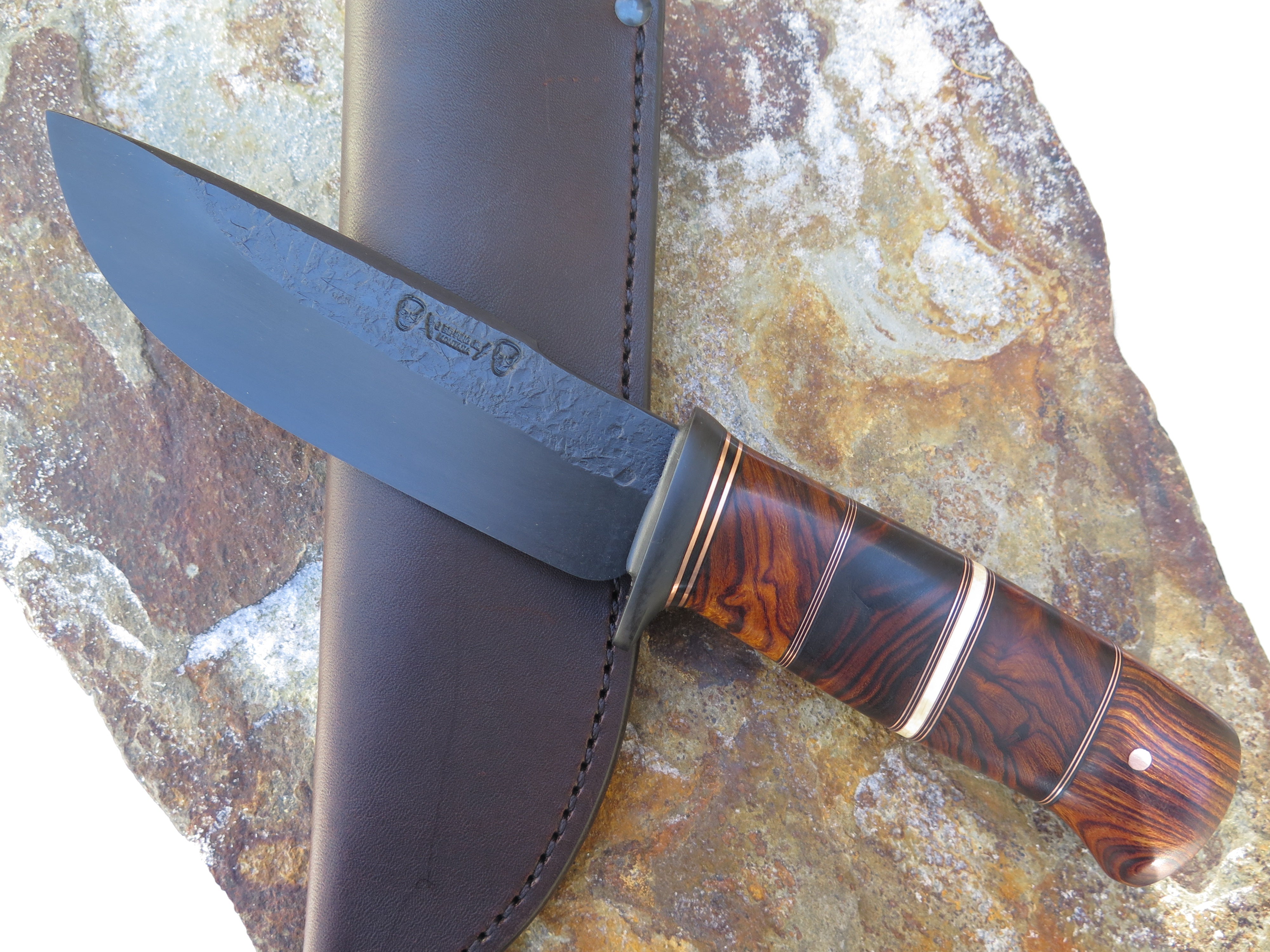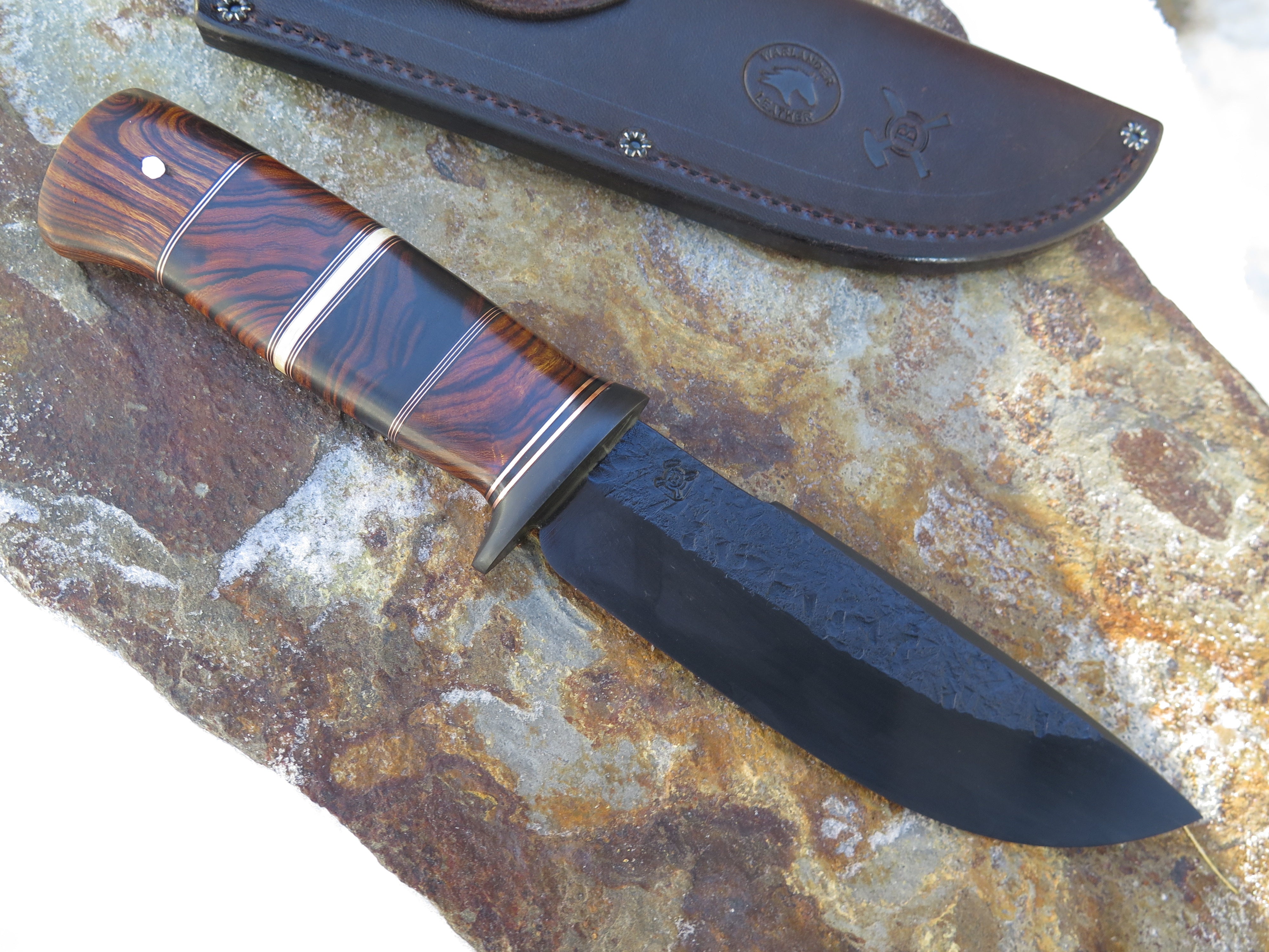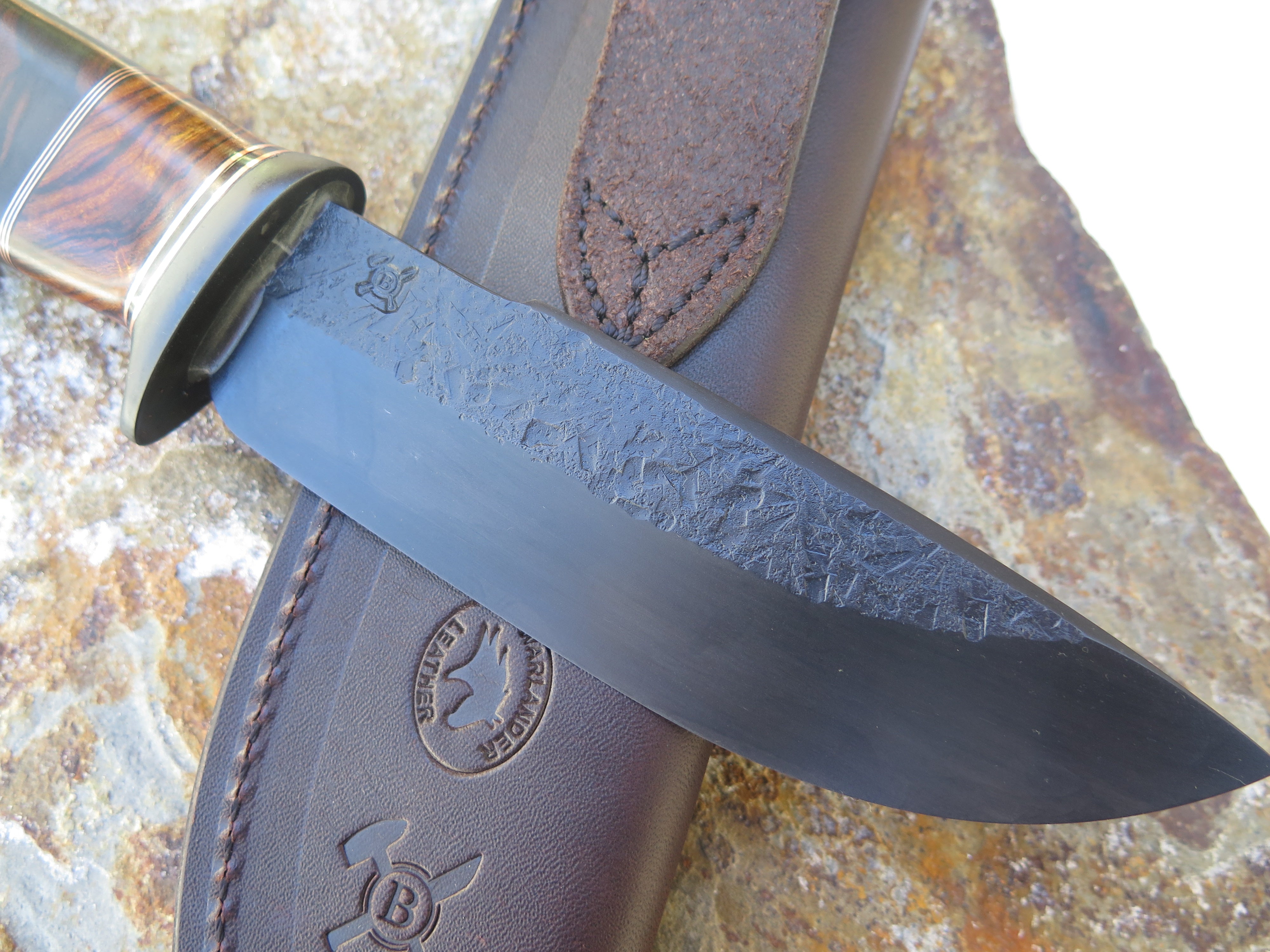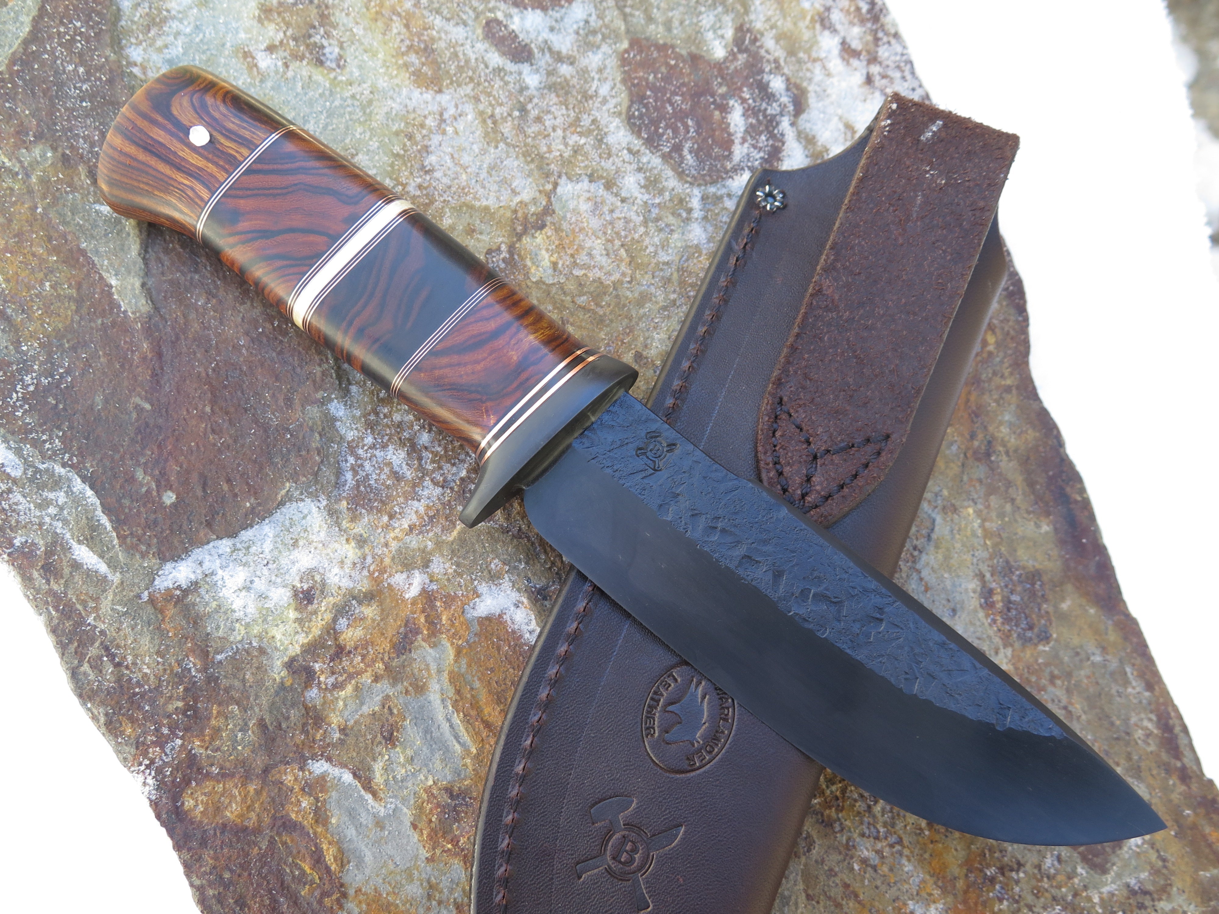 This beautiful new Modified Drop Point from Behring Made© is hand forged from 1/4" thick 5160 spring steel and it measures 5 3/4" from tip to guard with a razor sharp hollow grind, hammermarks and our forced patina blued finish. The blued steel guard is soldered in place above a four-piece stack of premium desert ironwood burl amidst black fiber, copper and ancient mammoth ivory spacers. The copper pin runs through the tang and overall this guy measures 10 3/8" and it comes in a classic leather belt pouch sheath.