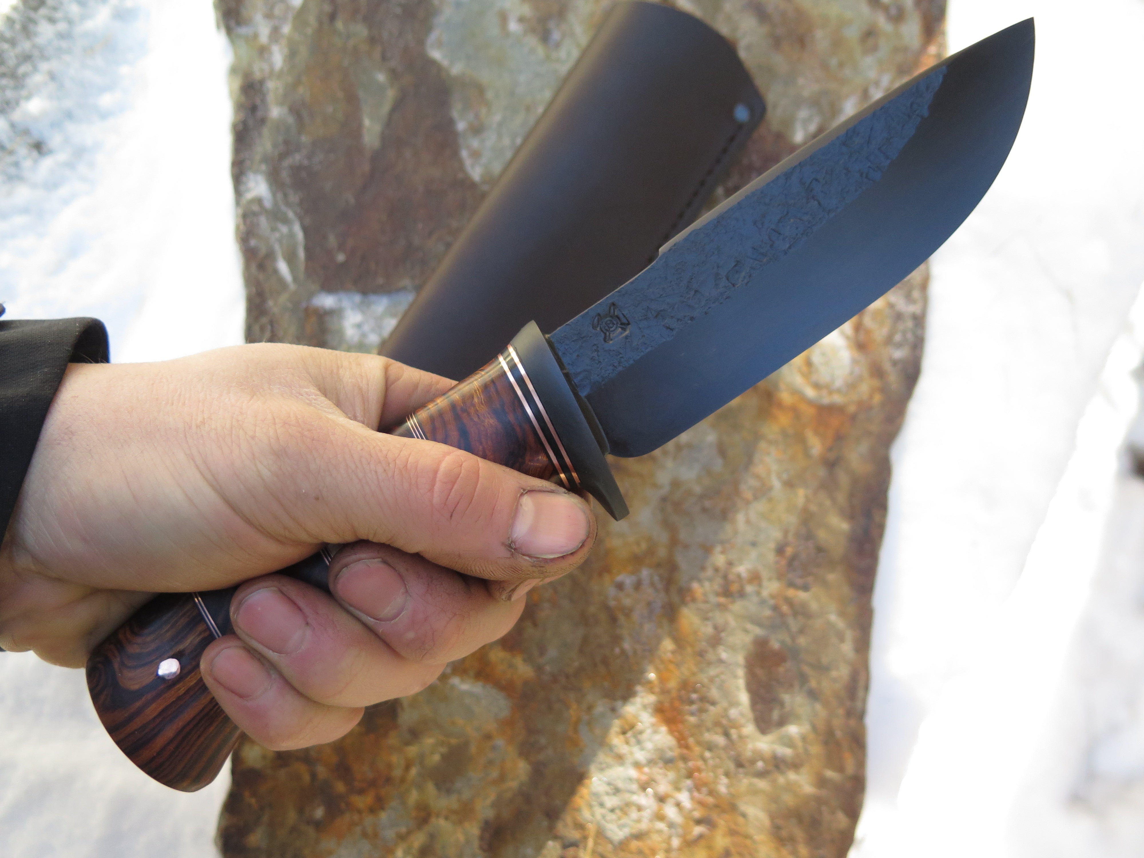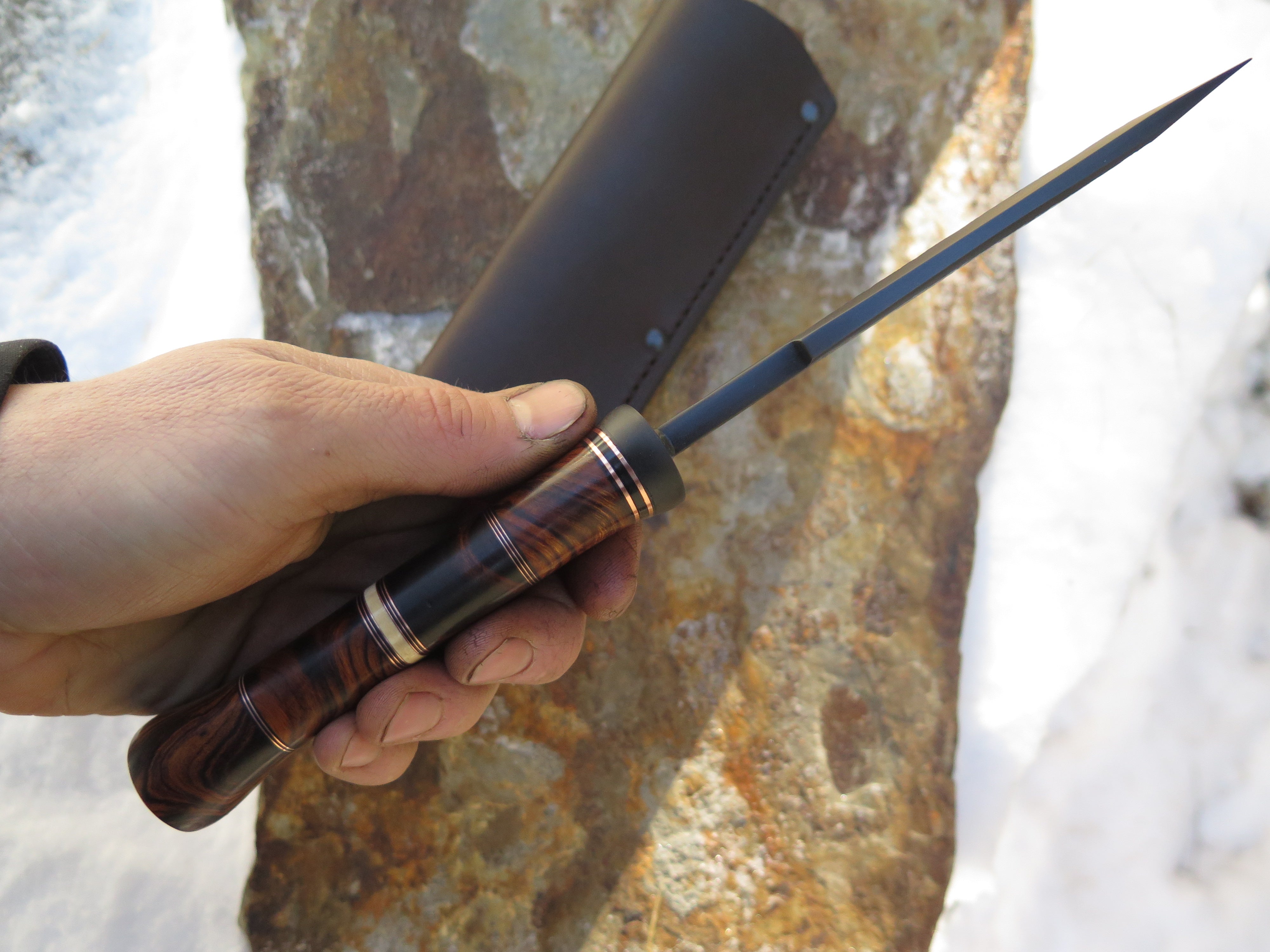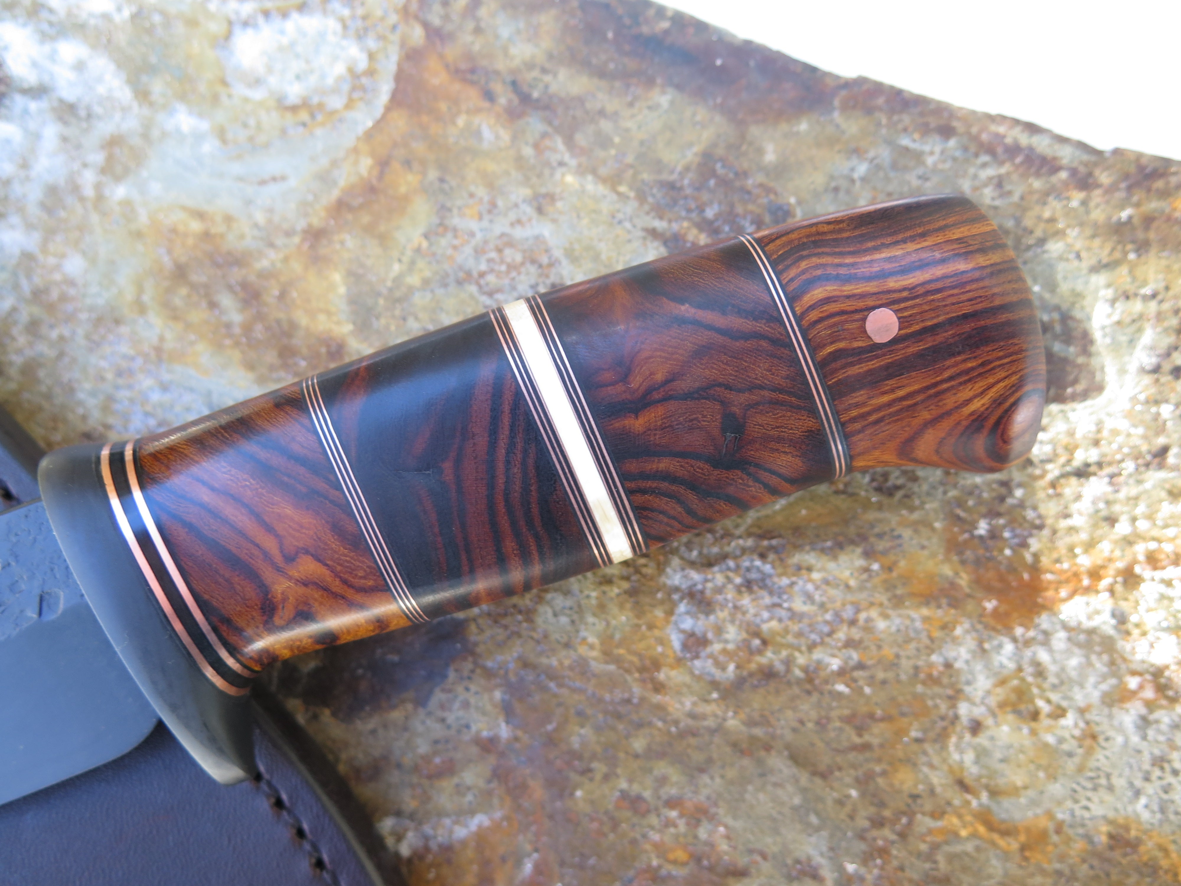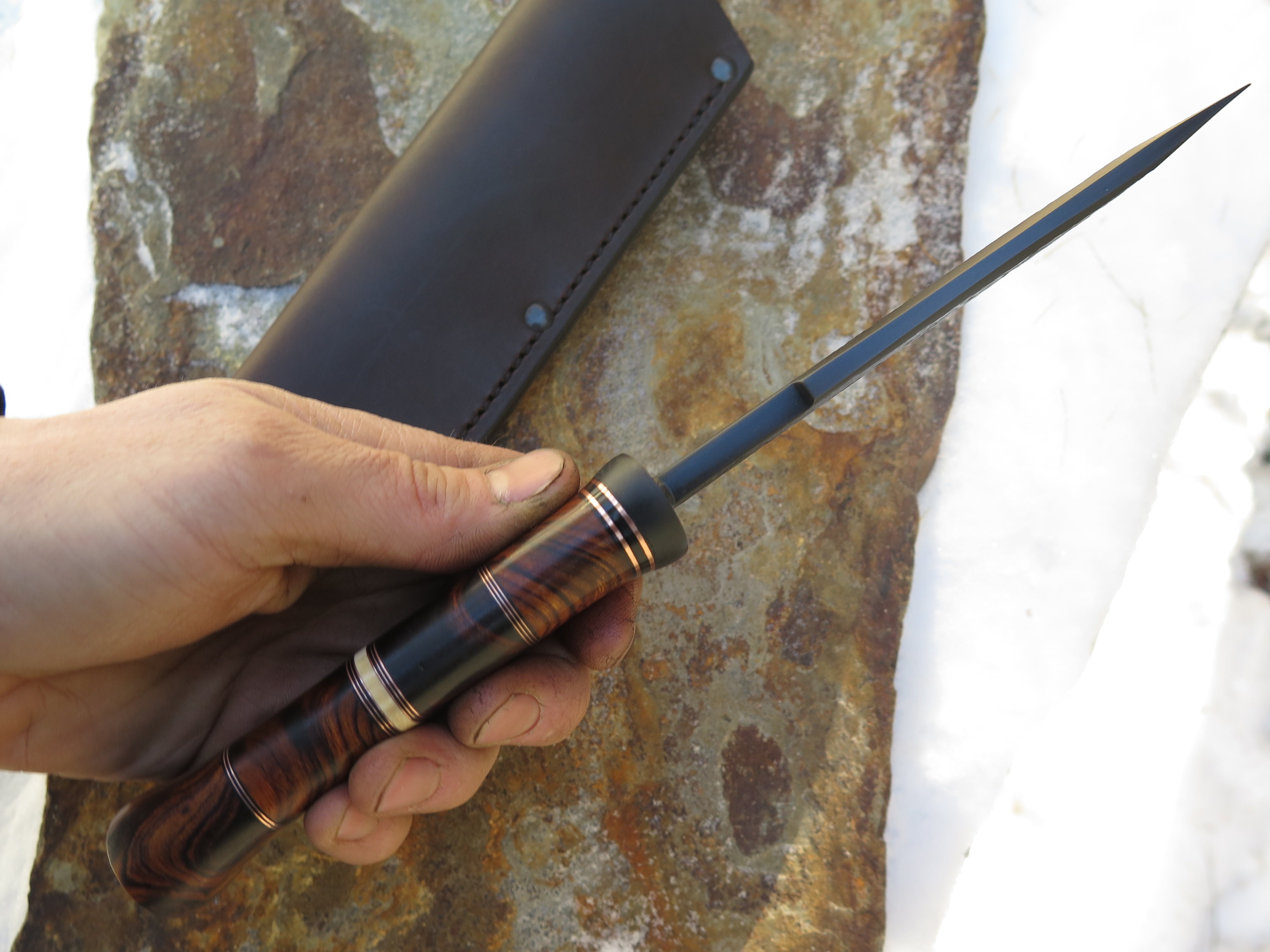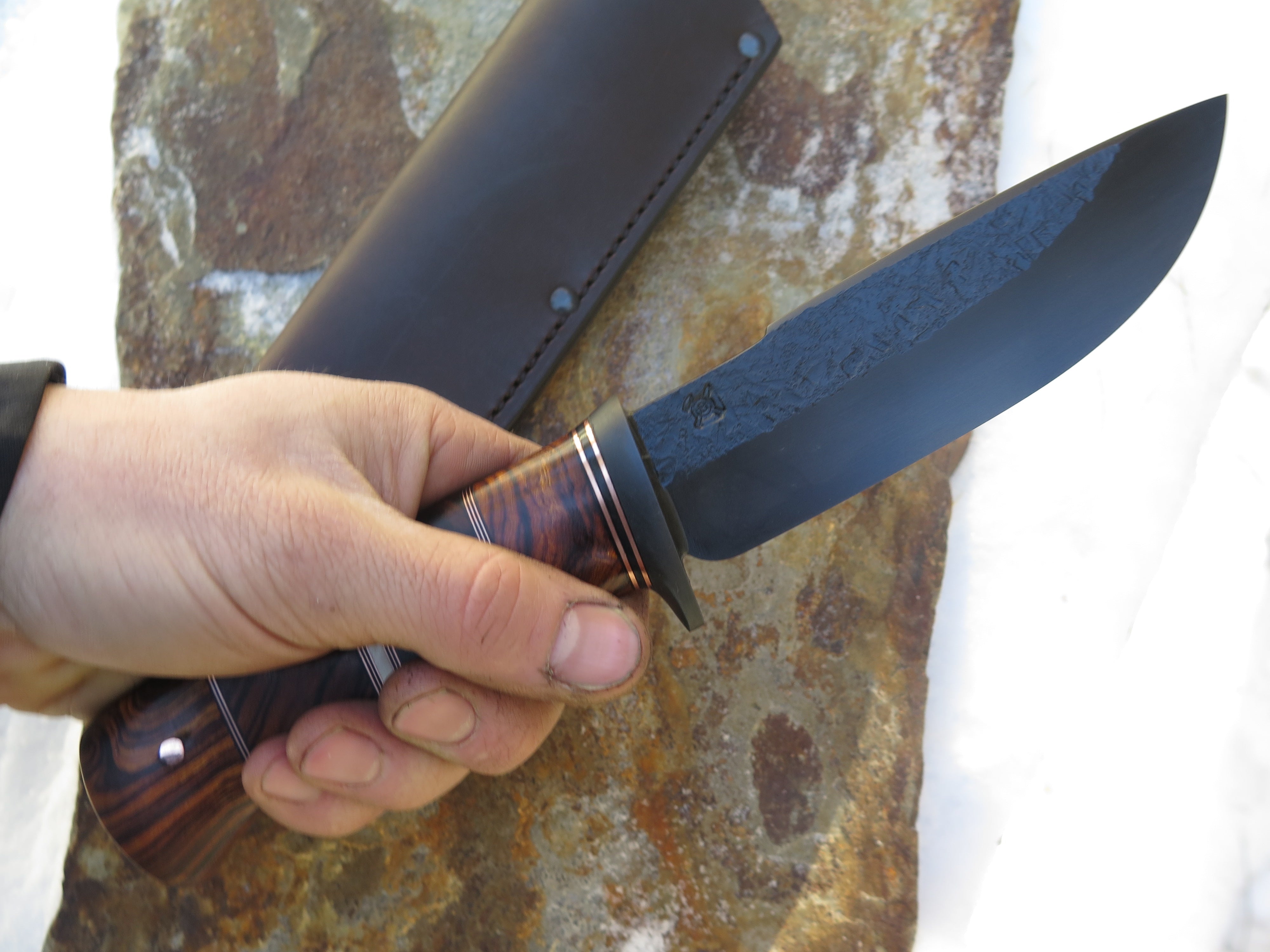 This beautiful new Modified Drop Point from Behring Made© is hand forged from 1/4" thick 5160 spring steel and it measures 5 3/4" from tip to guard with a razor sharp hollow grind, hammermarks and our forced patina blued finish. The blued steel guard is soldered in place above a four-piece stack of premium desert ironwood burl amidst black fiber, copper and ancient mammoth ivory spacers. The copper pin runs through the tang and overall this guy measures 10 3/8" and it comes in a classic leather belt pouch sheath.